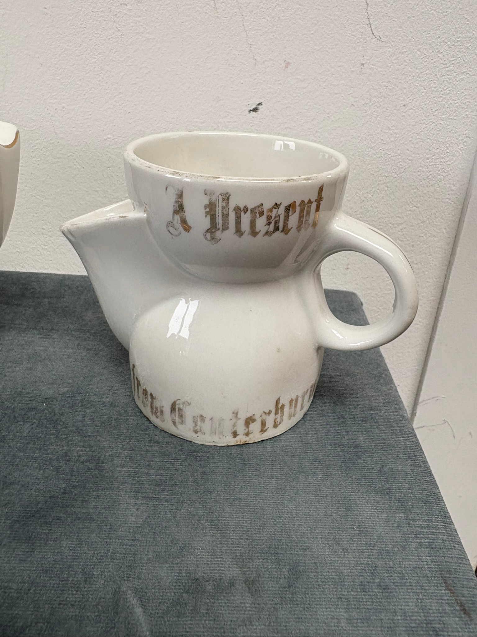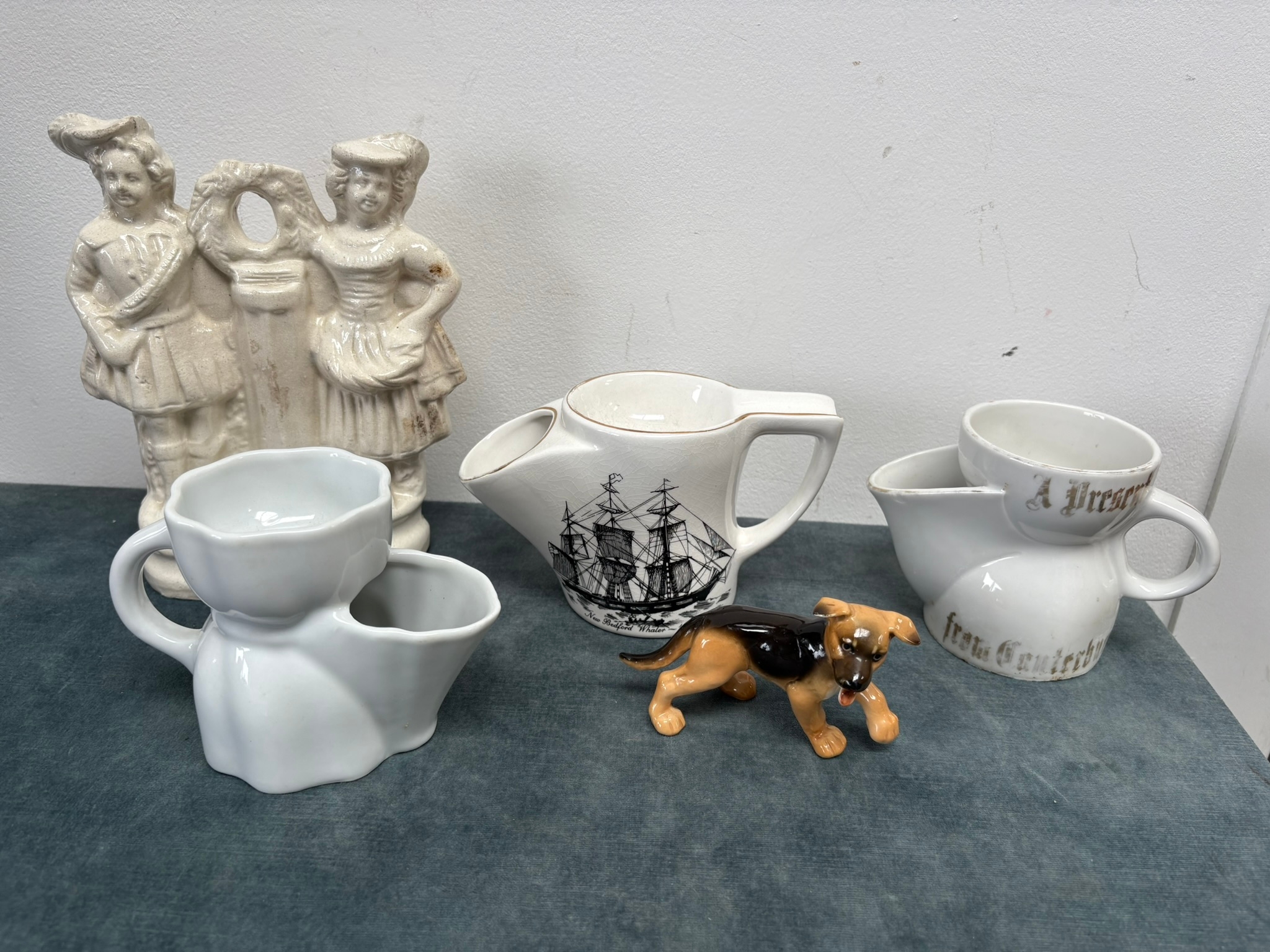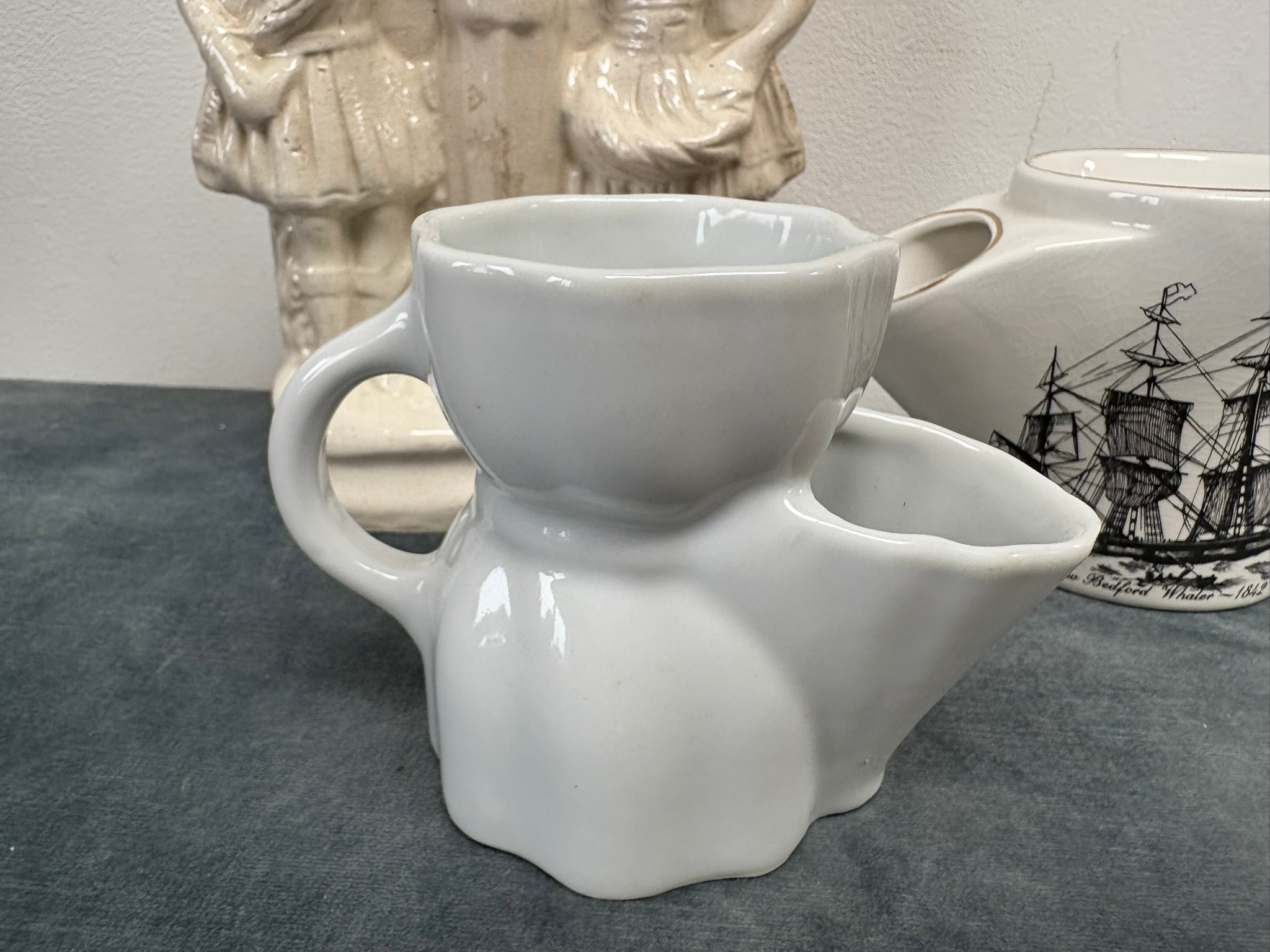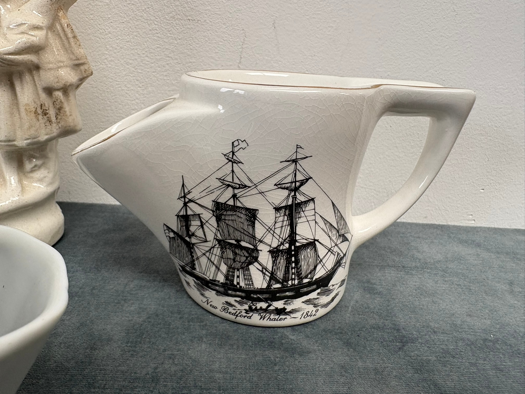 3 x Shaving mugs – Canterbury, New Bedford Whaler and one other. Along with cream ware flatback and small dog