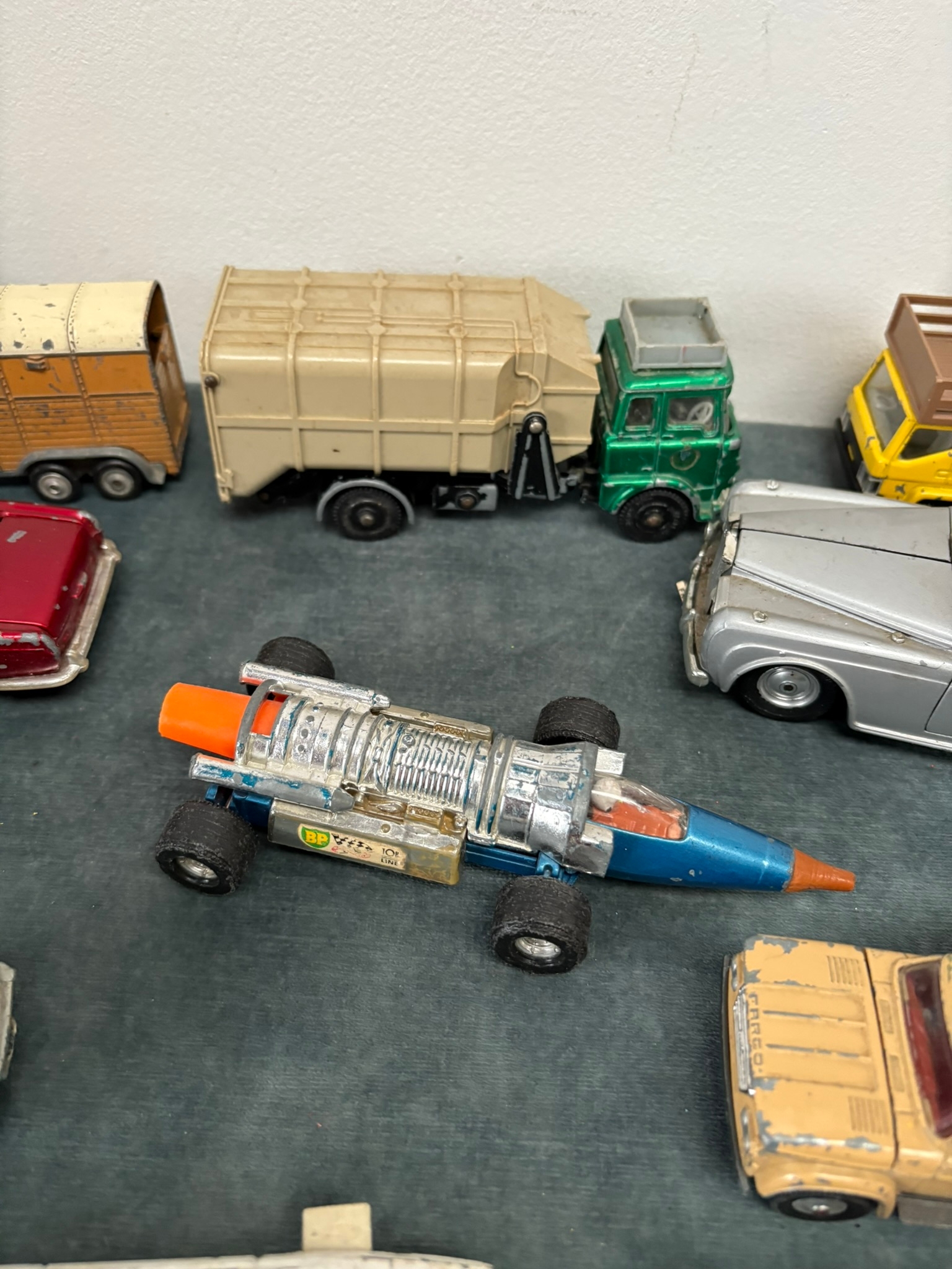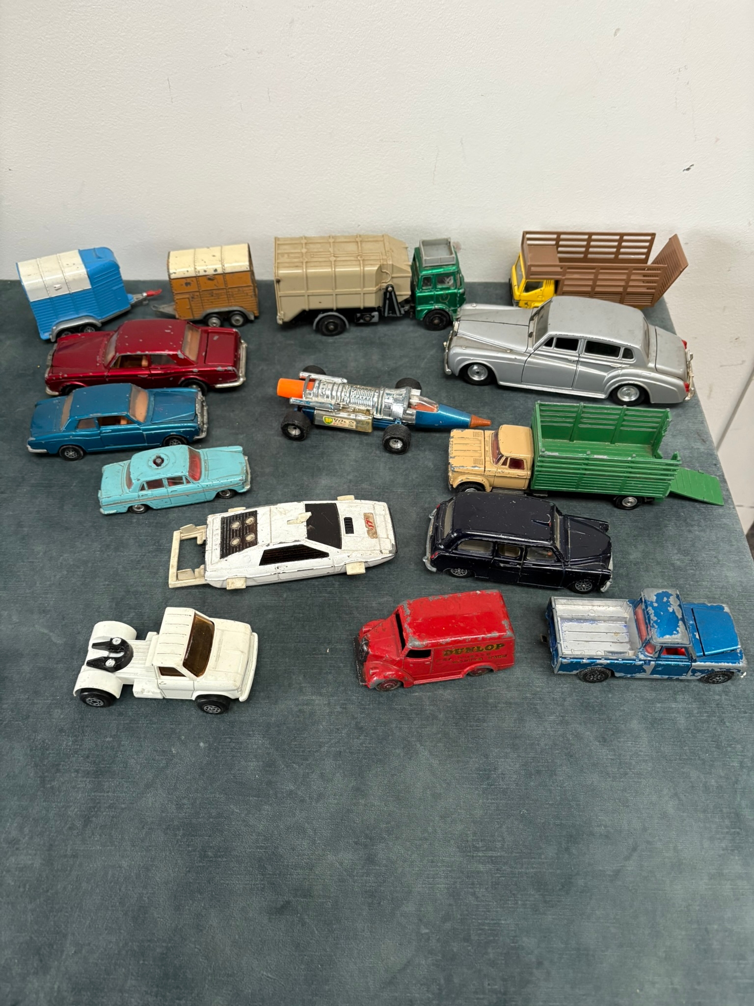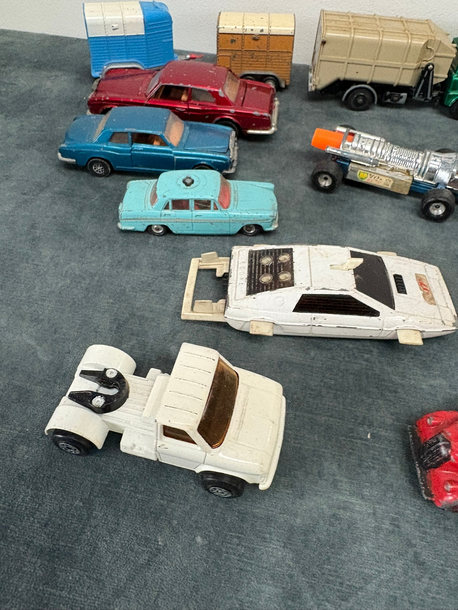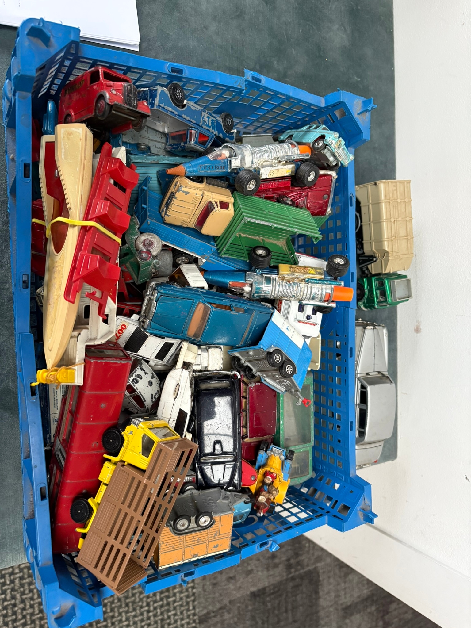 Box of assorted model toy cars including Corgi and Dinky