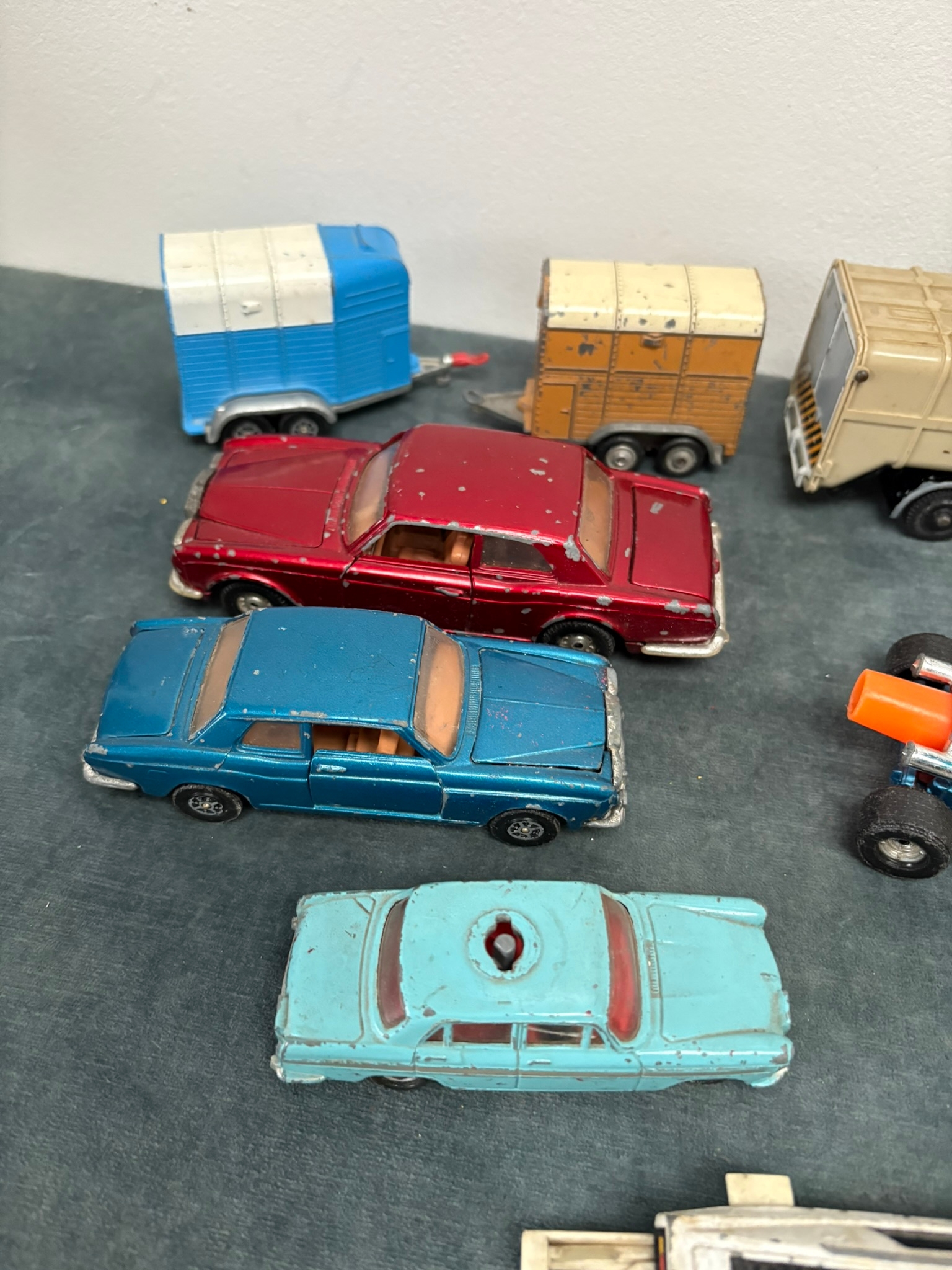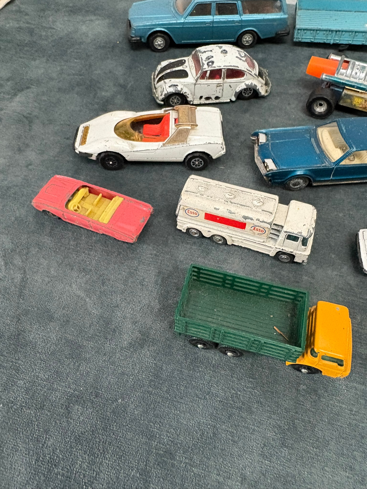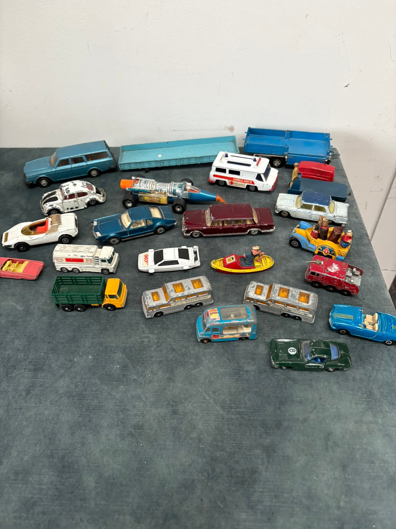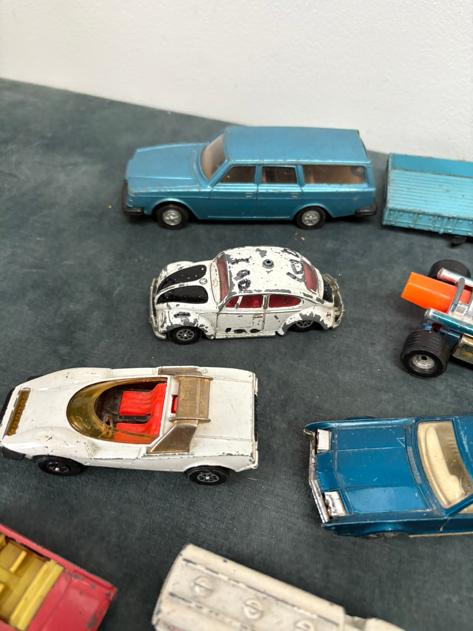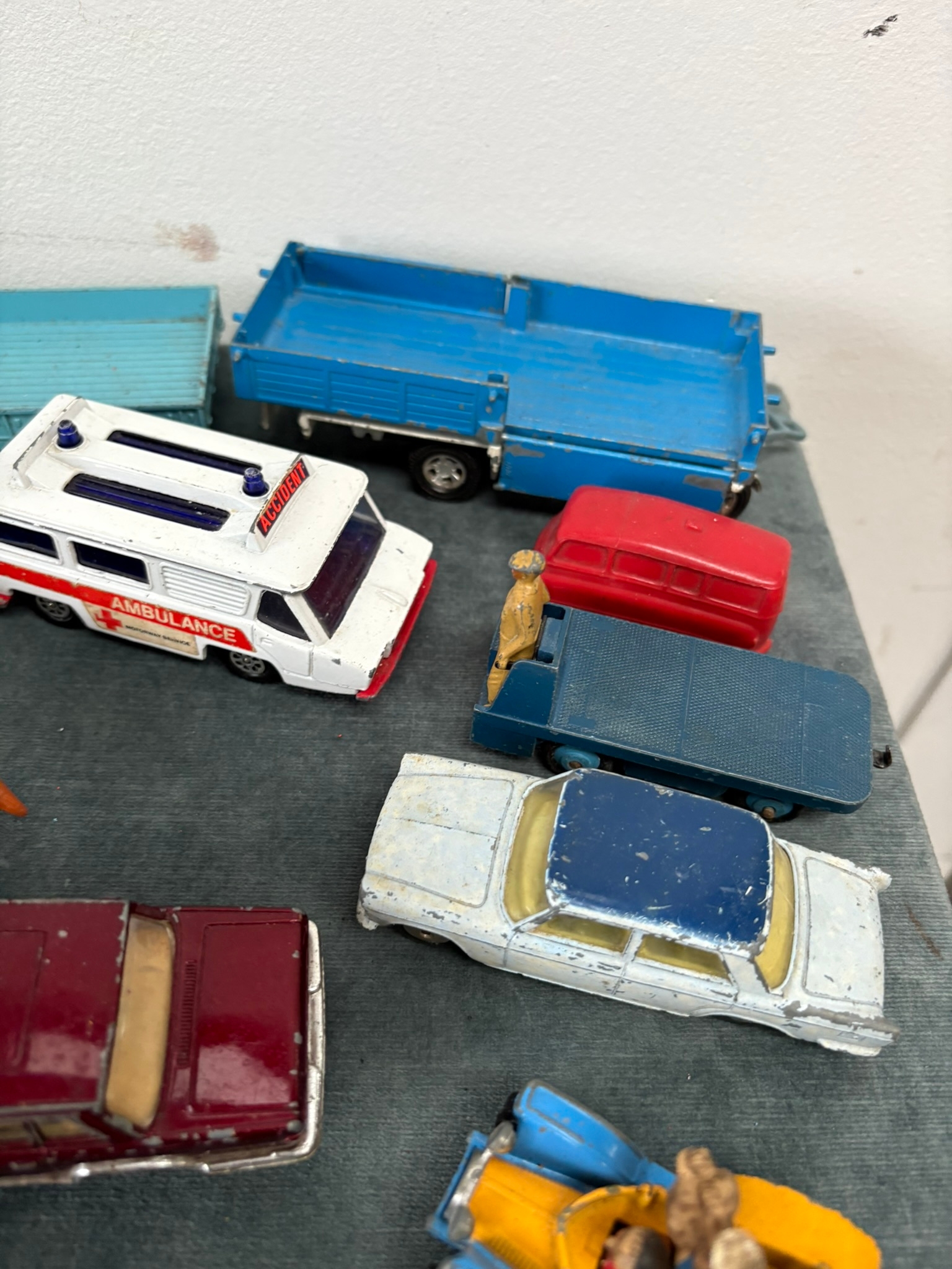 Box of assorted model toy cars including Corgi and Dinky
