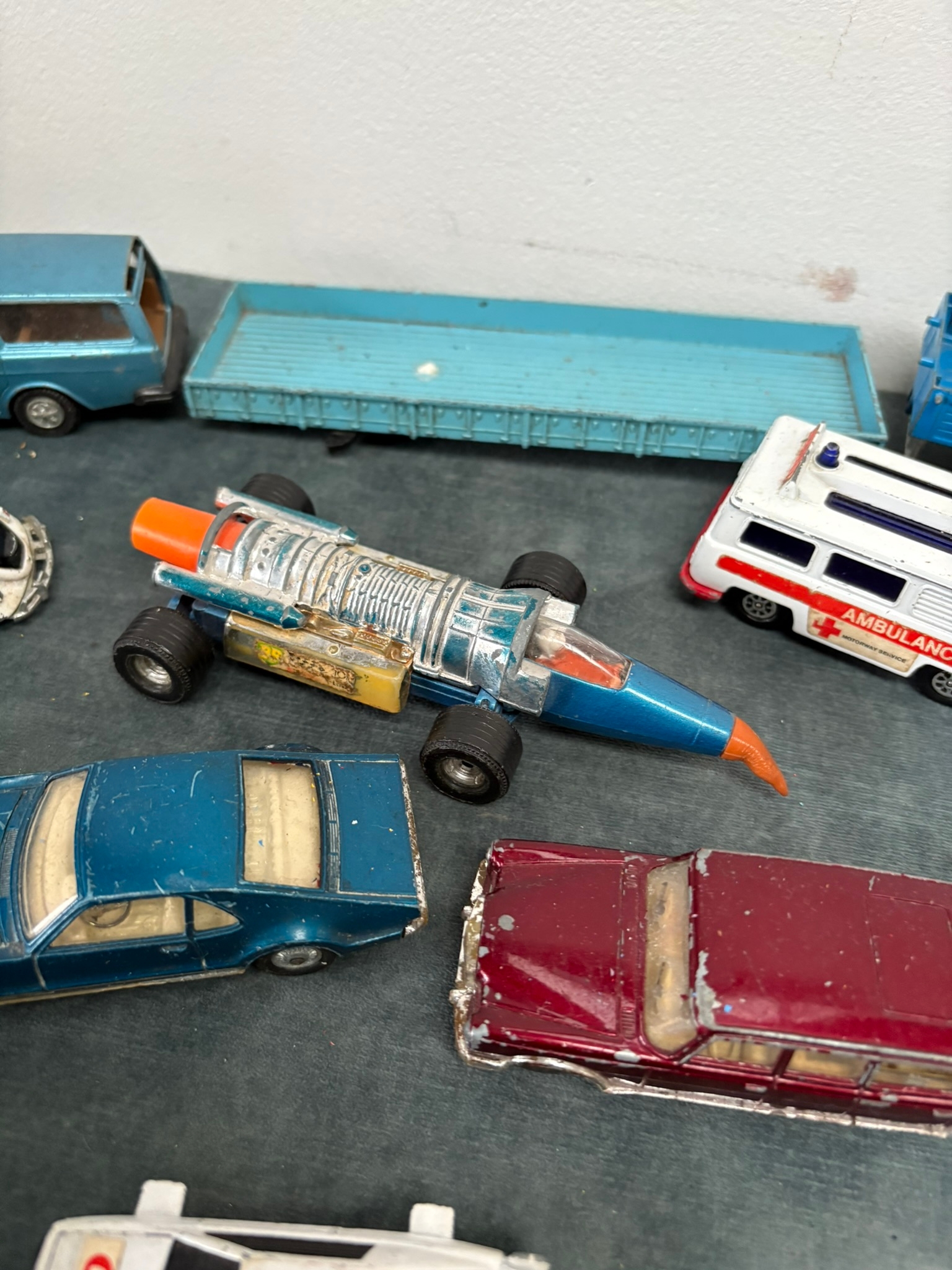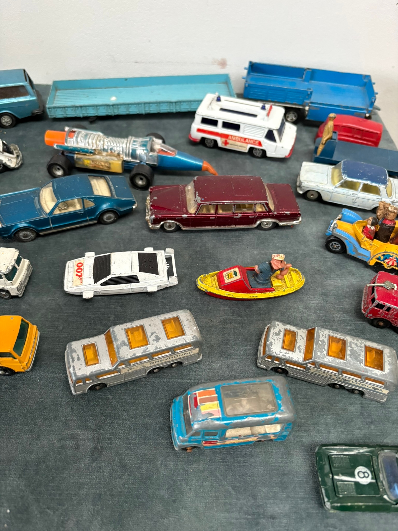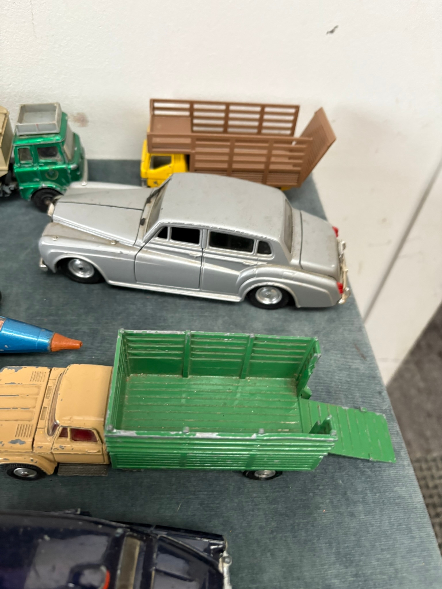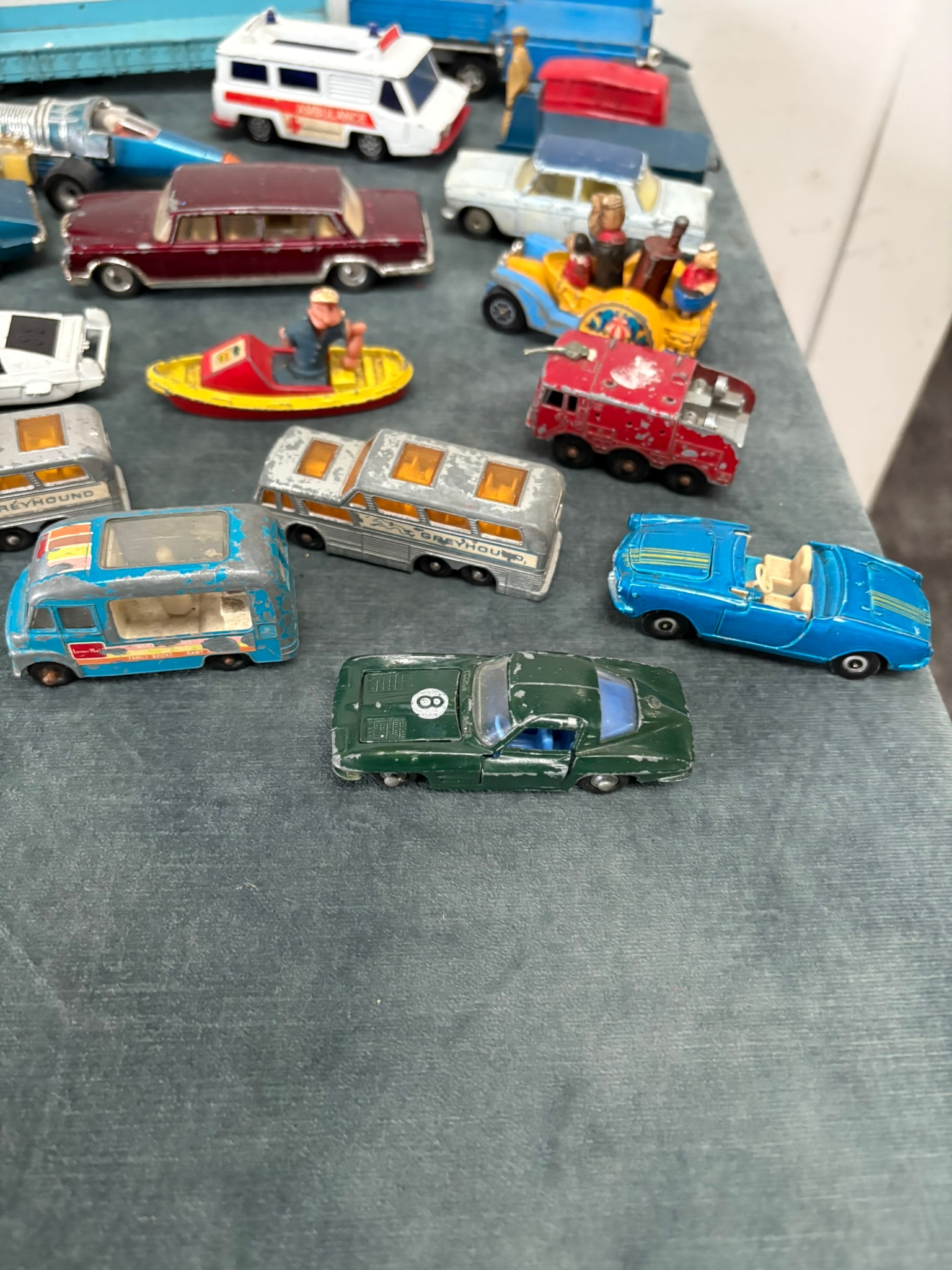 Box of assorted model toy cars including Corgi and Dinky