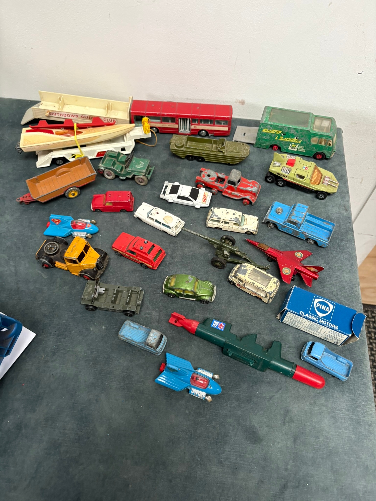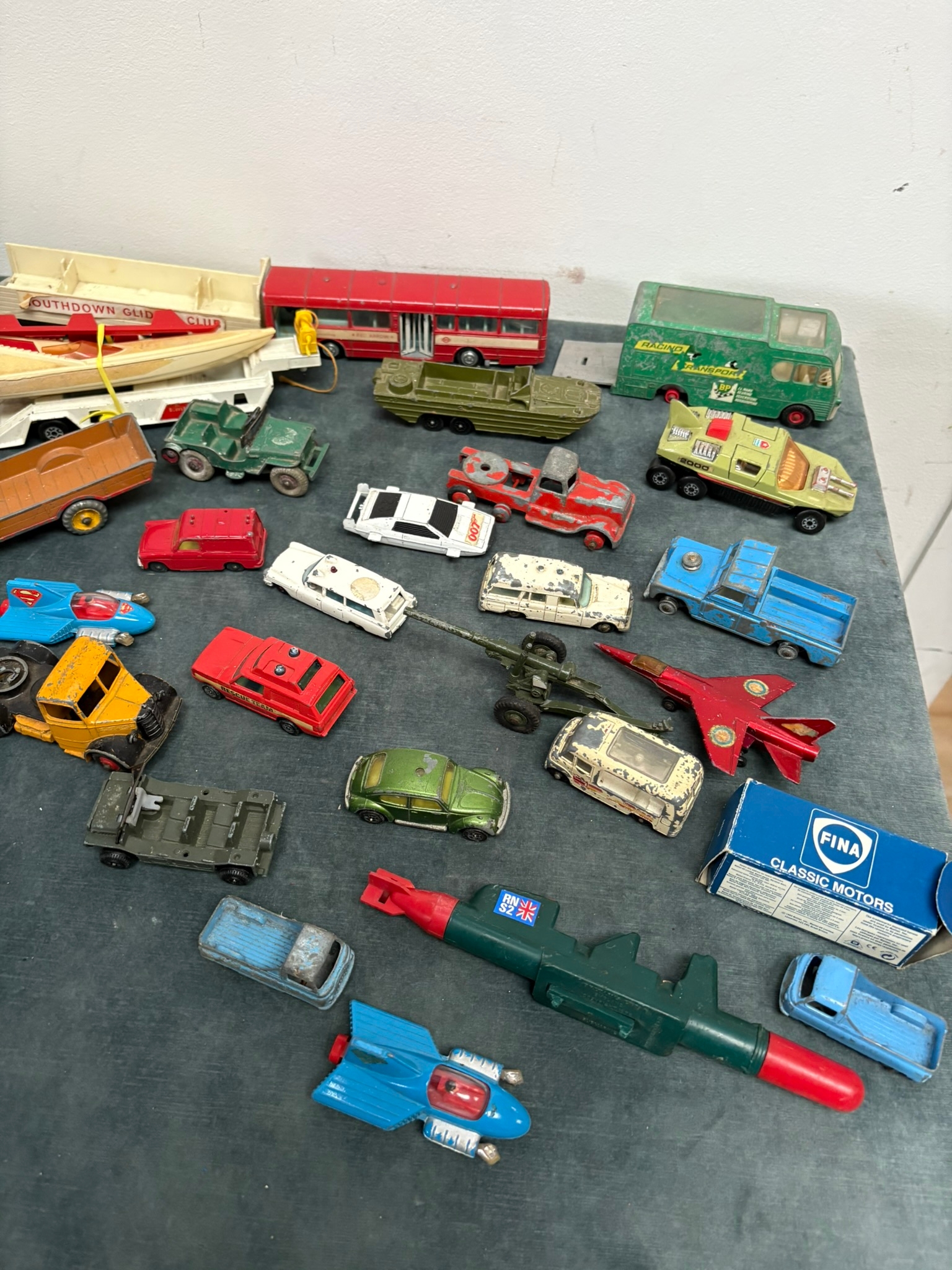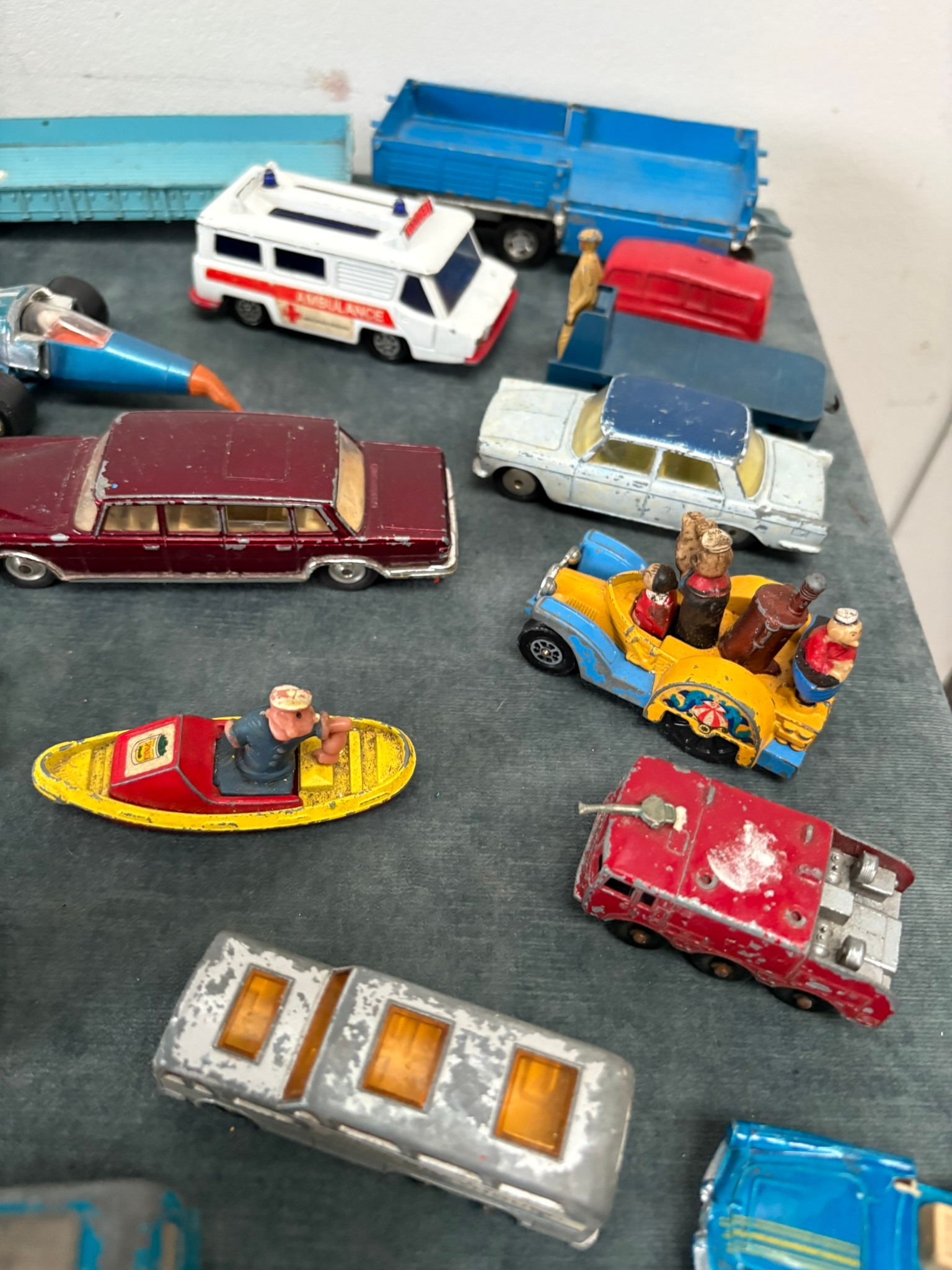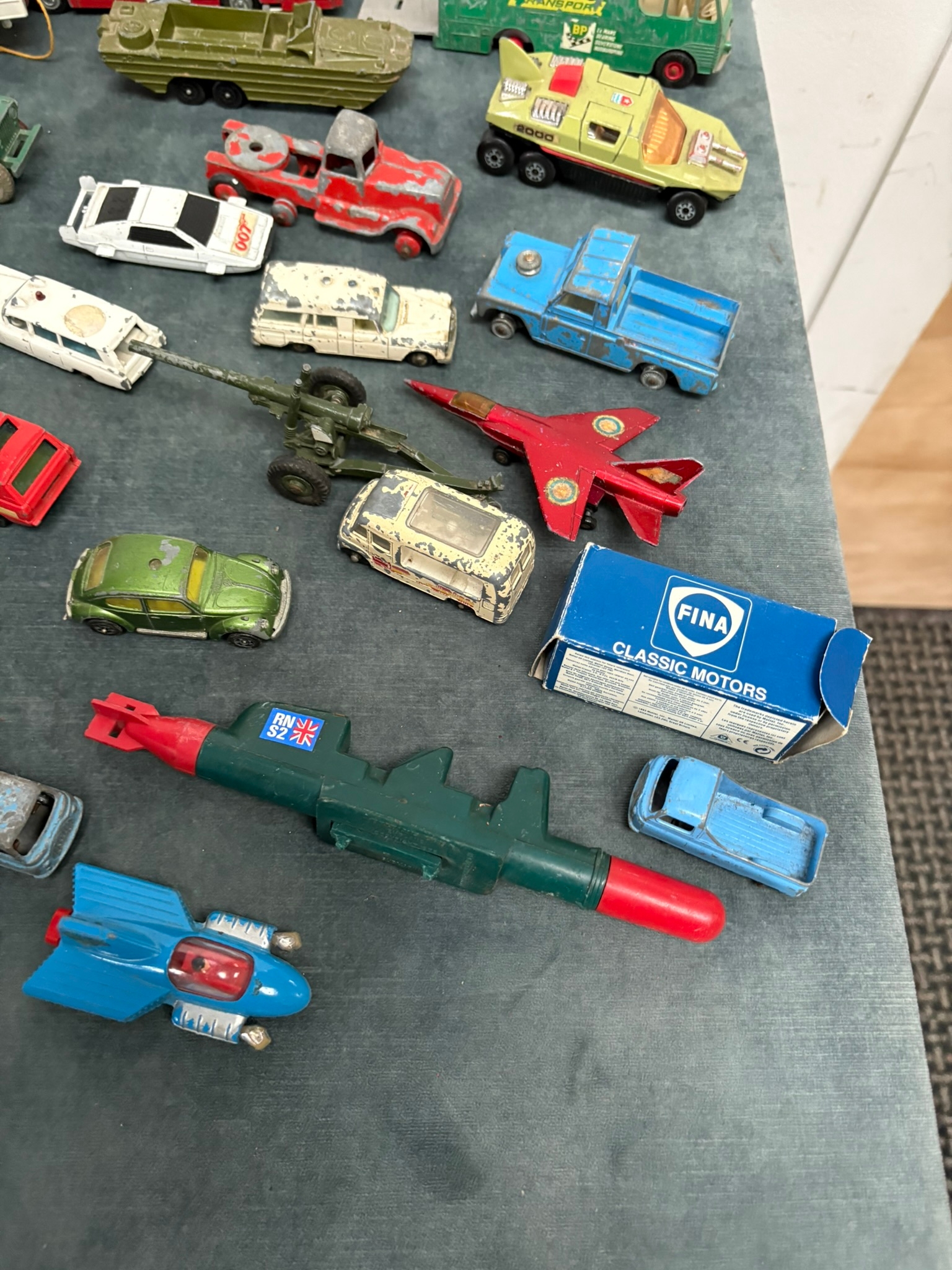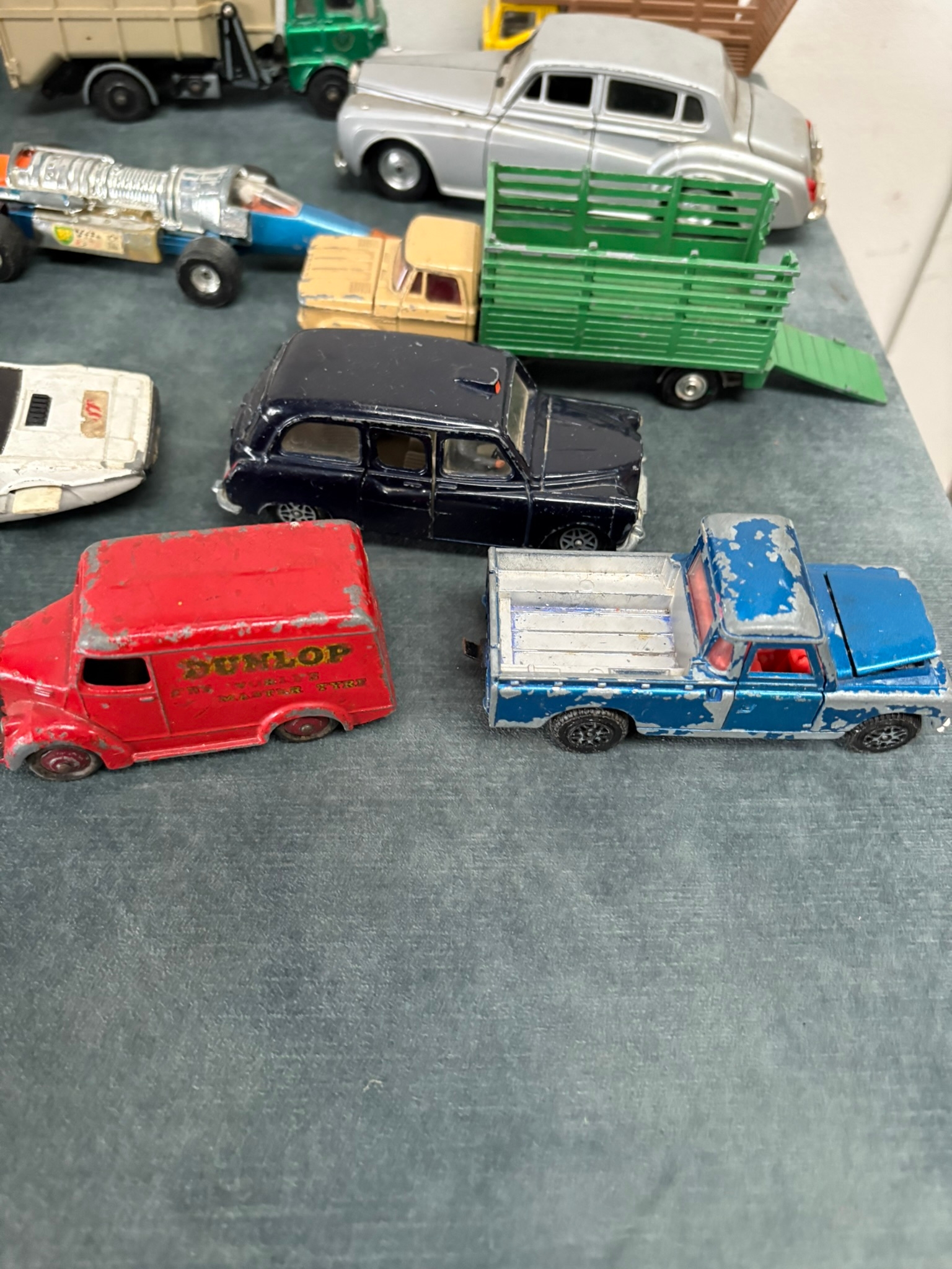 Box of assorted model toy cars including Corgi and Dinky