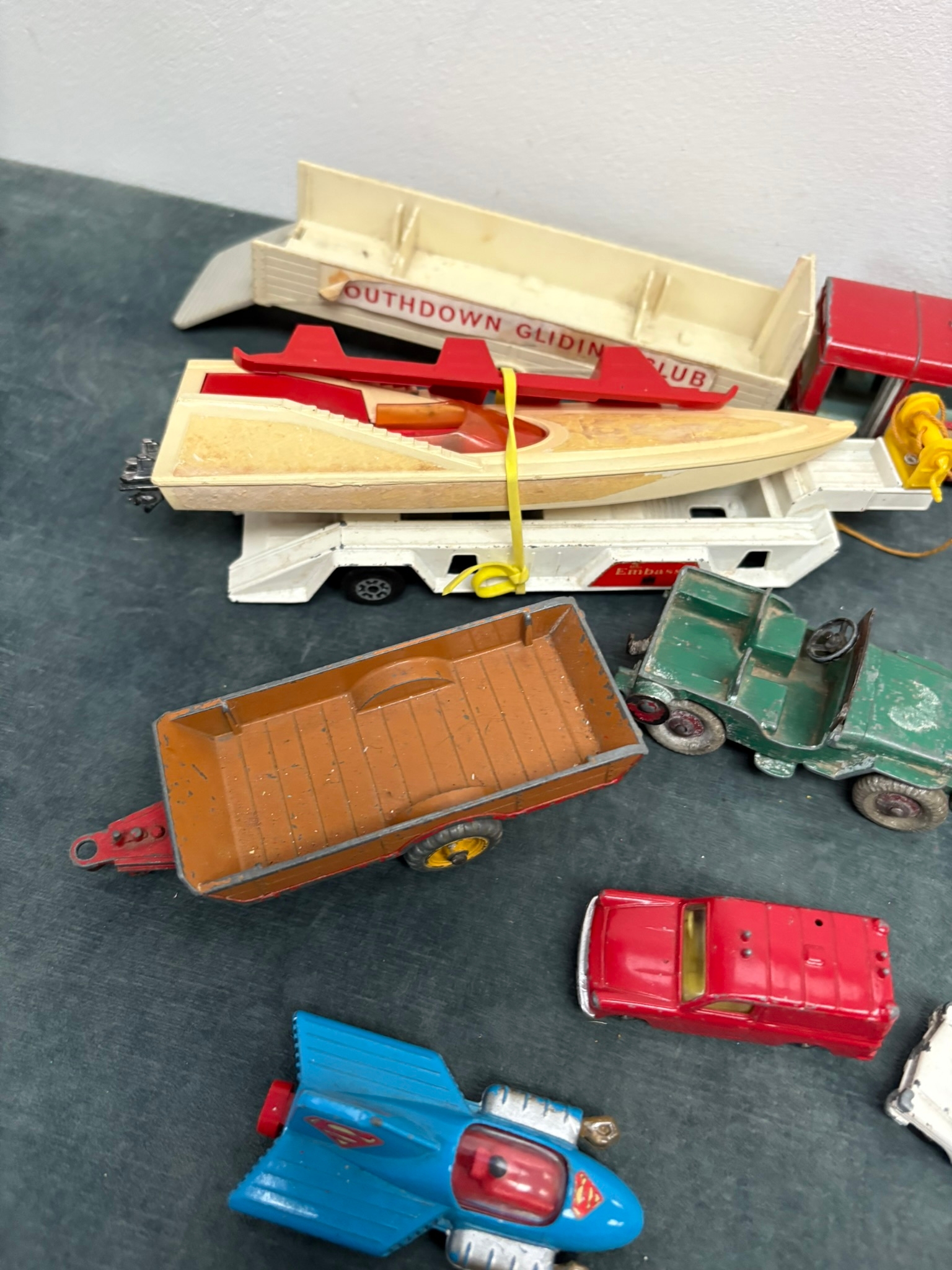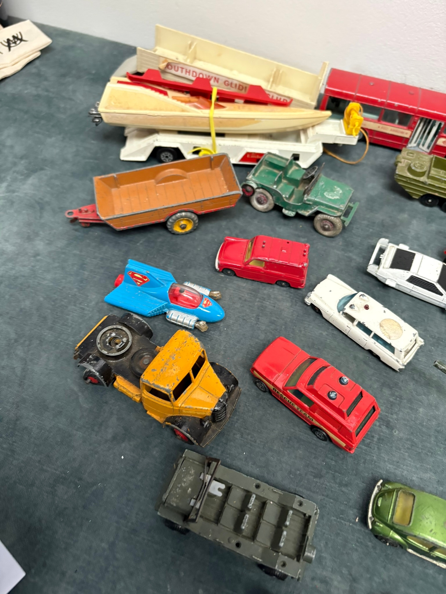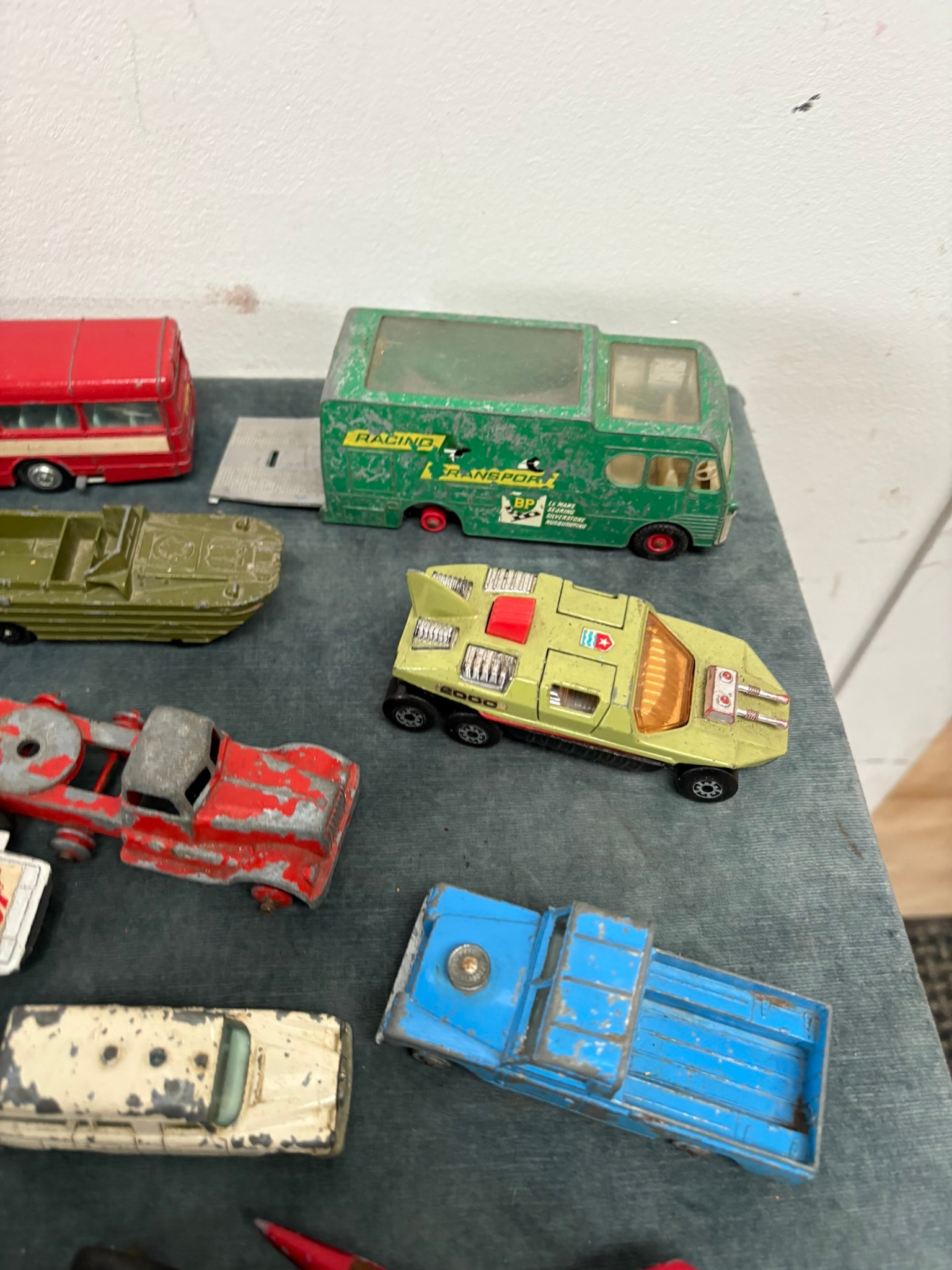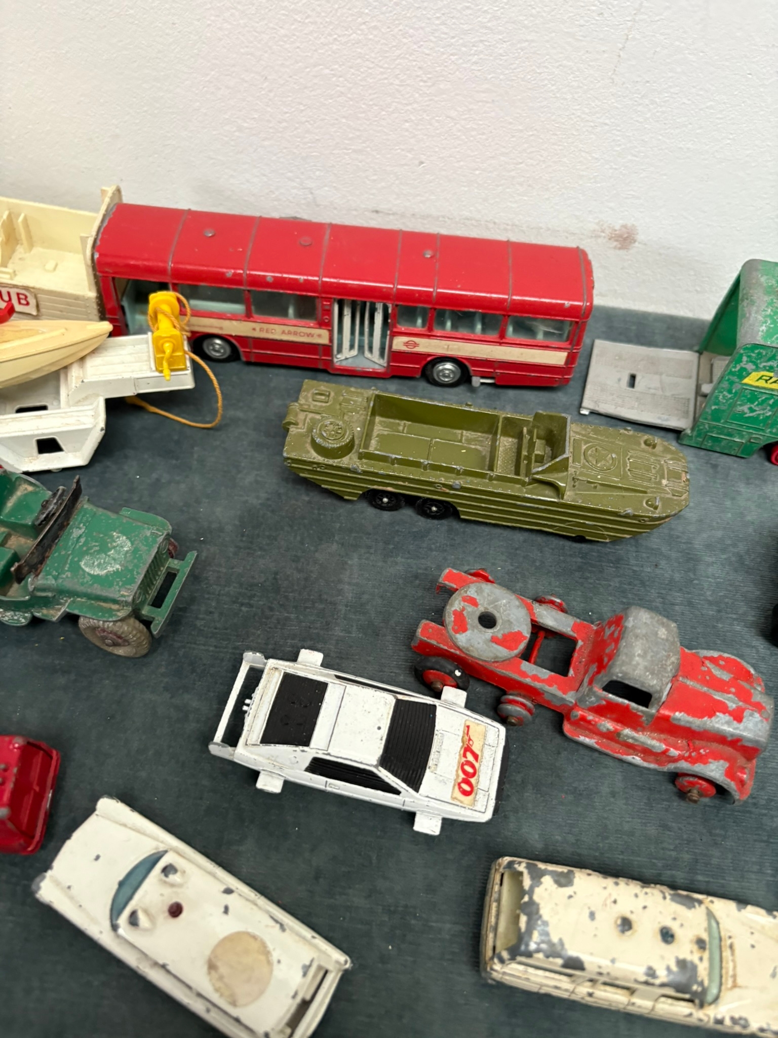Box of assorted model toy cars including Corgi and Dinky