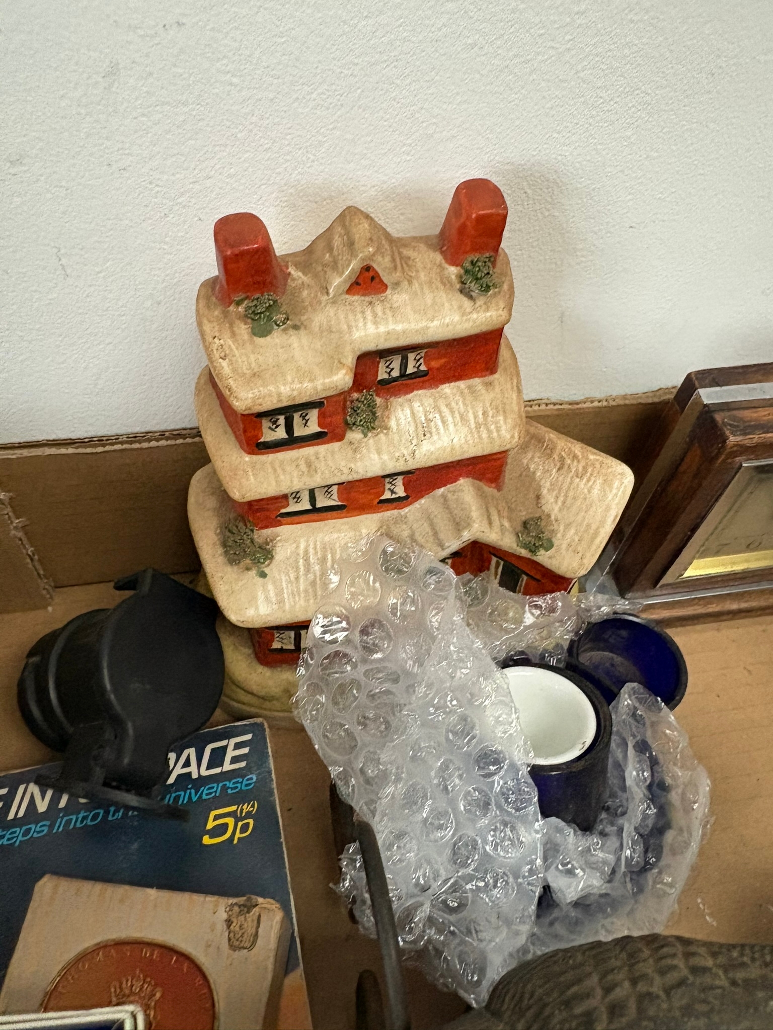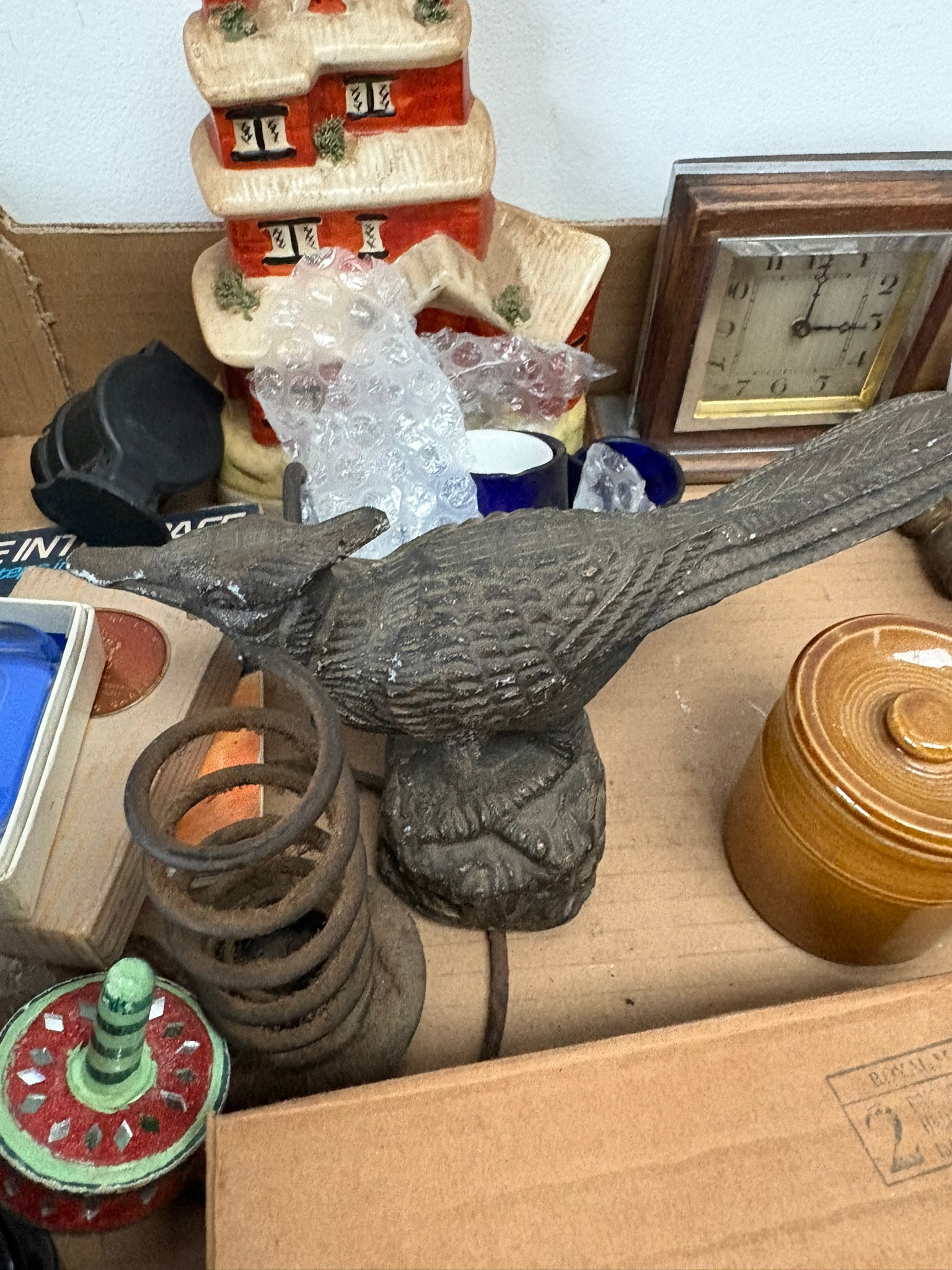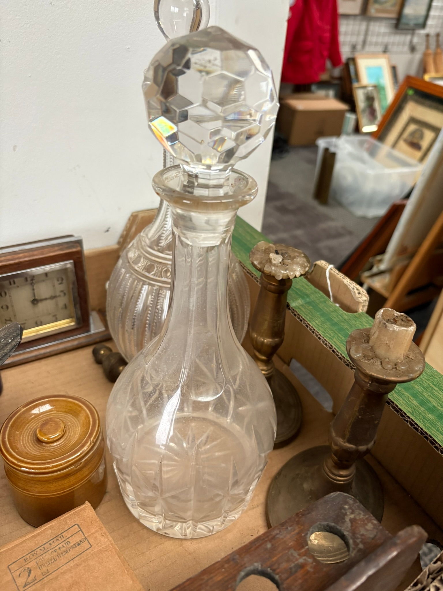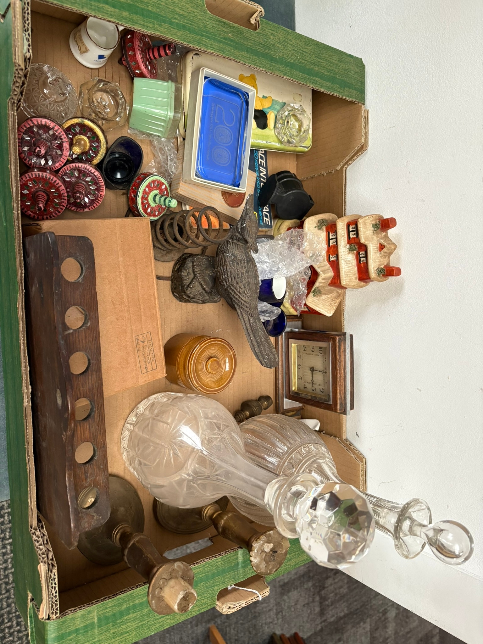 Box of miscellaneous items including glass decanters, bird, house ect.