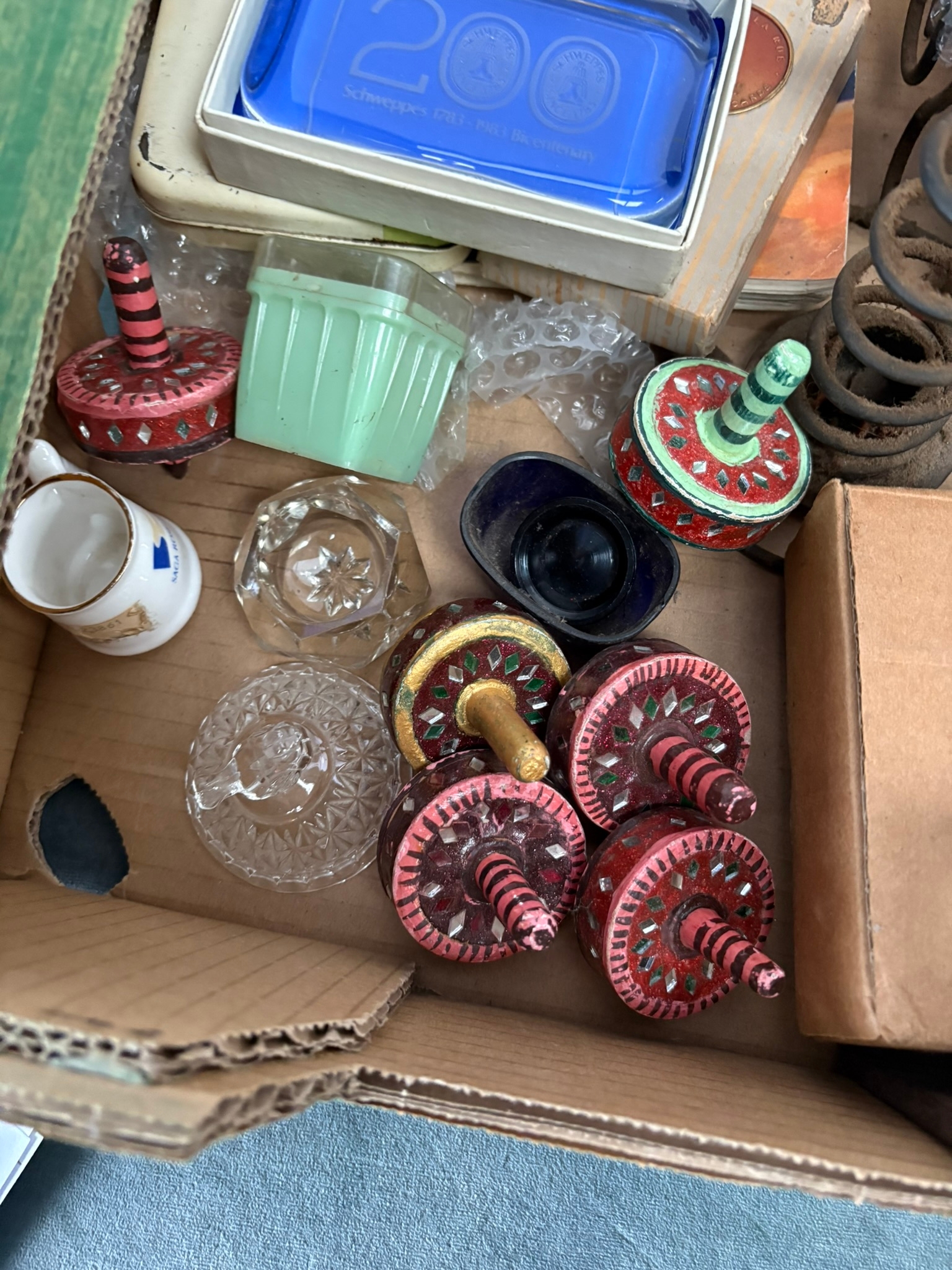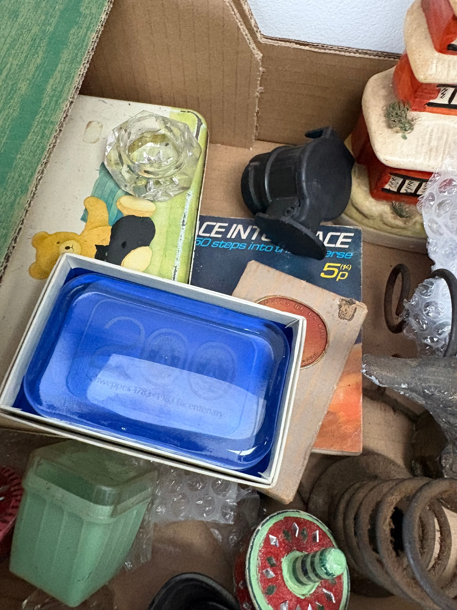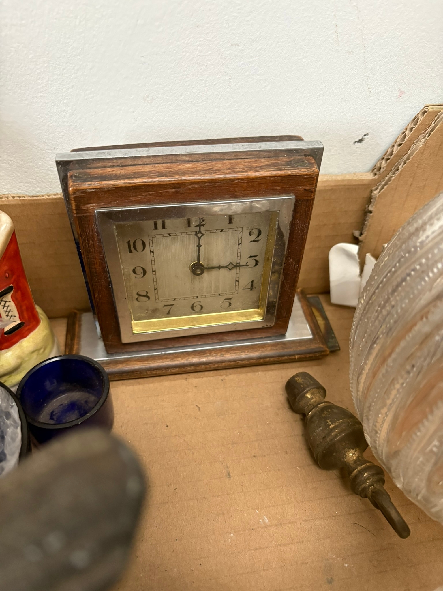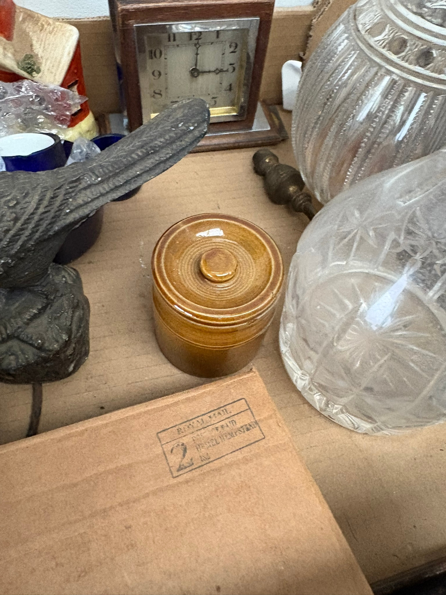 Box of miscellaneous items including glass decanters, bird, house ect.