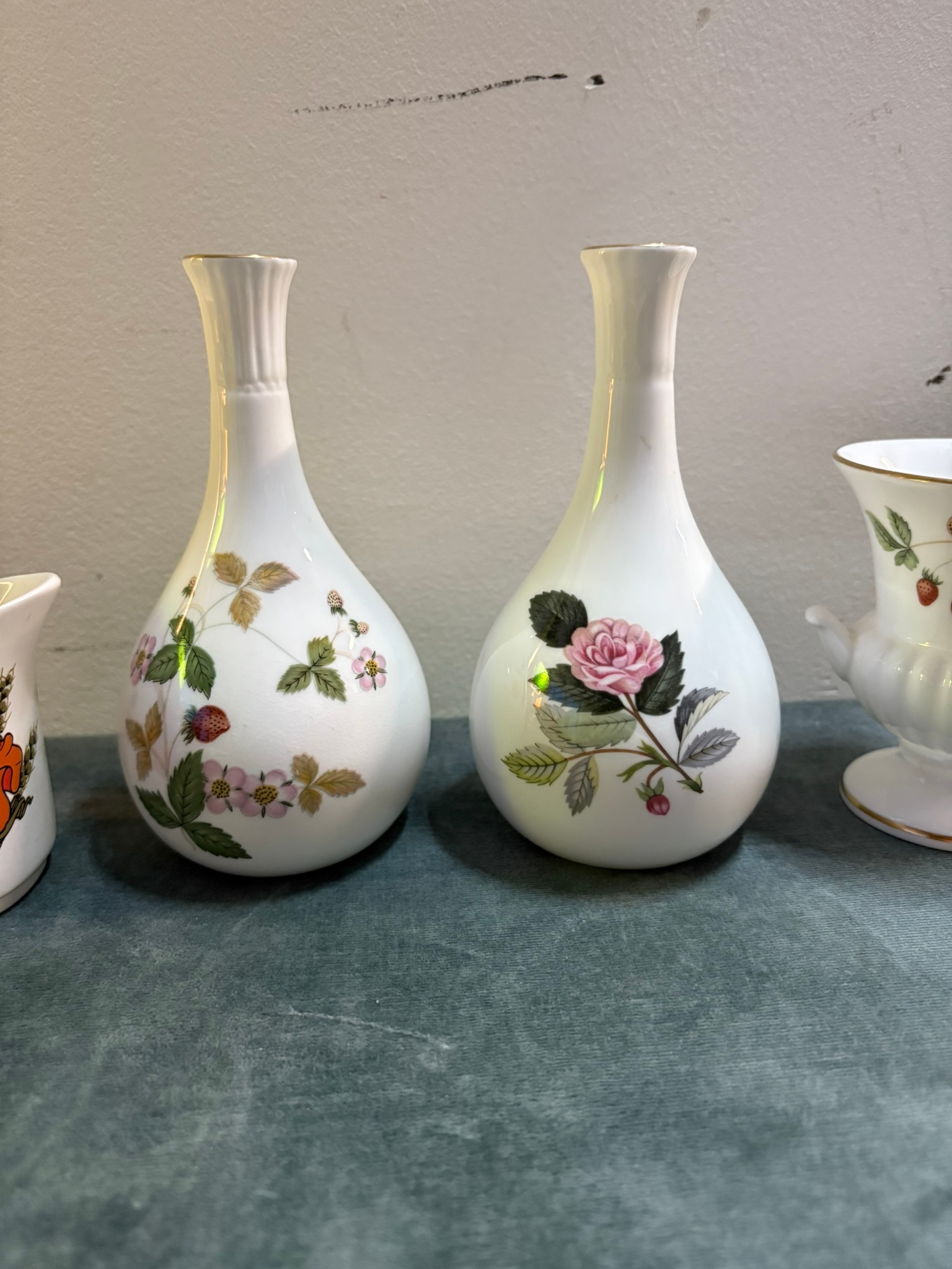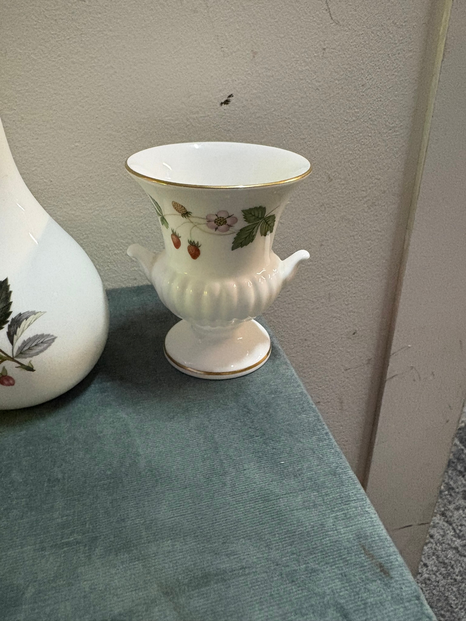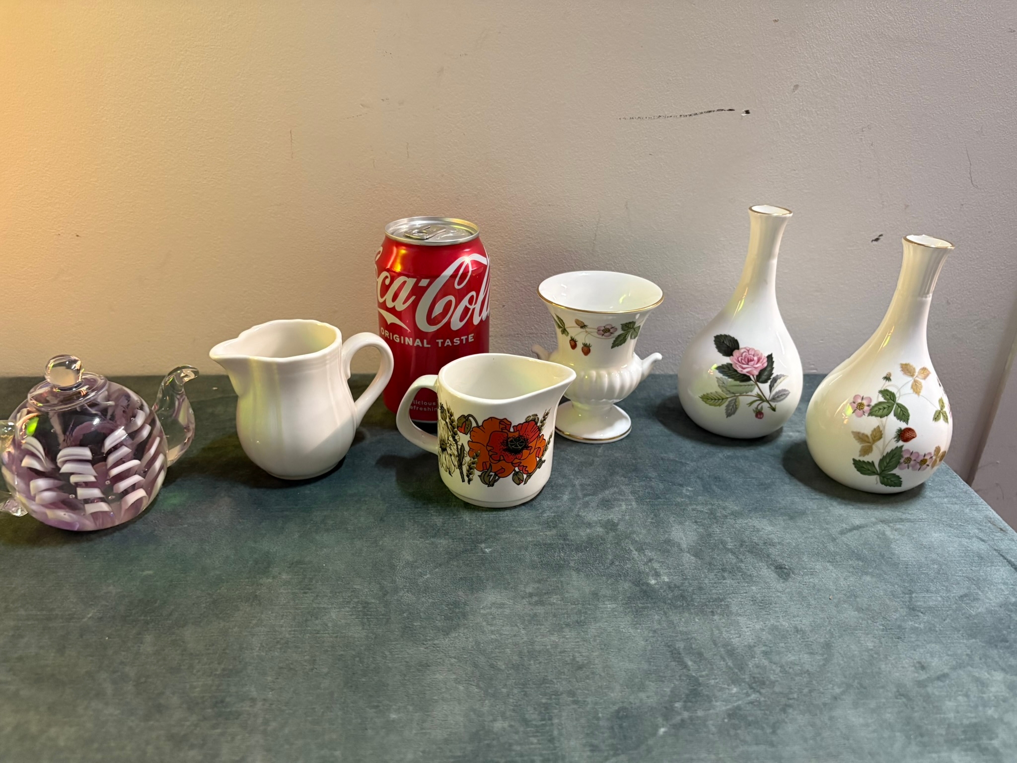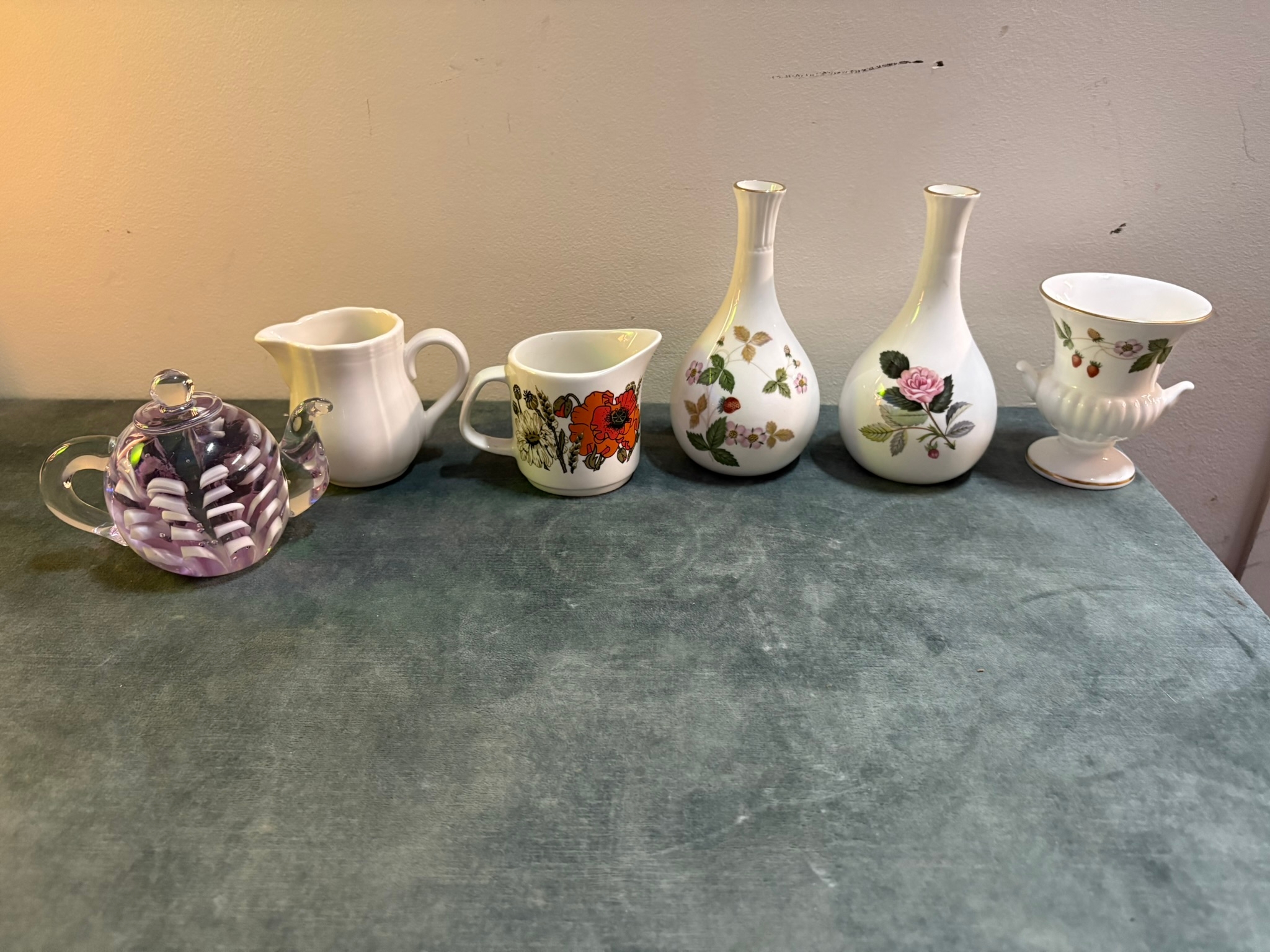 2 x Wedgewood posy vases, Wedgewood urn, glass teapot paperweight and two small jugs
