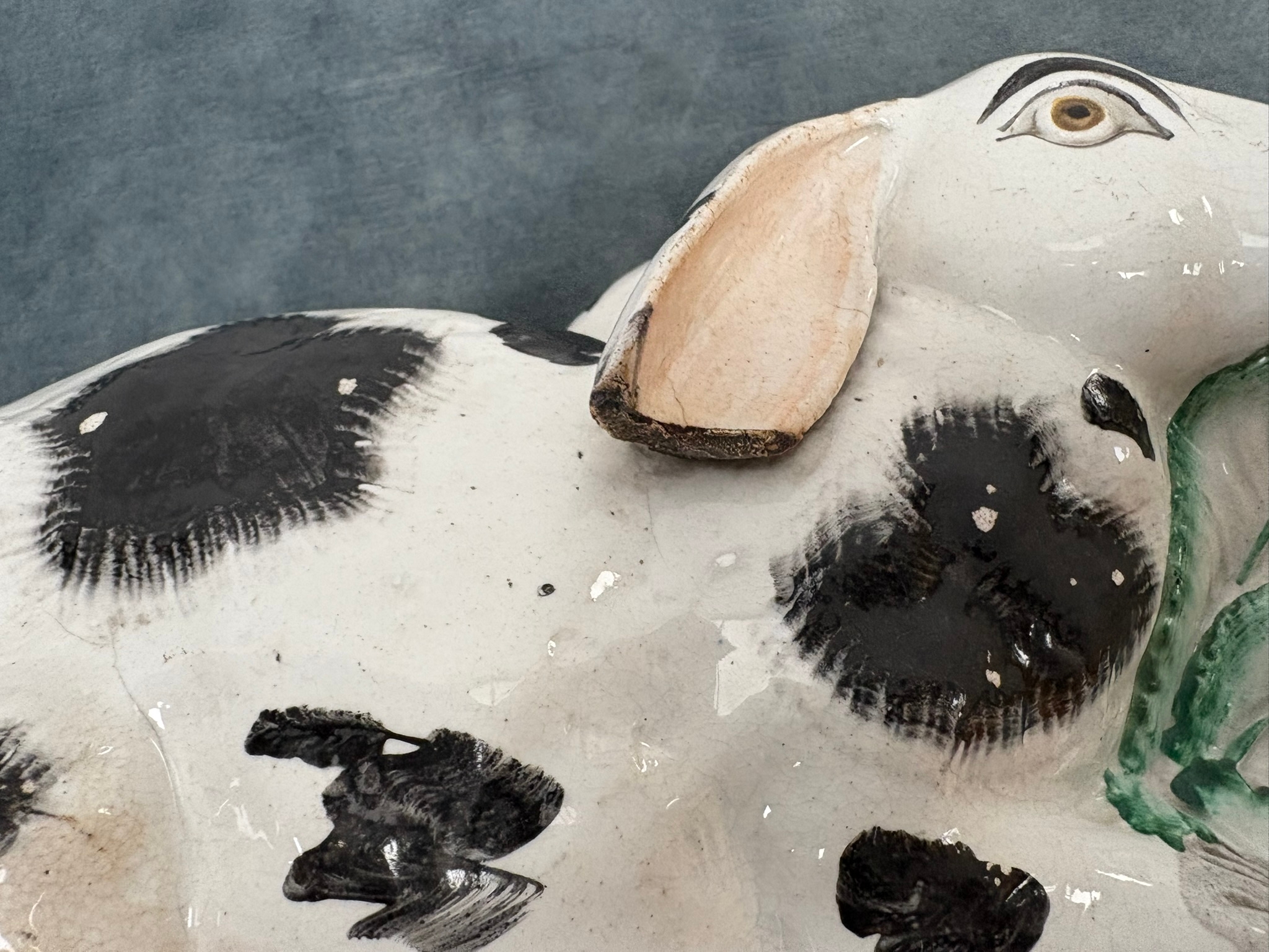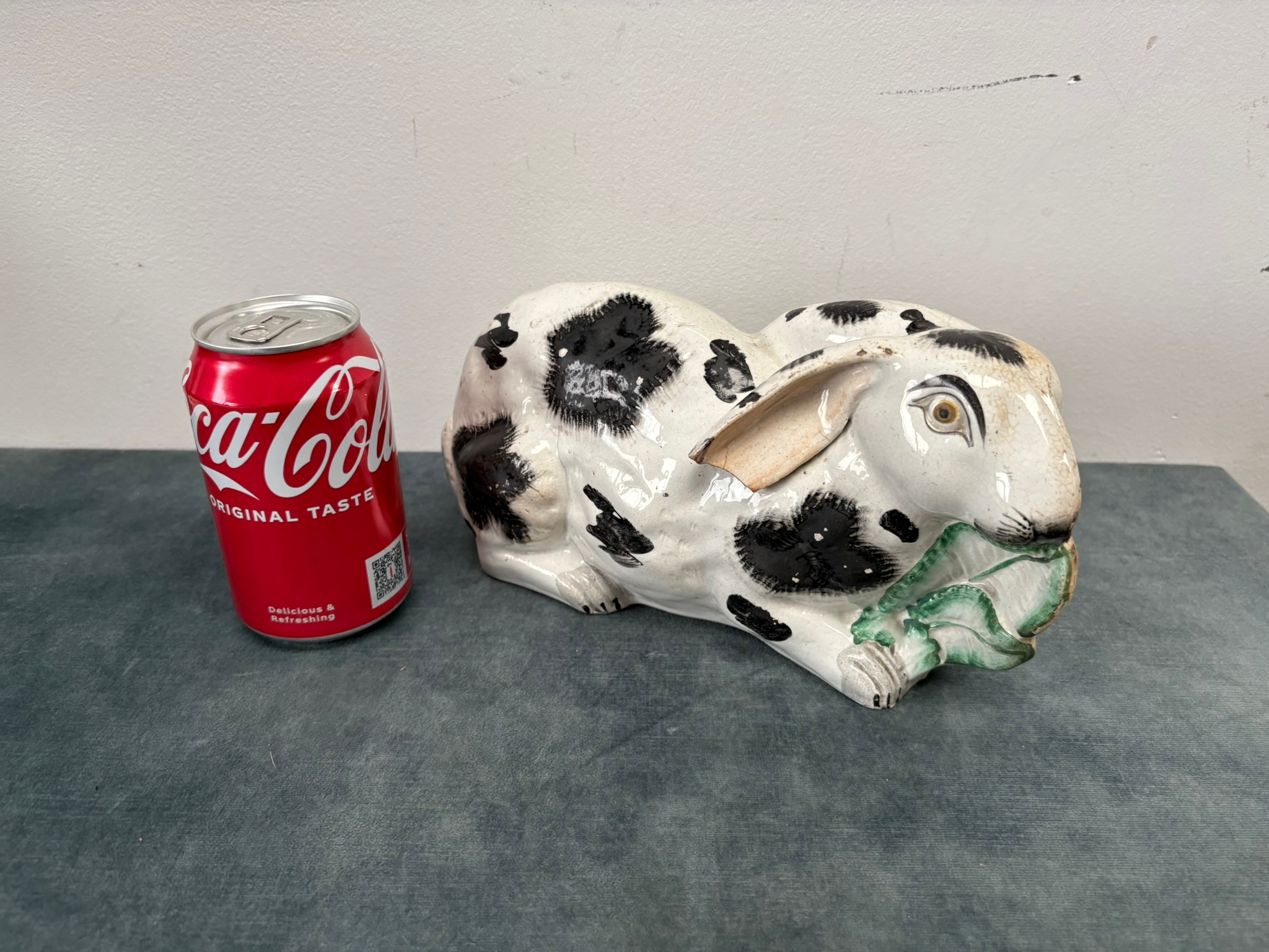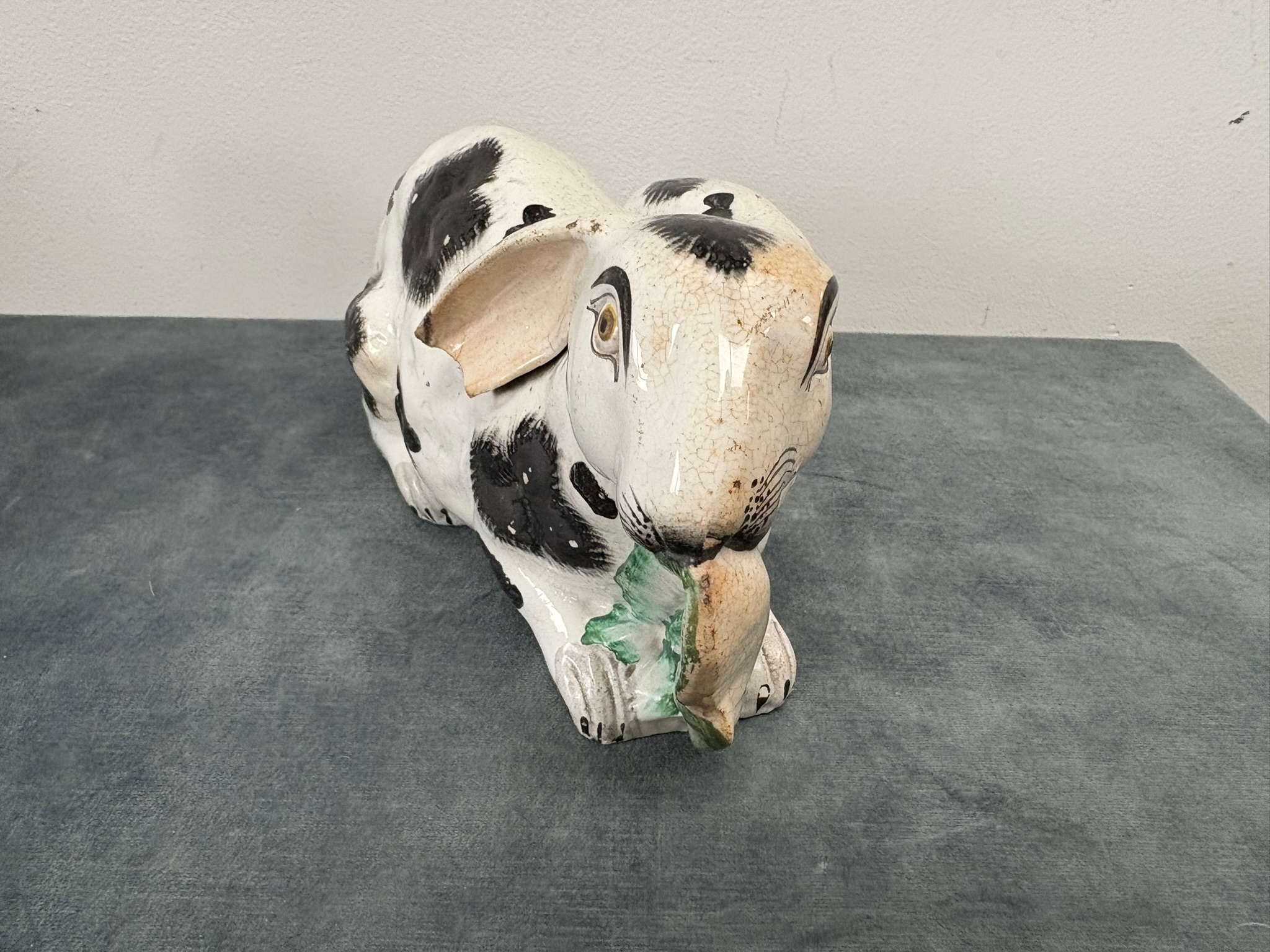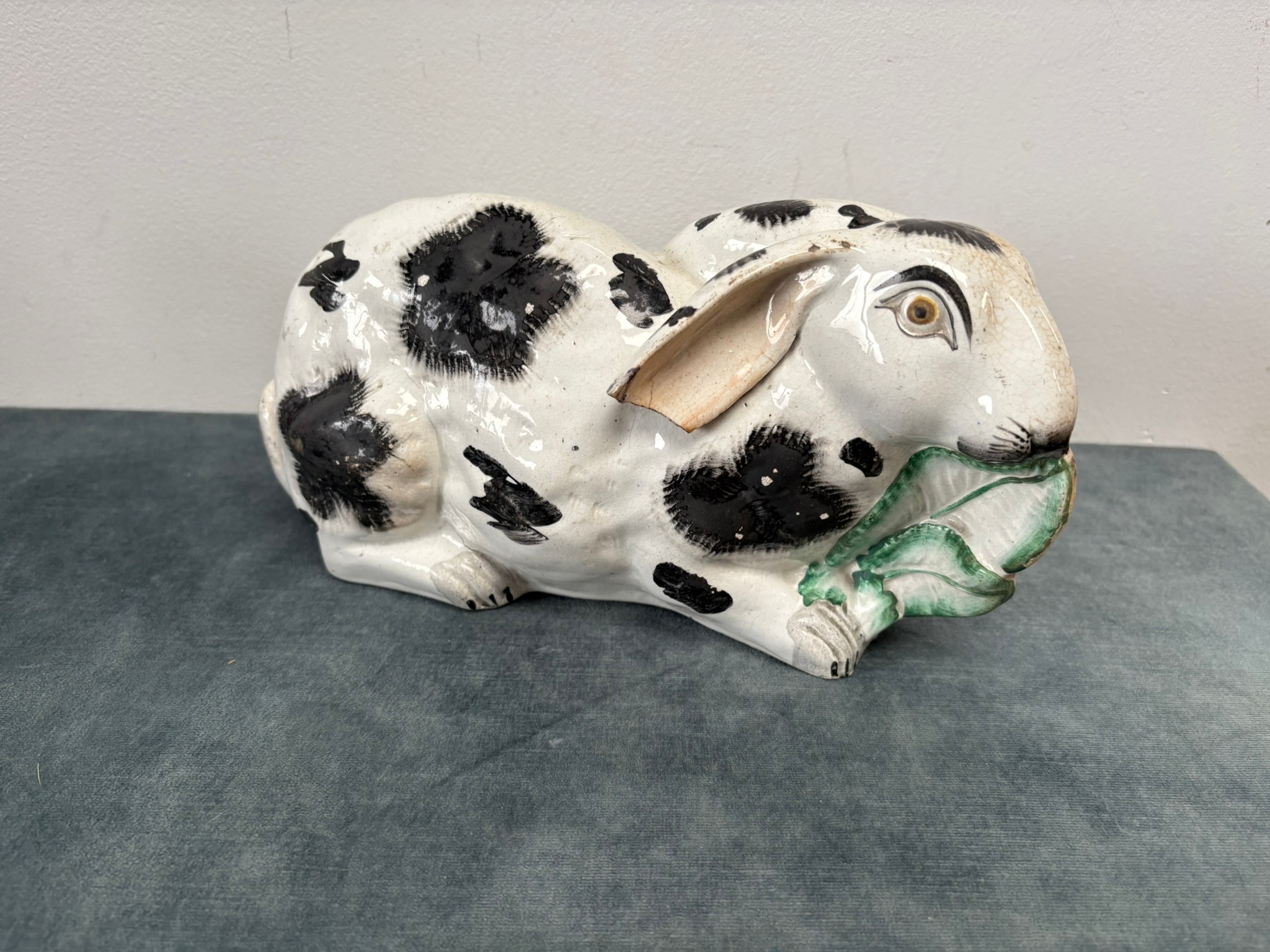 Antique Staffordshire pottery rabbit nibbling leaves