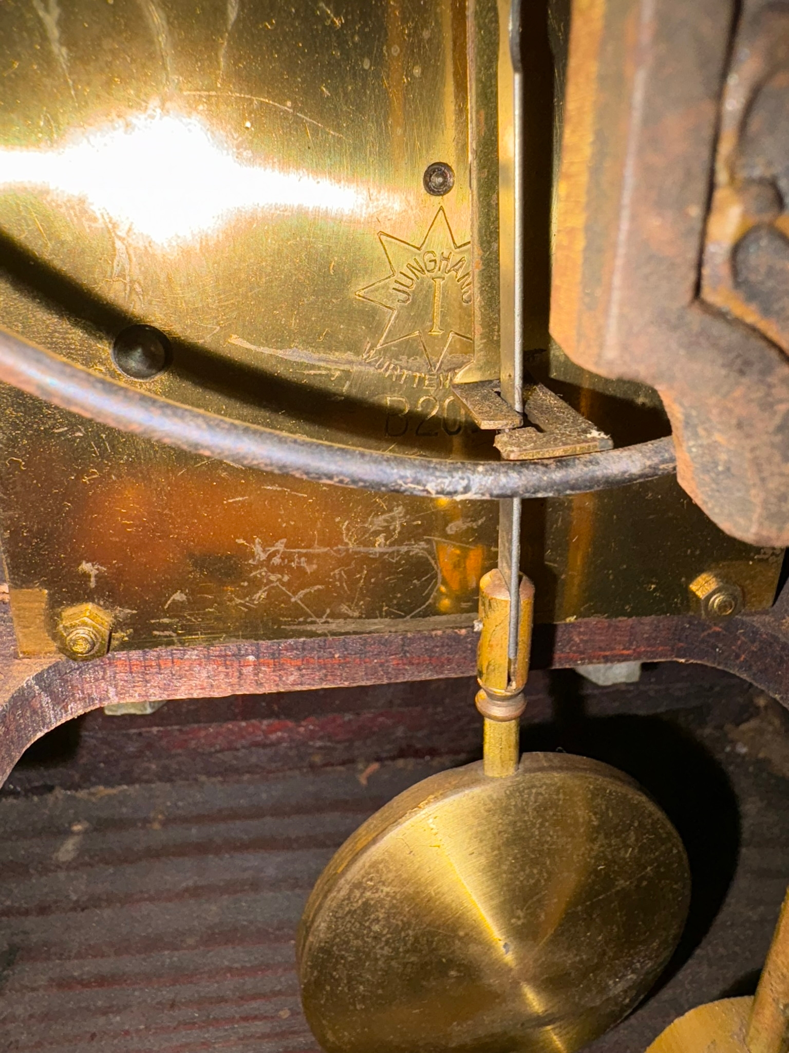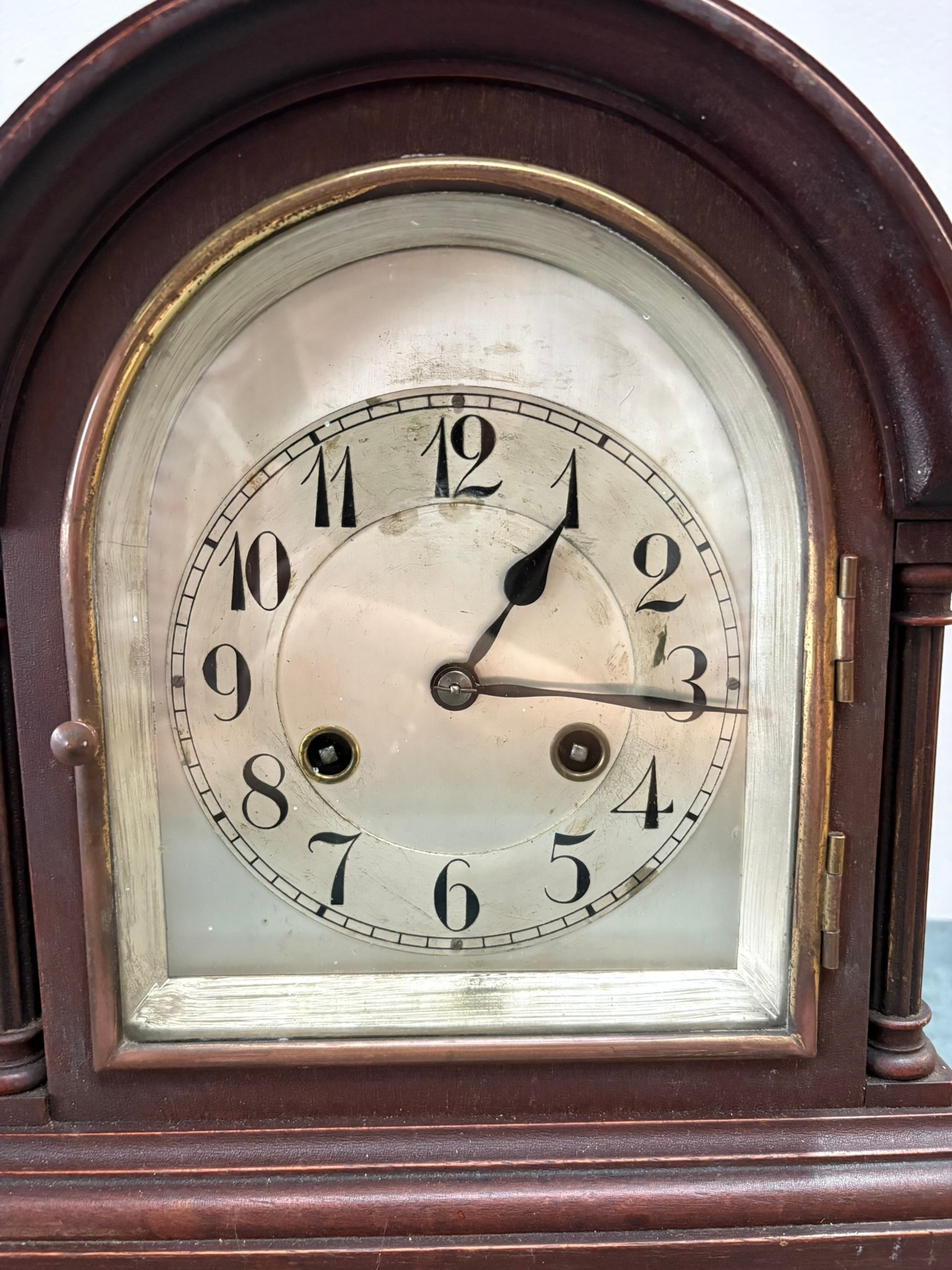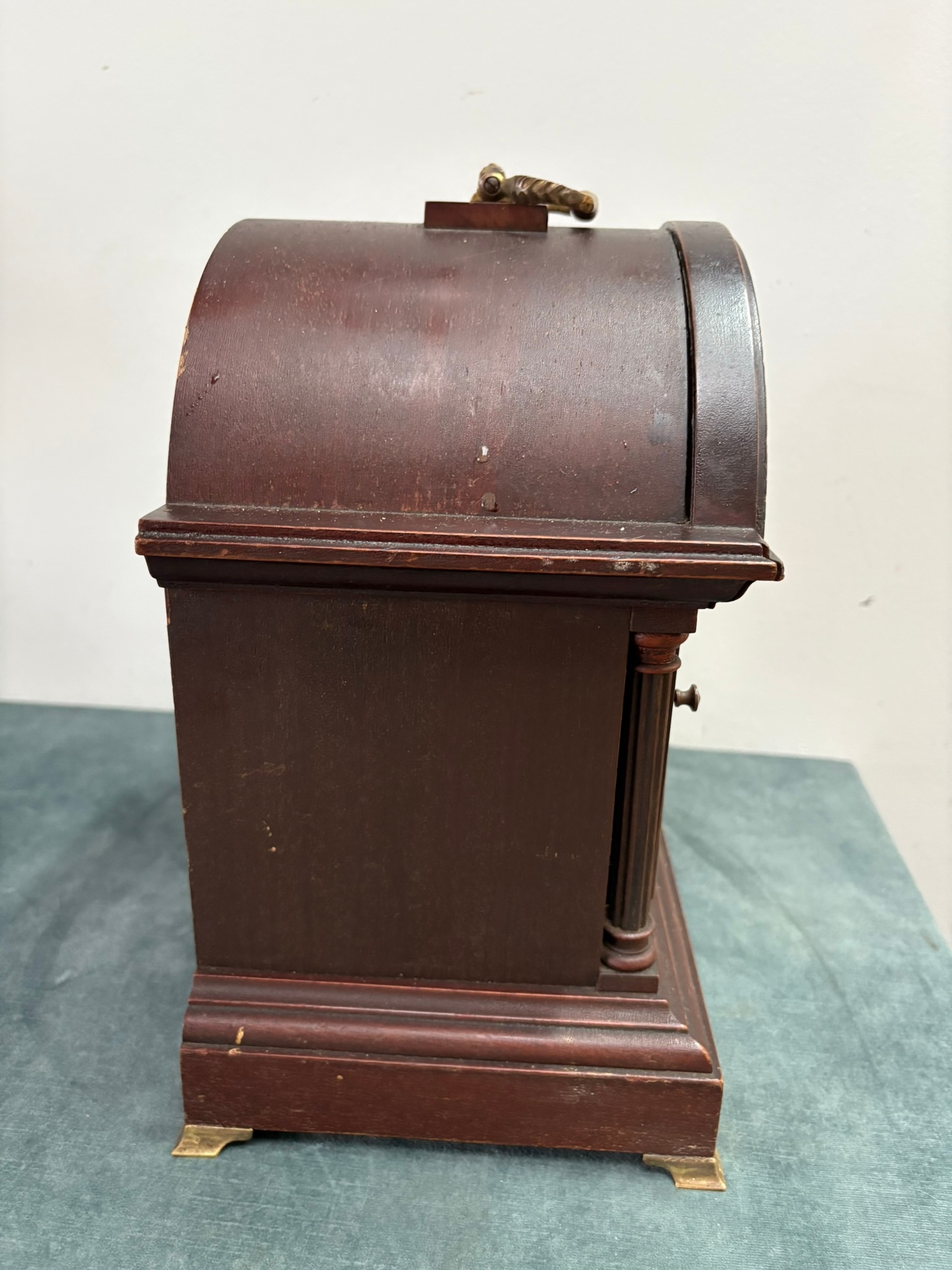 Antique Junghans bracket clock with silvered dial, brass handle and feet