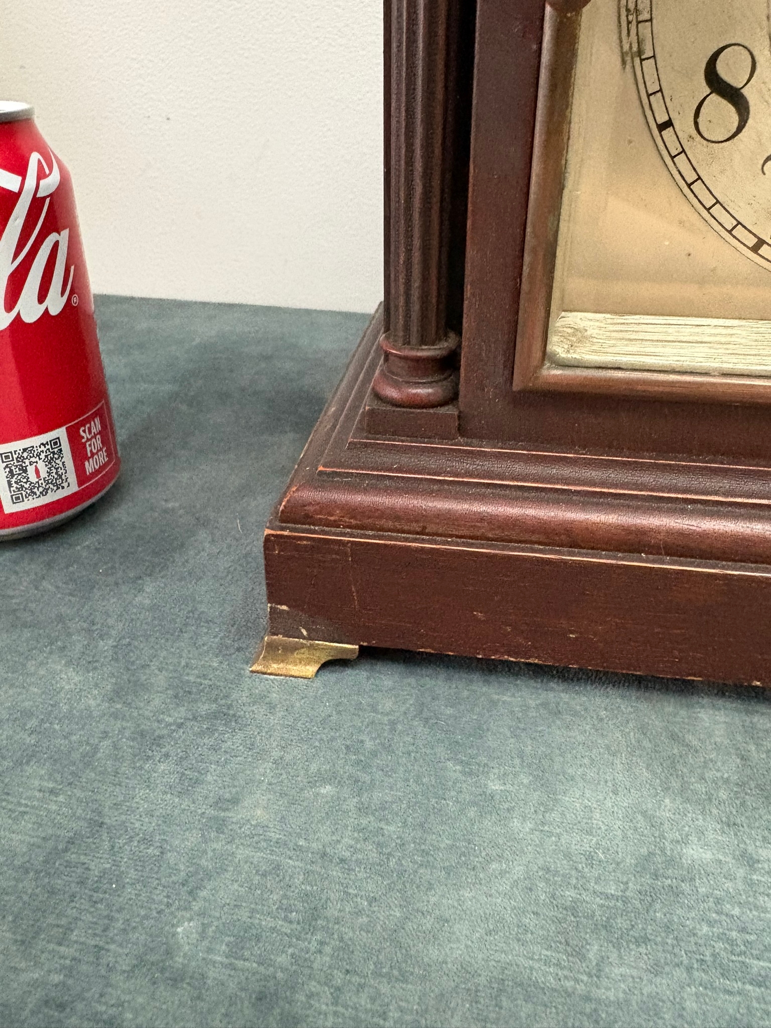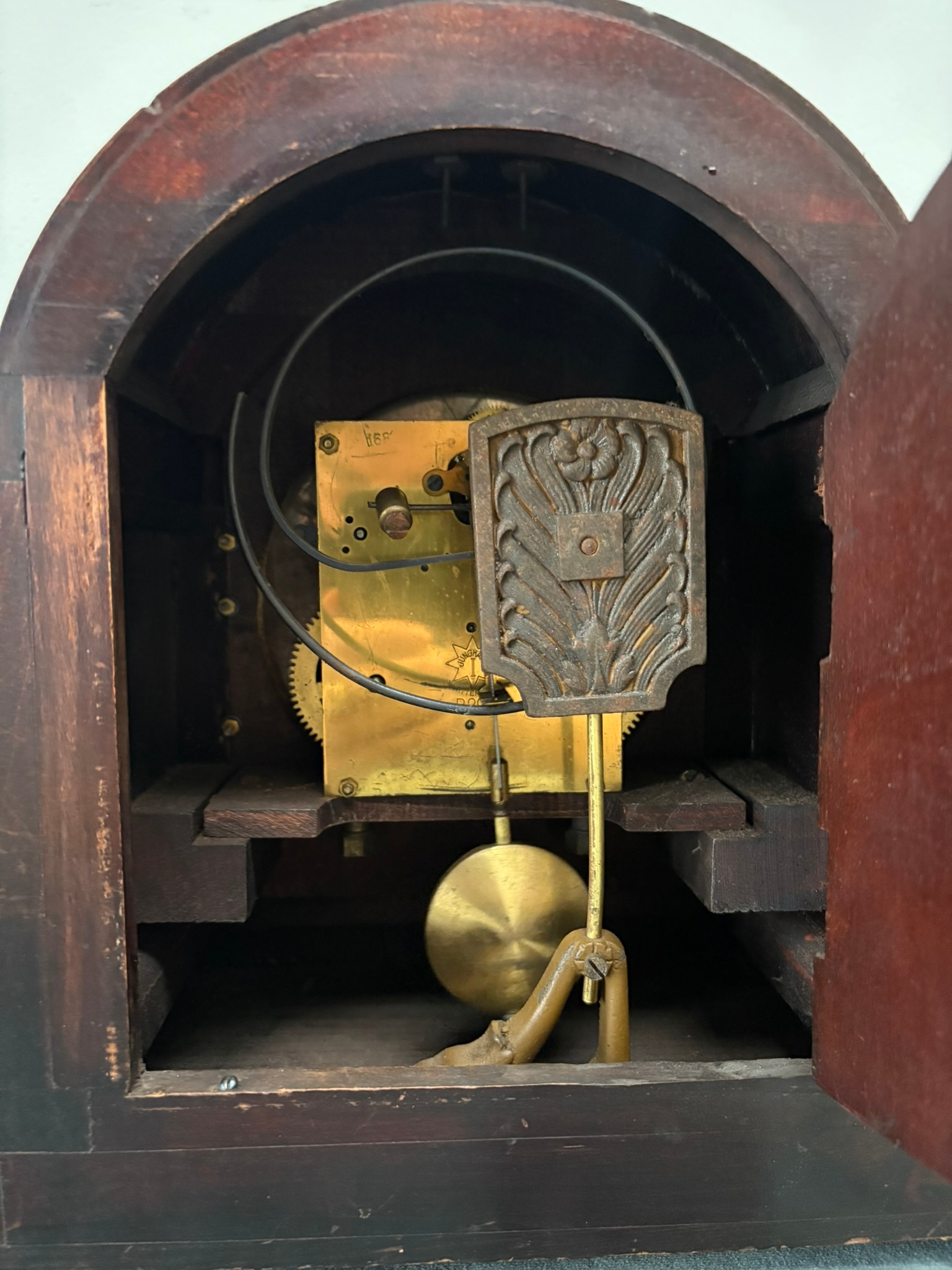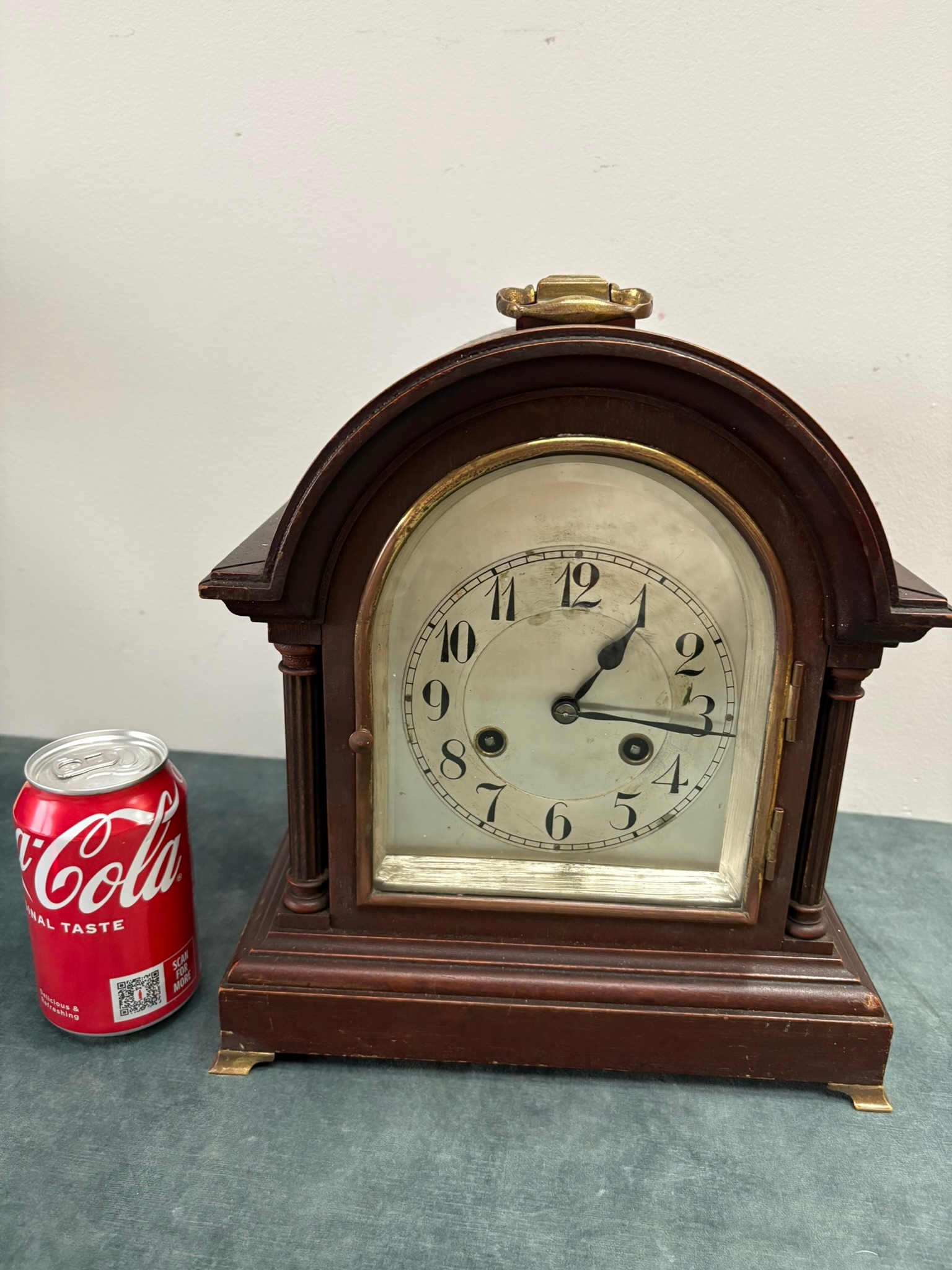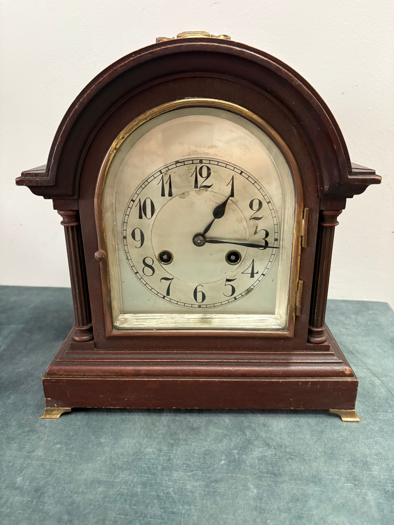 Antique Junghans bracket clock with silvered dial, brass handle and feet