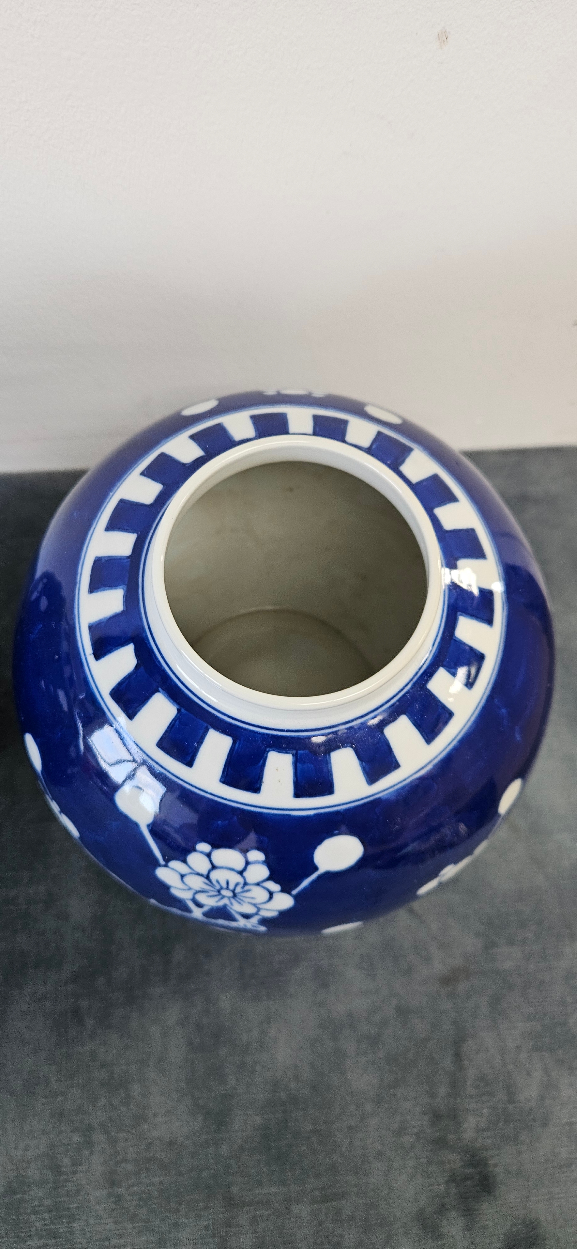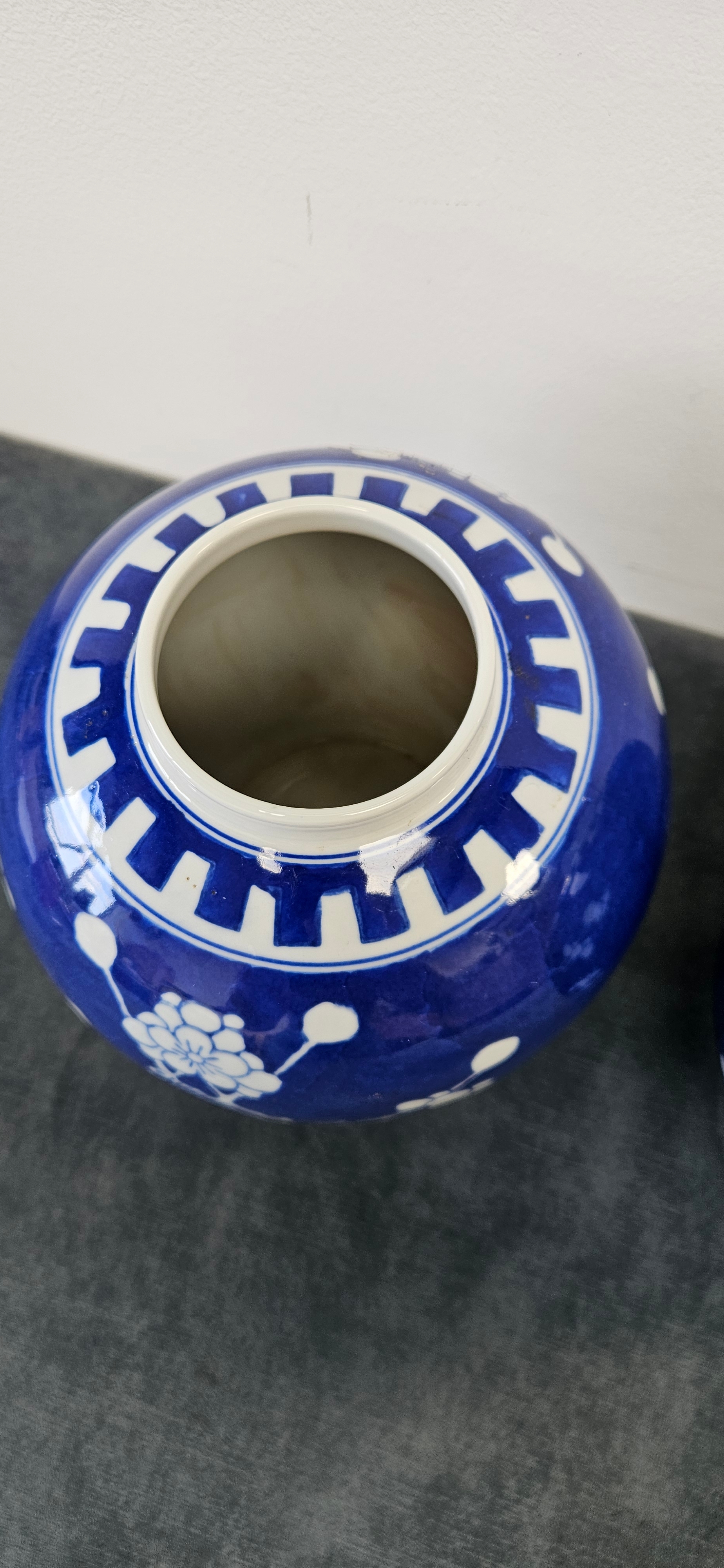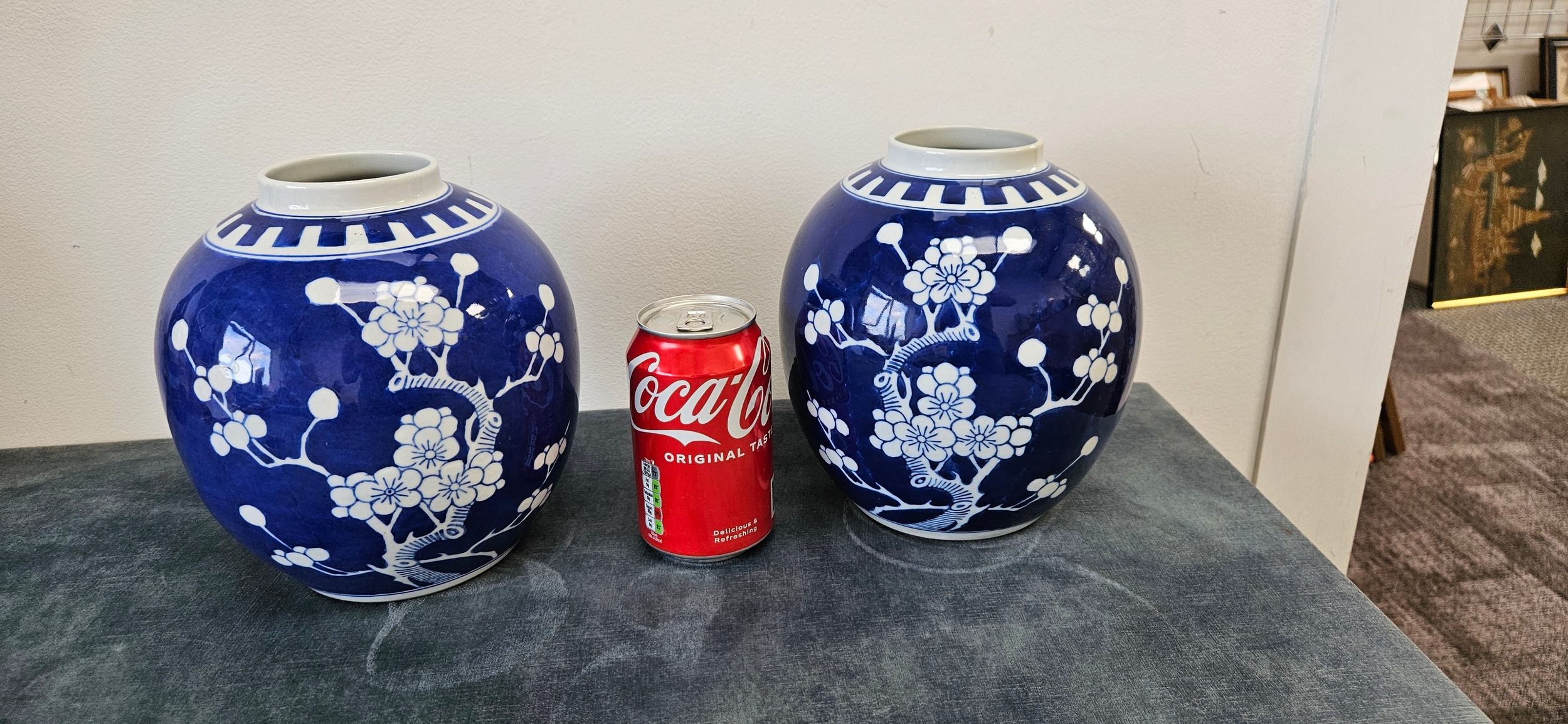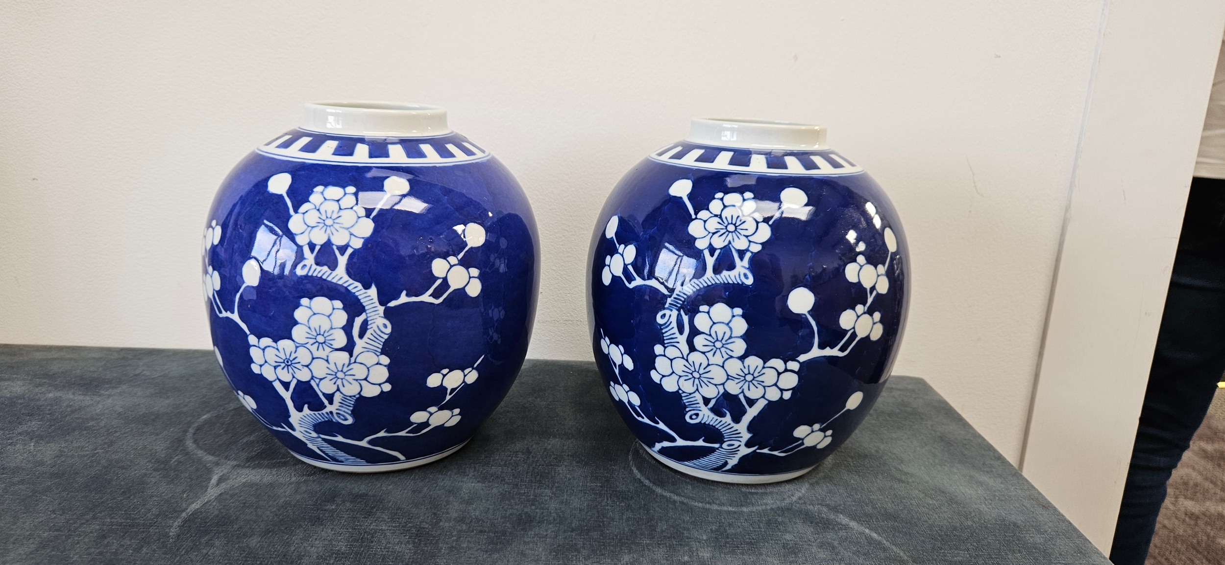 2 x Large oriental ginger jars. Blue and white and decorated with prunus blossom