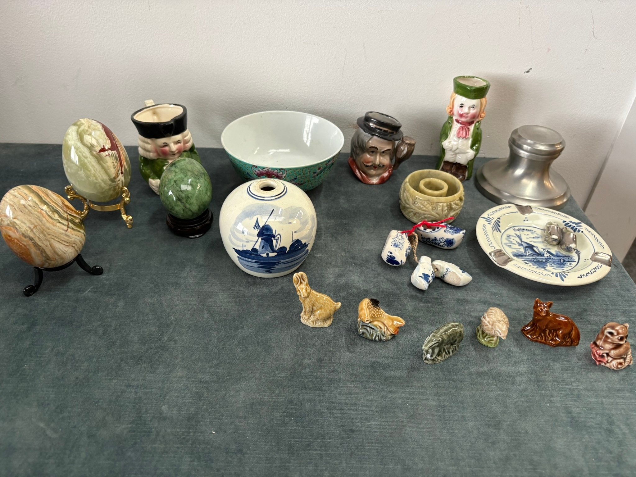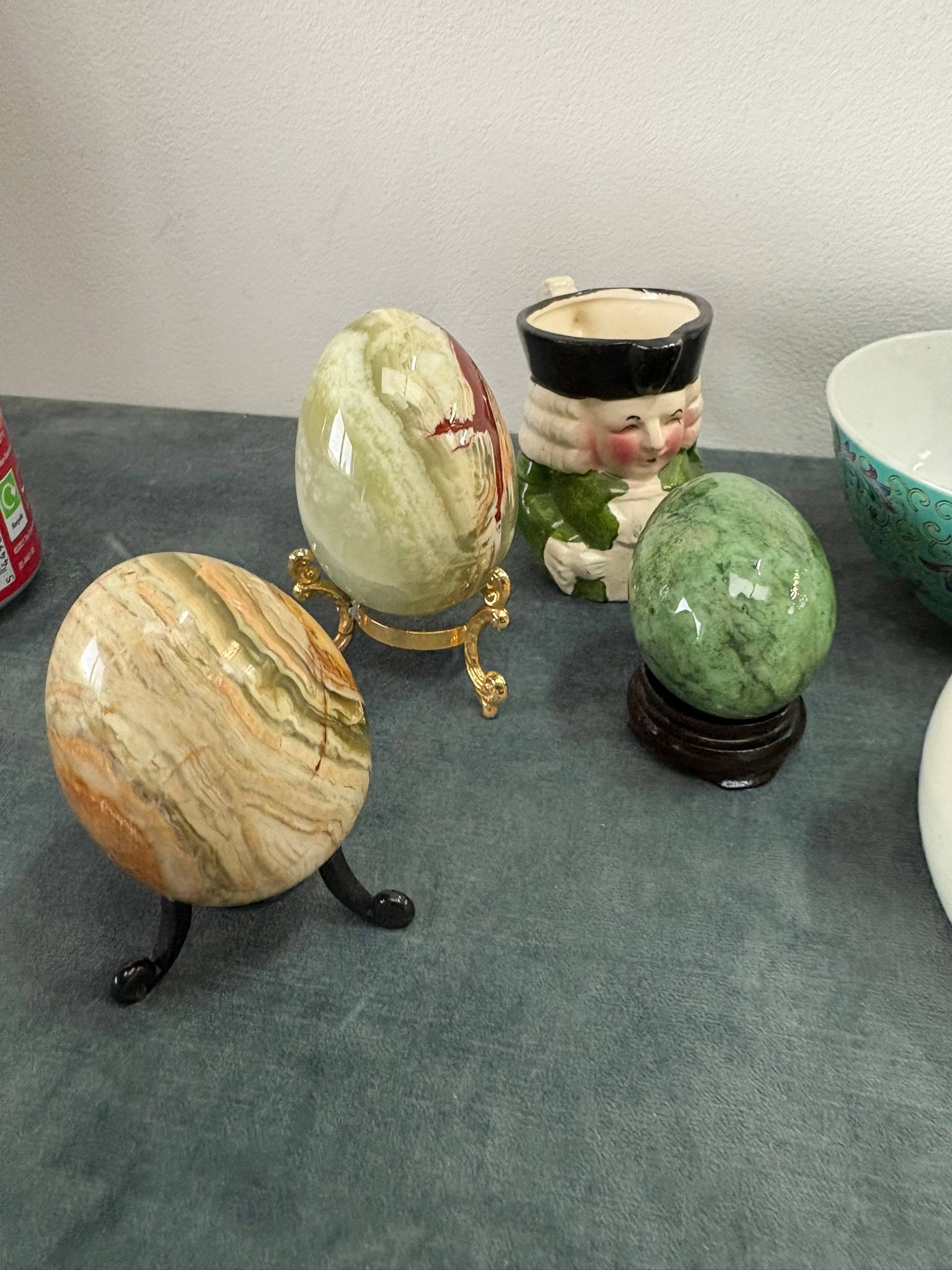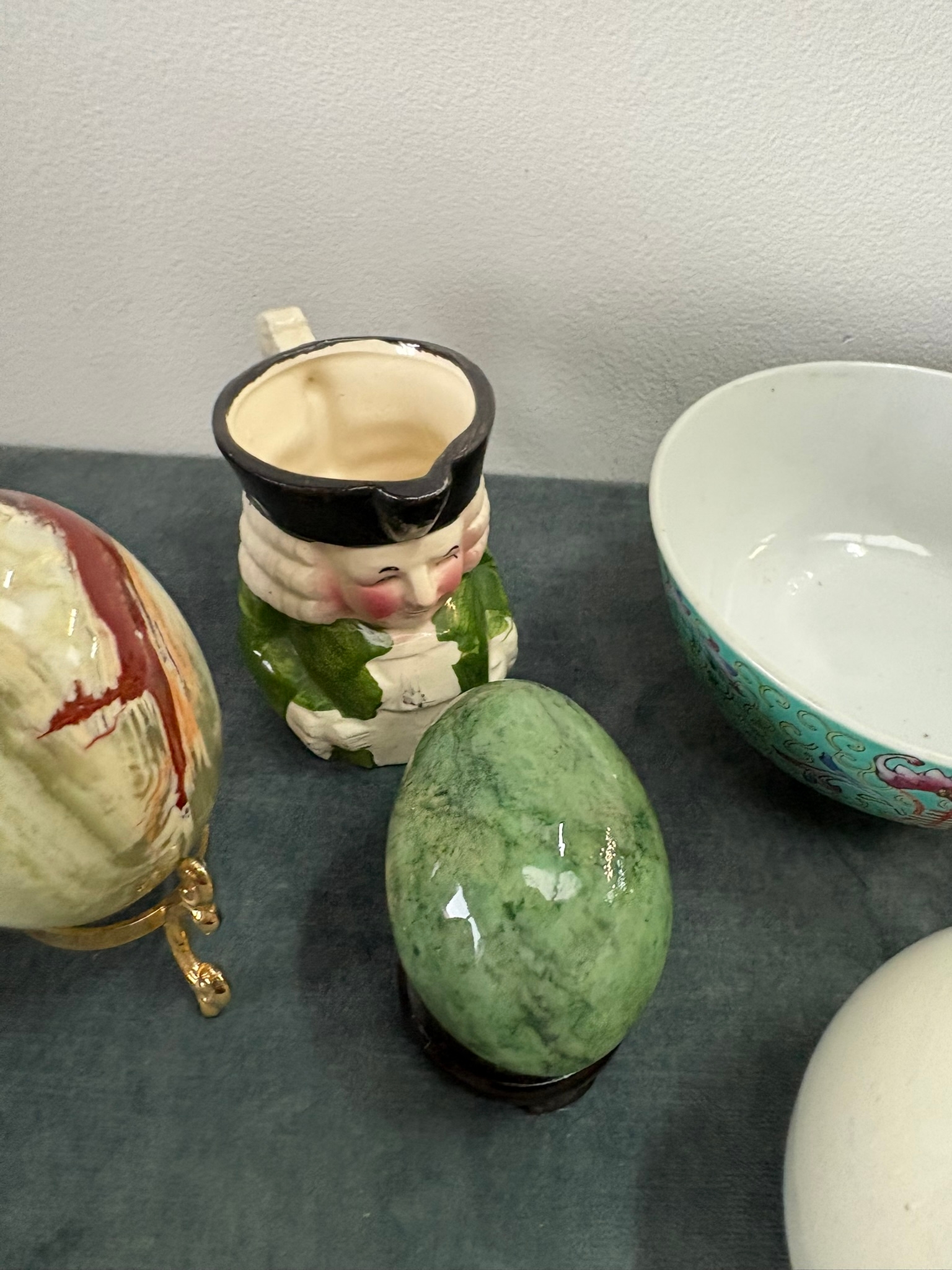 Miscellaneous ornaments including onyx eggs, delft, toby jugs, wade miniatures ect.