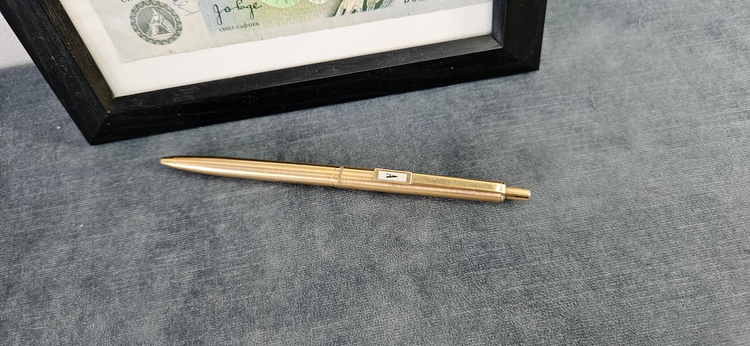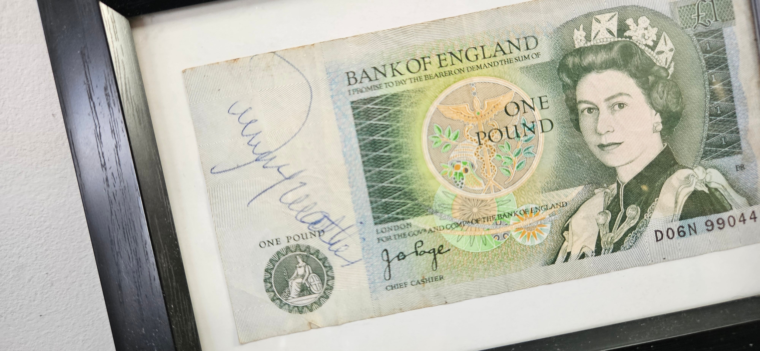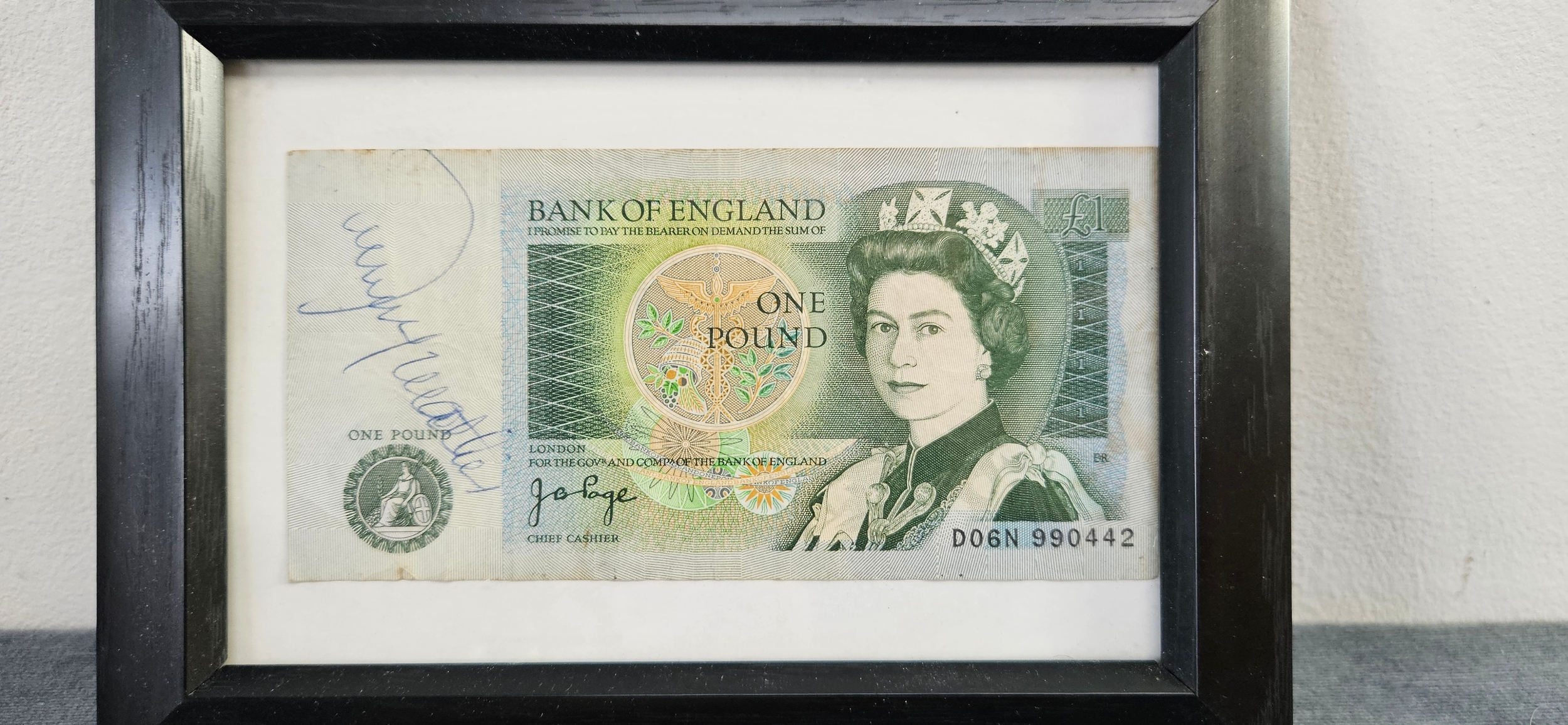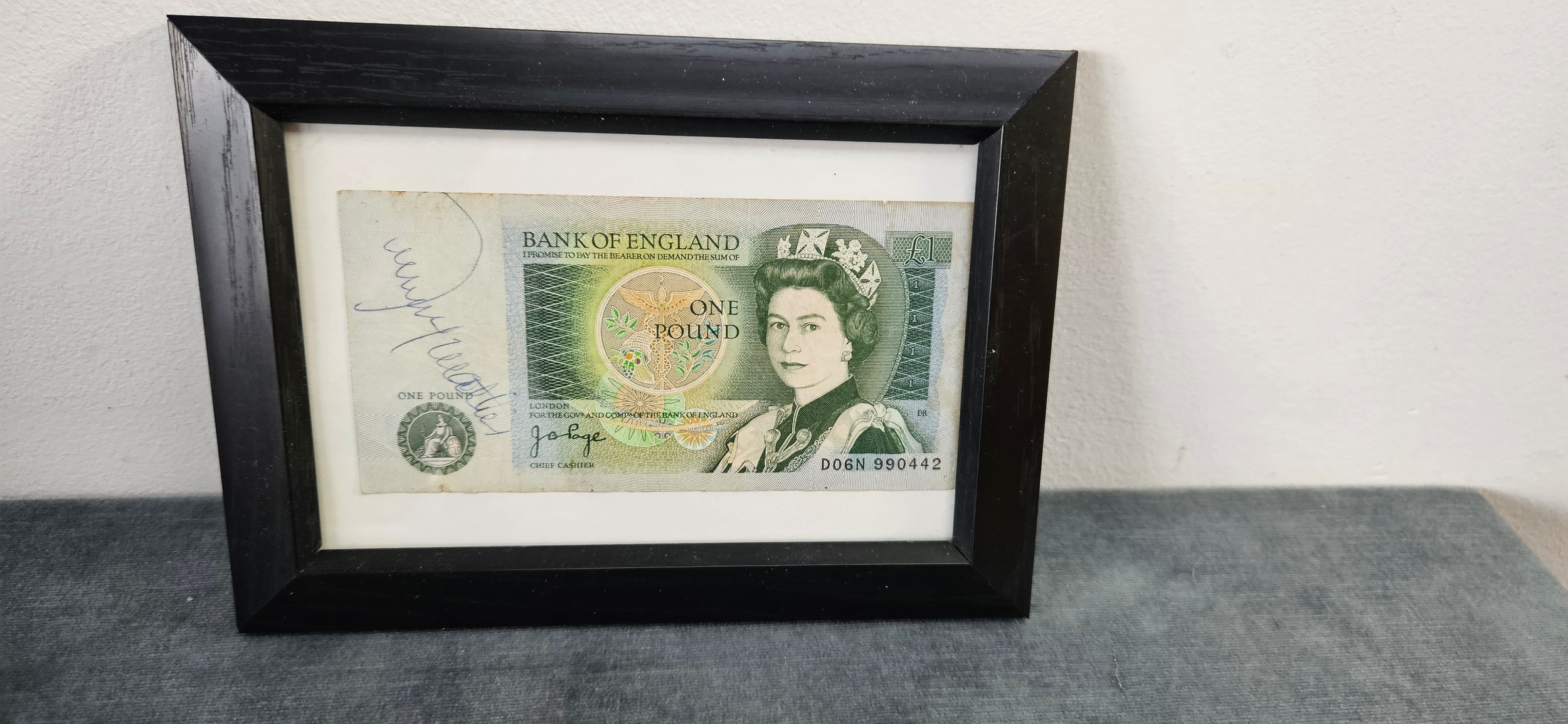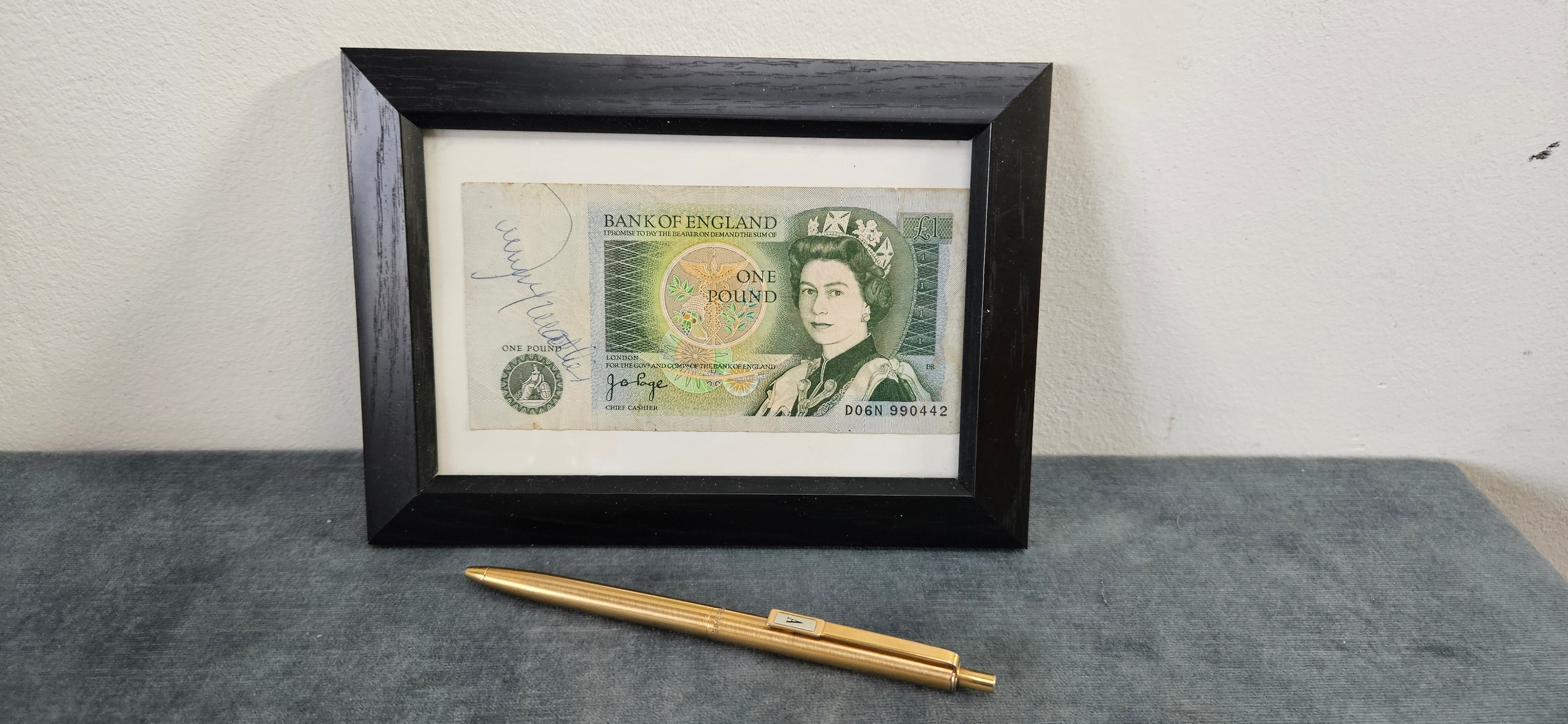 Johnny Mathis signed/ autographed £1 note in black frame. Along with the Parker pen he used to to sign the note