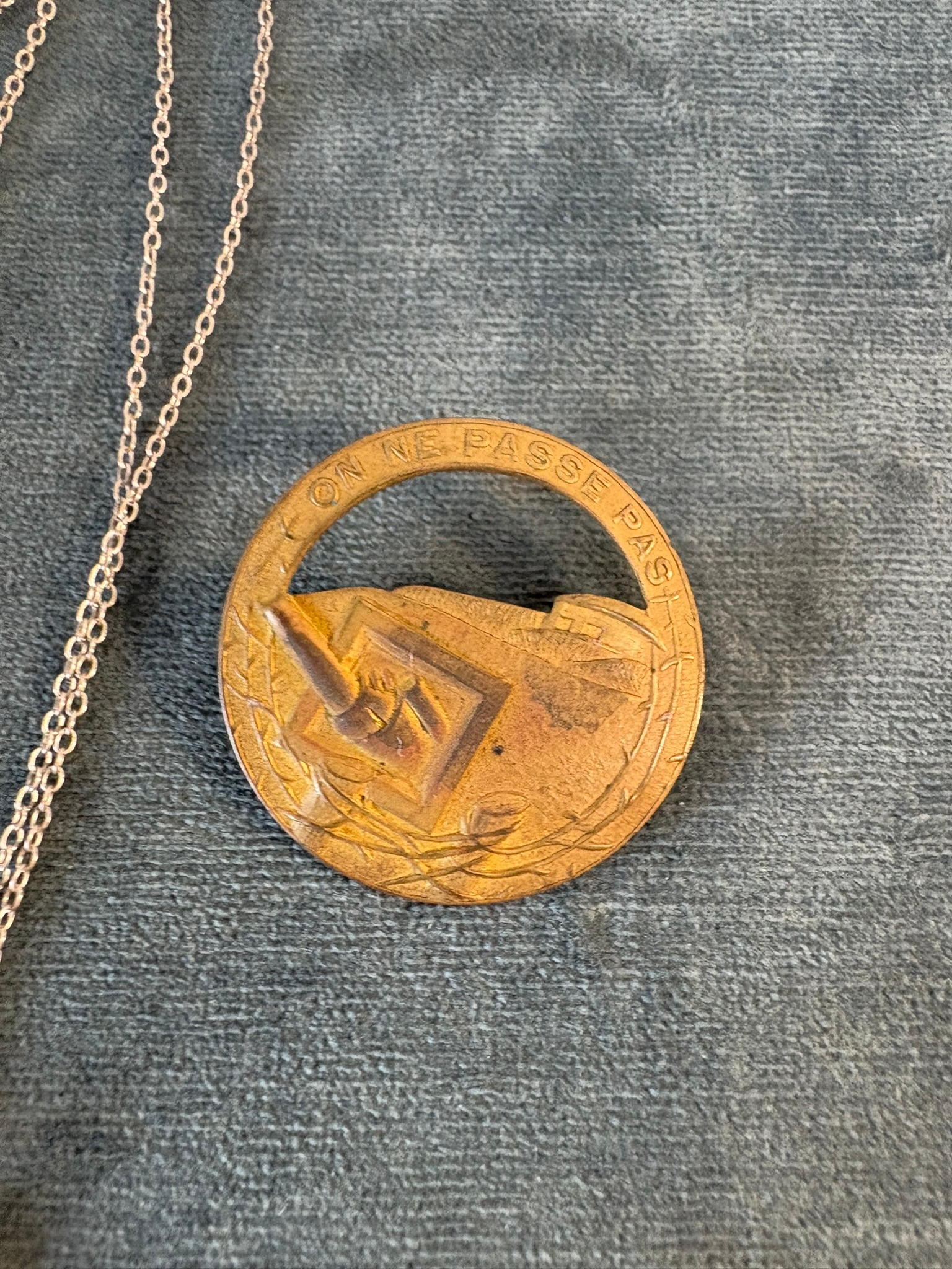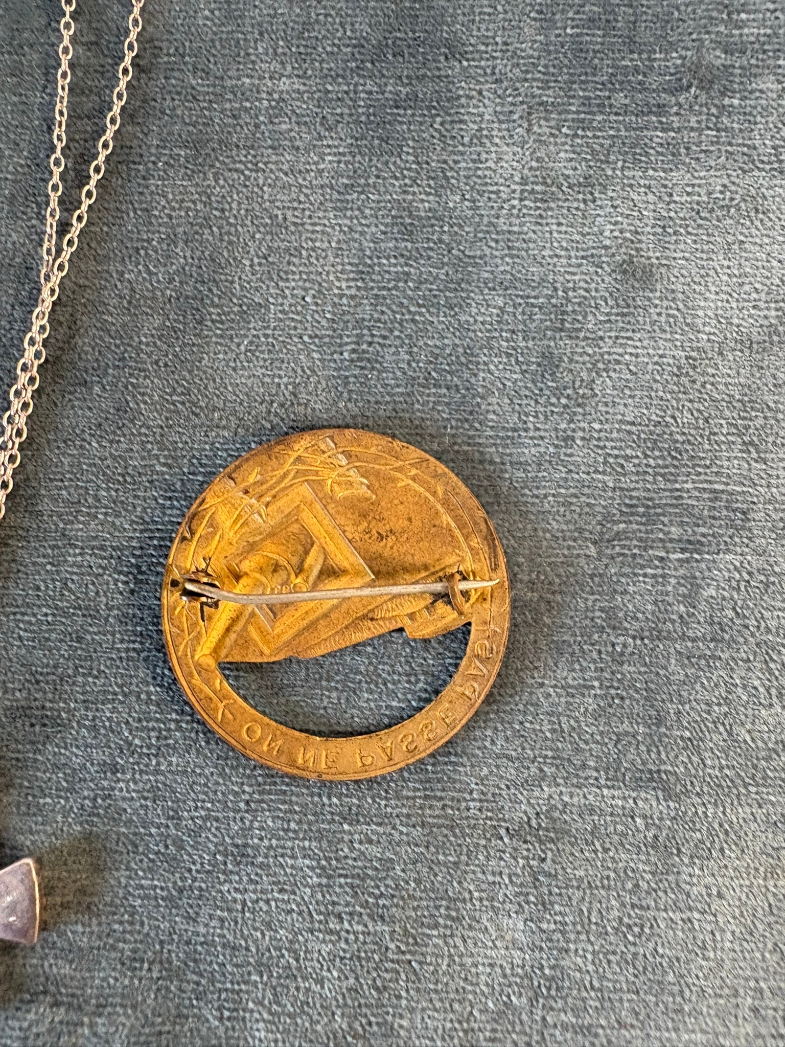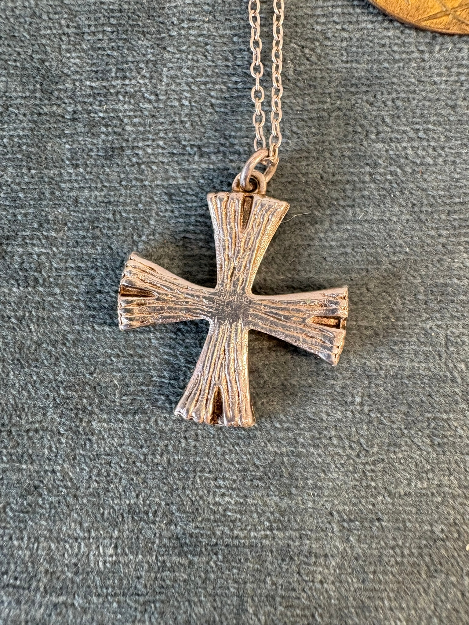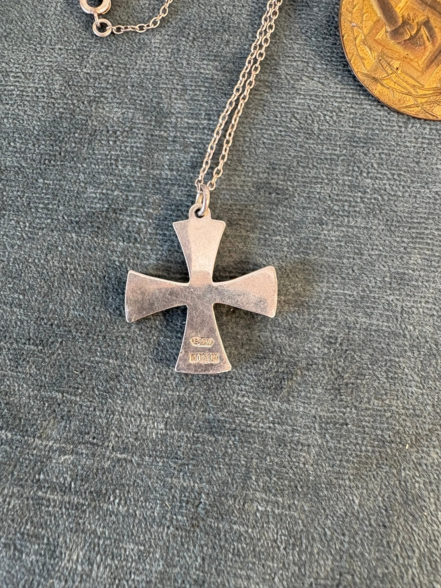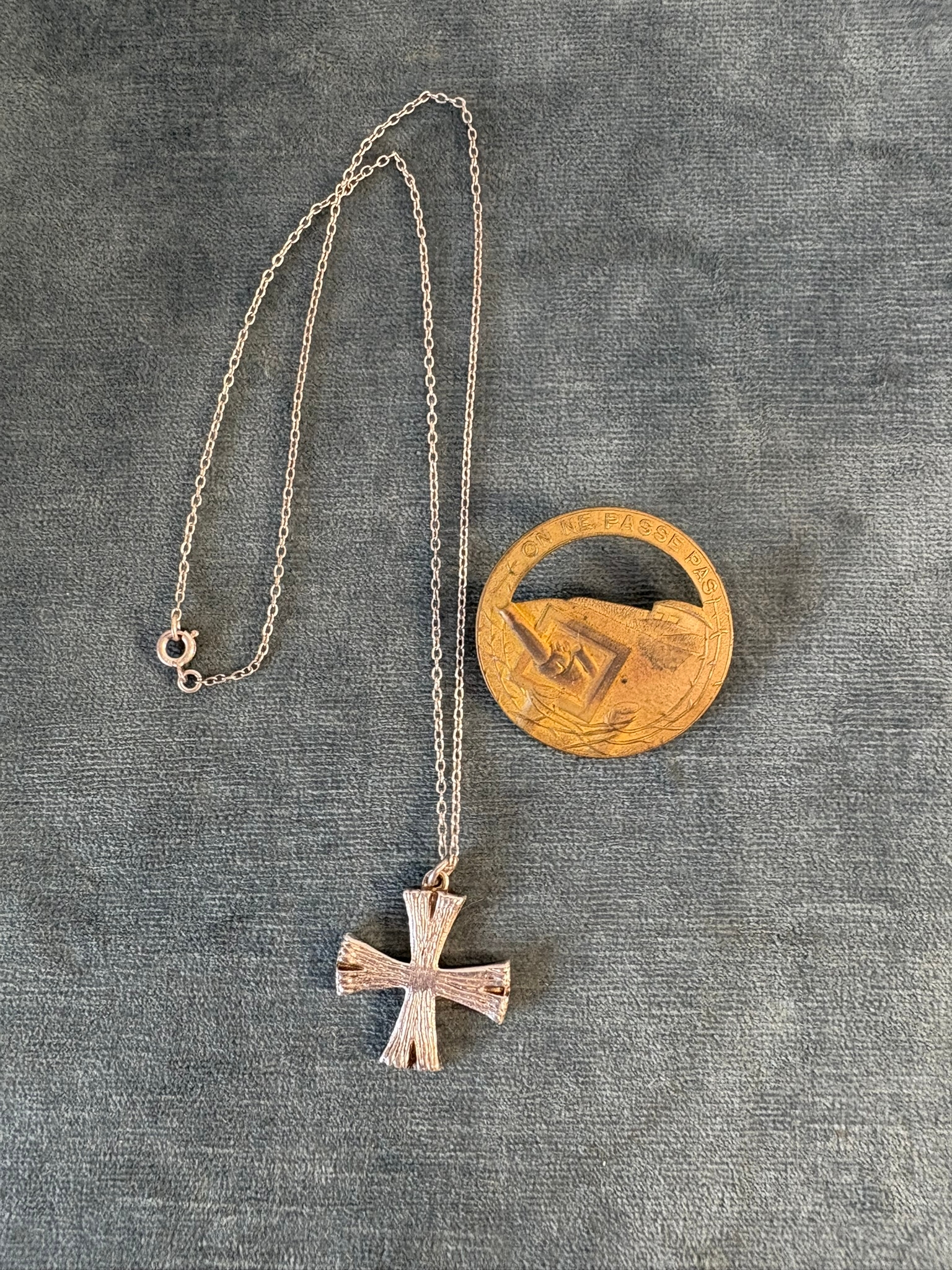 Silver wood effect cross necklace and pendant along with WW2 French ‘Maginot Line’ brooch
