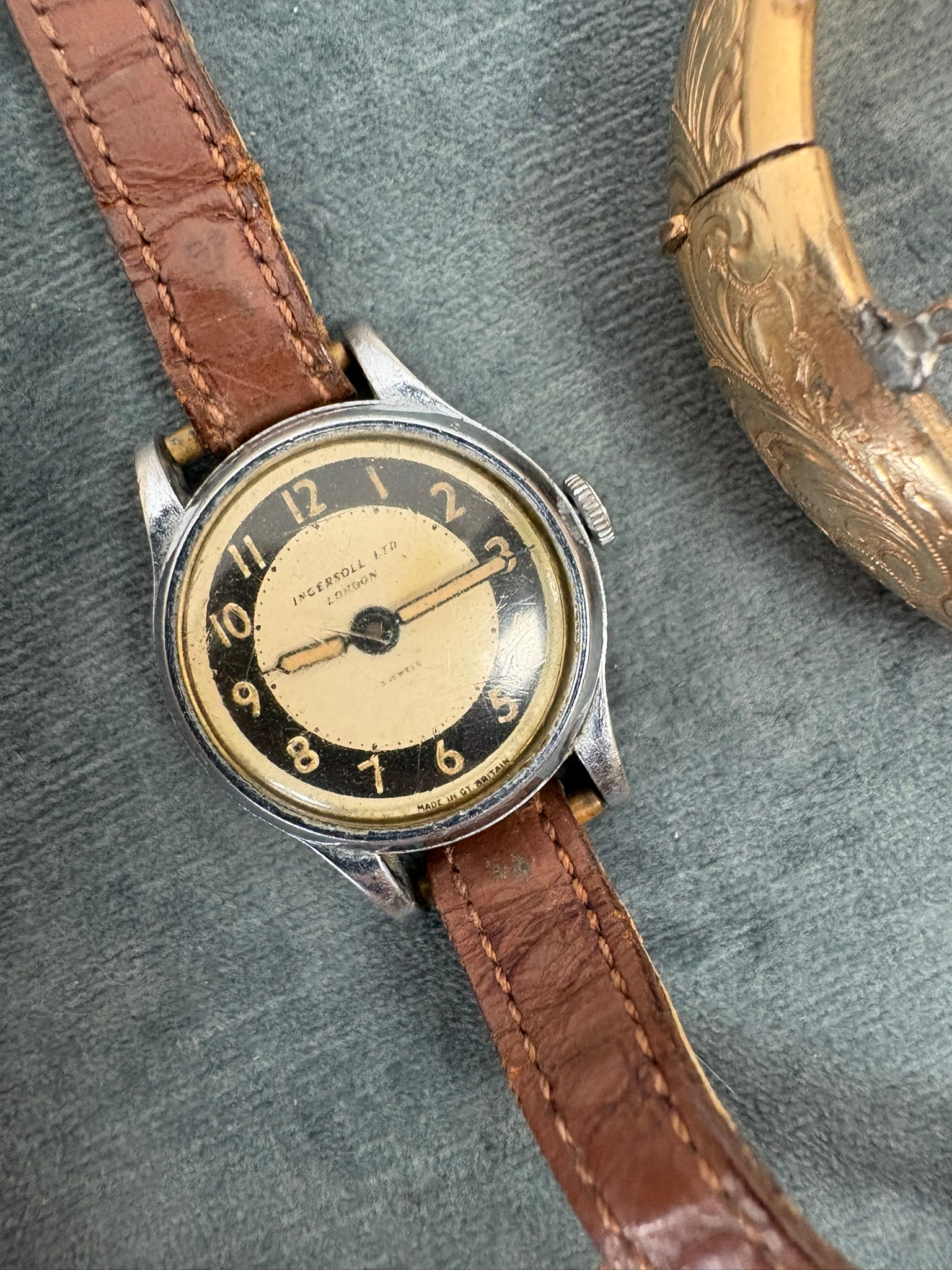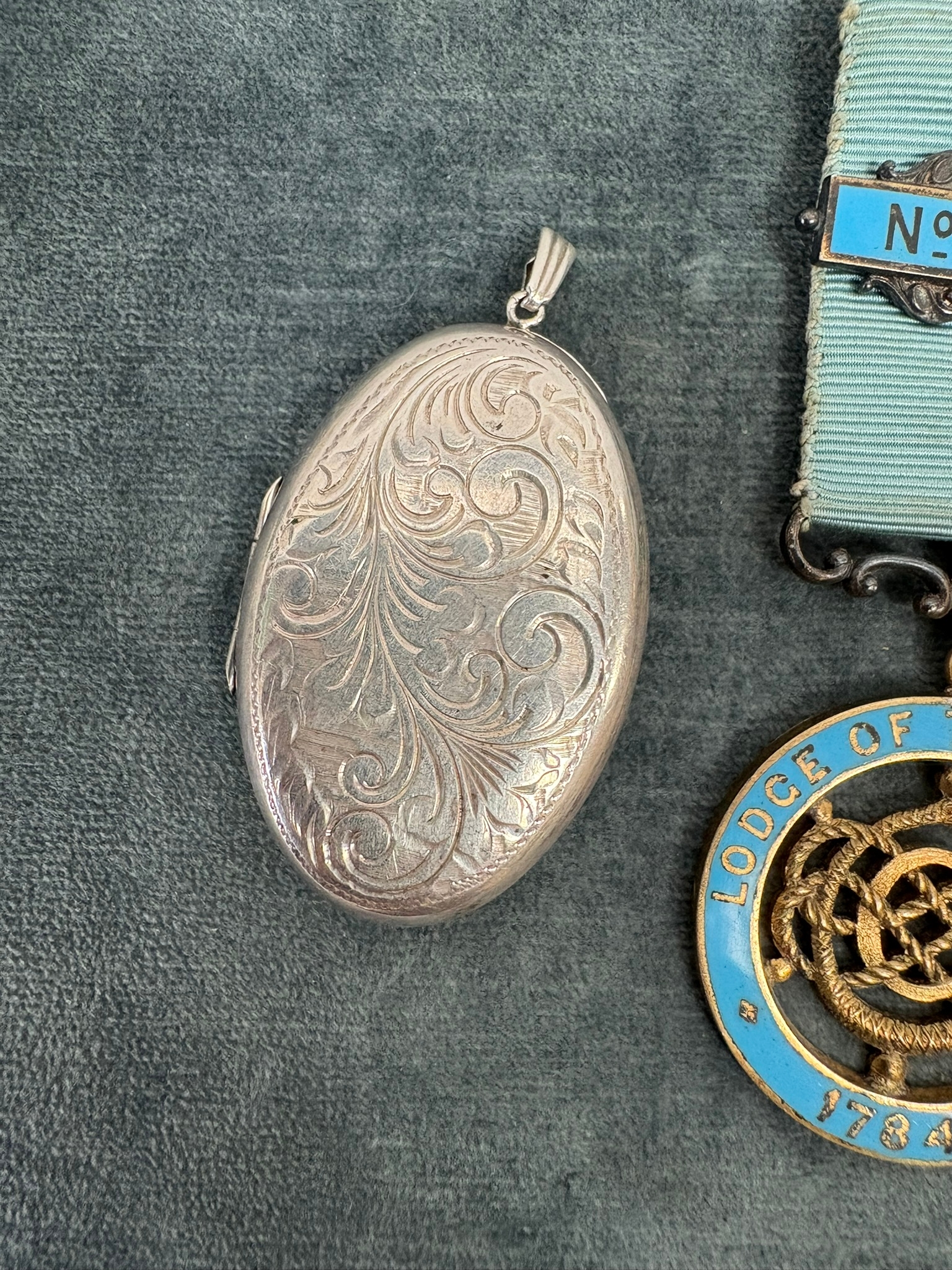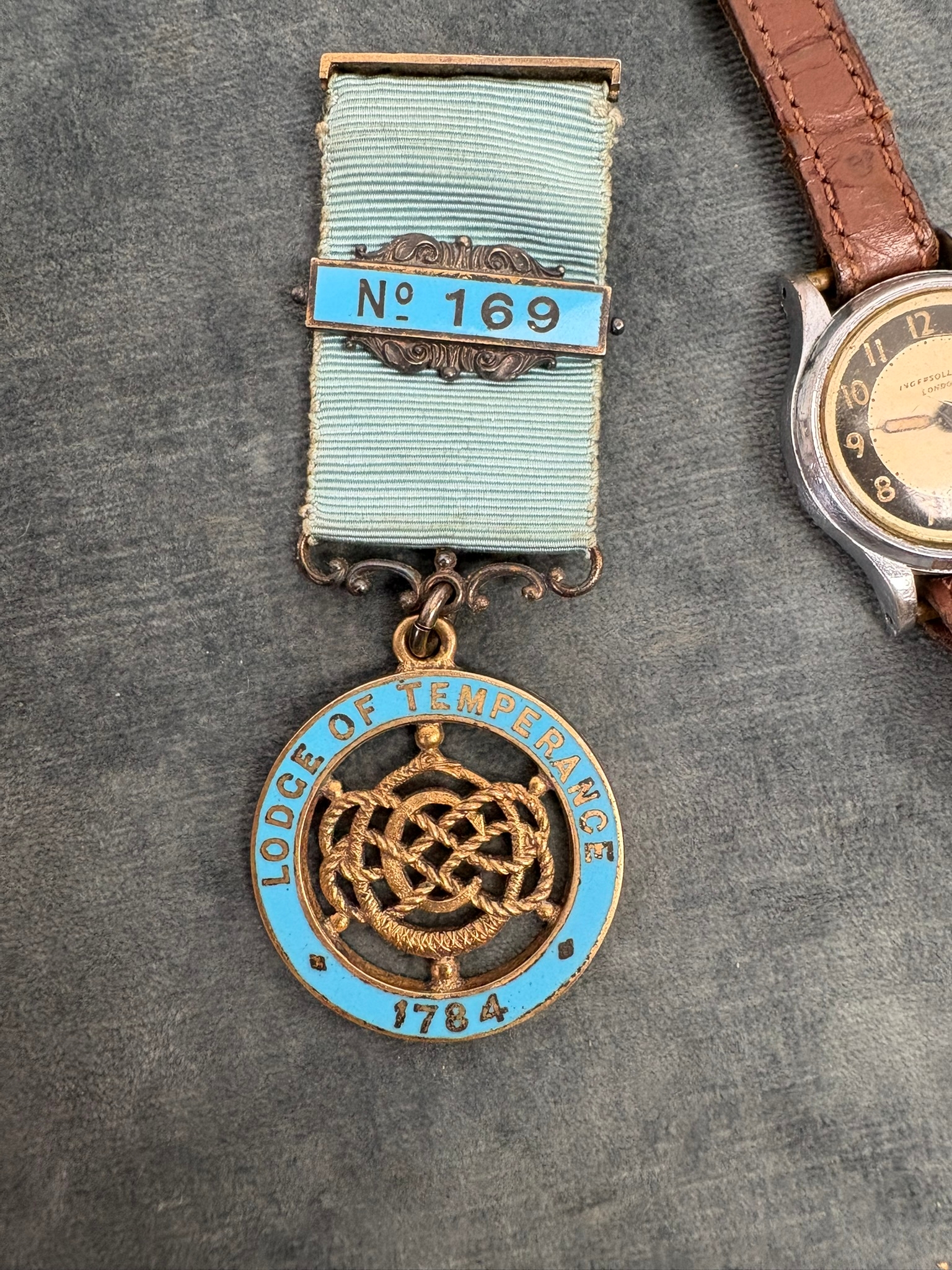 Silver masonic medal, silver locket, Ingersoll watch and gold plated bangle