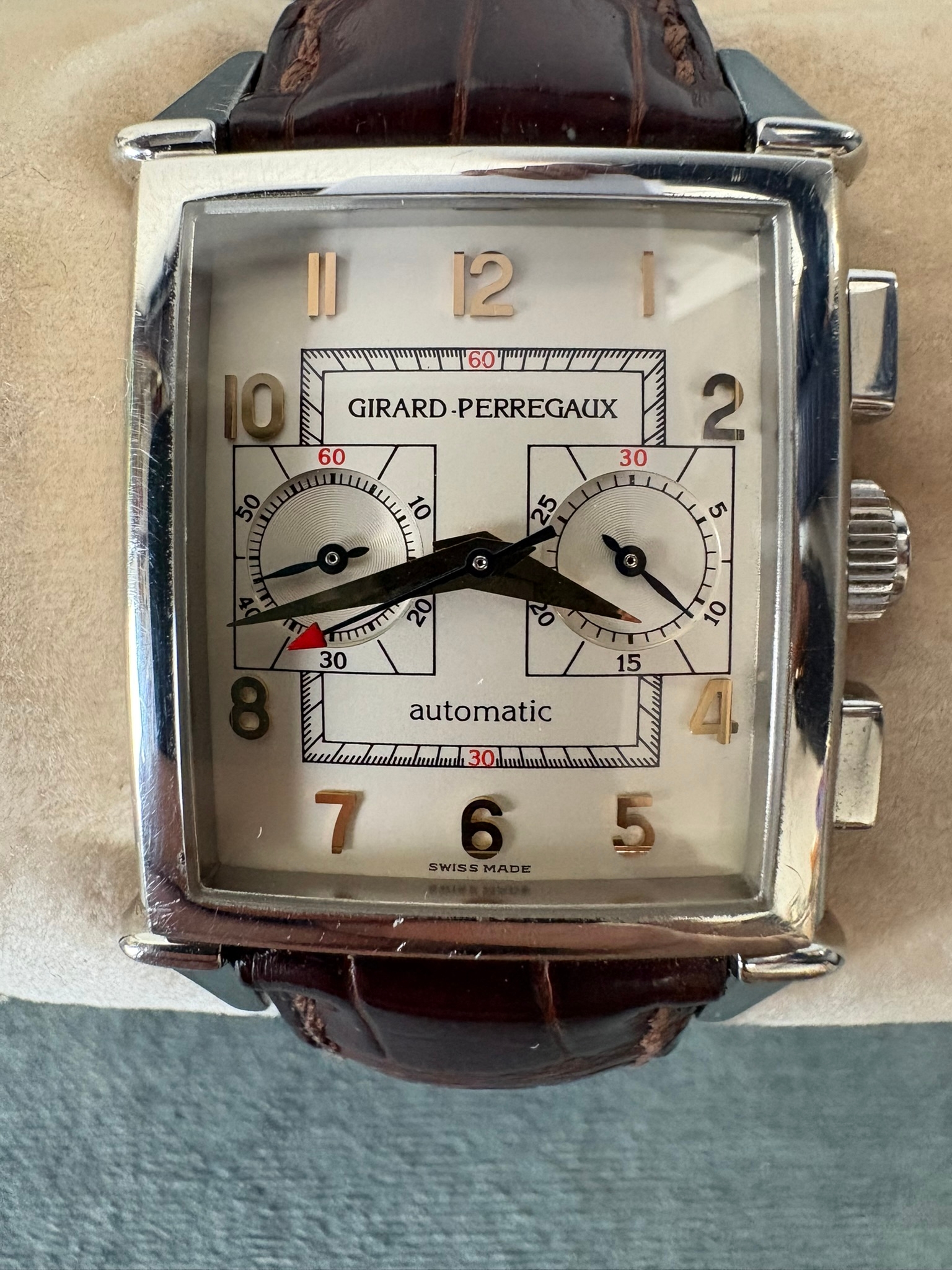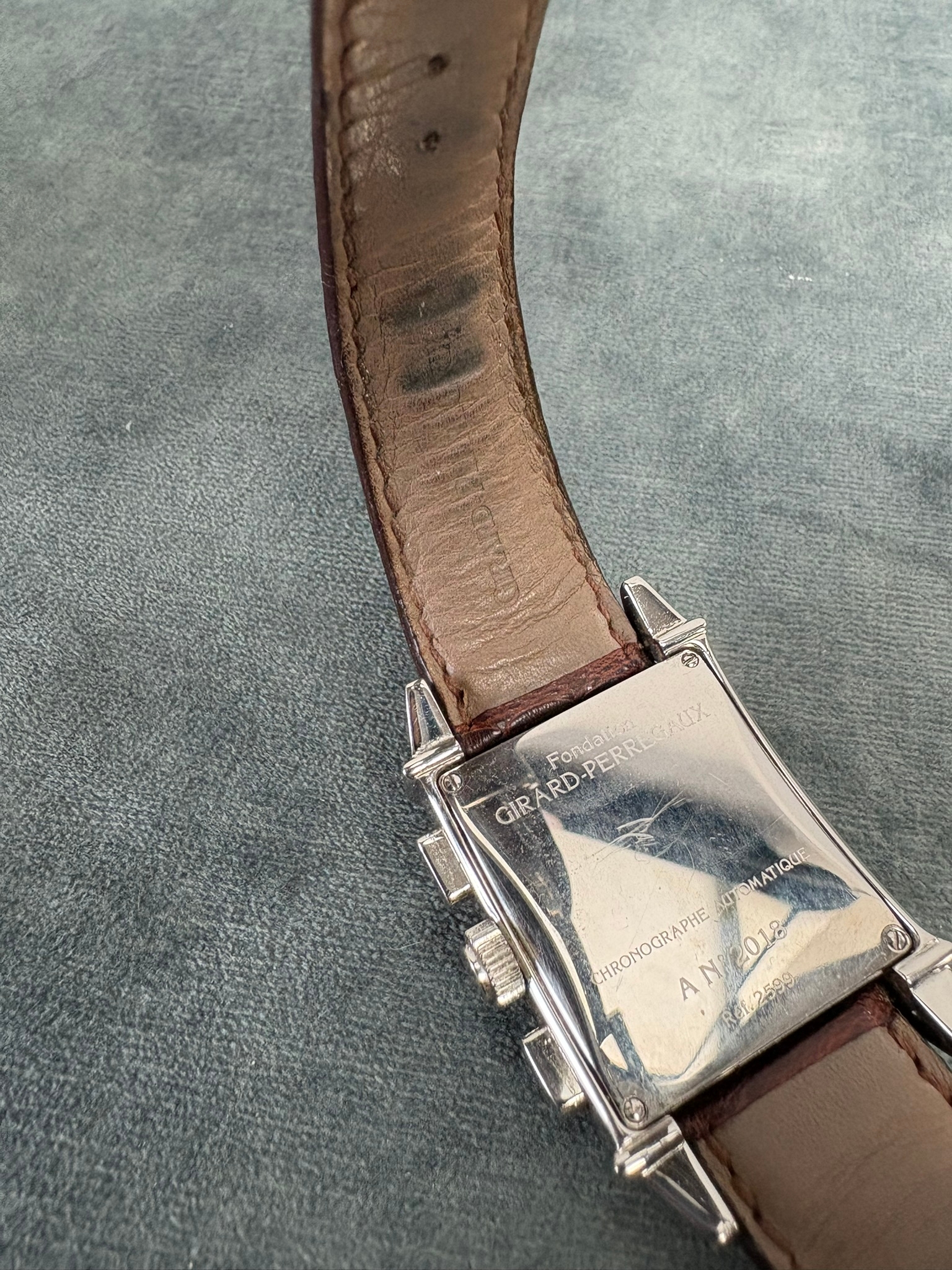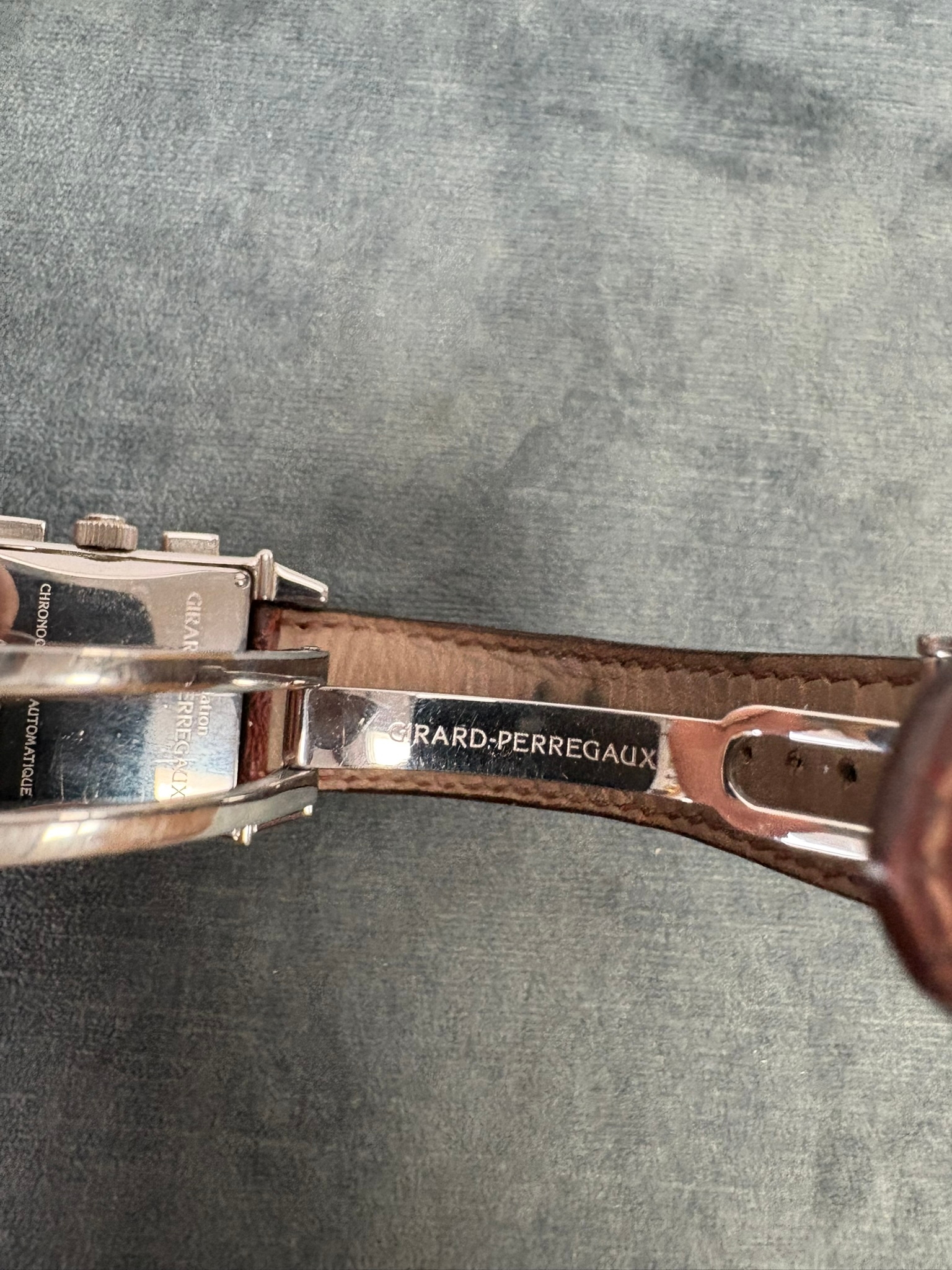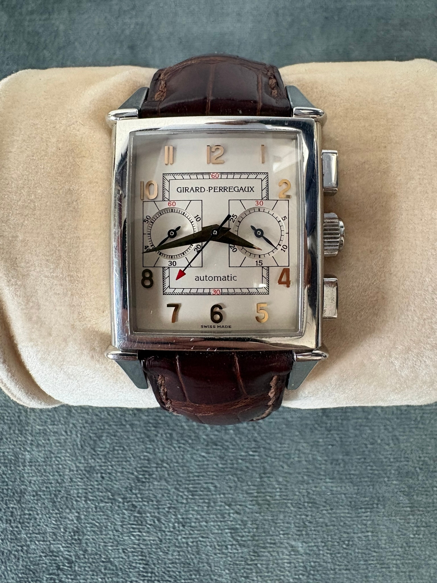 Girard-Perregaux automatic chronograph ref – 2599. With original leather strap and clasp. Also sold with original box which is perishing. Along with original purchase receipt.