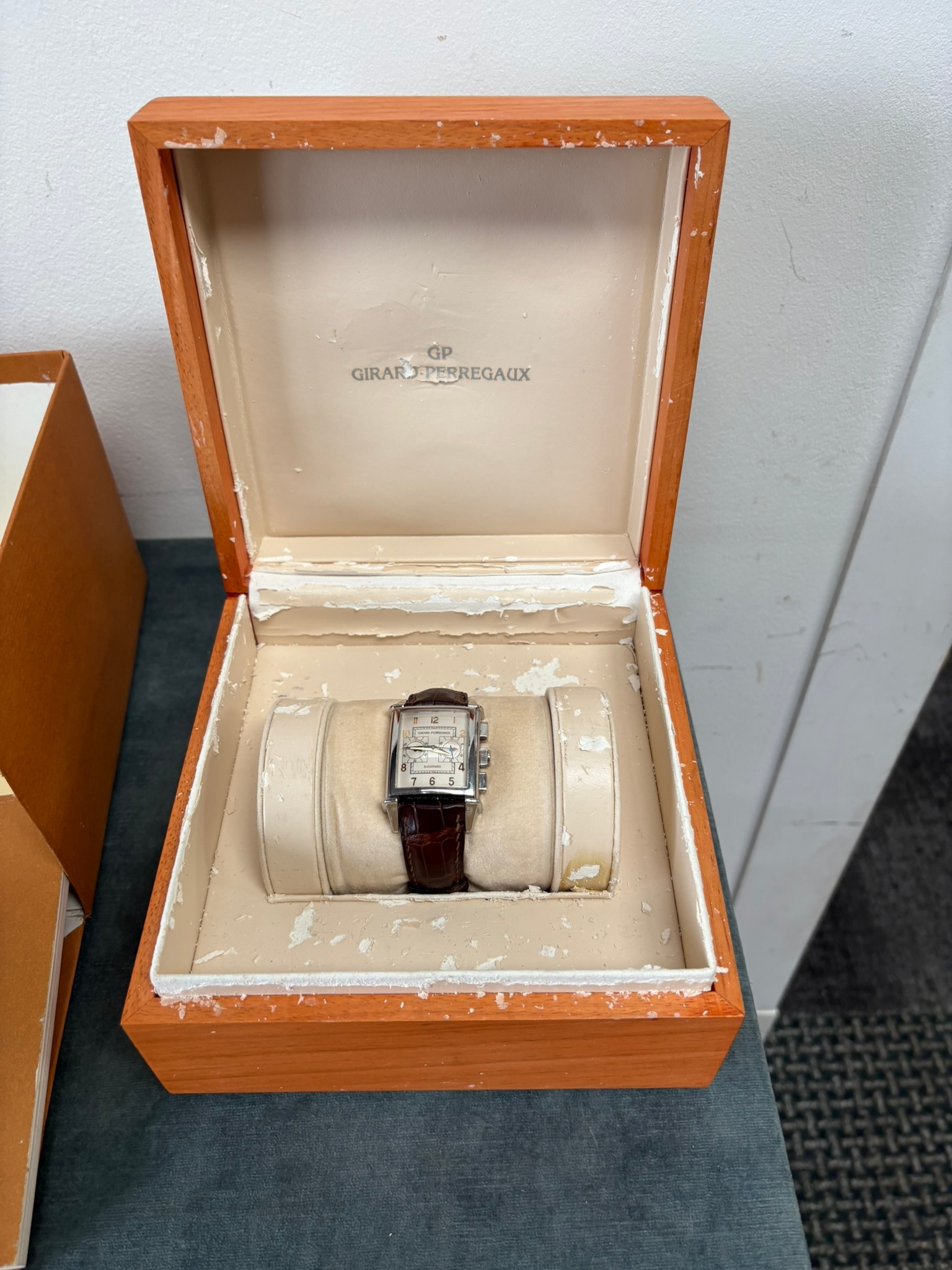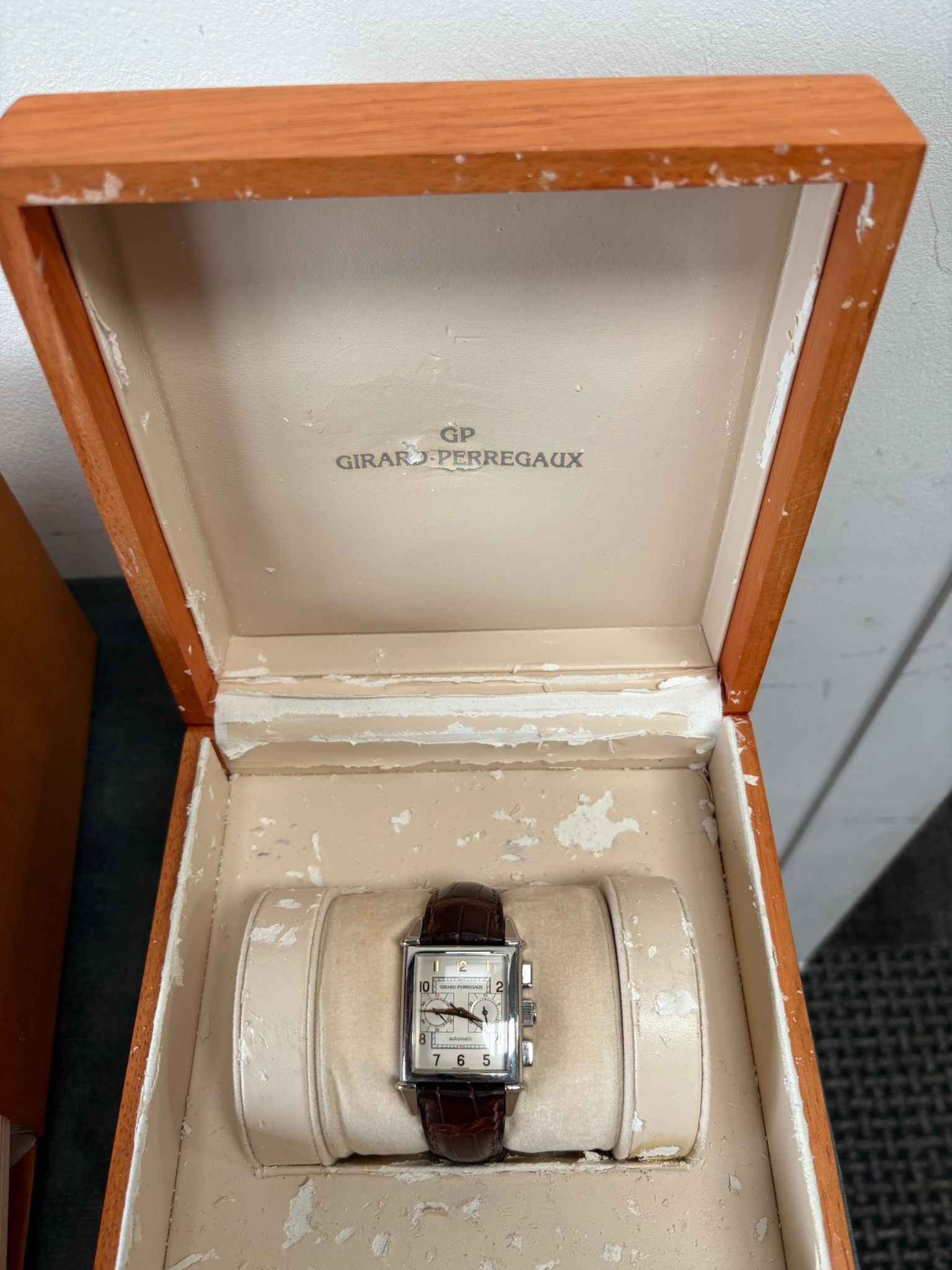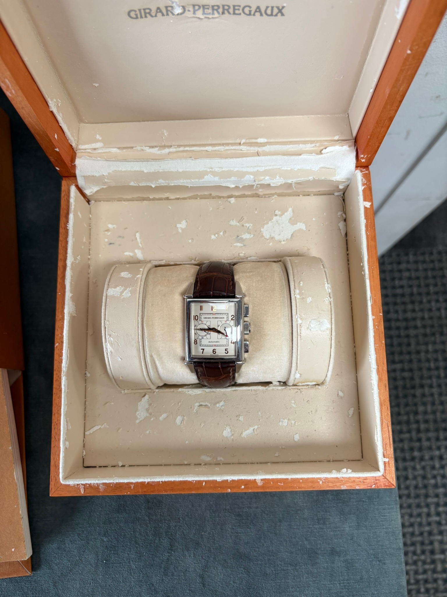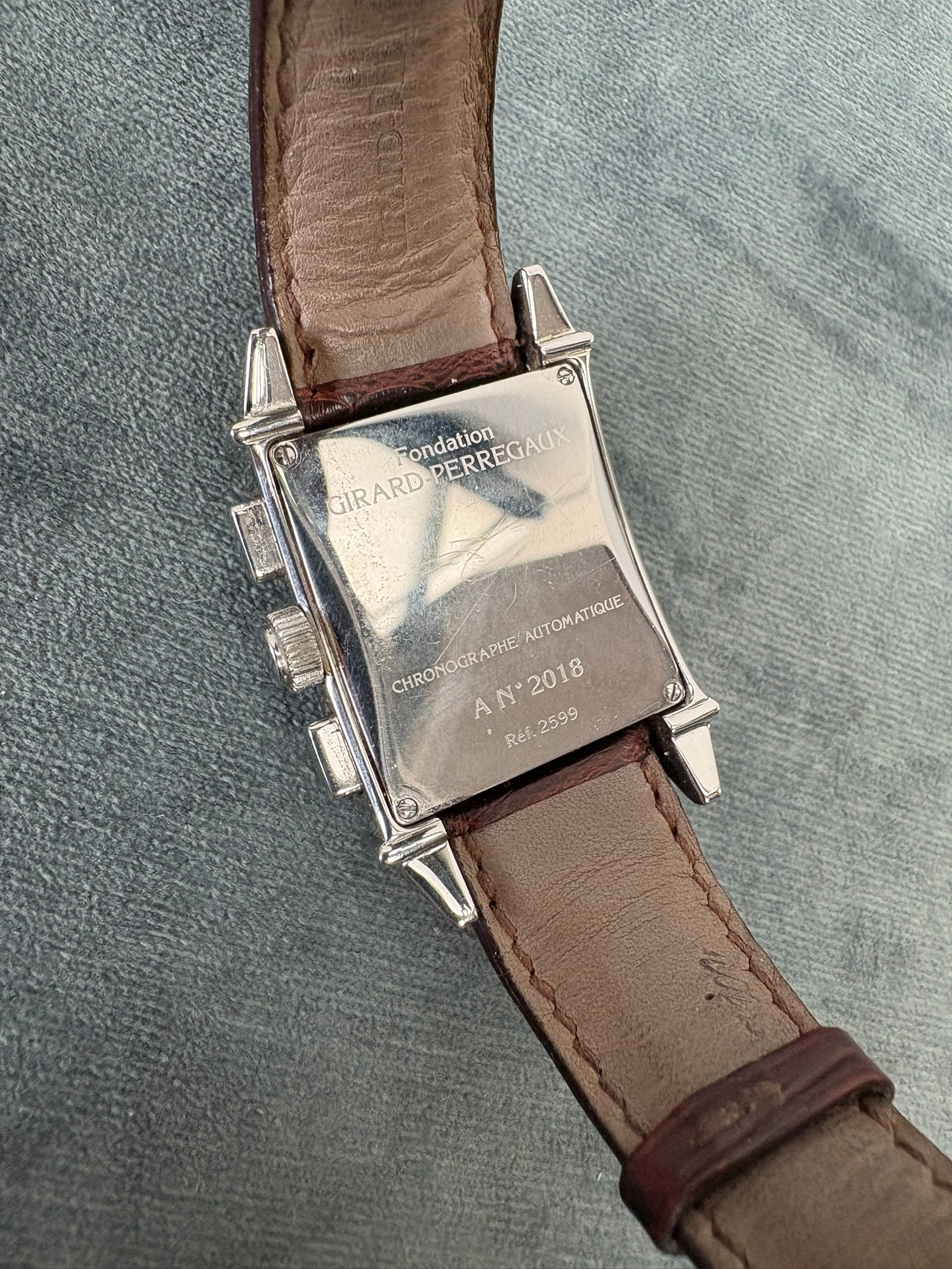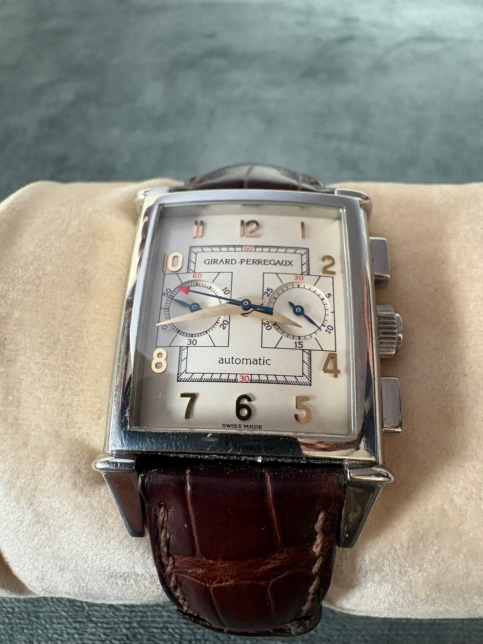 Girard-Perregaux automatic chronograph ref – 2599. With original leather strap and clasp. Also sold with original box which is perishing. Along with original purchase receipt.