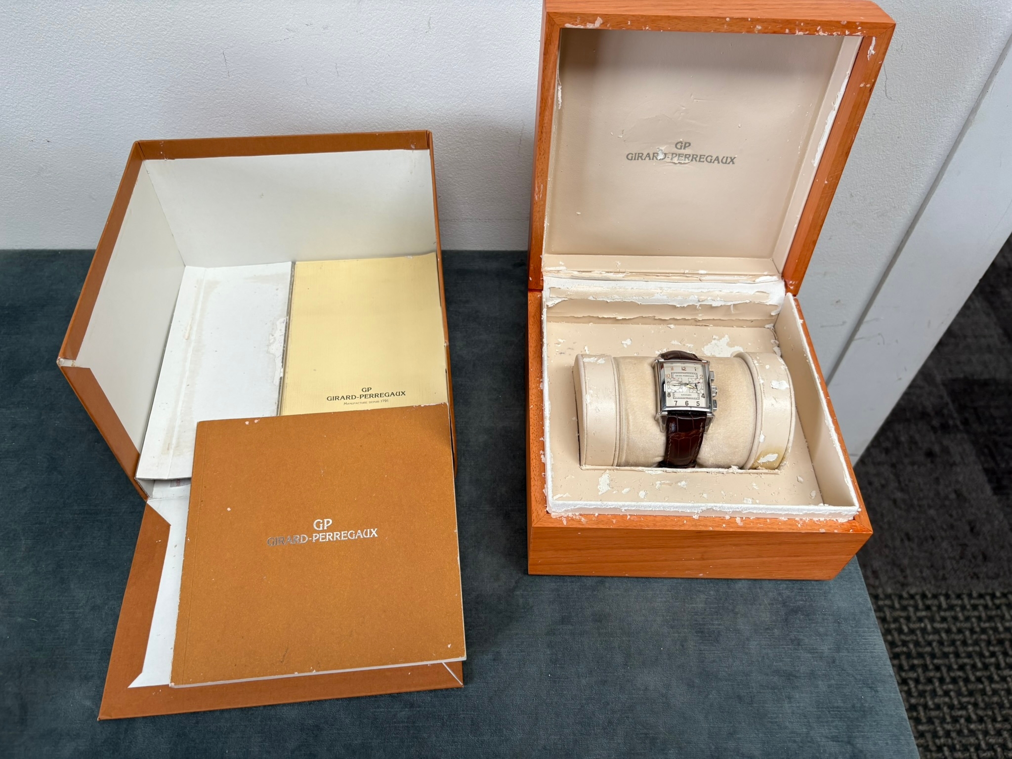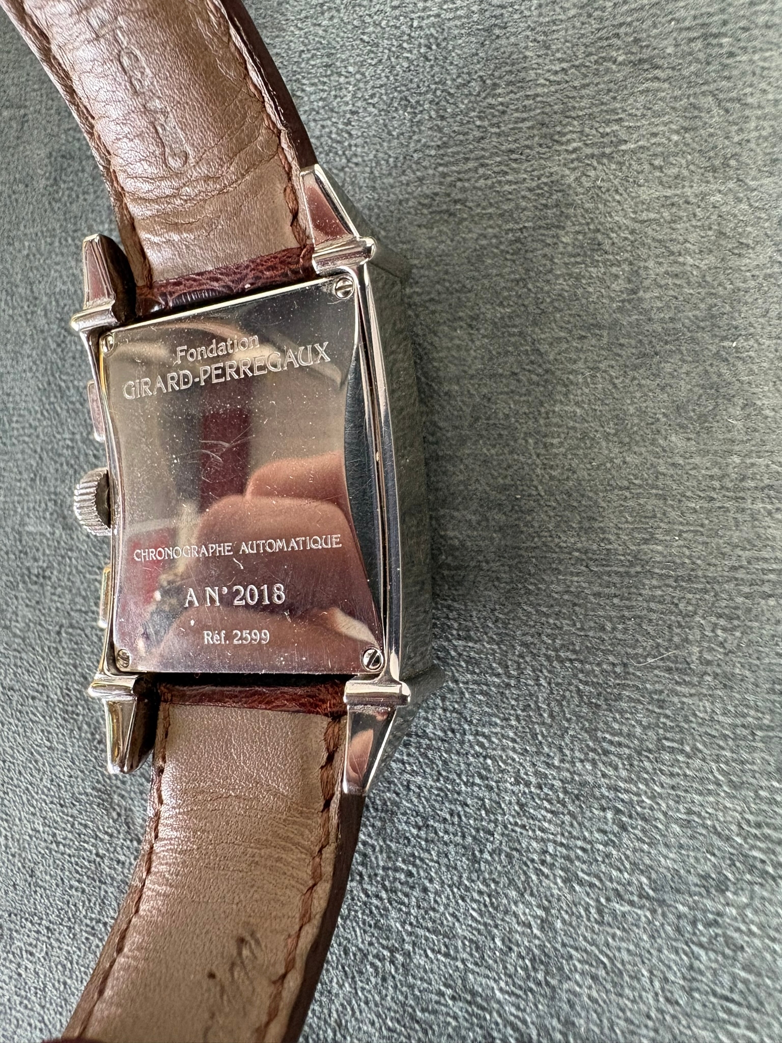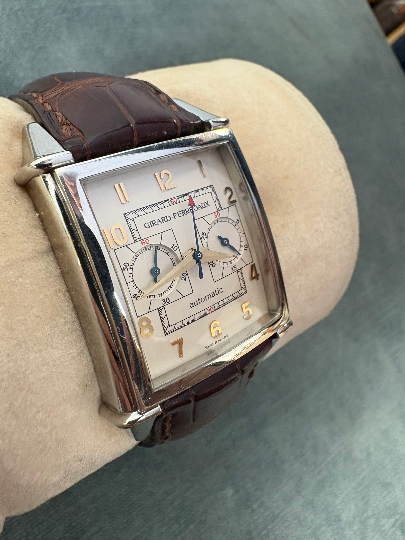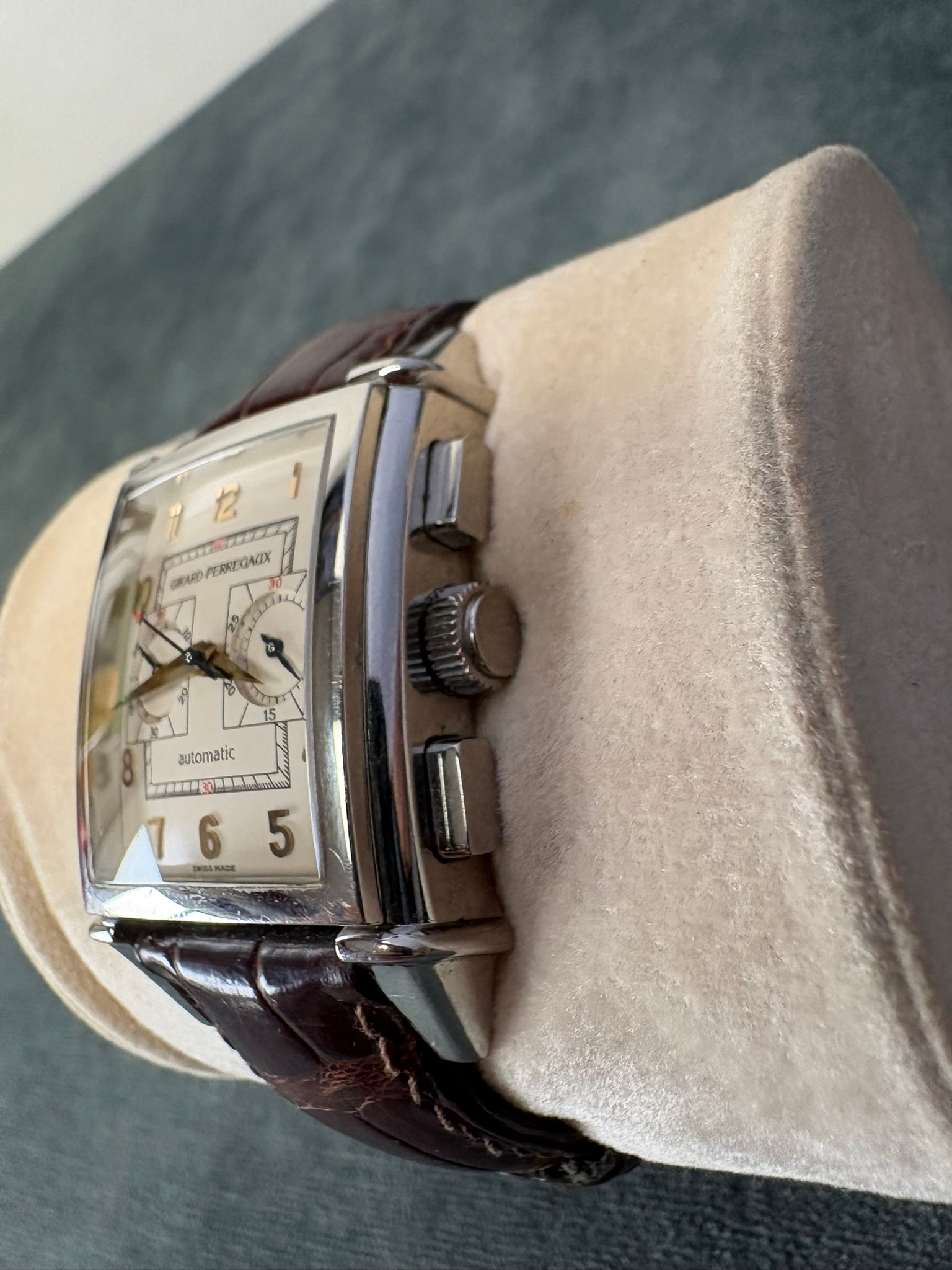 Girard-Perregaux automatic chronograph ref – 2599. With original leather strap and clasp. Also sold with original box which is perishing. Along with original purchase receipt.