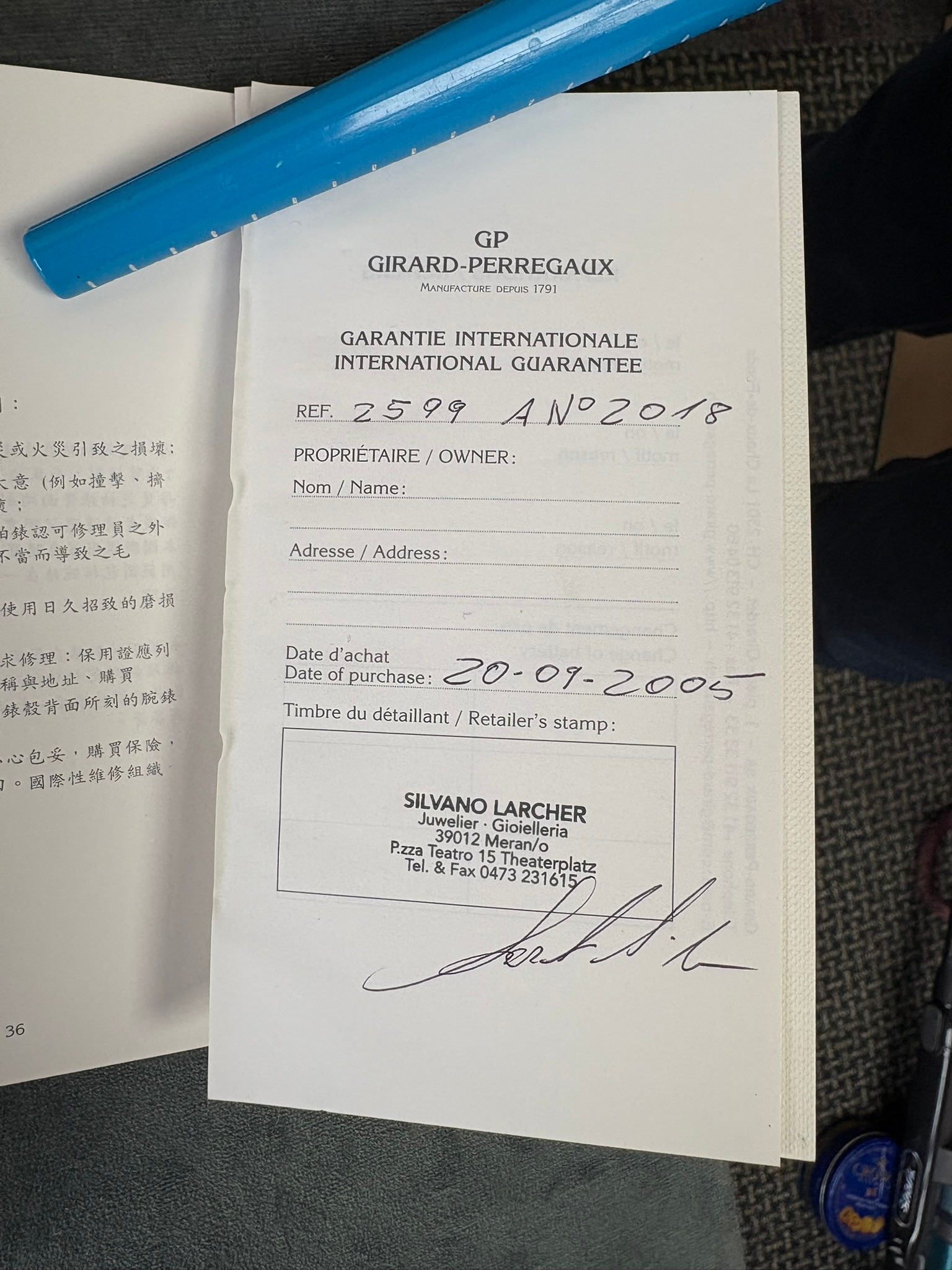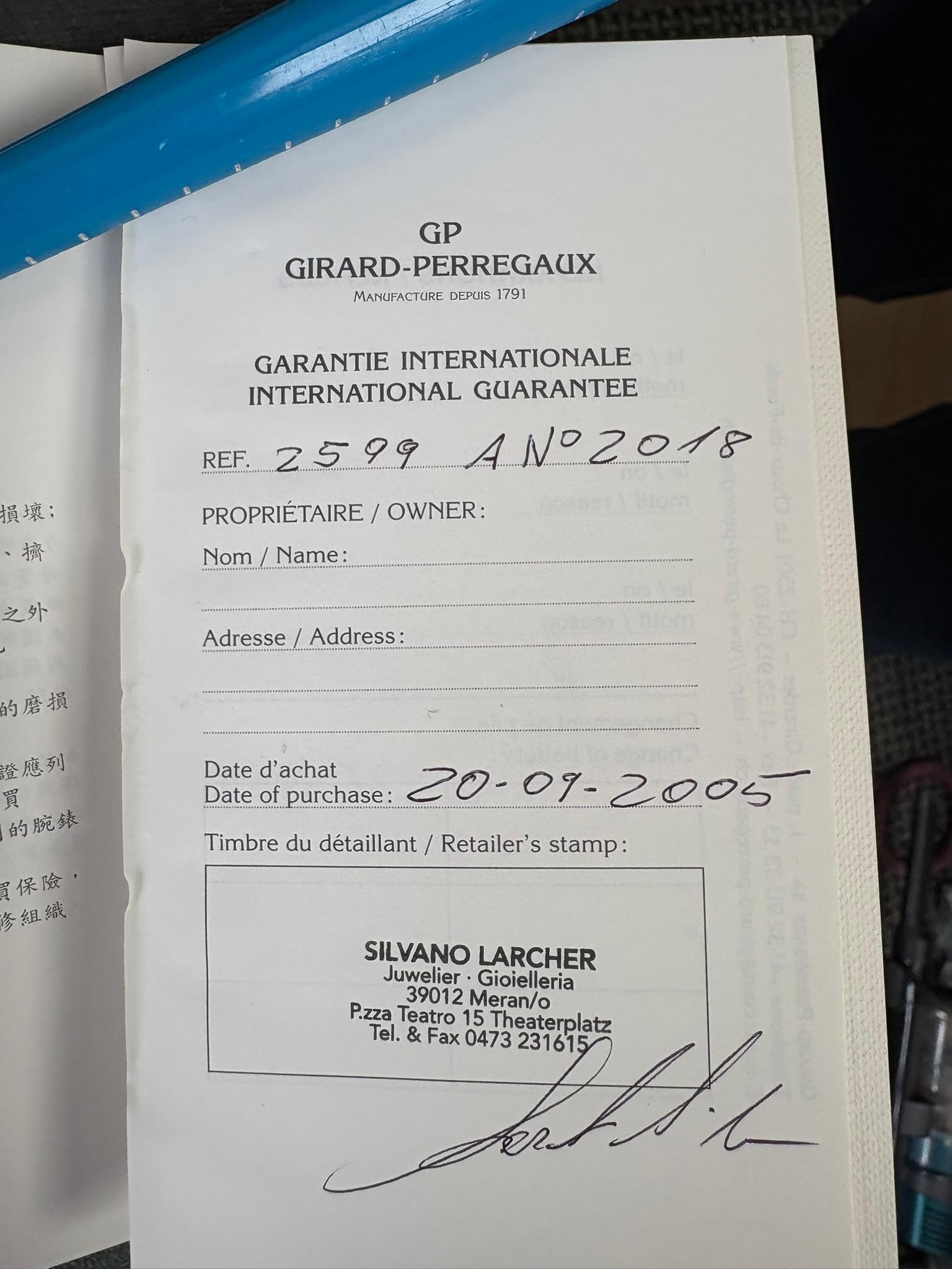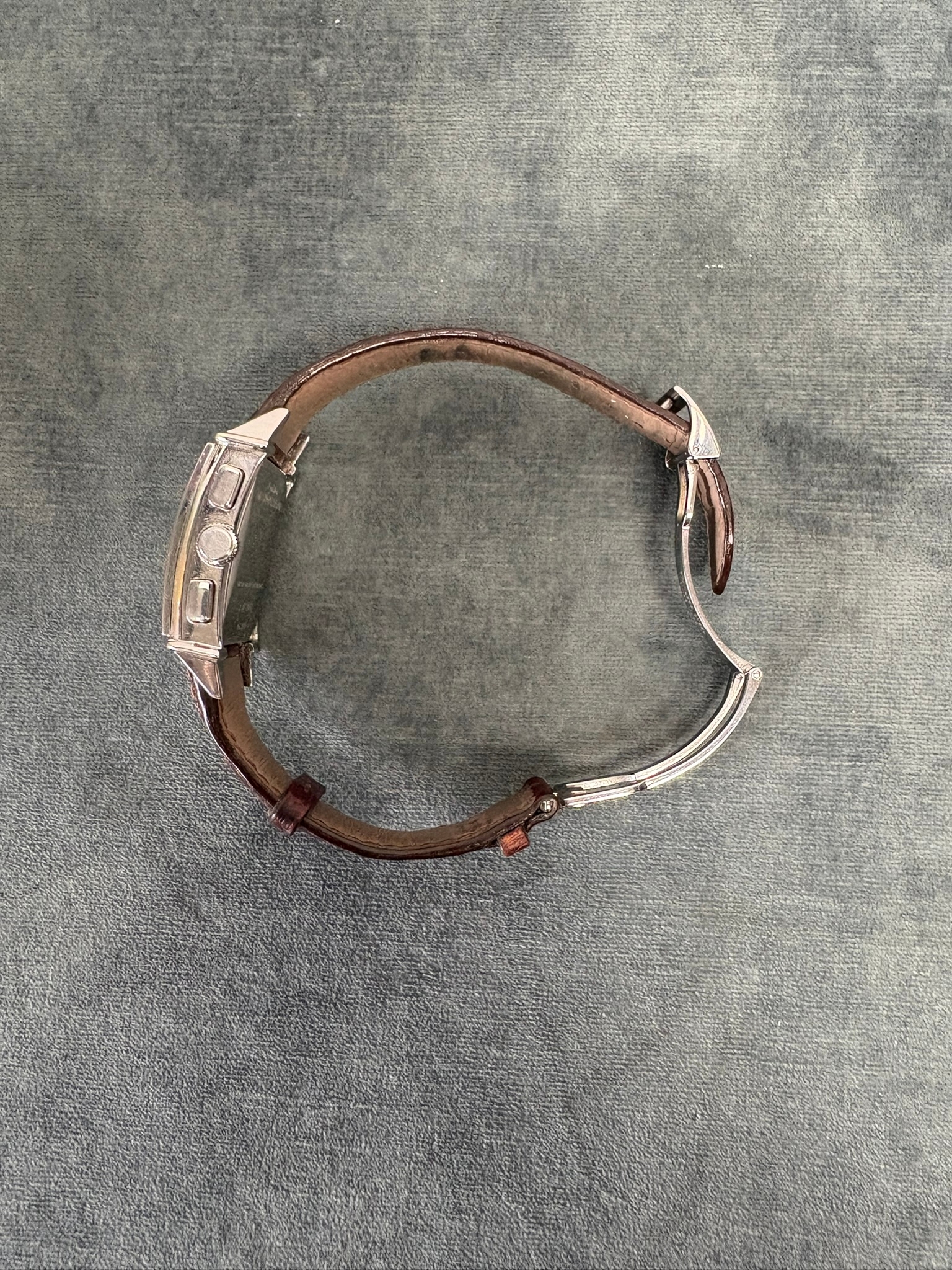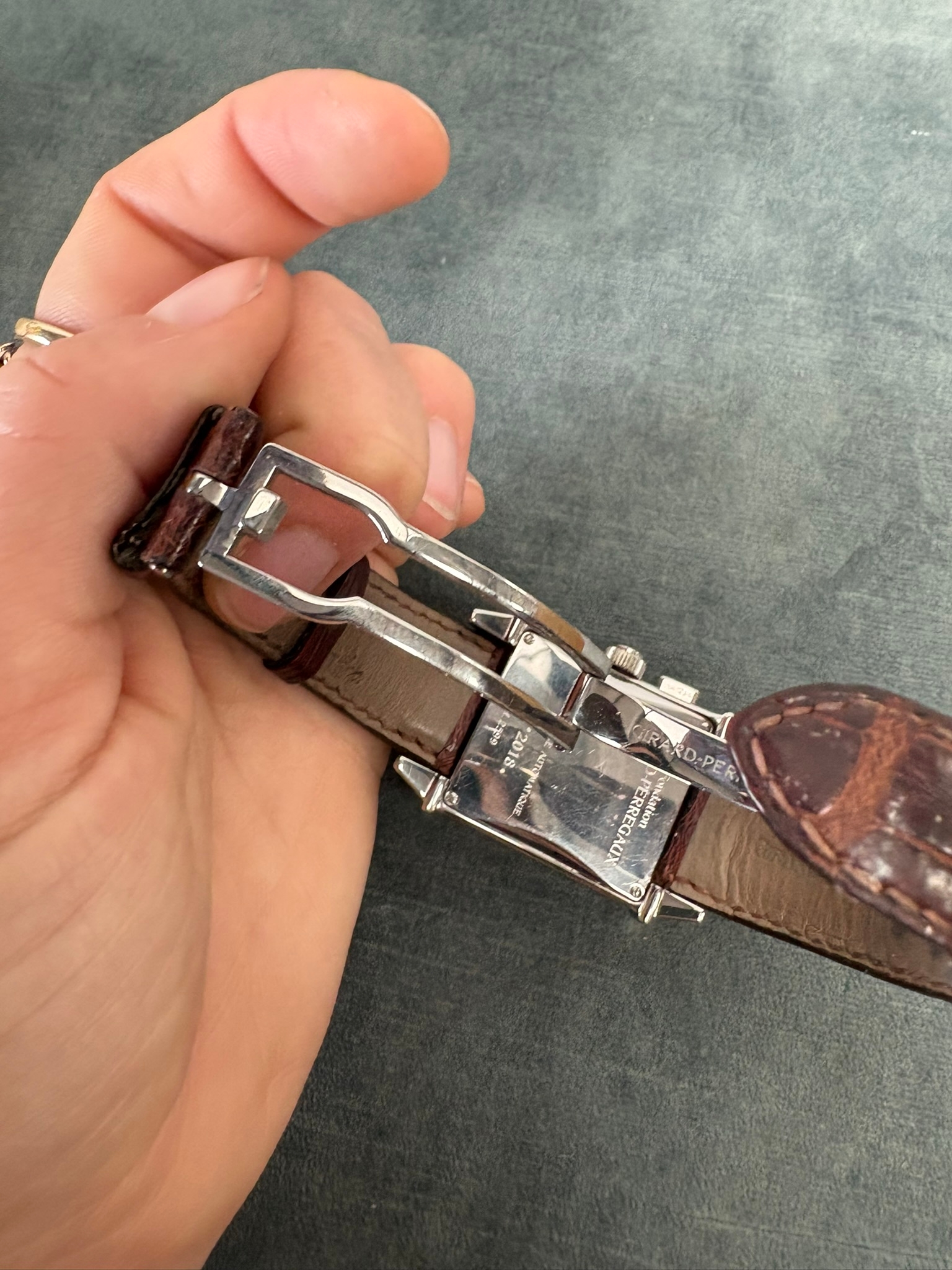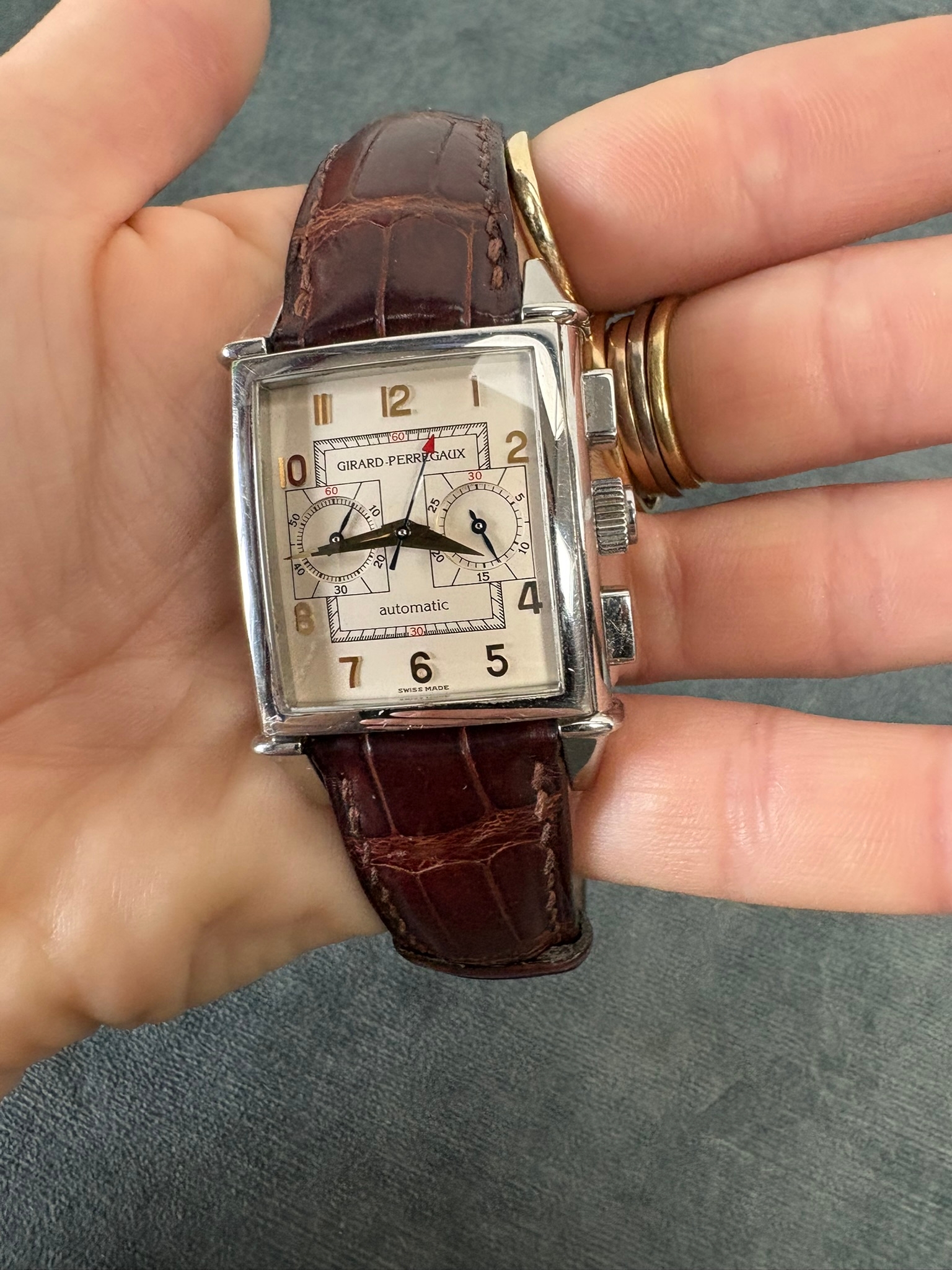 Girard-Perregaux automatic chronograph ref – 2599. With original leather strap and clasp. Also sold with original box which is perishing. Along with original purchase receipt.
