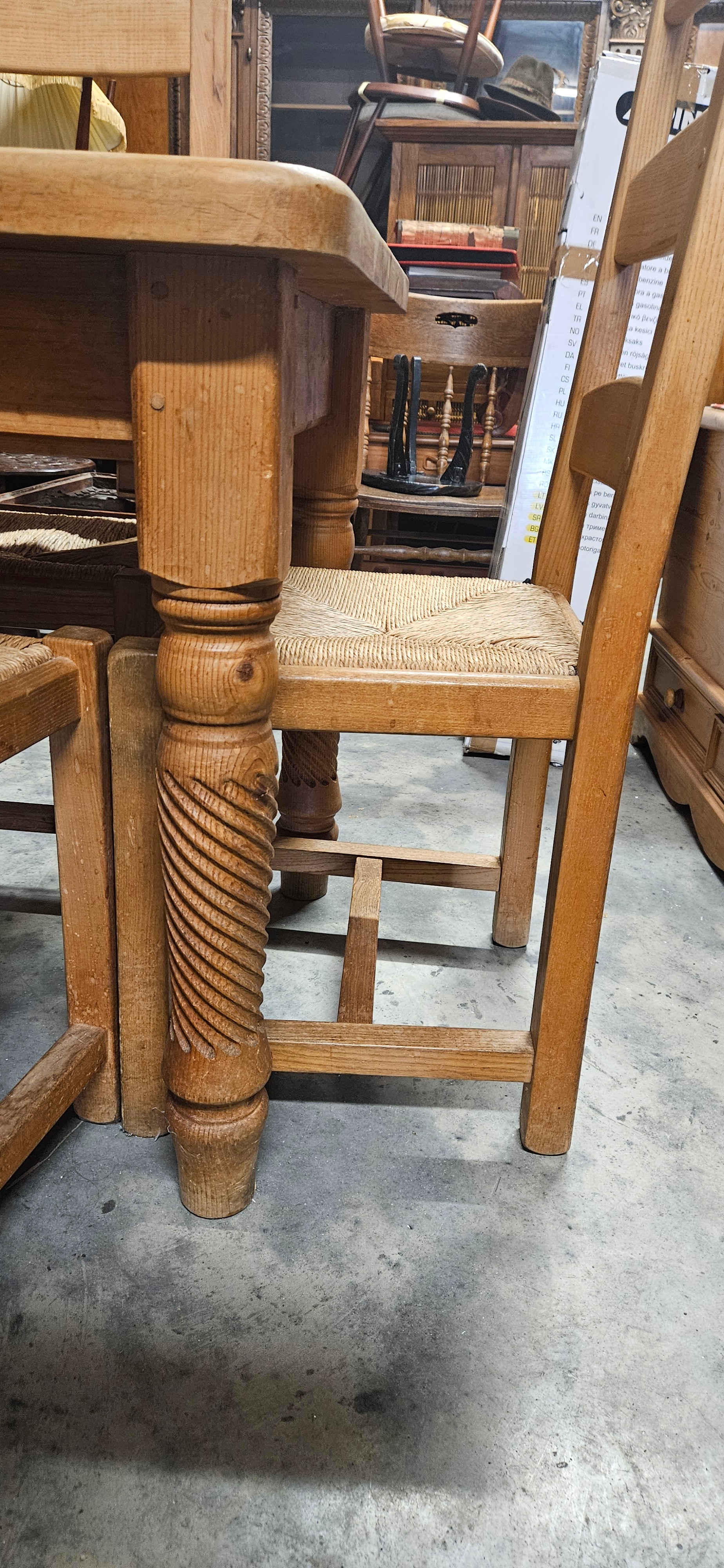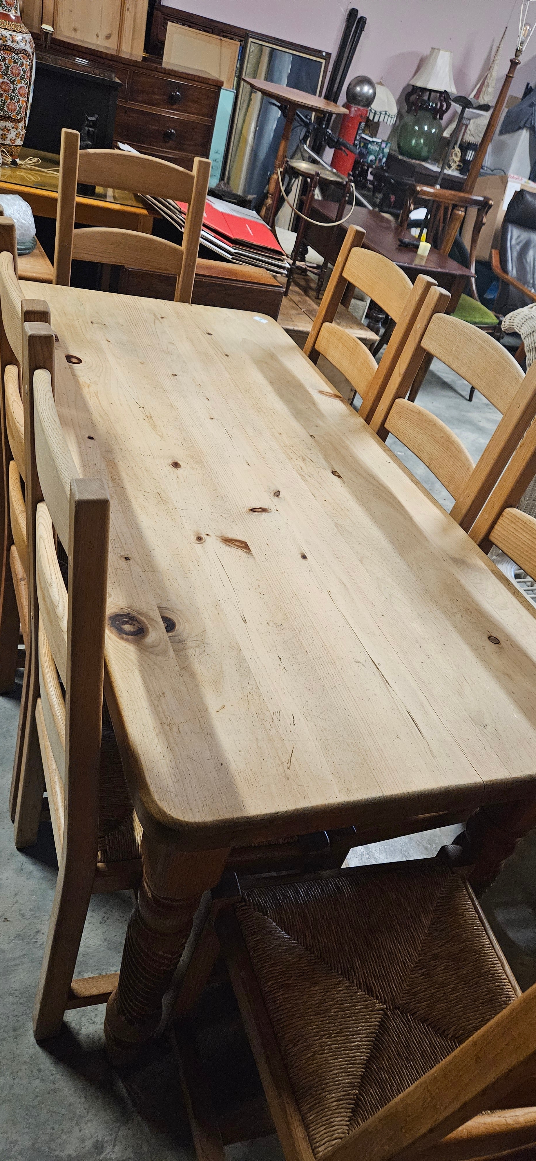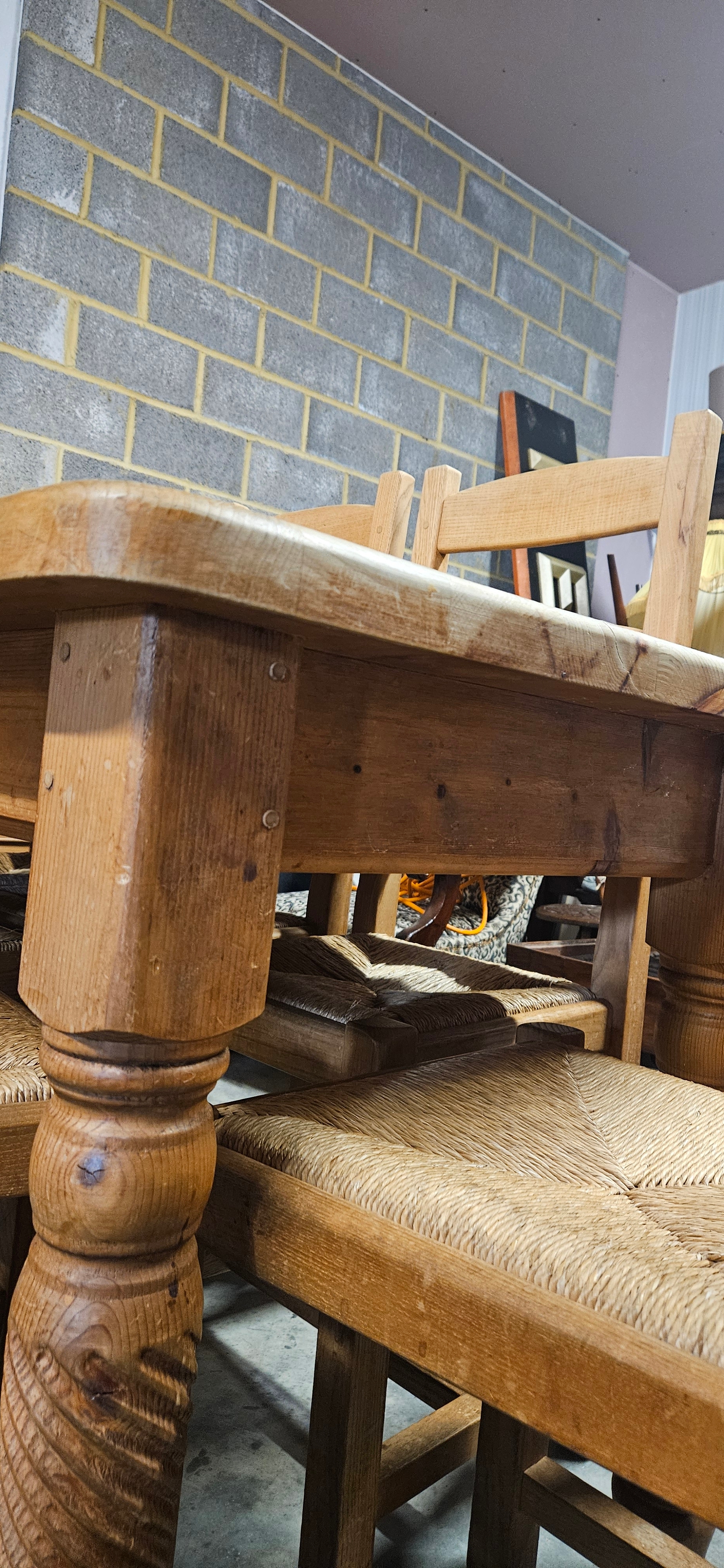 Good quality rustic farmhouse antique pine dining table and 8 dining chairs with rush bases. Very sturdy 166cm 75cm table top