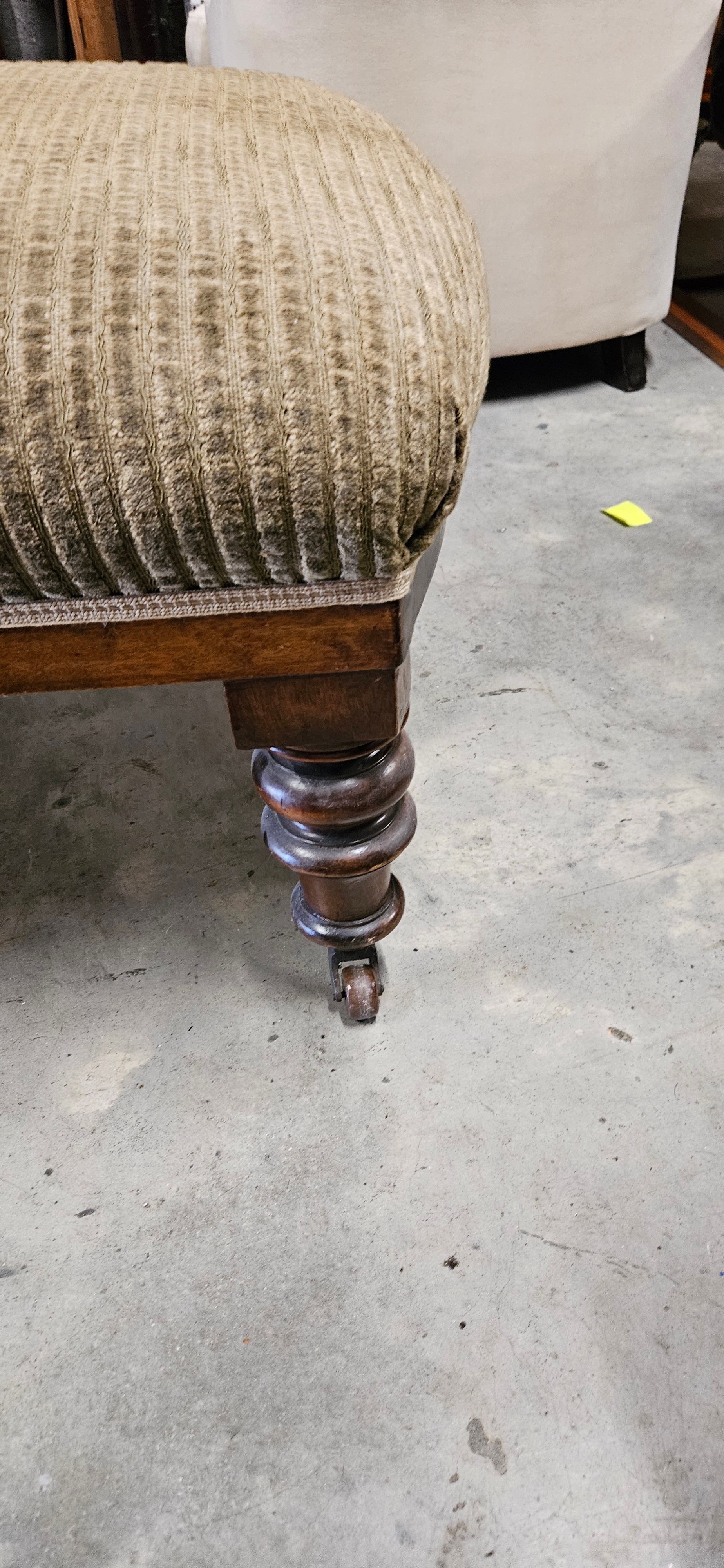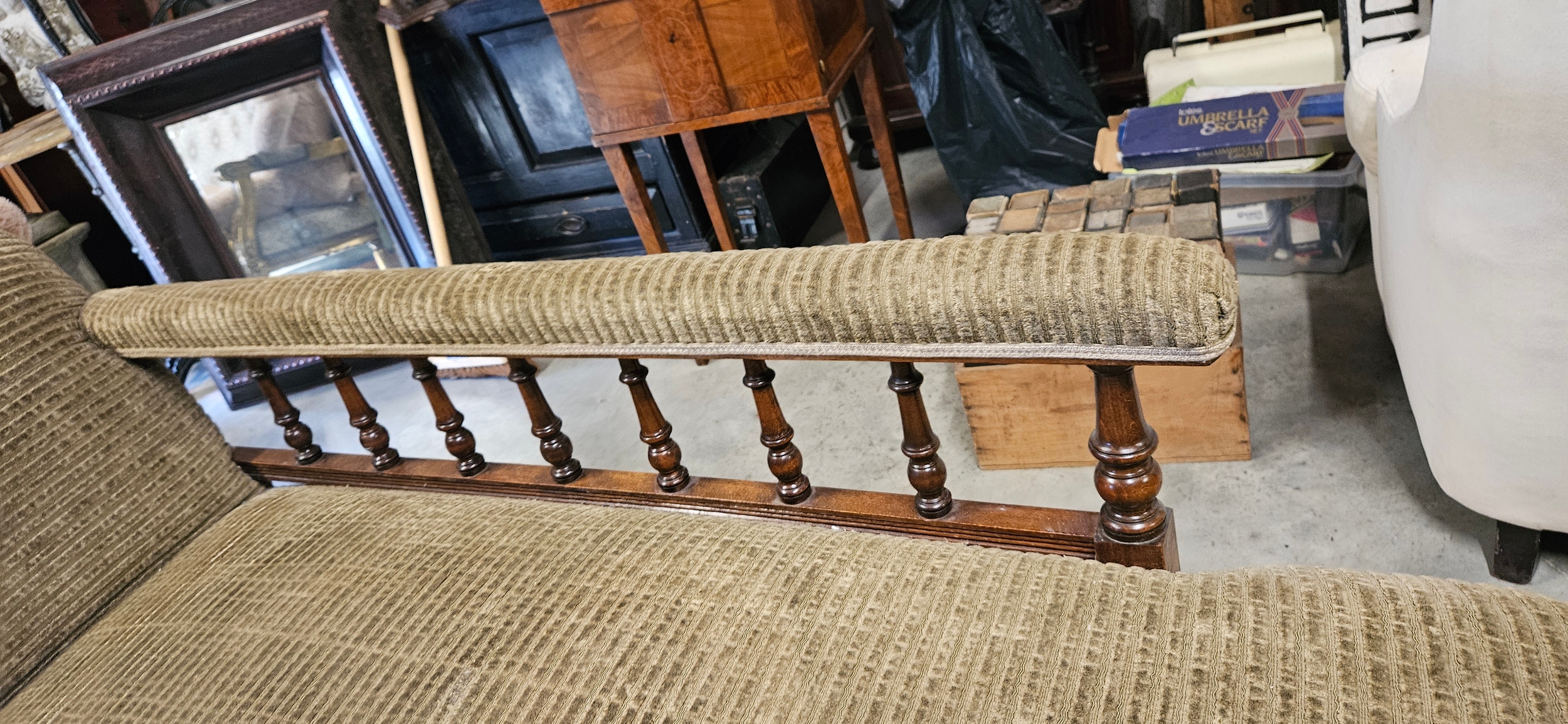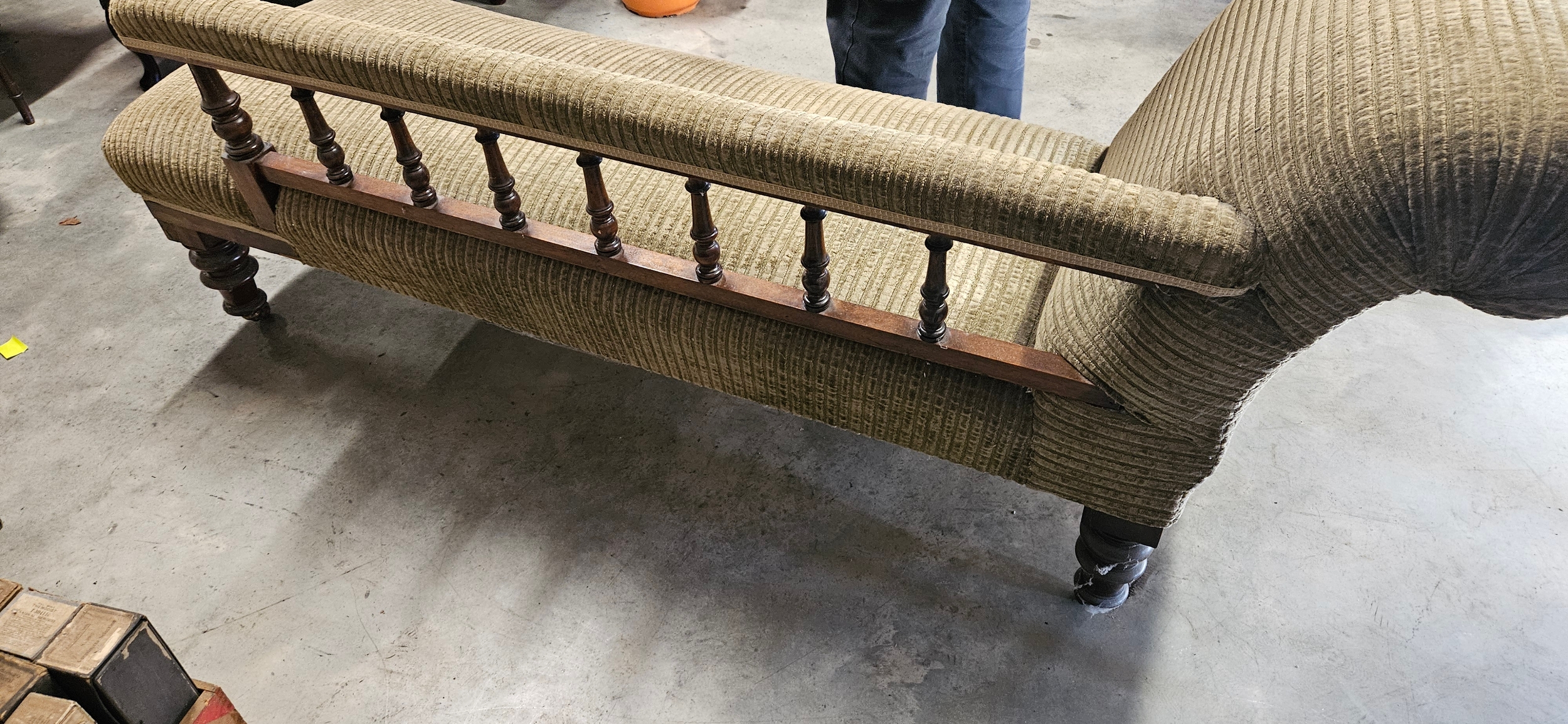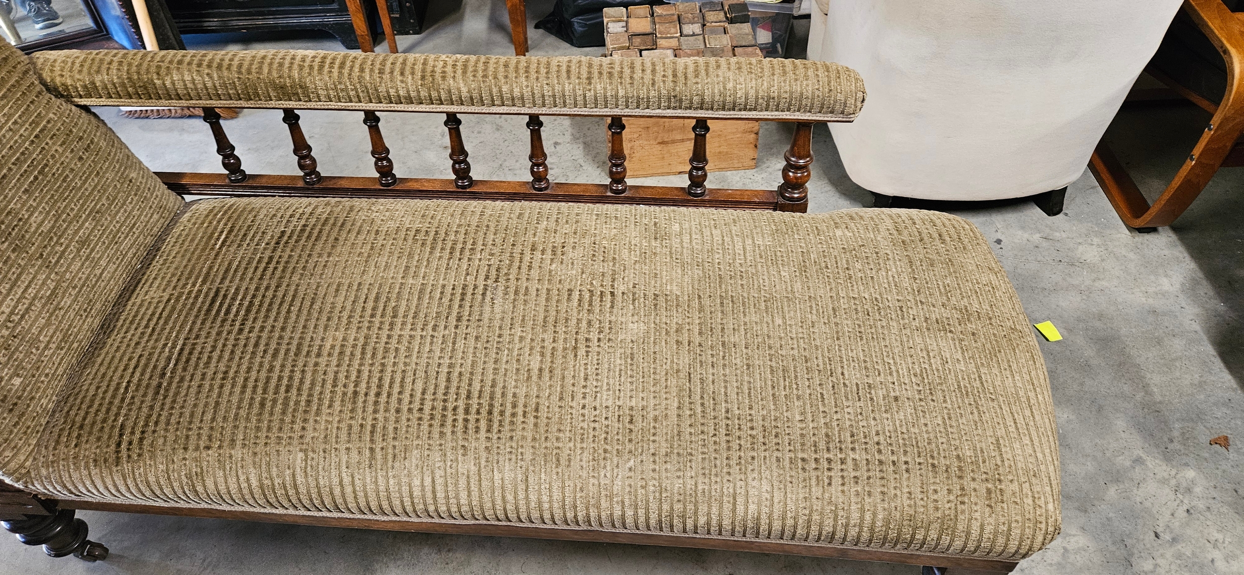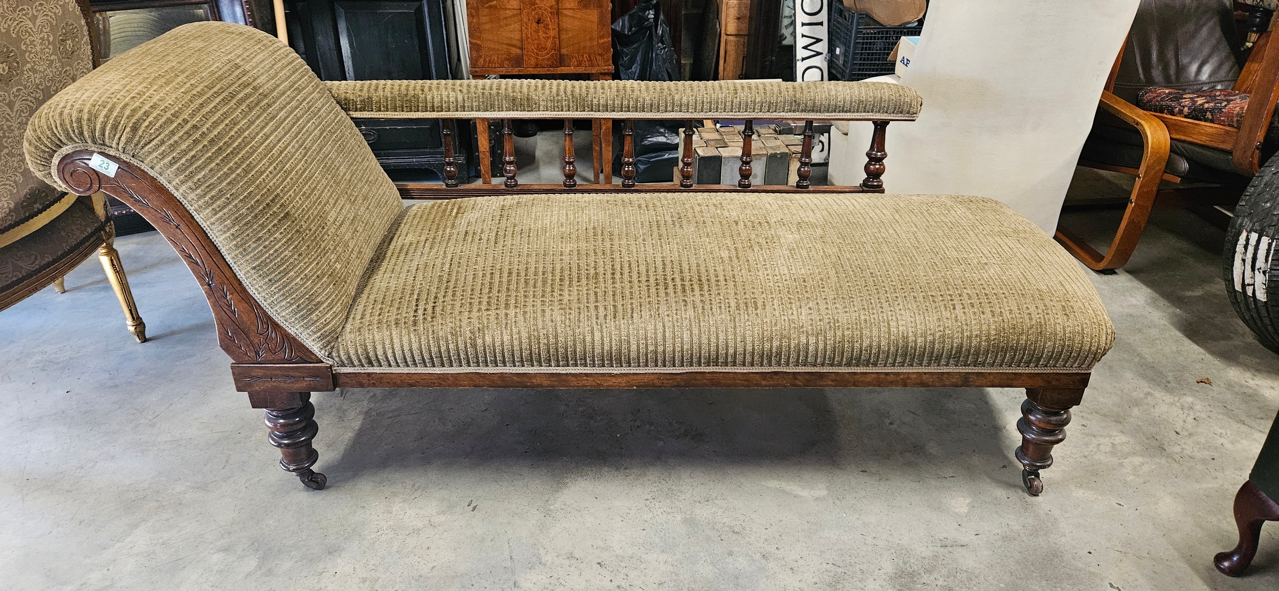 Antique Victorian mahogany chaise longue with a scrolled armrest, balustraded rail-back, and turned legs on castors.