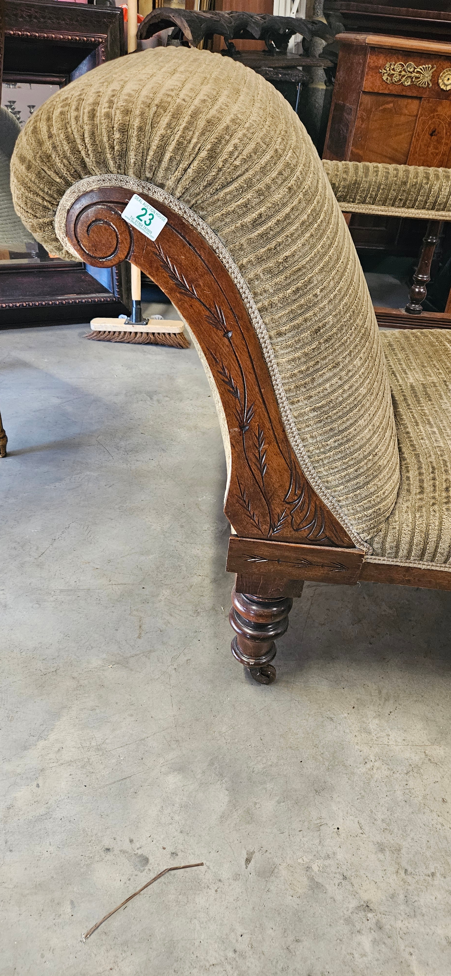 Antique Victorian mahogany chaise longue with a scrolled...