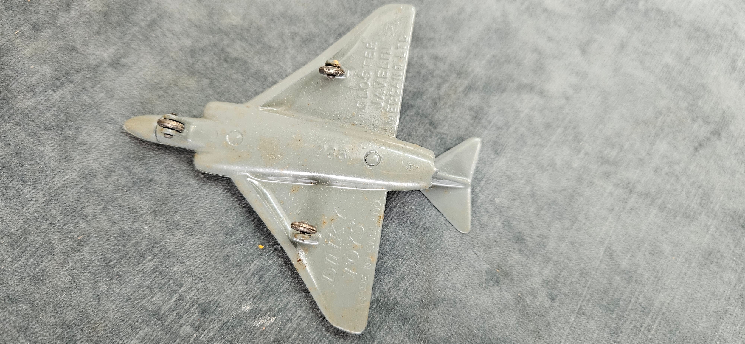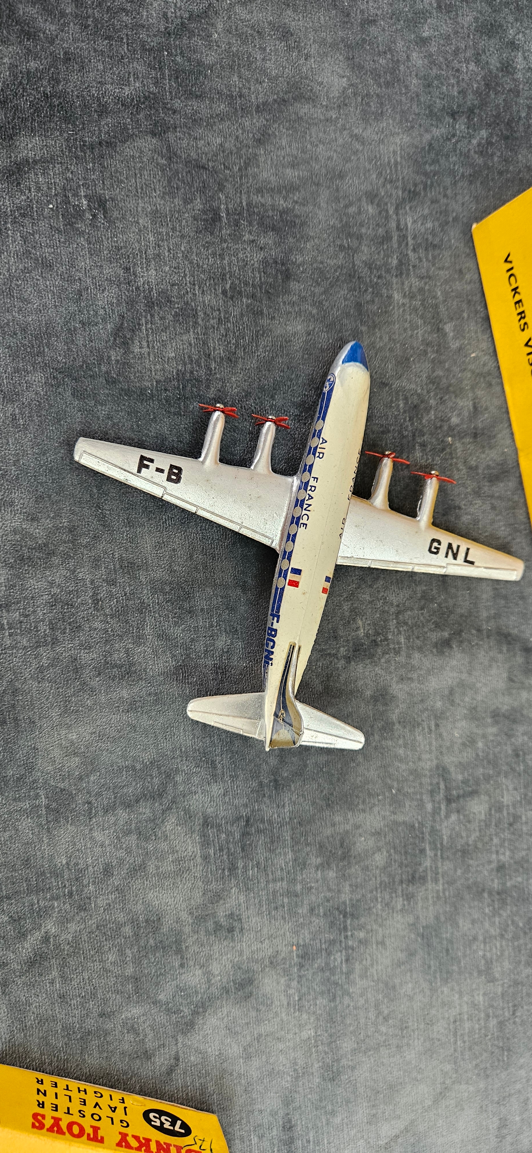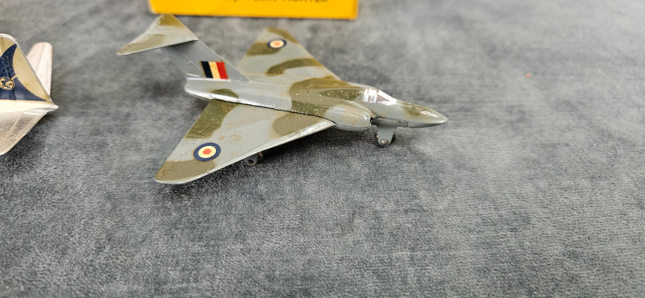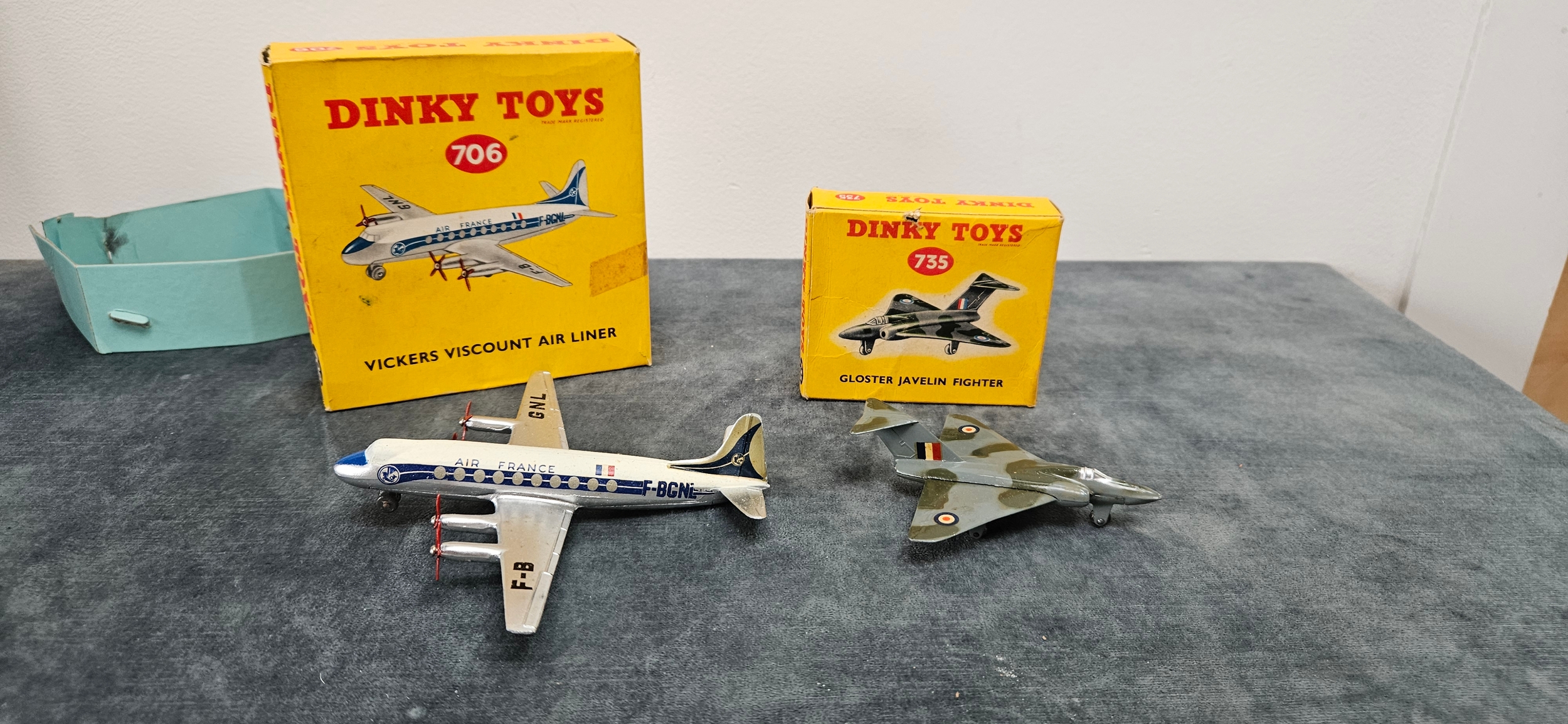 Dinky Toys 706 Vickers Viscount Air Liner in the "Air France" livery and Dinky Toys 735 Gloster Javelin Fighter in military camouflage.