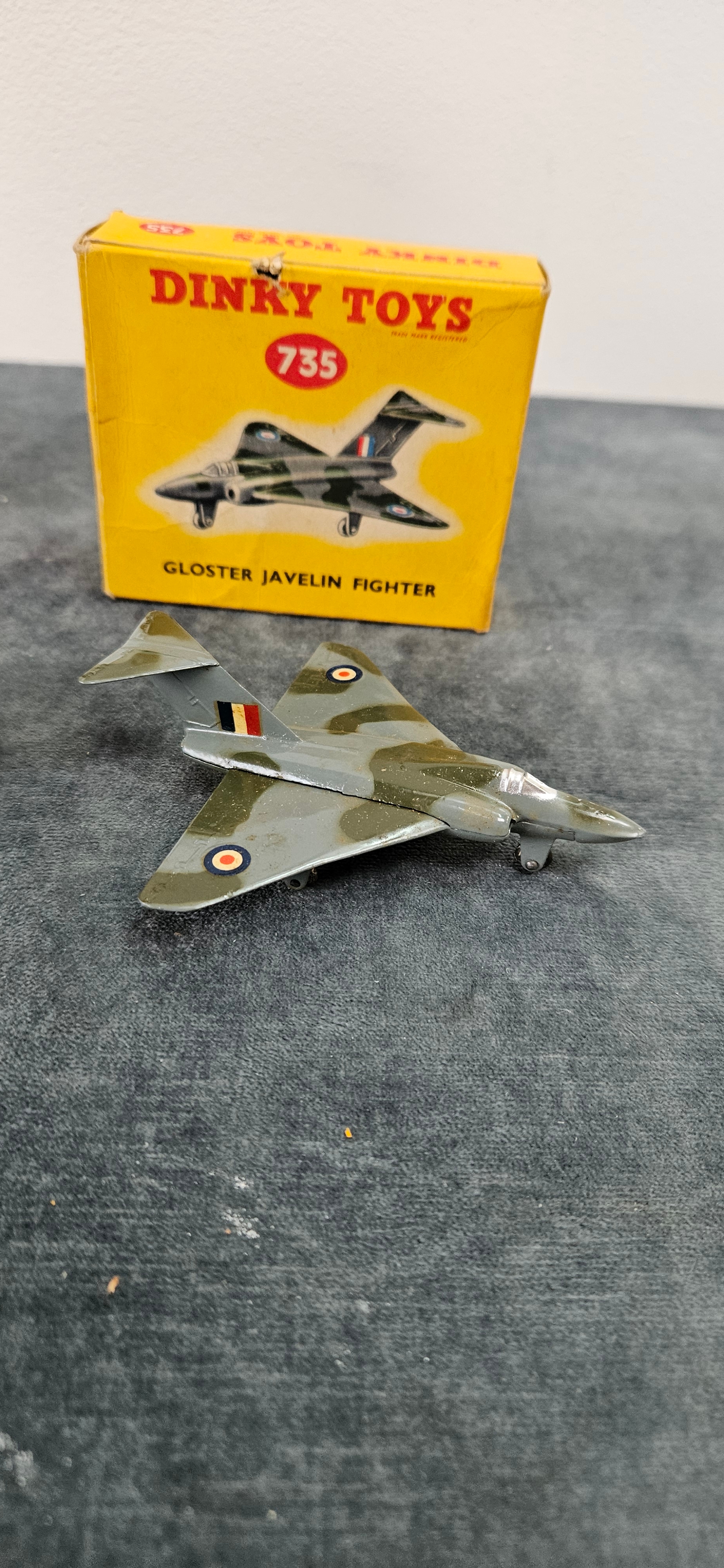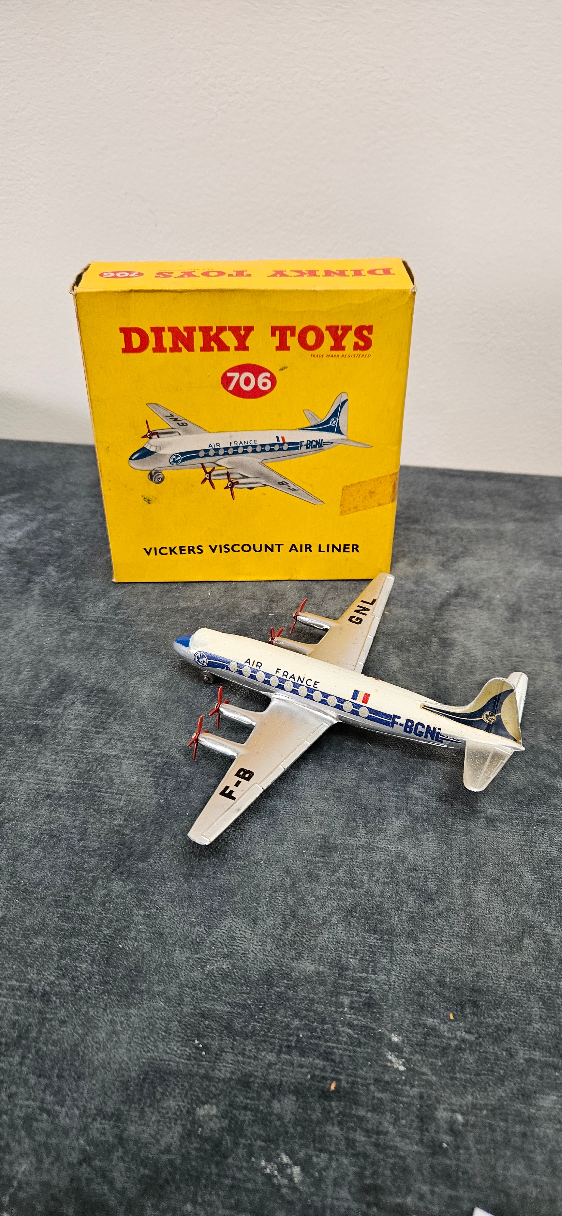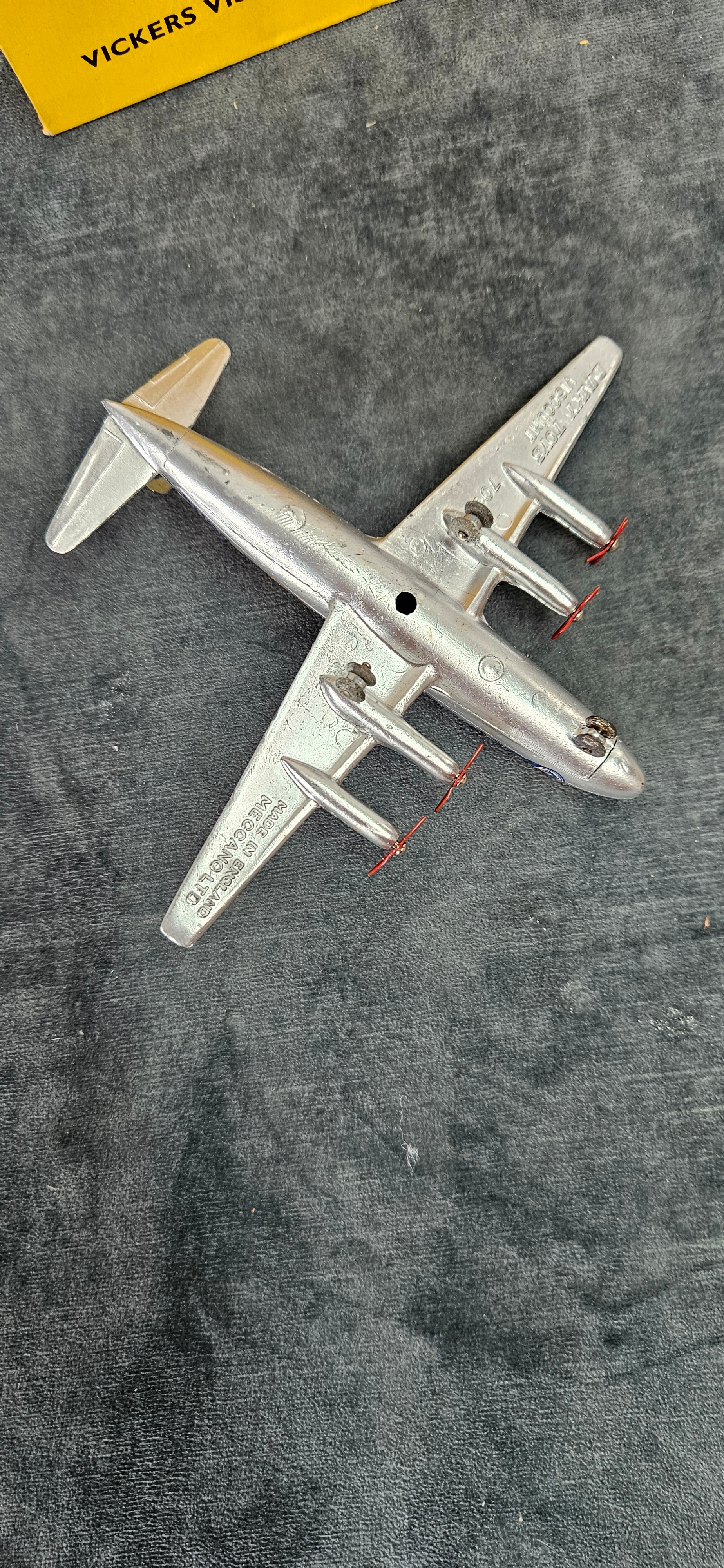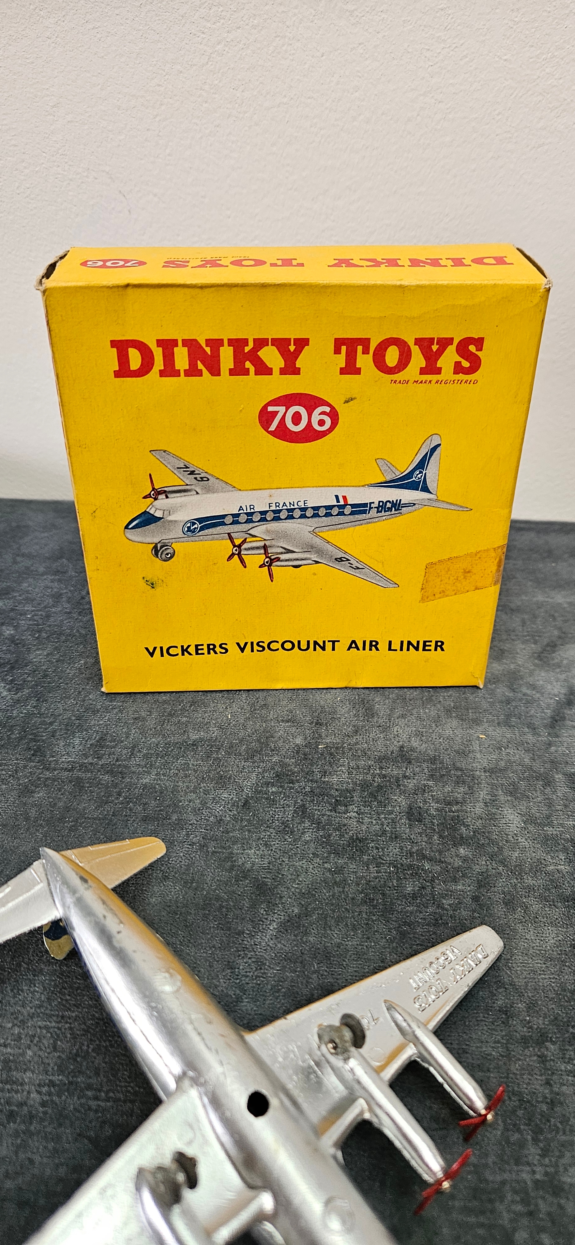 Dinky Toys 706 Vickers Viscount Air Liner in the "Air France" livery and Dinky Toys 735 Gloster Javelin Fighter in military camouflage.