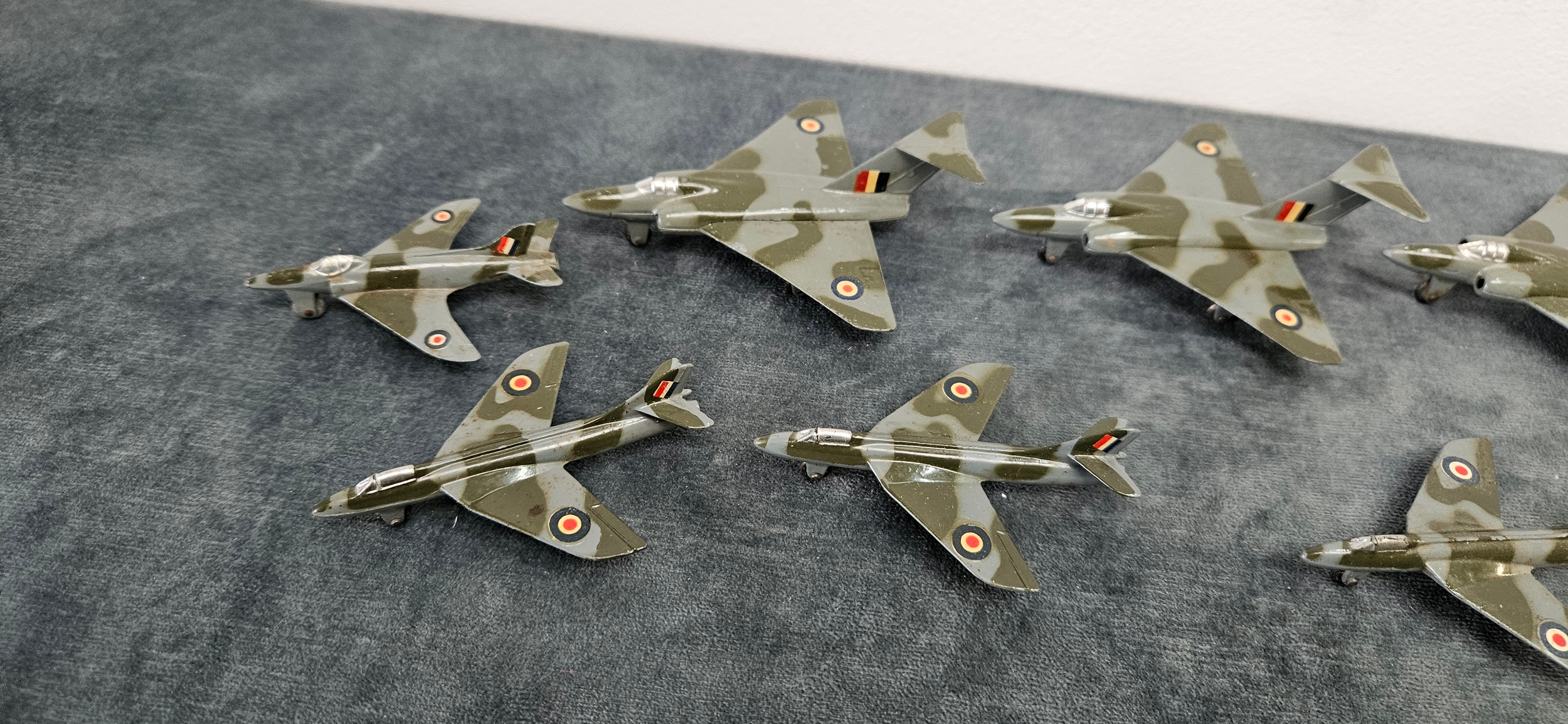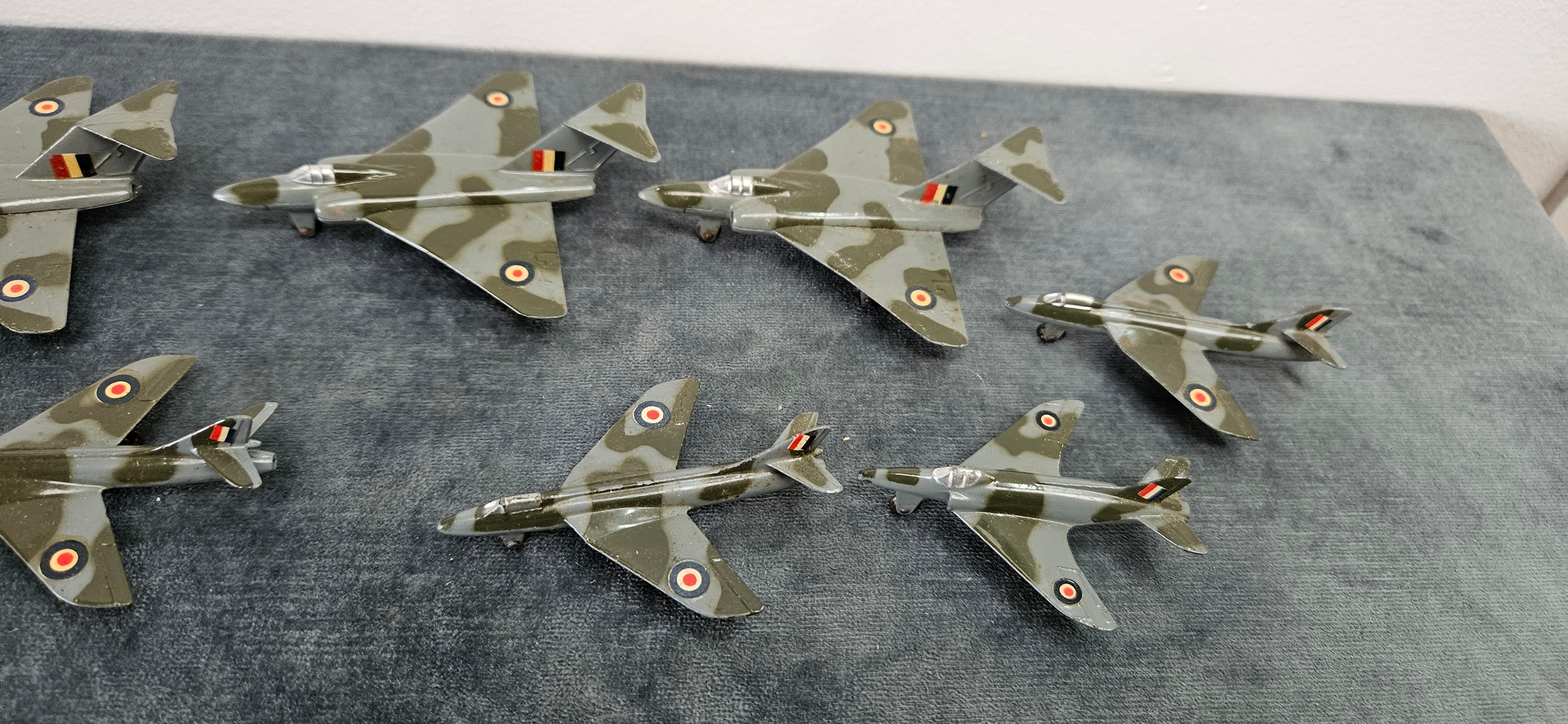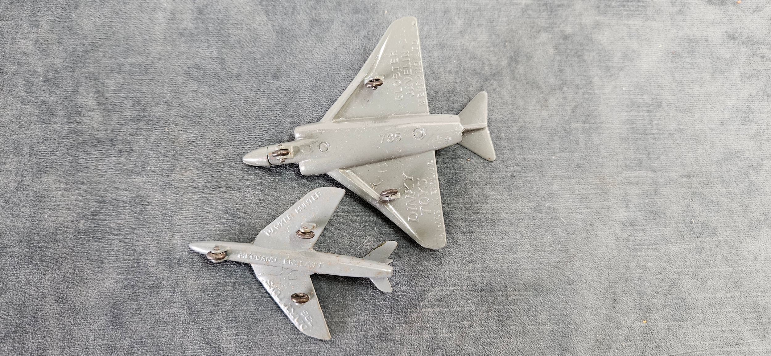 Dinky Toys die-cast model aircraft, specifically the 735 Gloster Javelin Fighter and the 736 Hawker Hunter Fighter, in camouflage grey and green with RAF markings.
