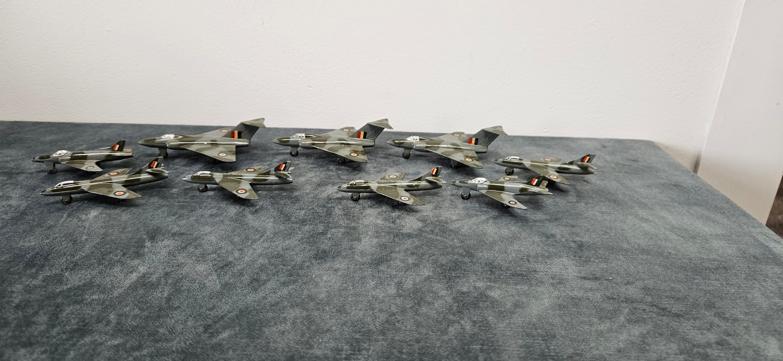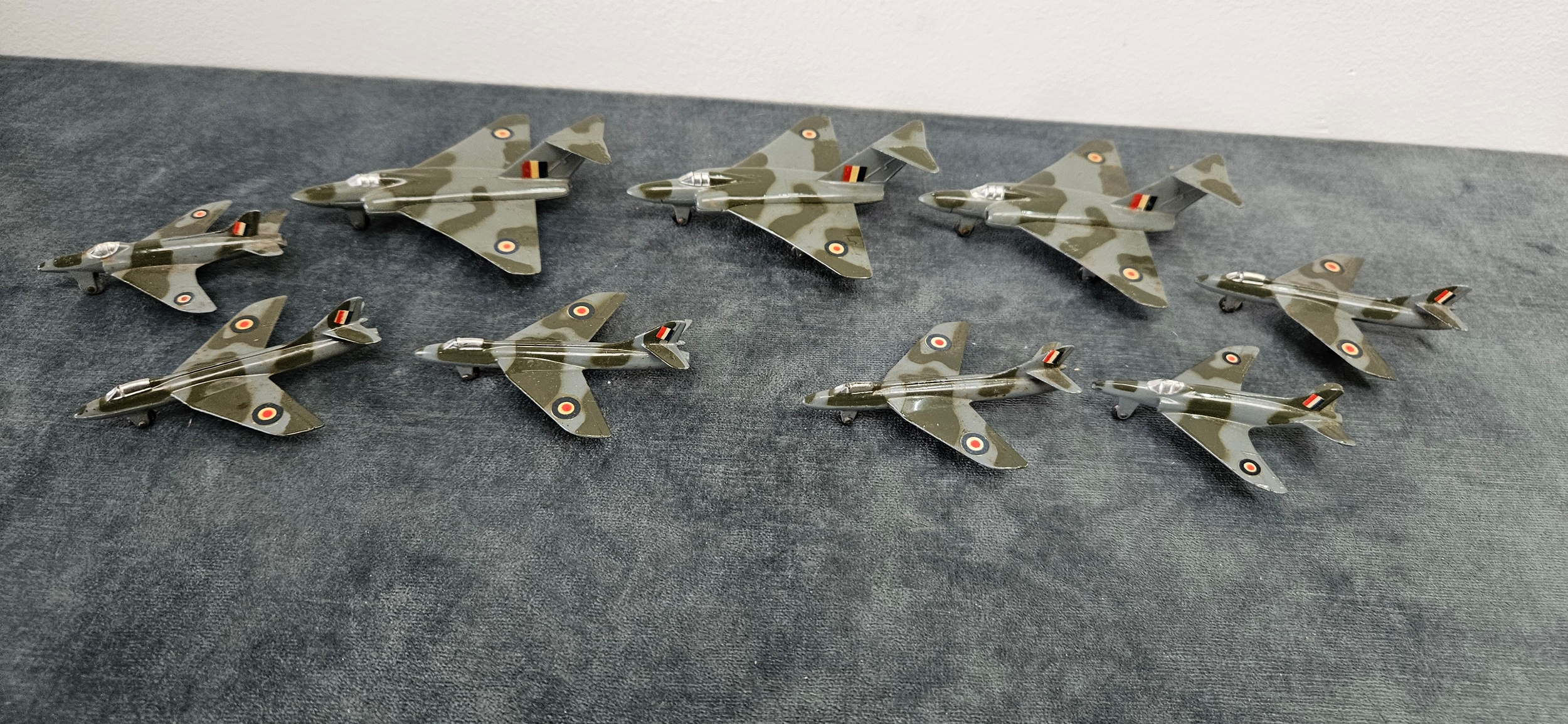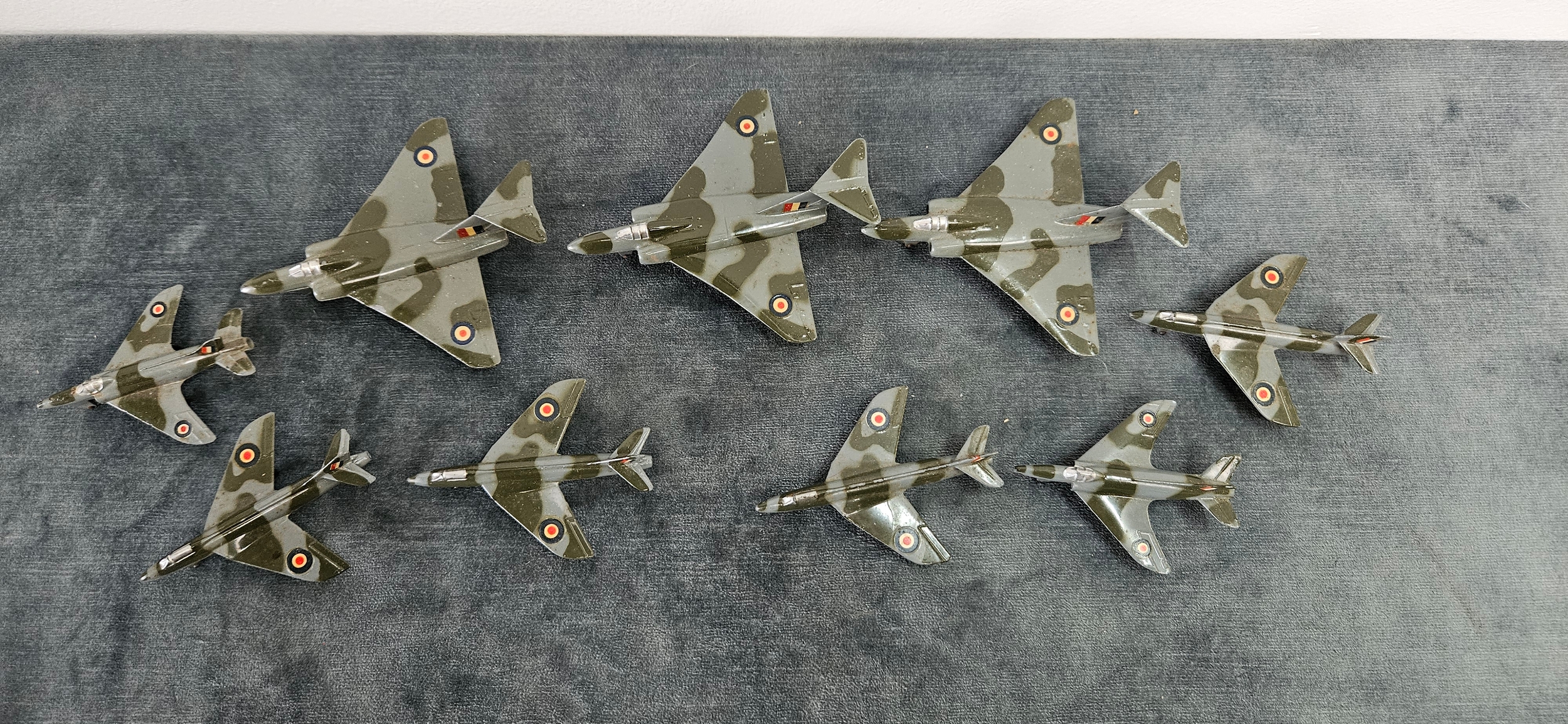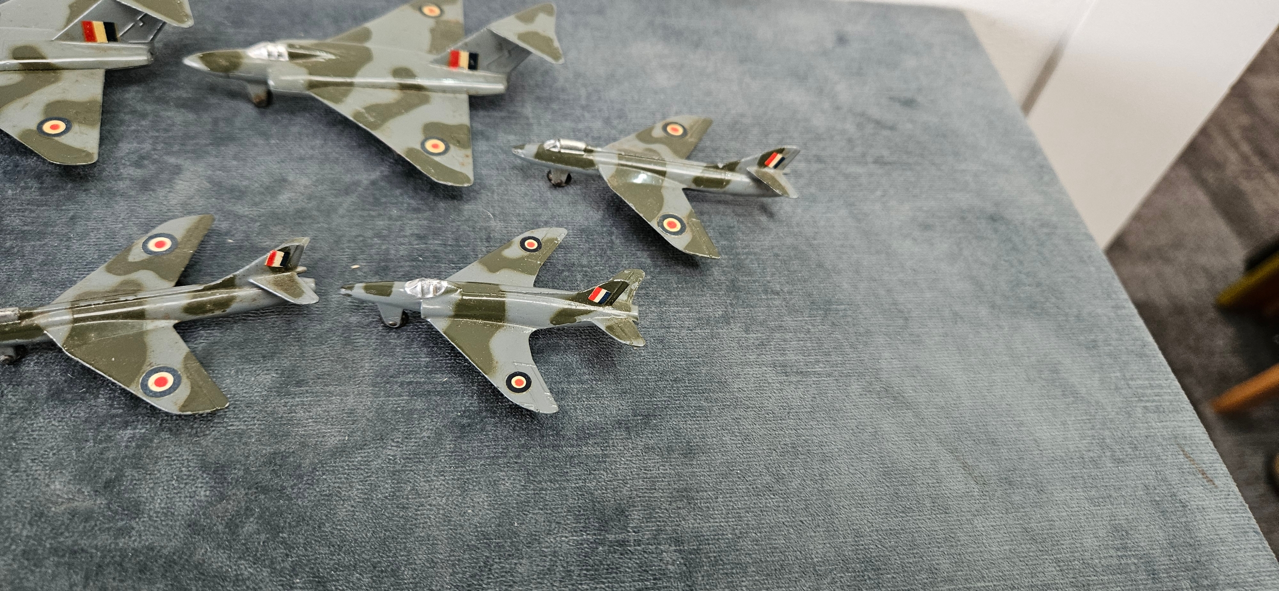 Dinky Toys die-cast model aircraft, specifically the 735 Gloster Javelin Fighter and the 736 Hawker Hunter Fighter, in camouflage grey and green with RAF markings.