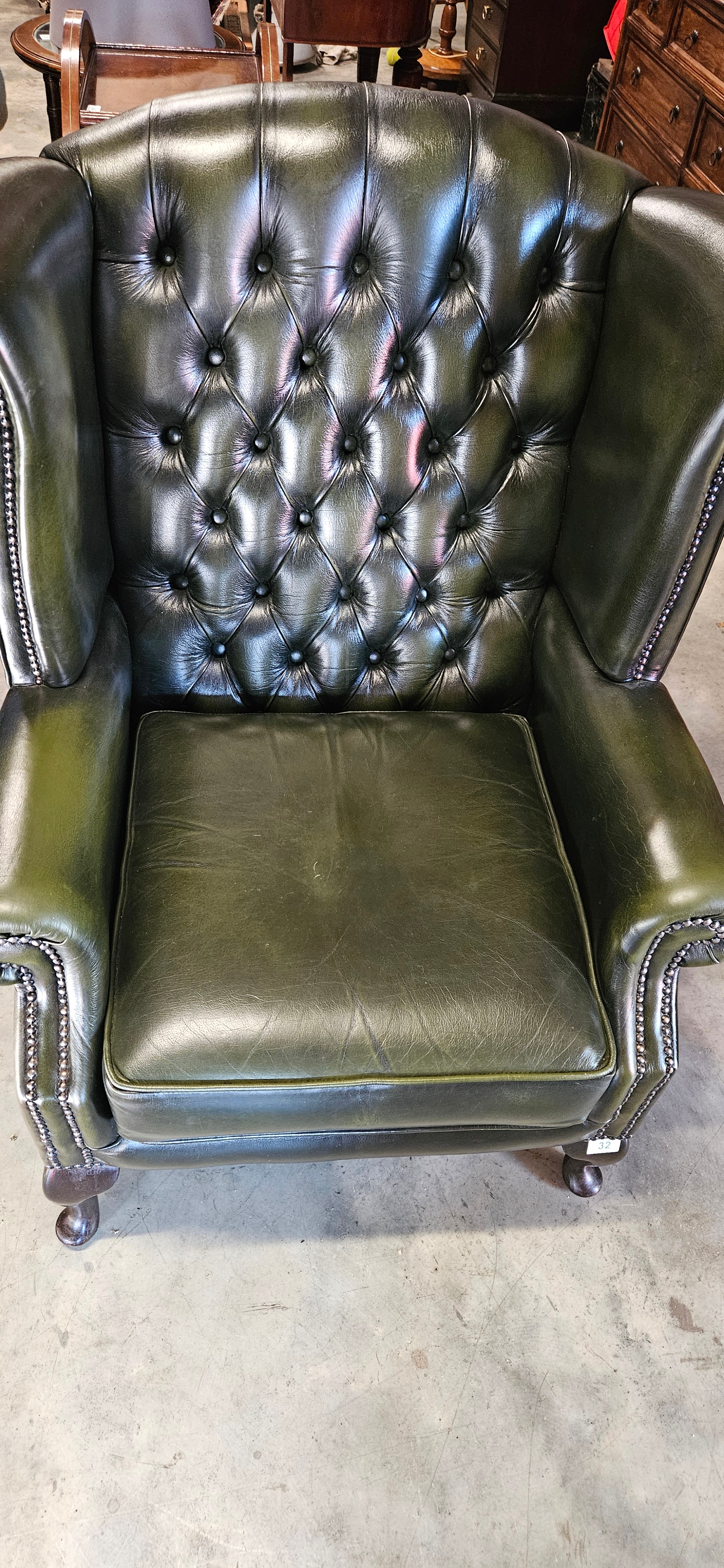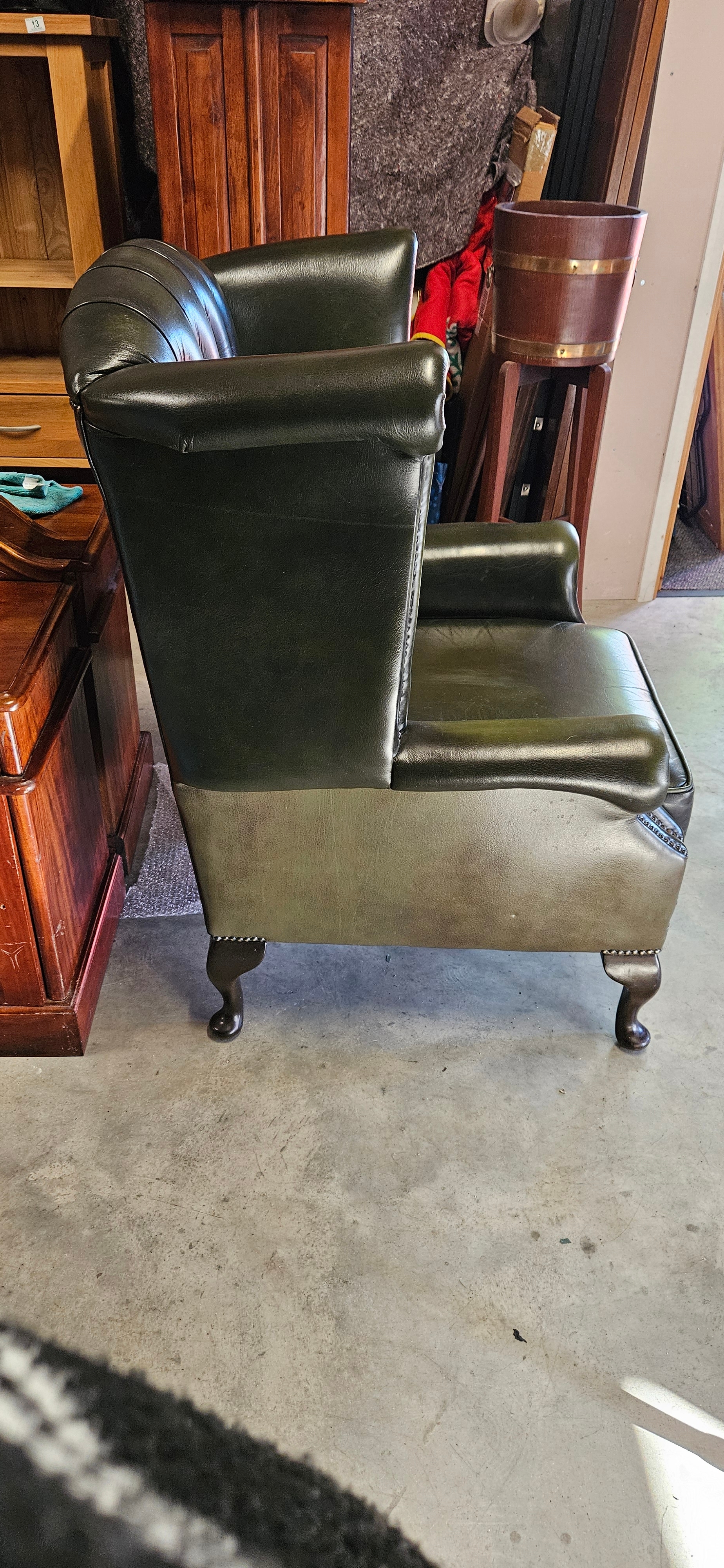 Chesterfield Queen Anne style high-back wing chair in antique green leather – Thomas Lloyd – good condition