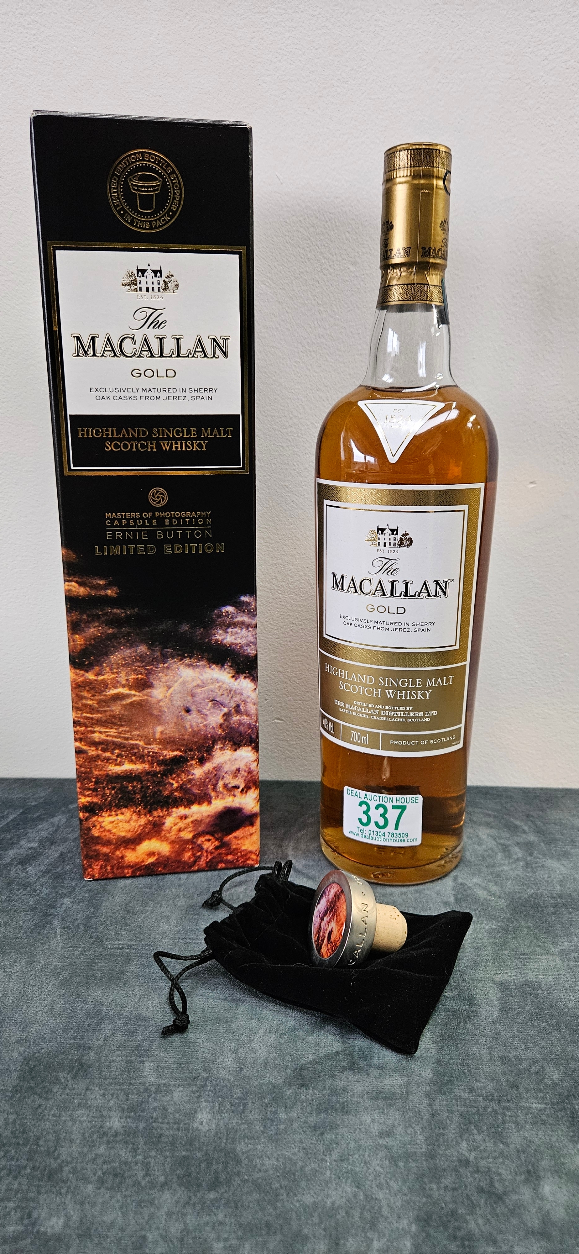 The Macallan Gold Masters of Photography Ernie Button Limited Edition single malt Scotch whisky. Including limited edition bottle stopper