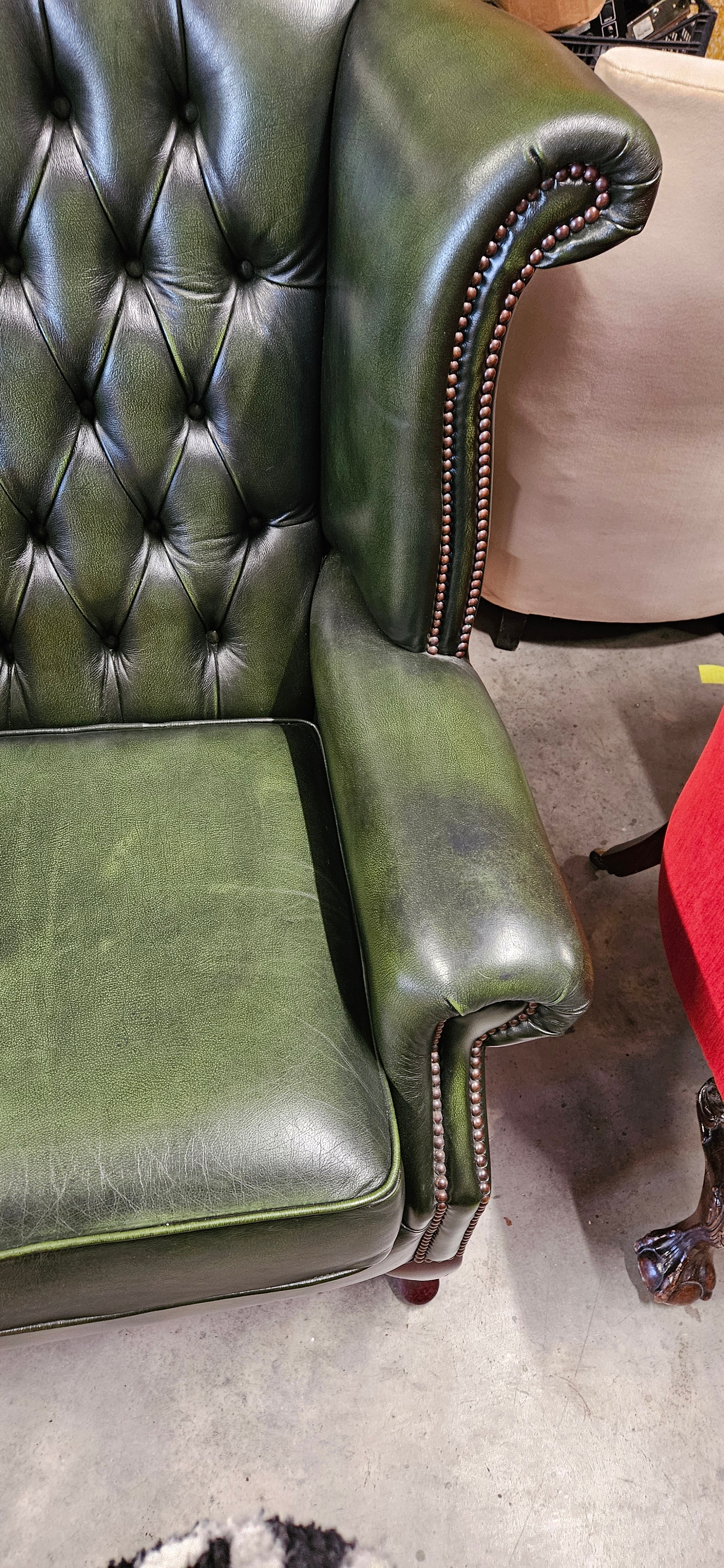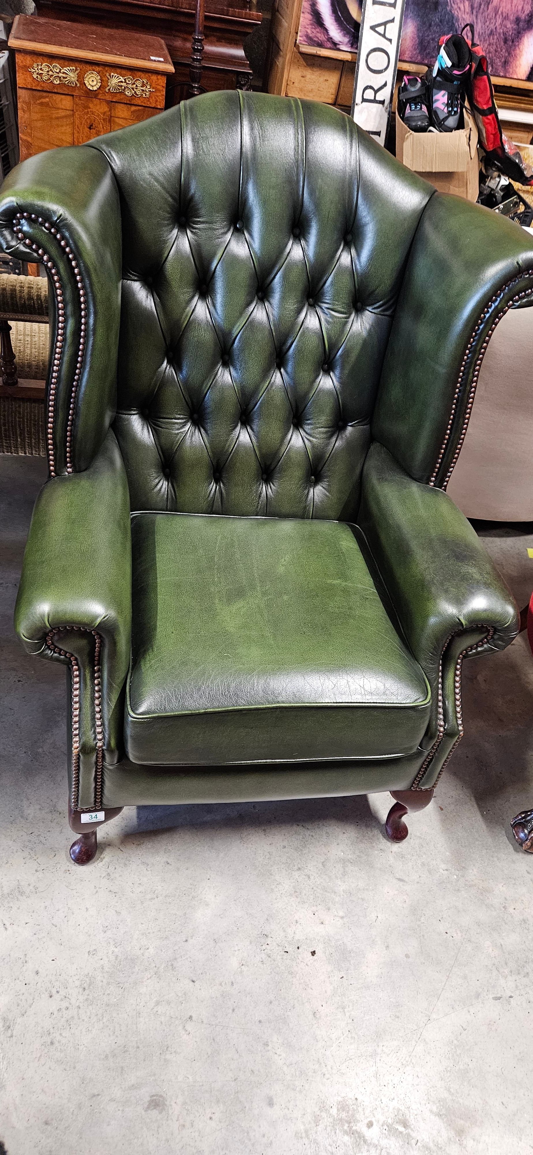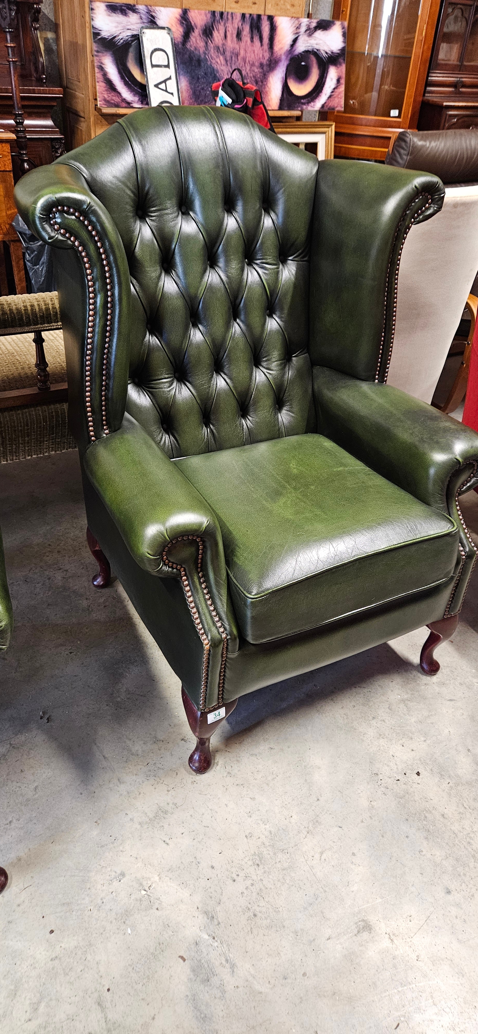 Chesterfield Queen Anne style high-back wing chair in antique green leather – good condition