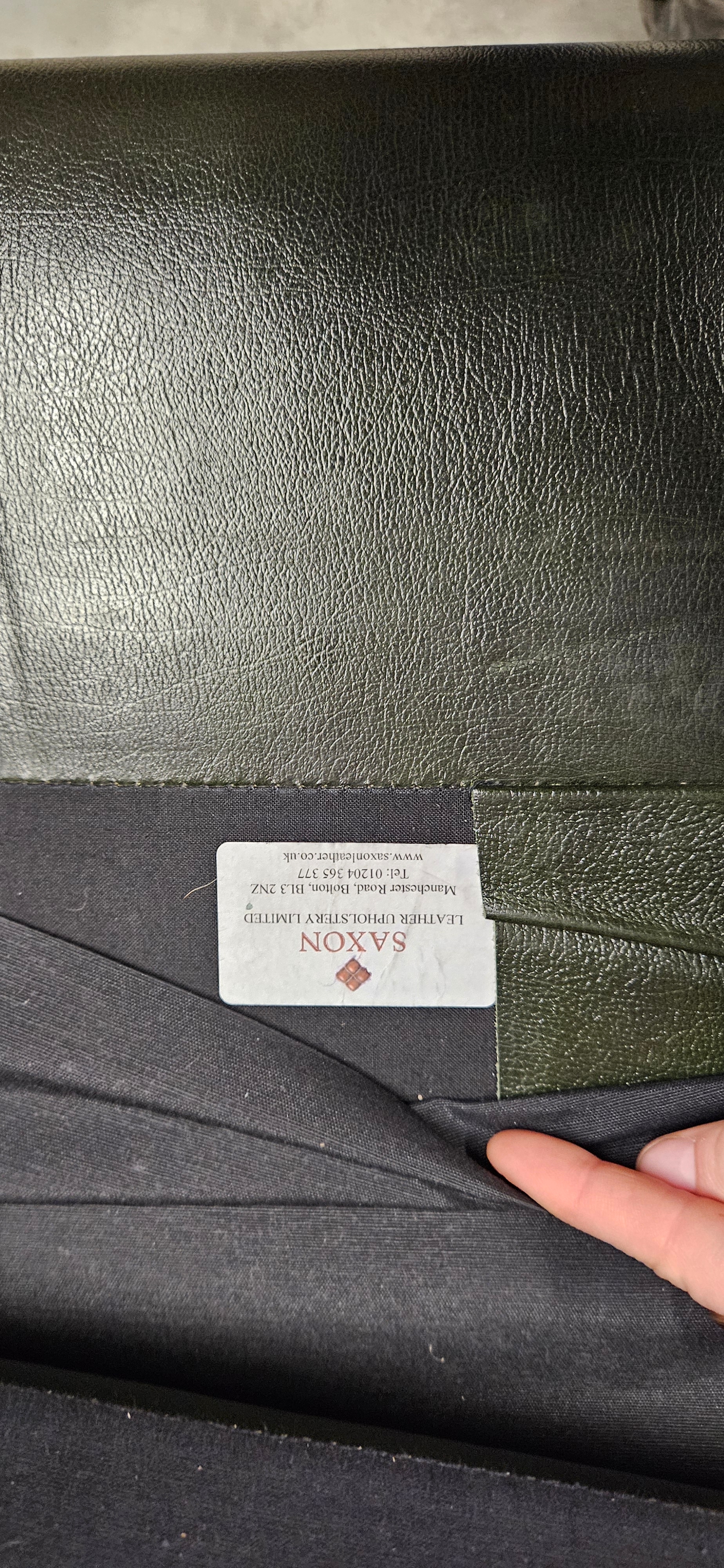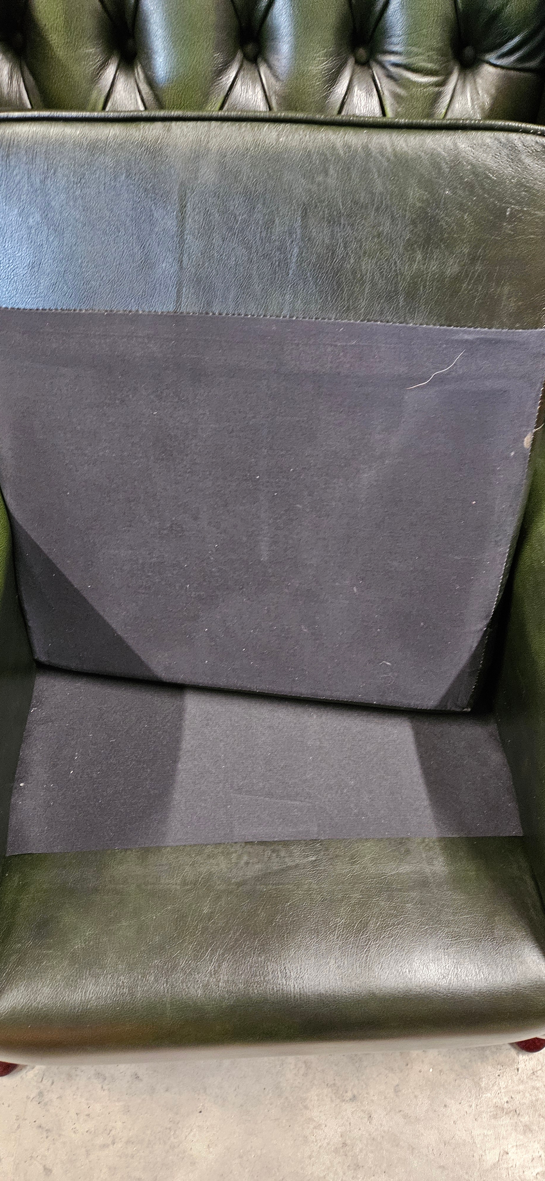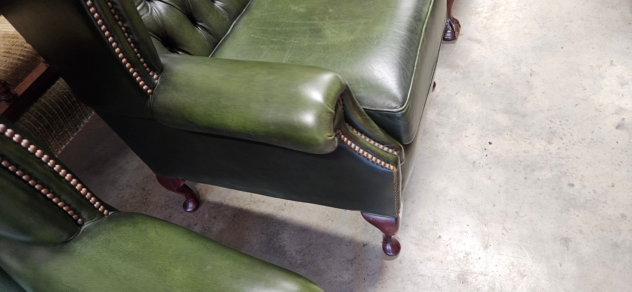 Chesterfield Queen Anne style high-back wing chair in antique green leather – good condition