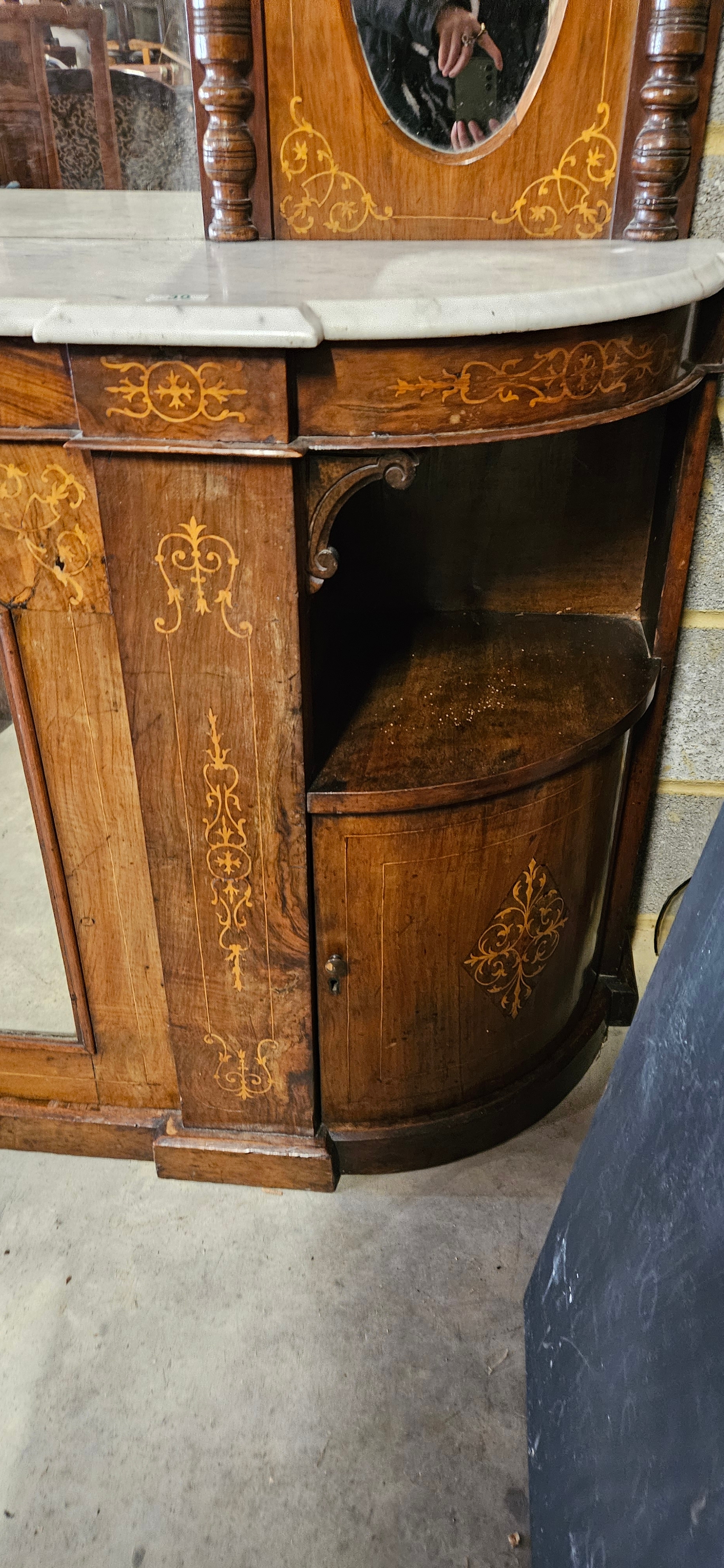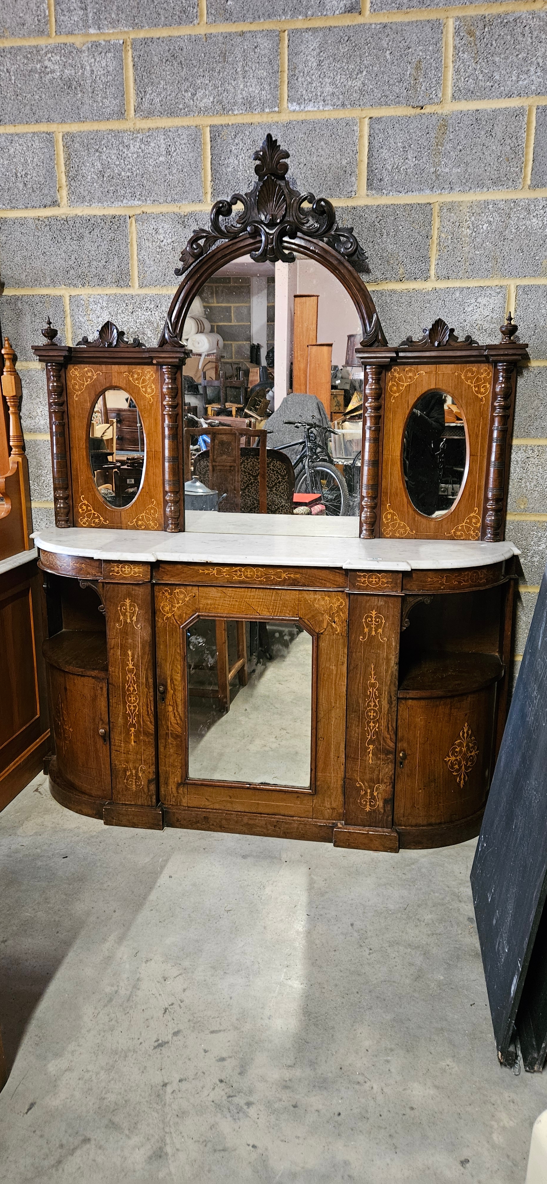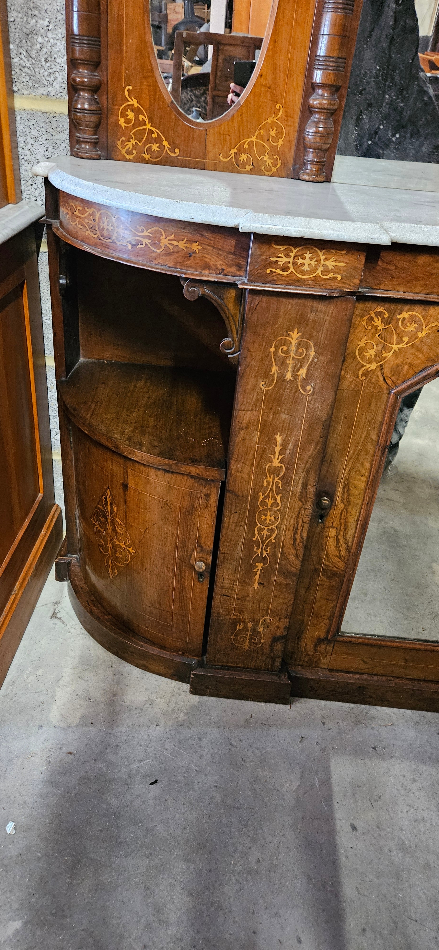 Antique Victorian burr walnut credenza or sideboard with a mirrored back and a marble top.