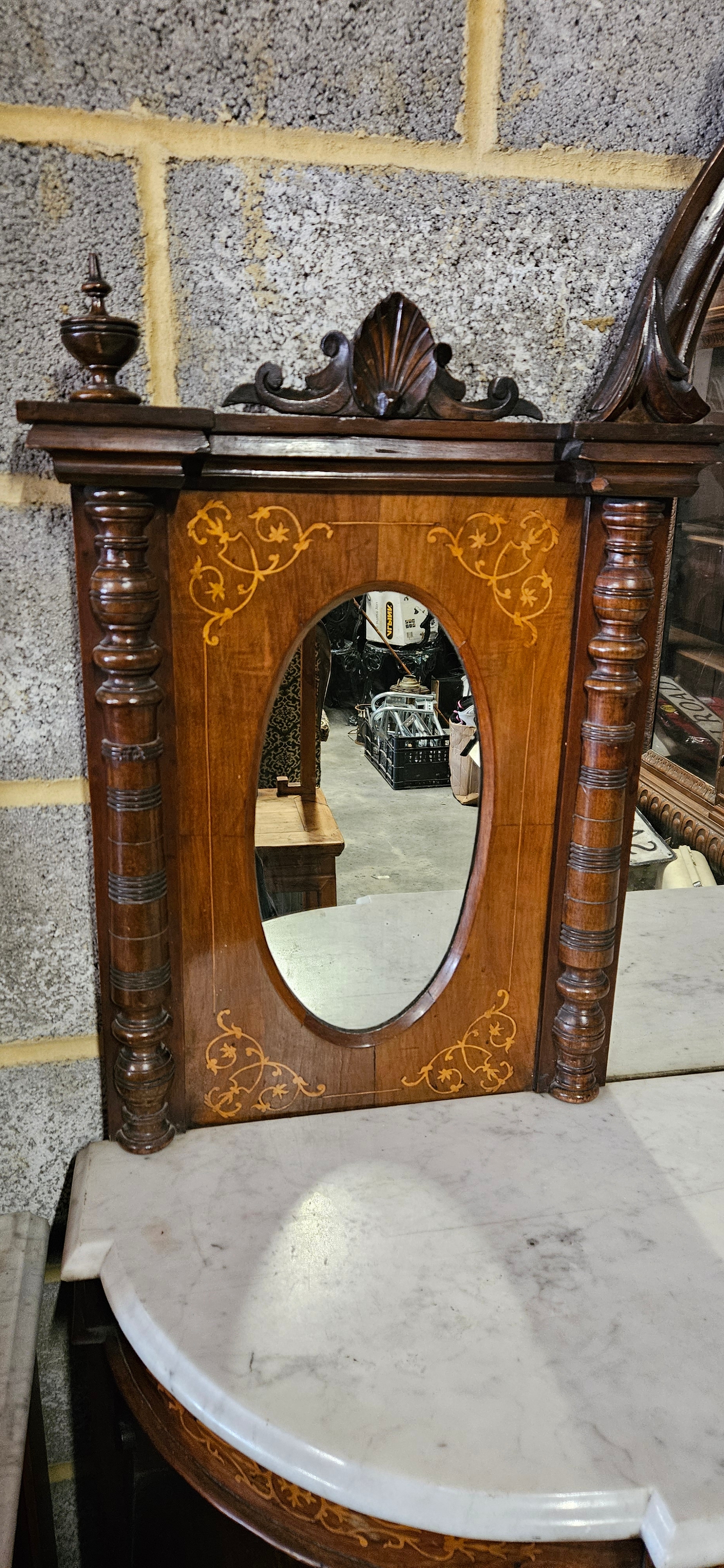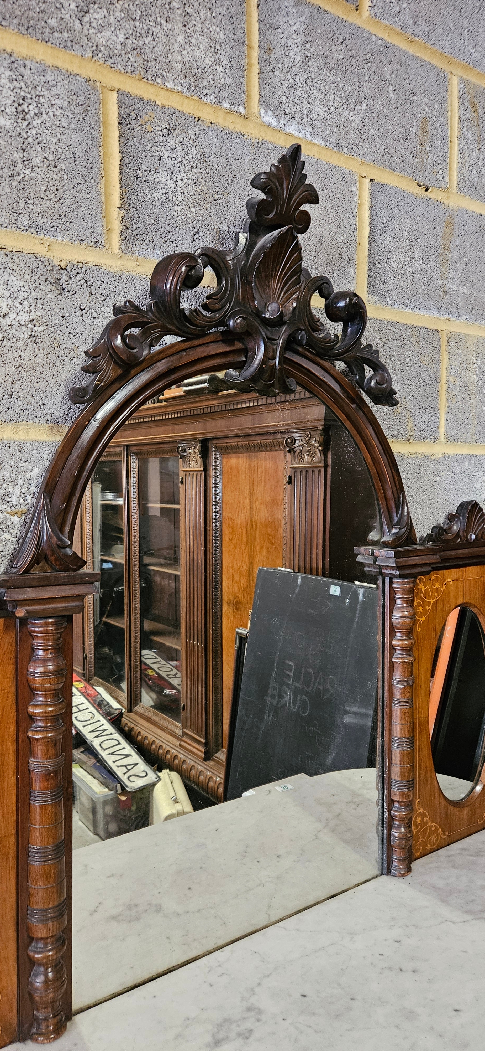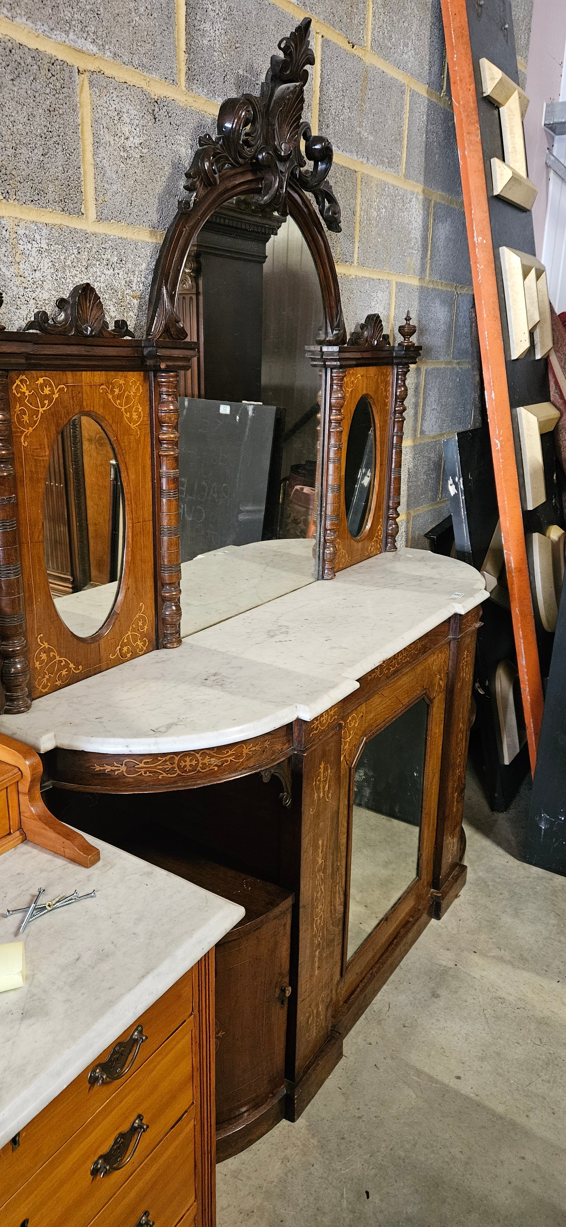 Antique Victorian burr walnut credenza or sideboard with a mirrored back and a marble top.