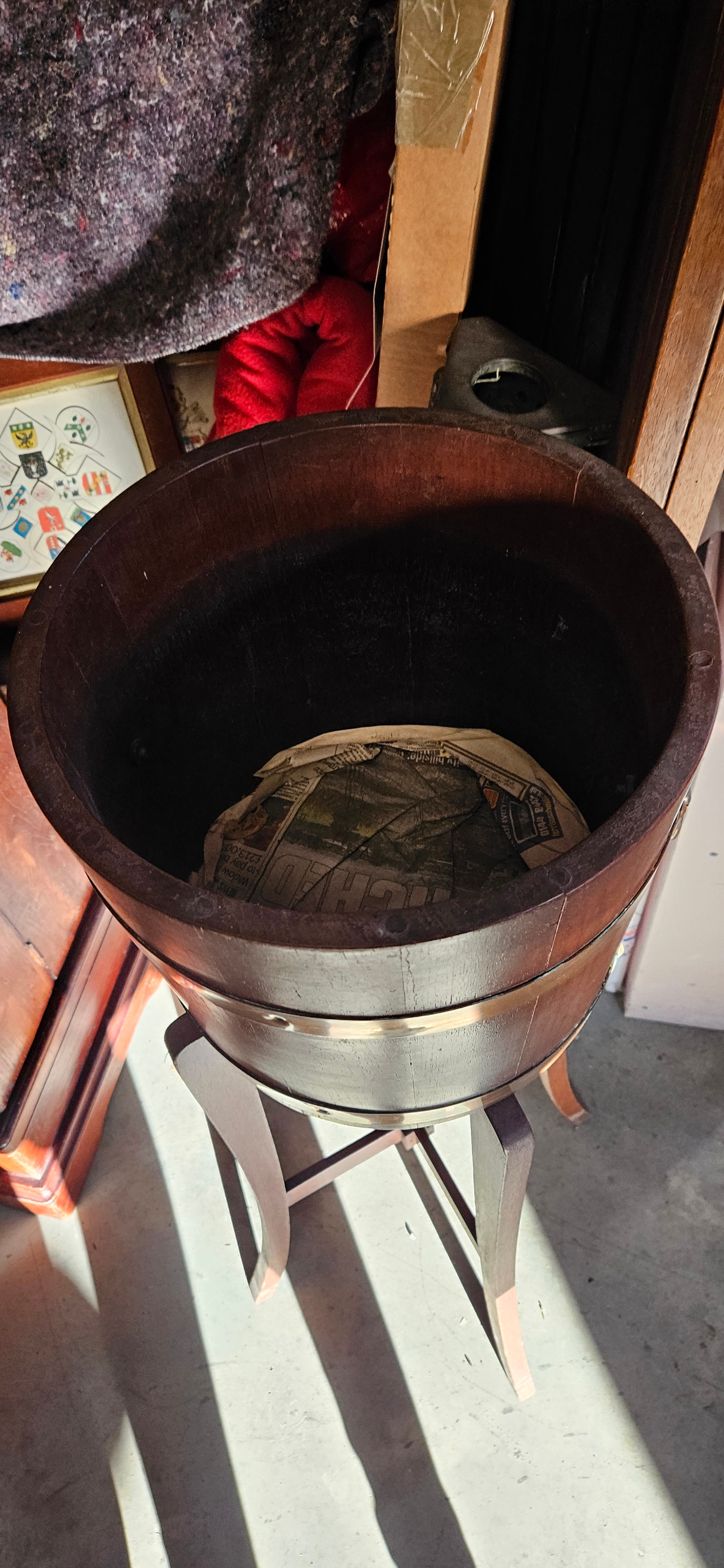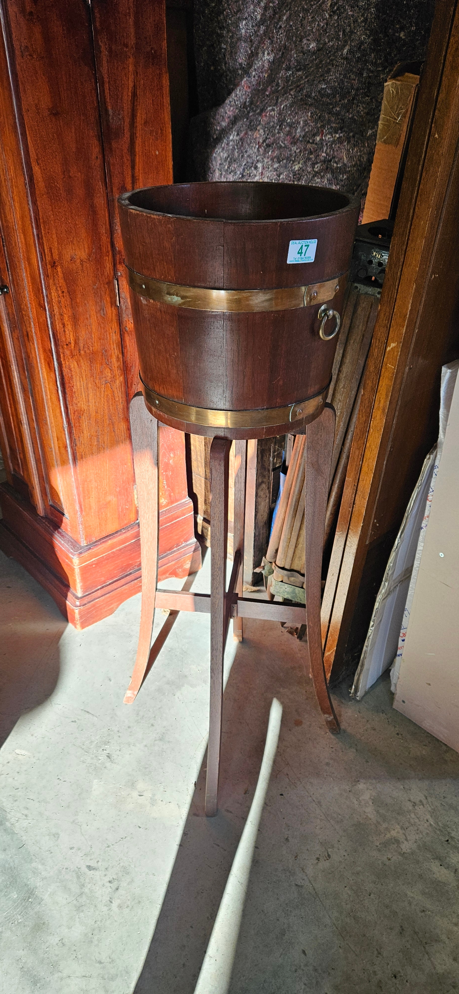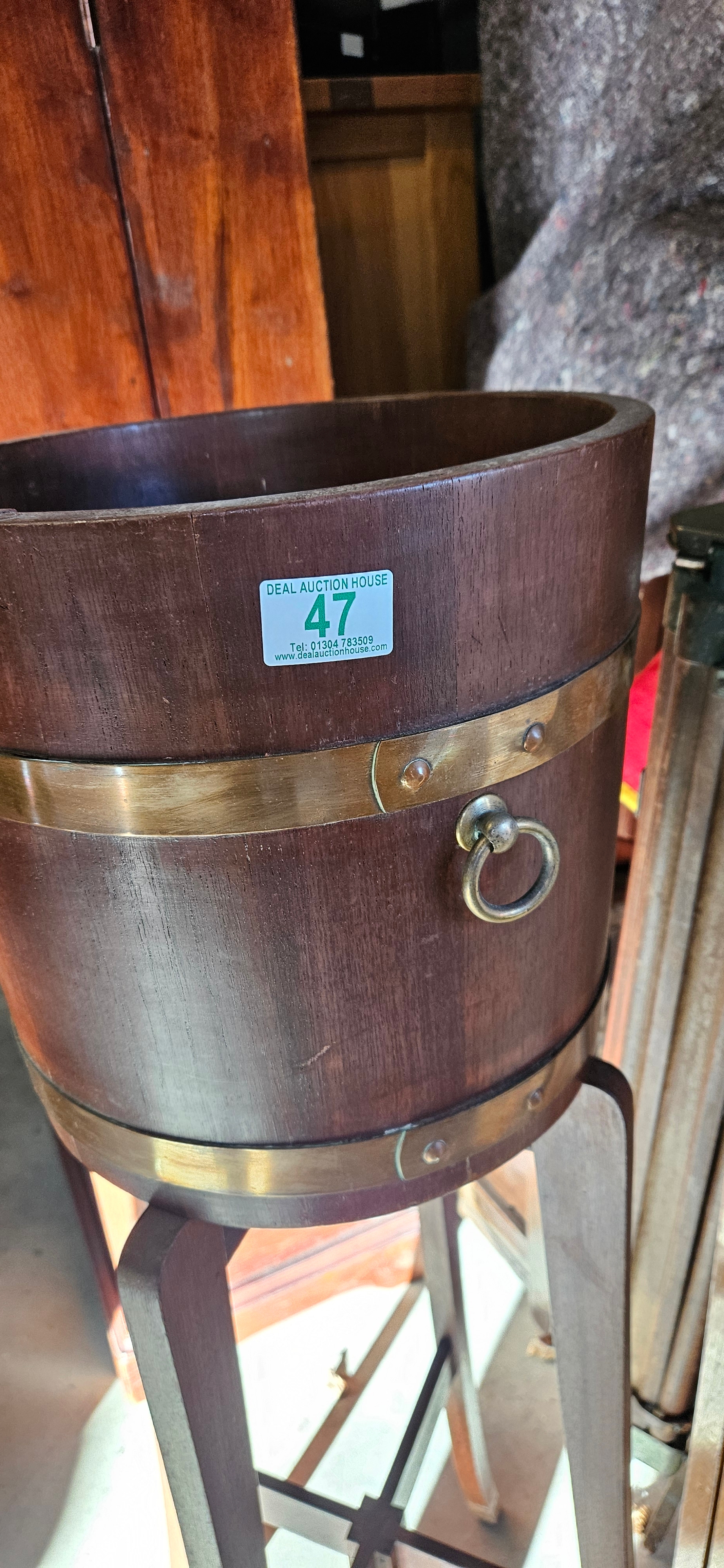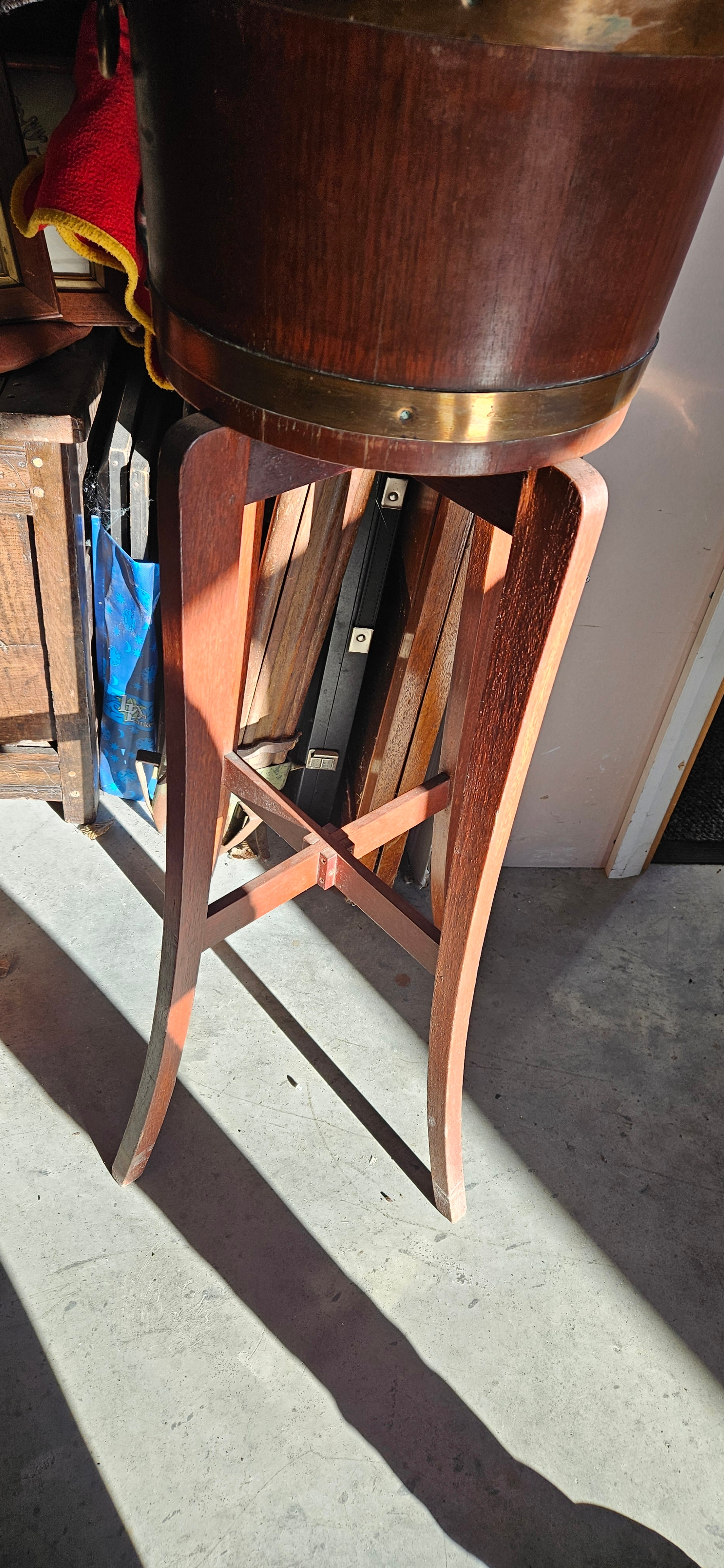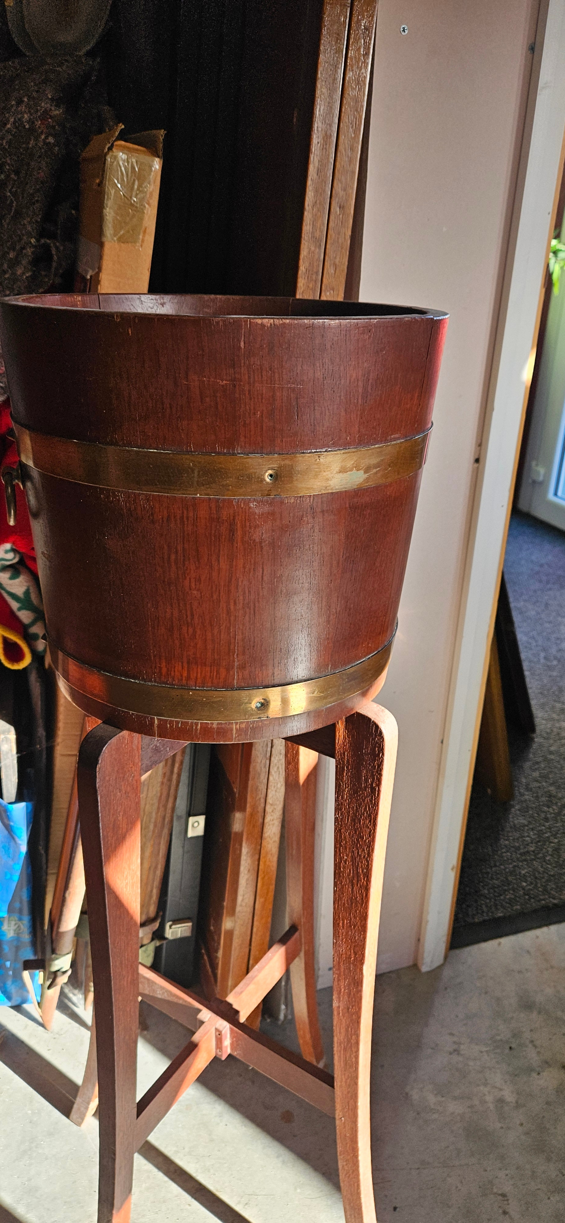 Hardwood and brass coopered barrel jardiniere stand