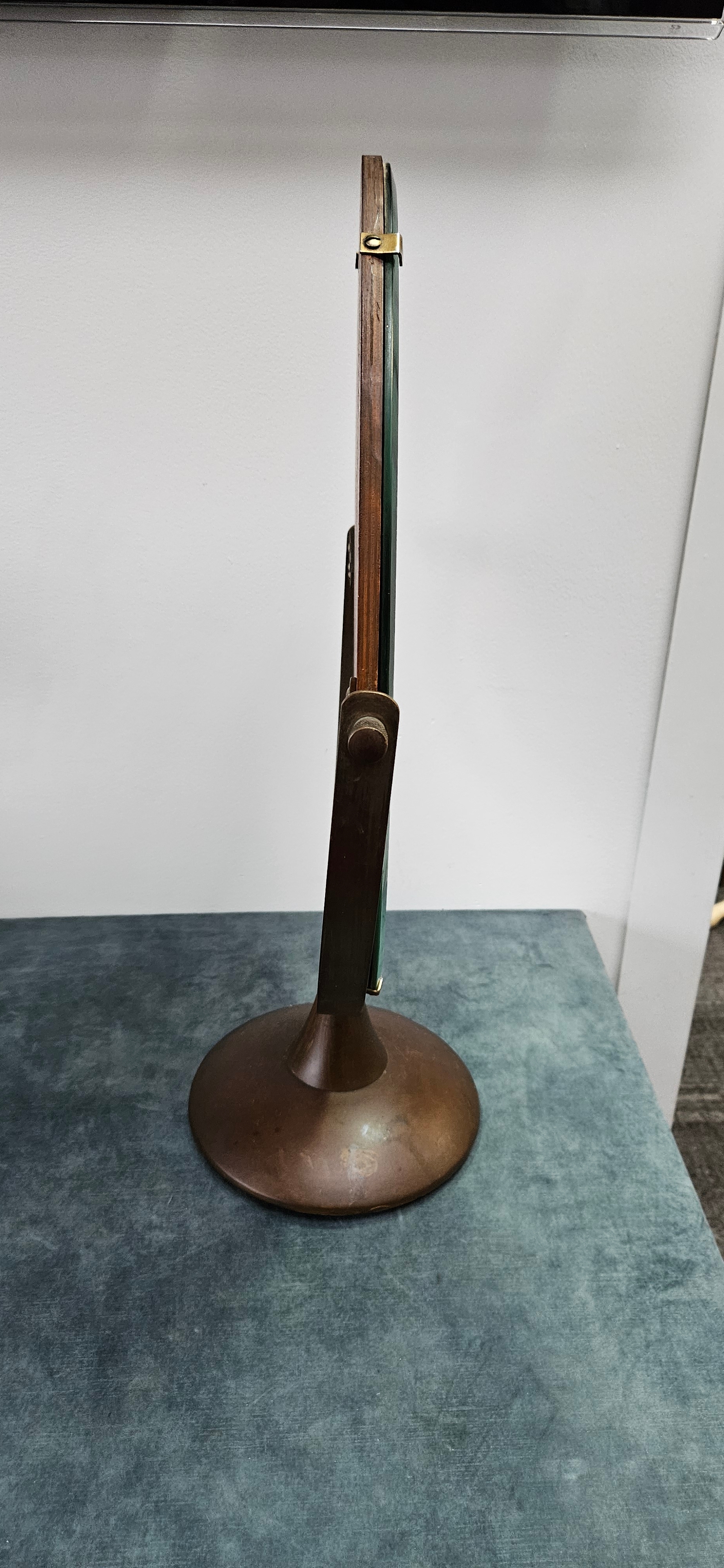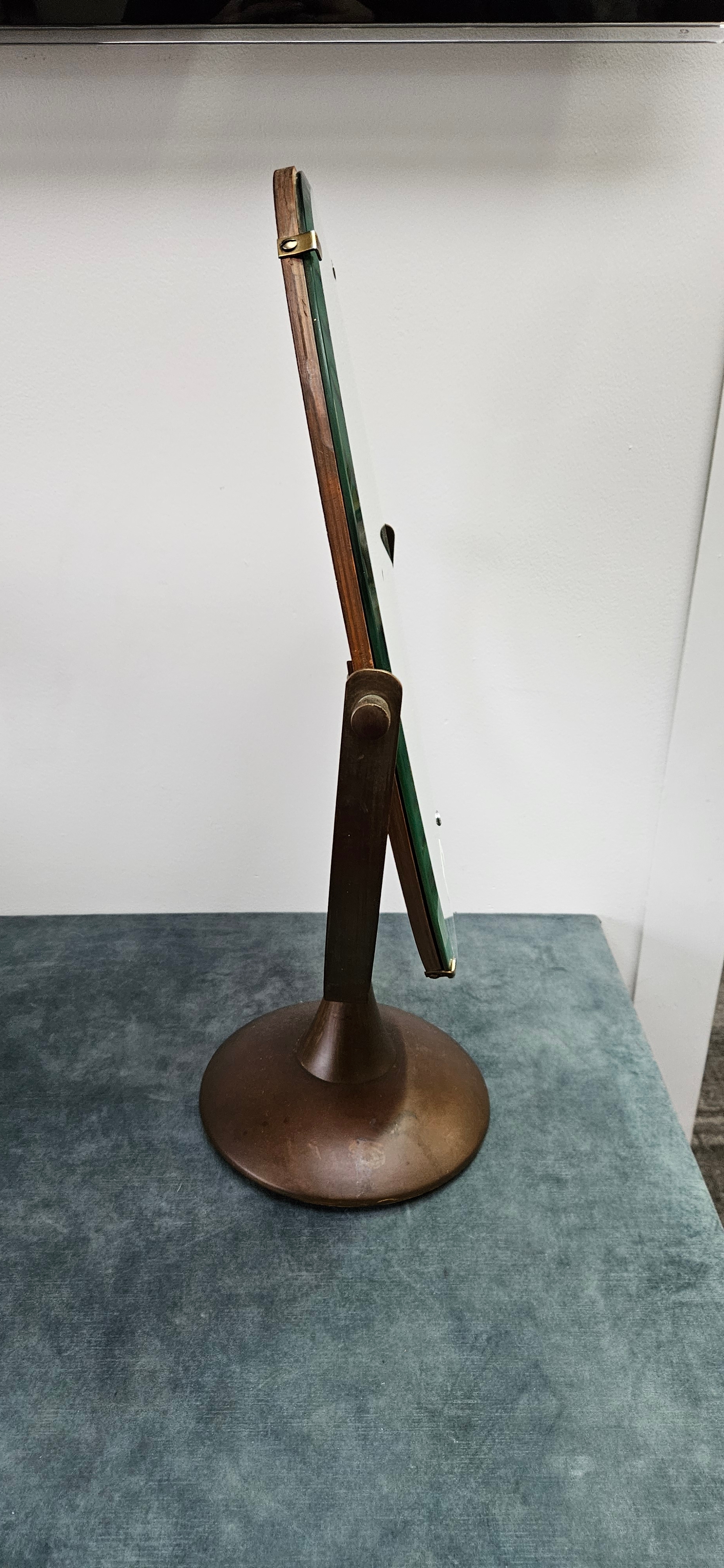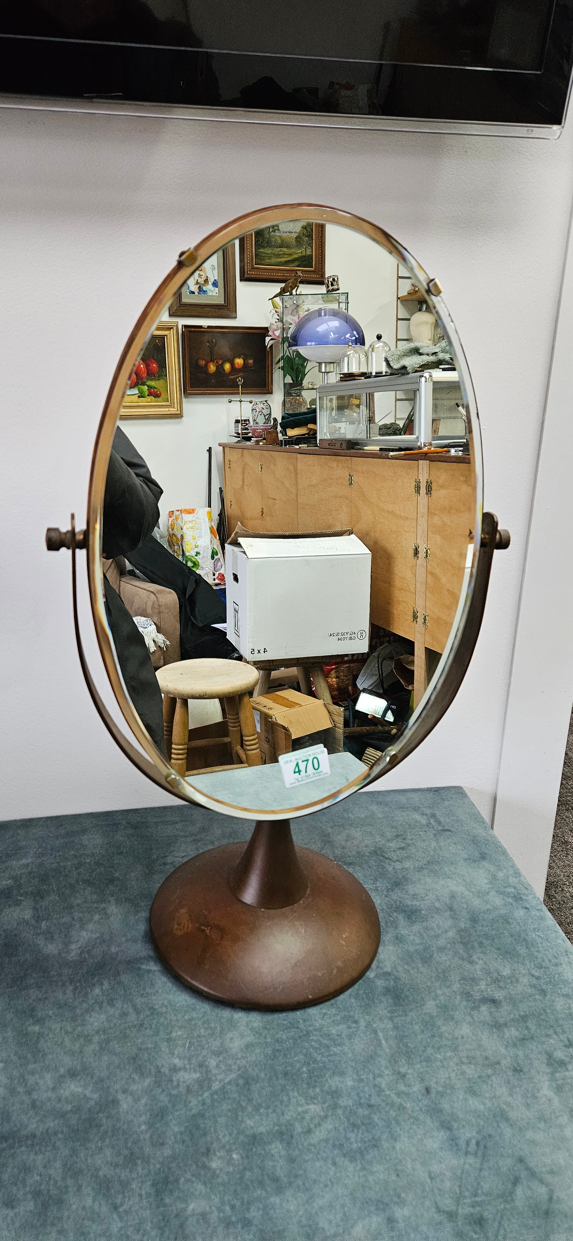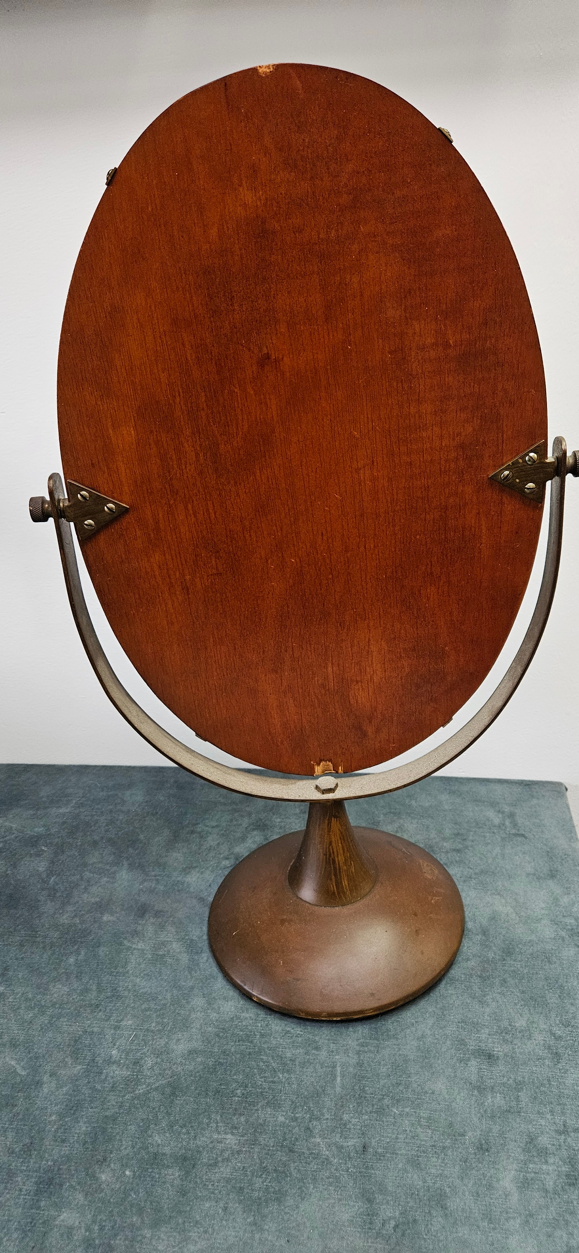Vintage metal adjustable vanity mirror with an oval bevelled plate and a circular foot.