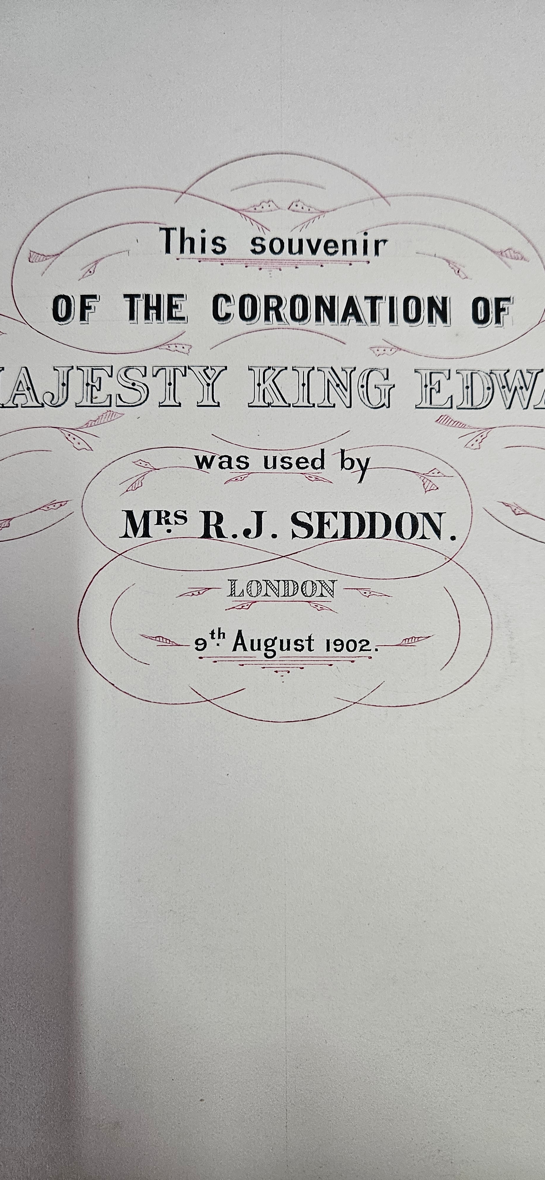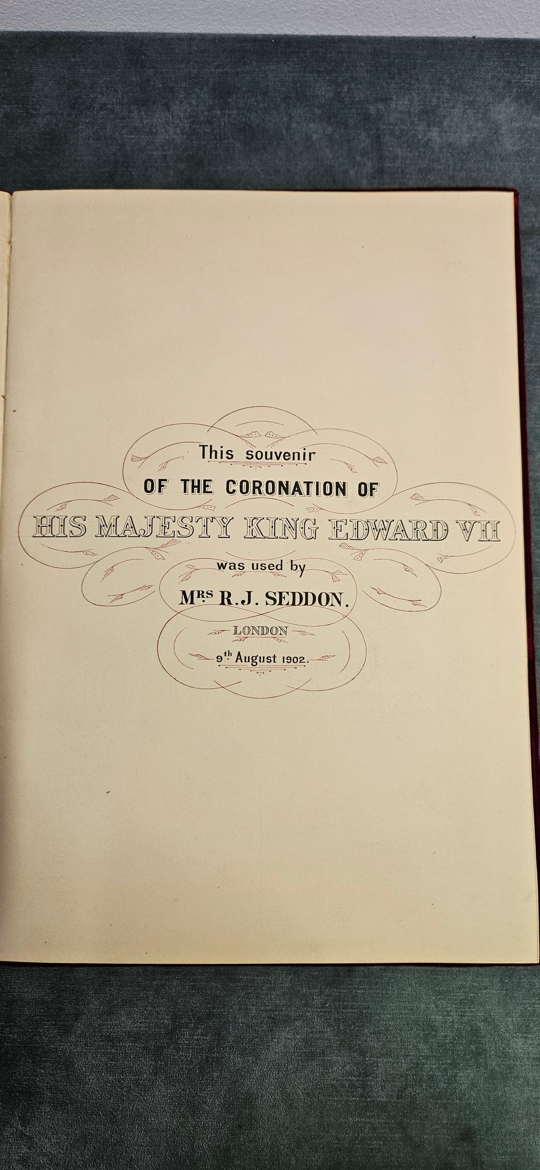 Book or programme for the coronation of King Edward the Seventh and Queen Alexandra, which took place on August 9th, 1902. – This copy was used by Mrs R. J. Seddon. She was the wife of New Zealand Premier, Richard Seddon.