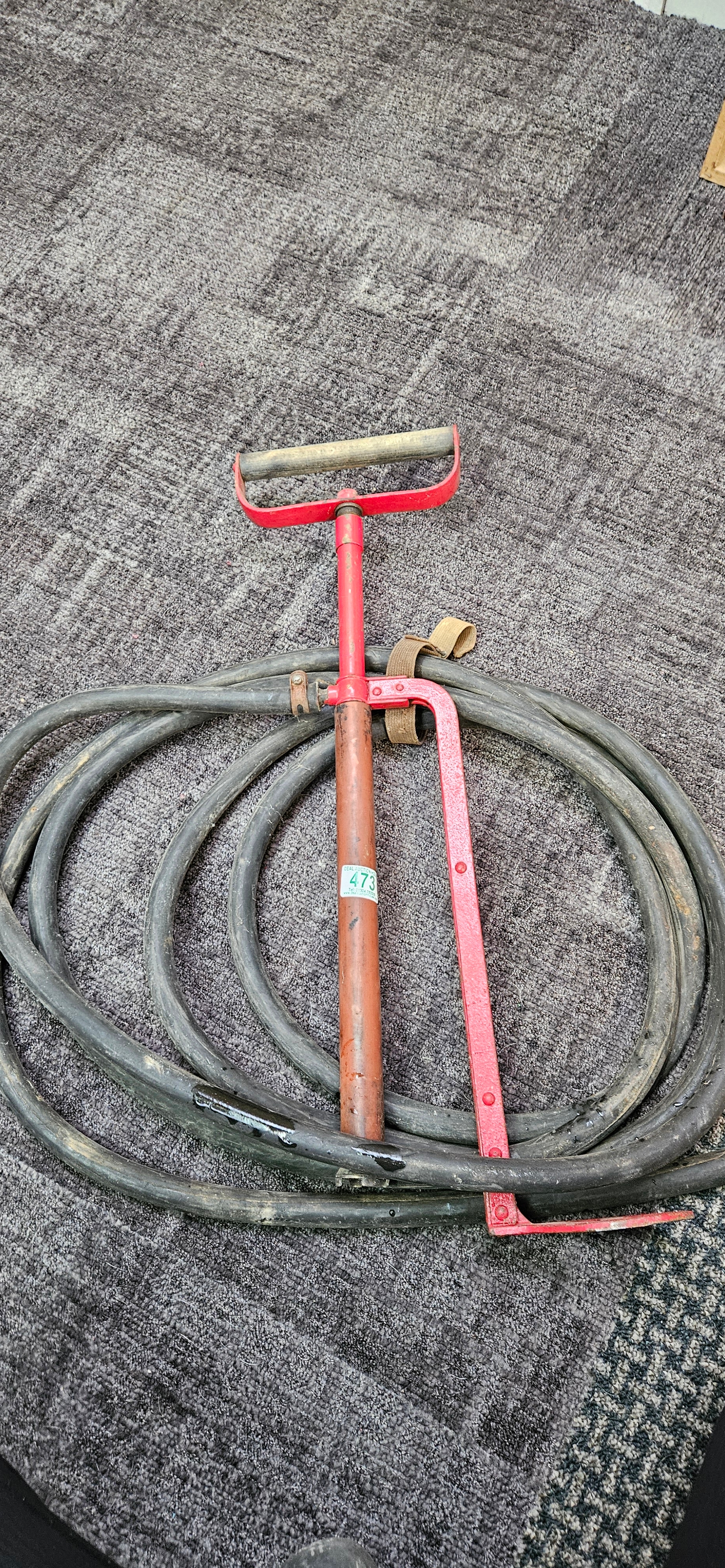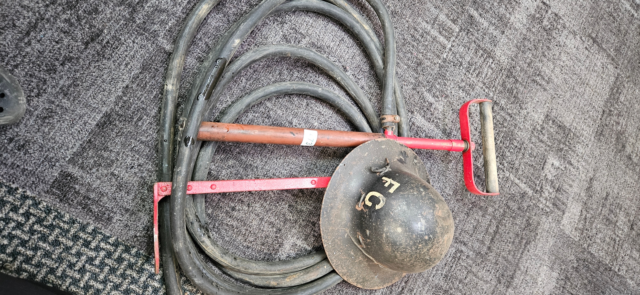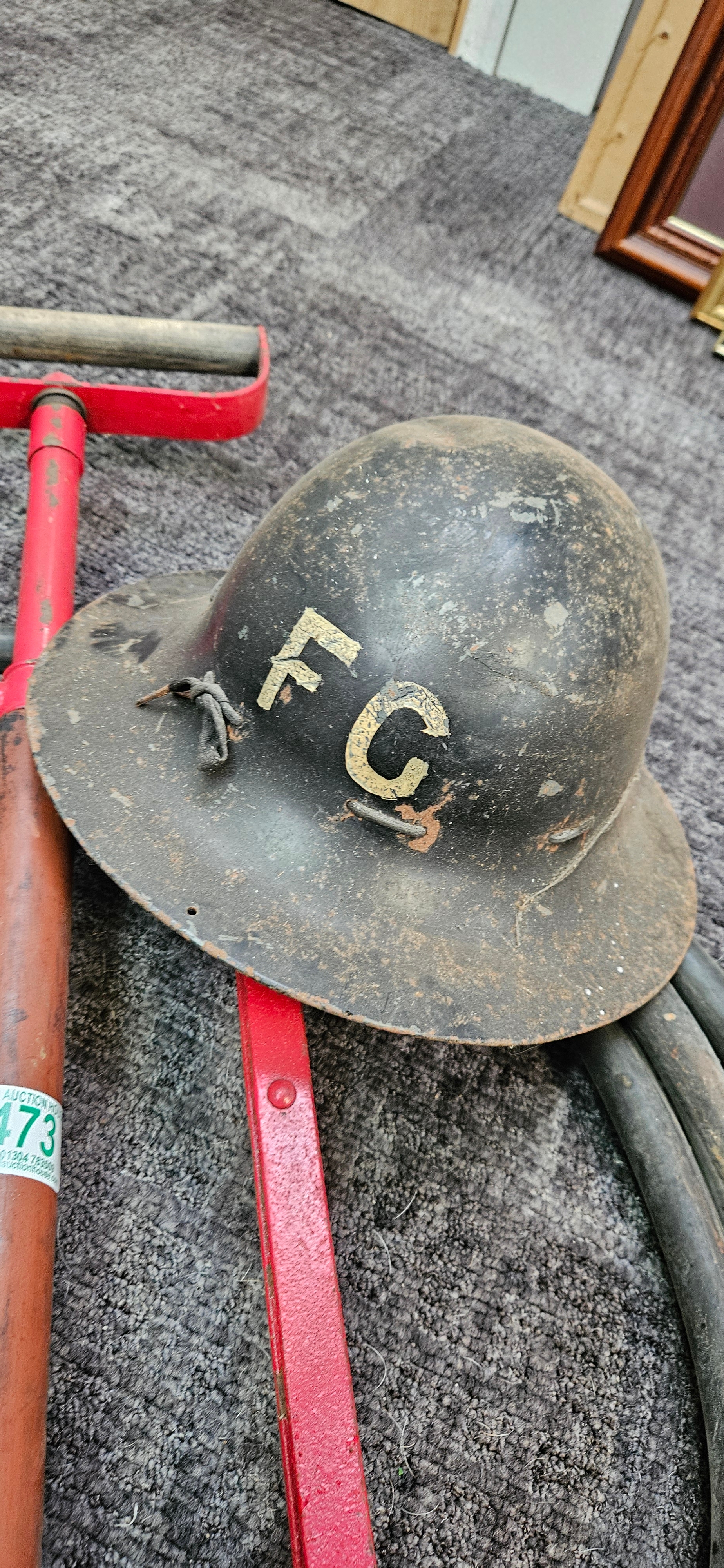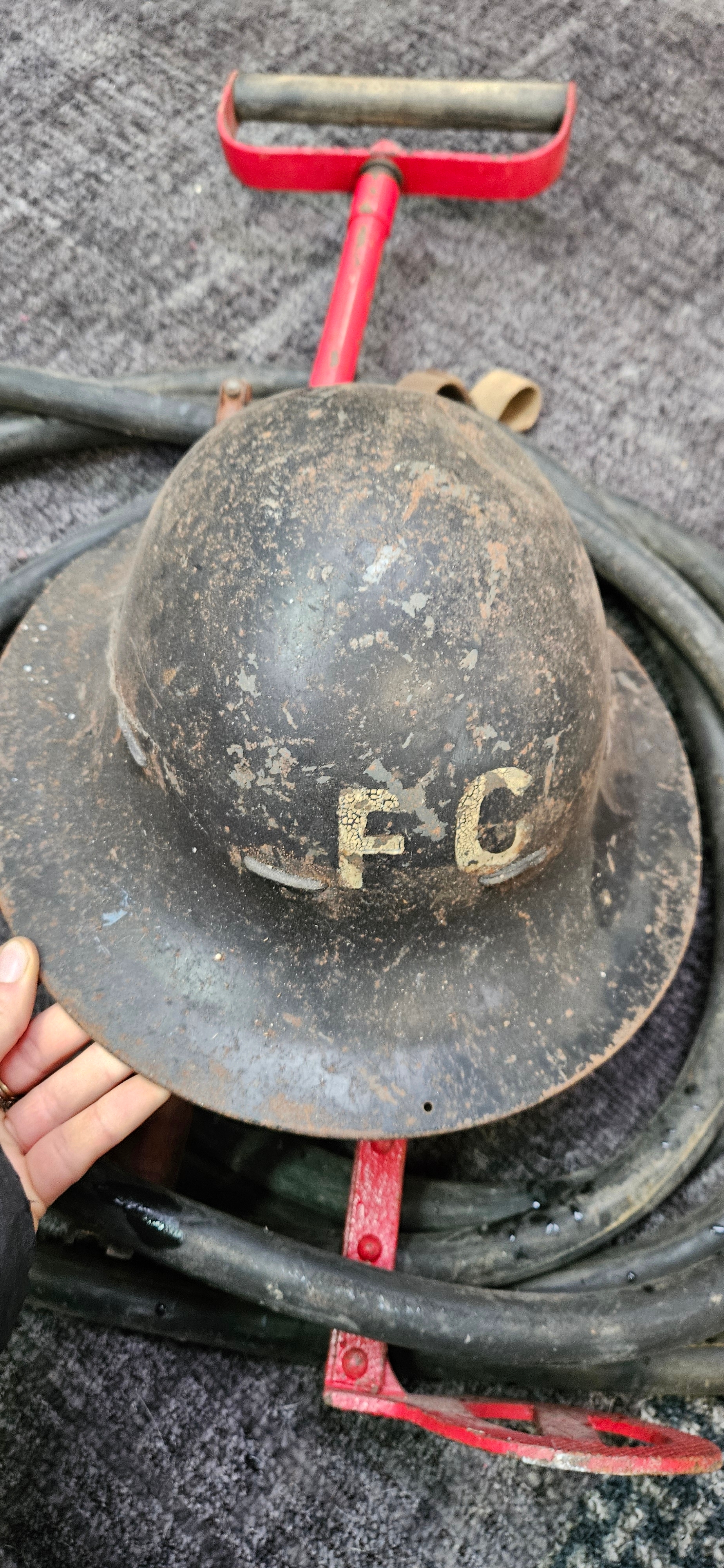 British World War II "Zuckerman" helmet with "FG" markings – Fire Guard and a WWII stirrup pump and hose