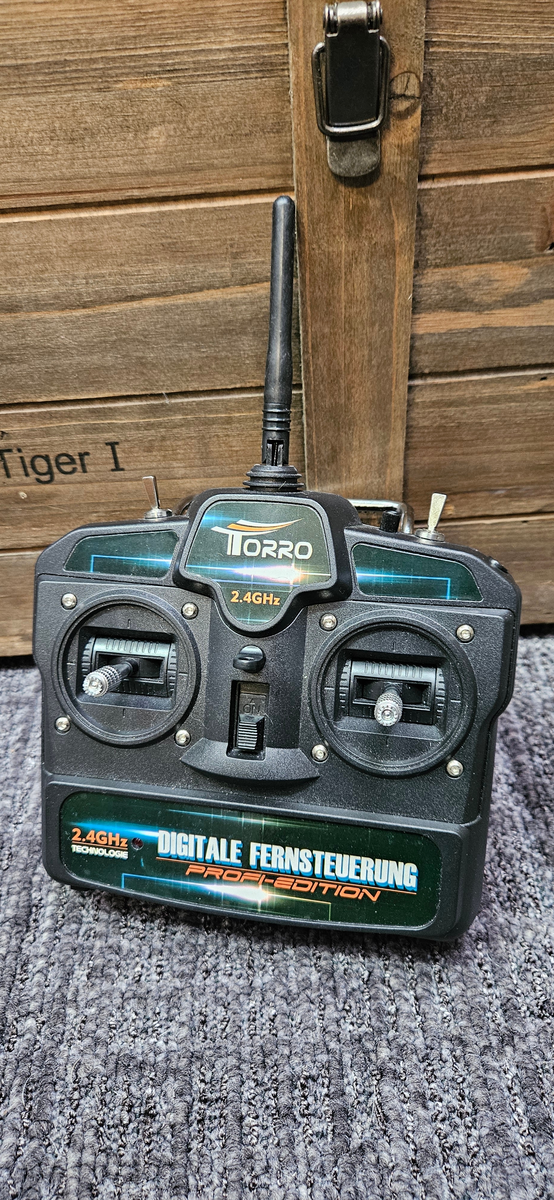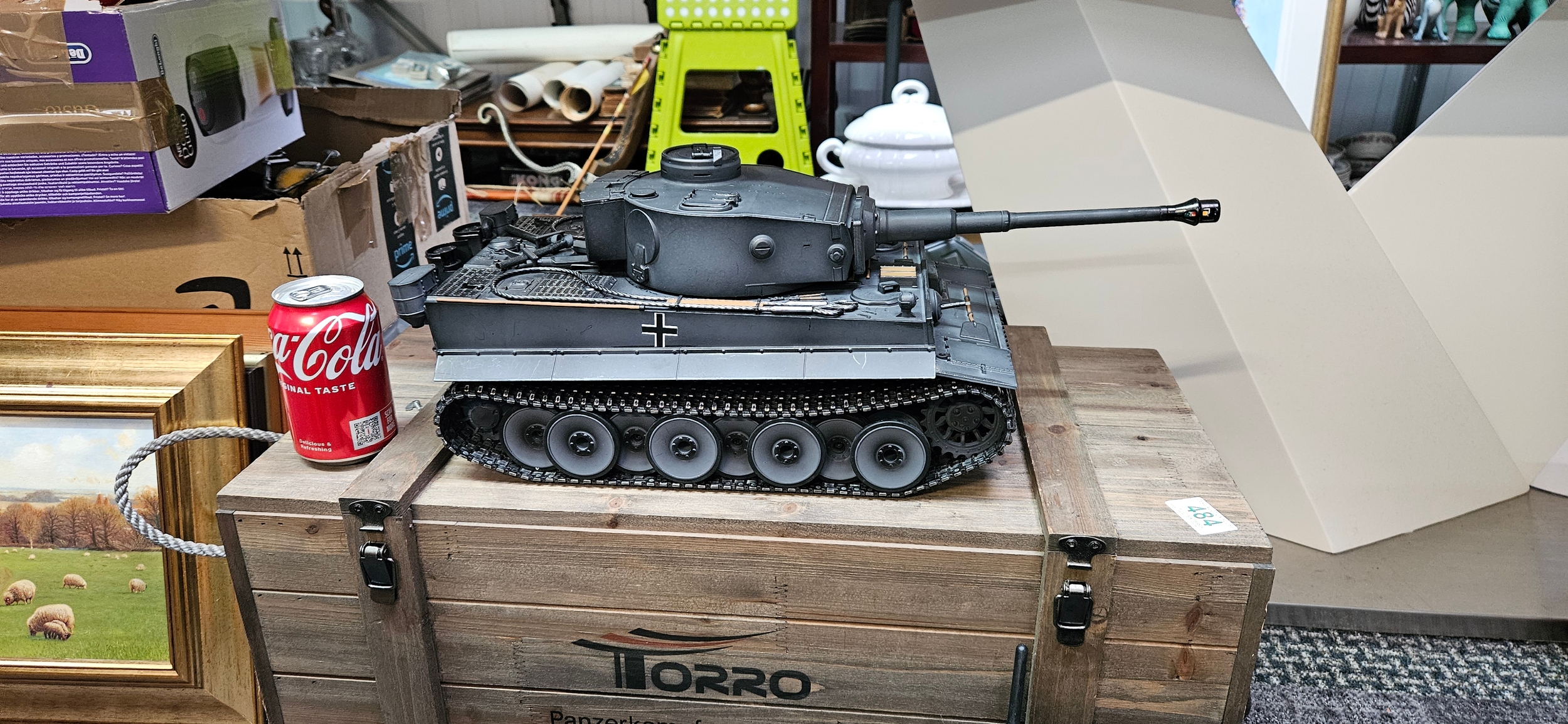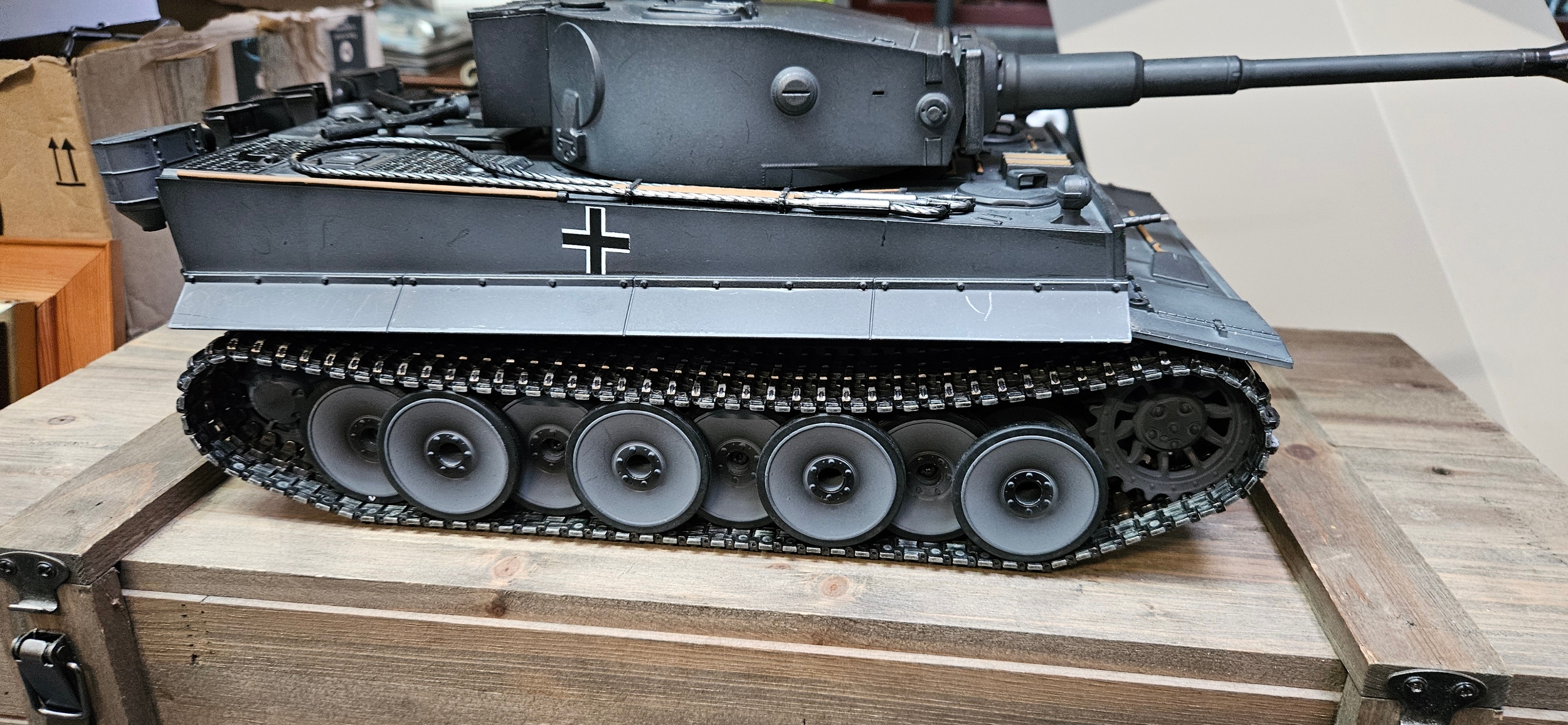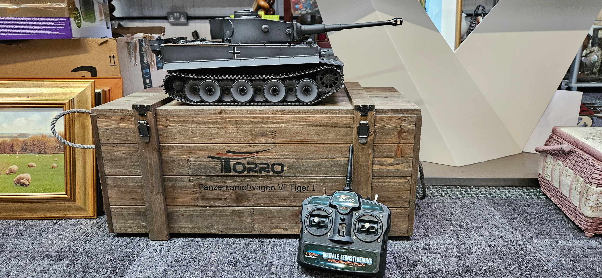 Large Torro 1/16 RC Tiger I radio-controlled tank – Complete with wooden box and accessories. Appears to be working