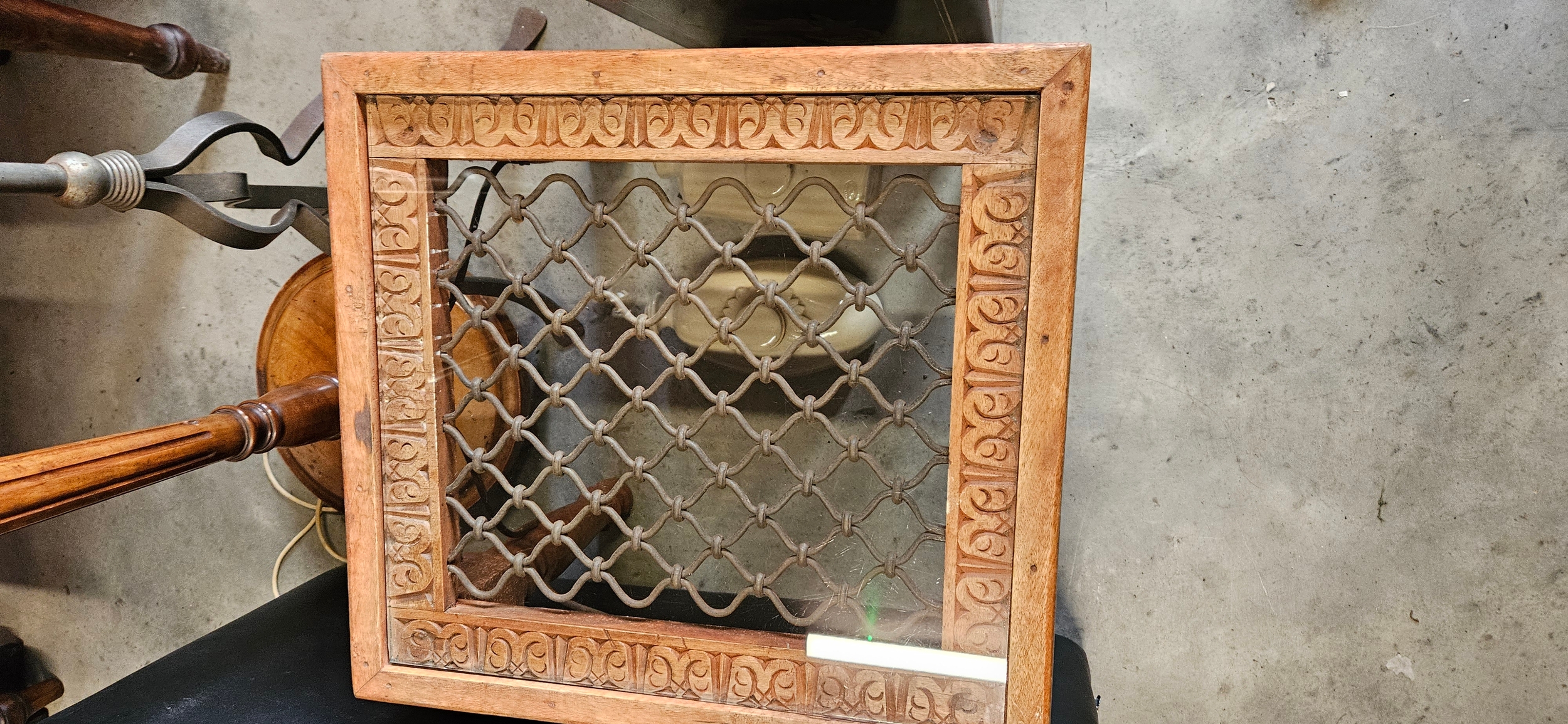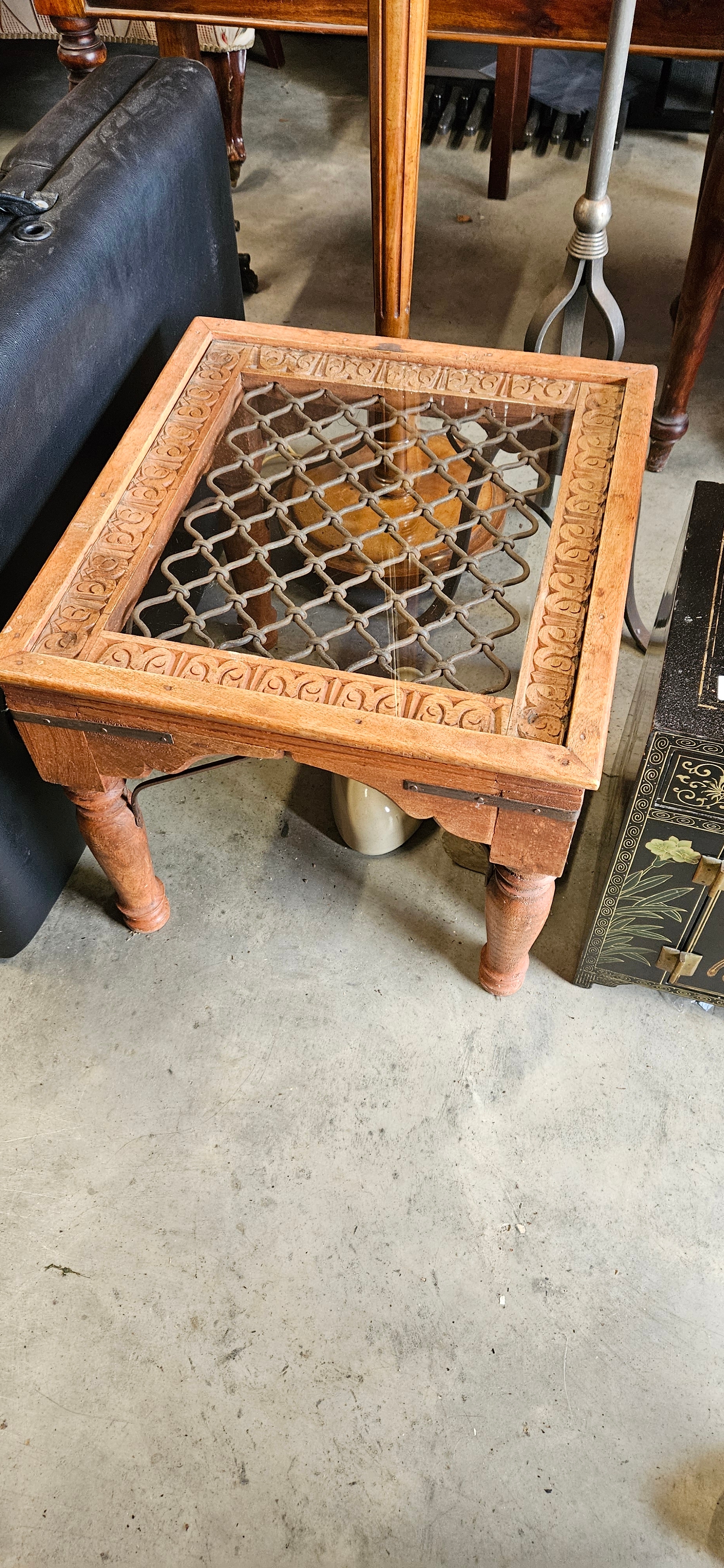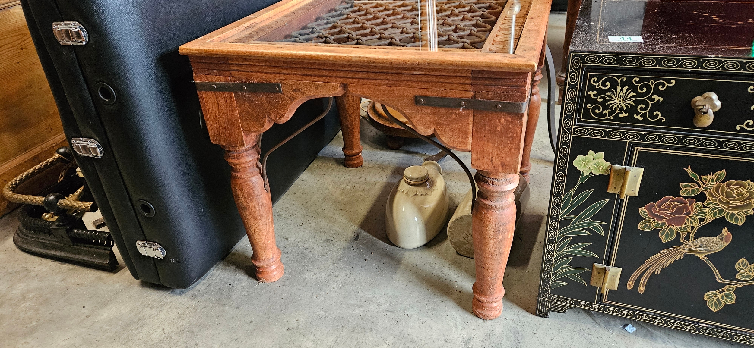 Heavy Indian hardwood and lattice metal coffee table with glazed top