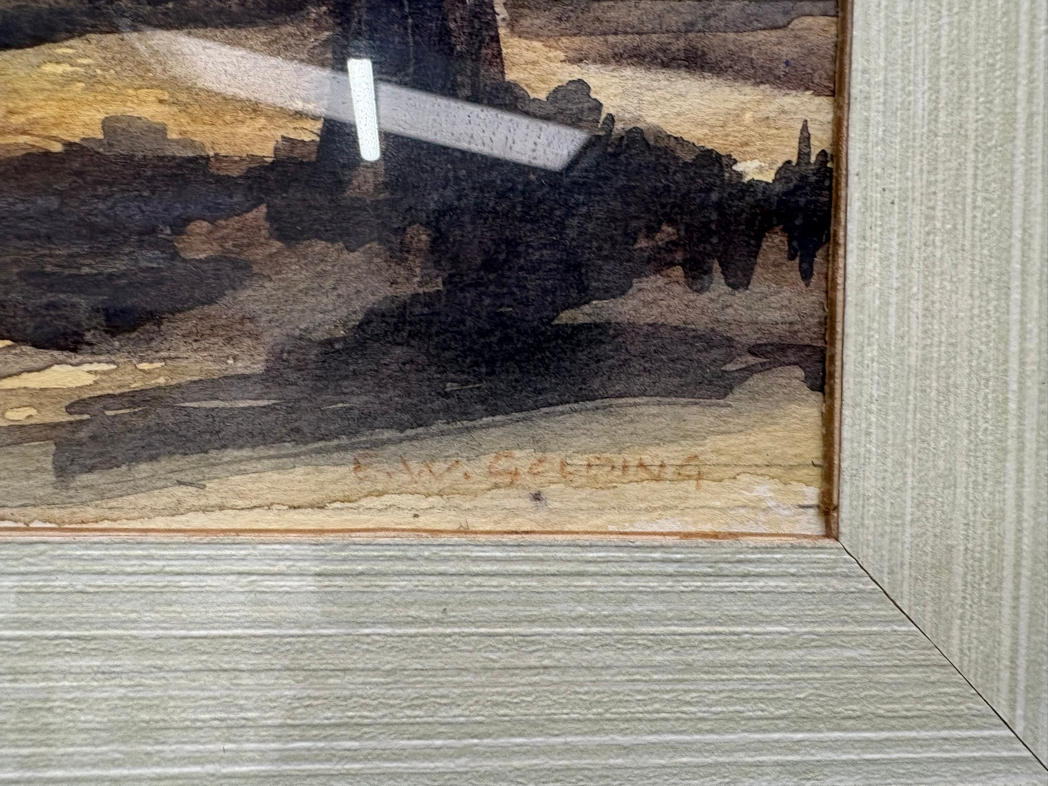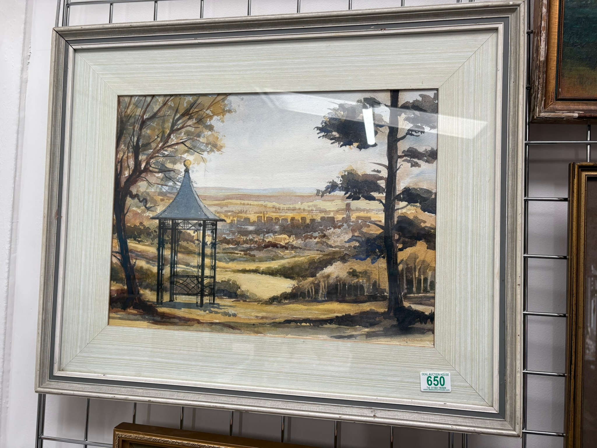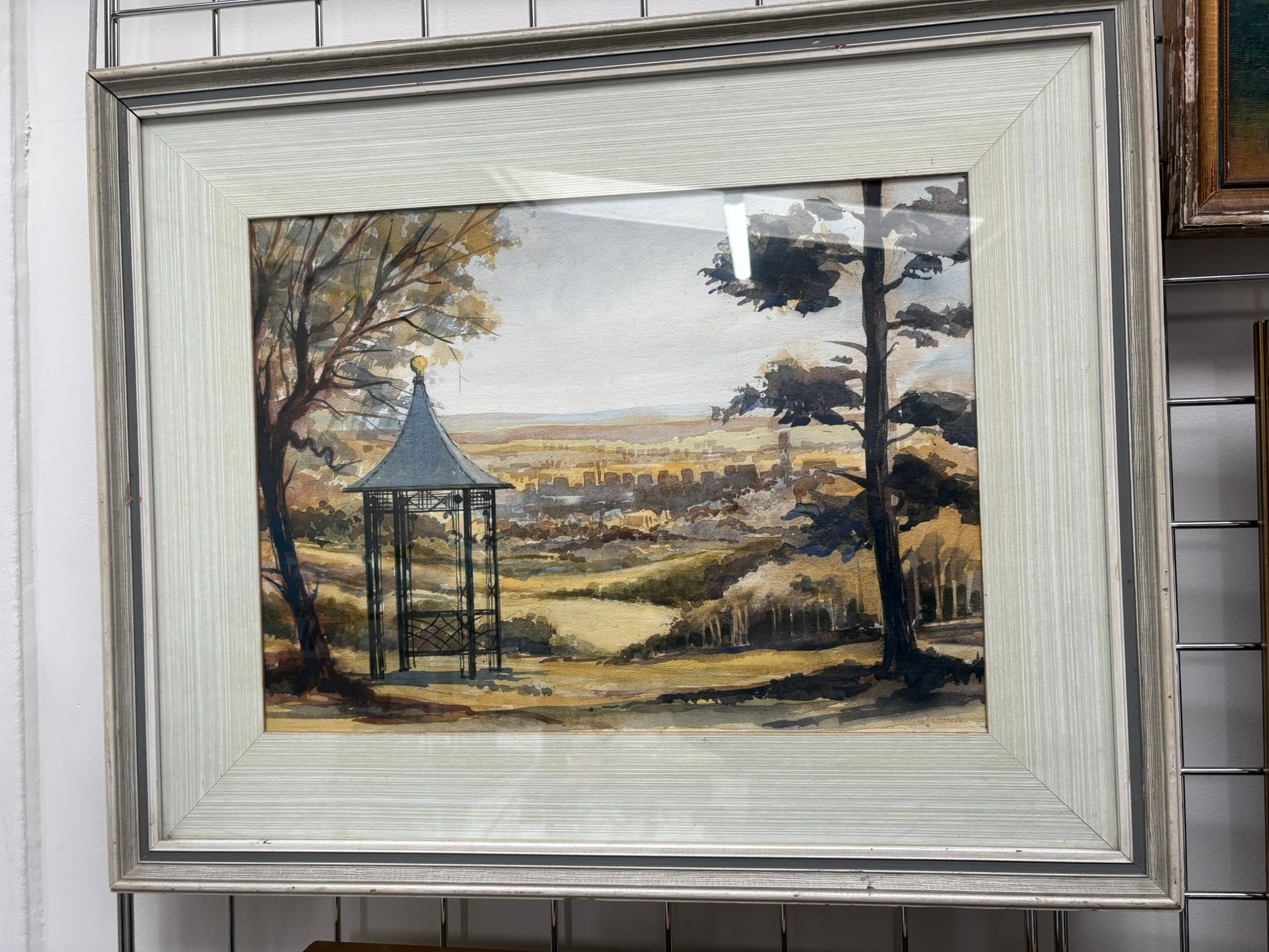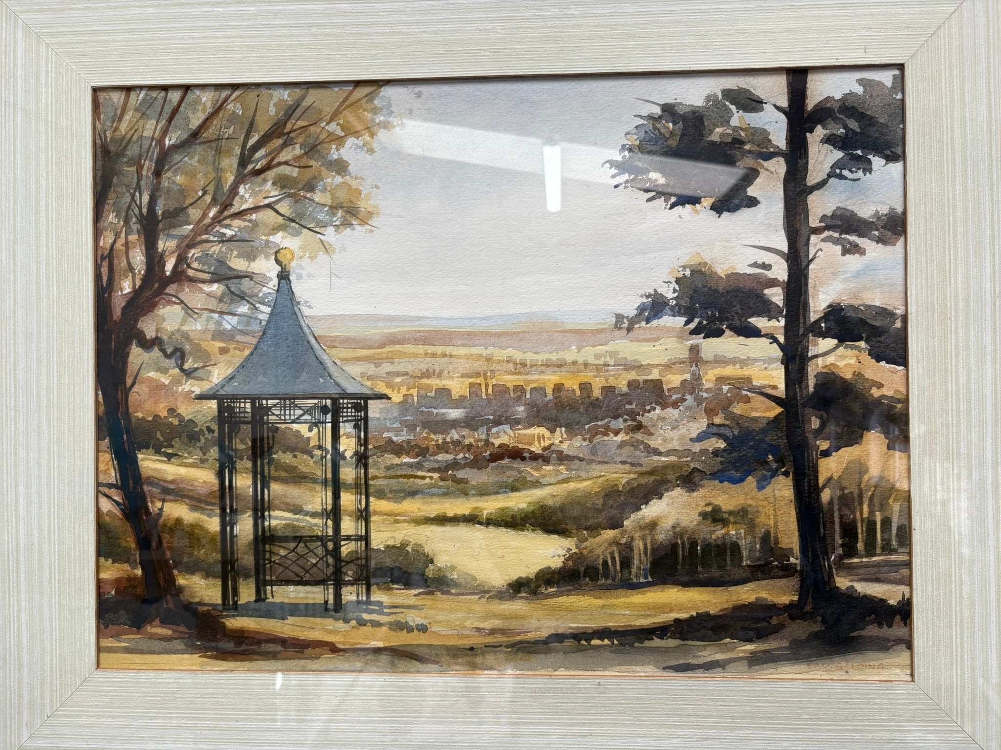 Framed watercolour painting depicting a landscape view of a city