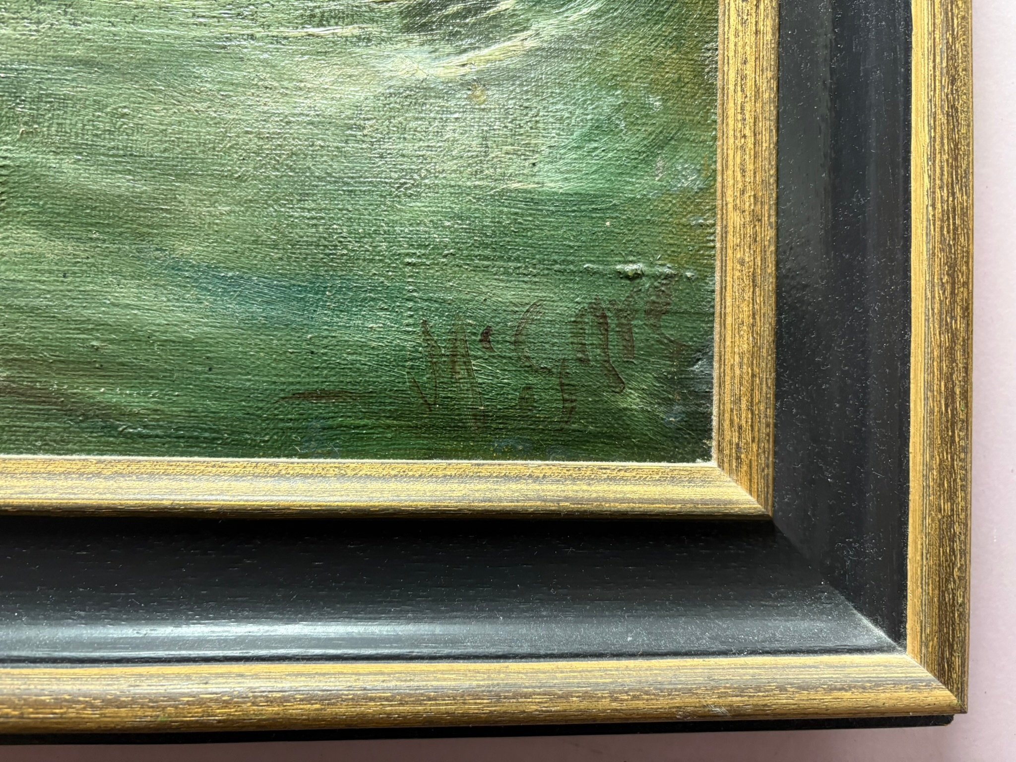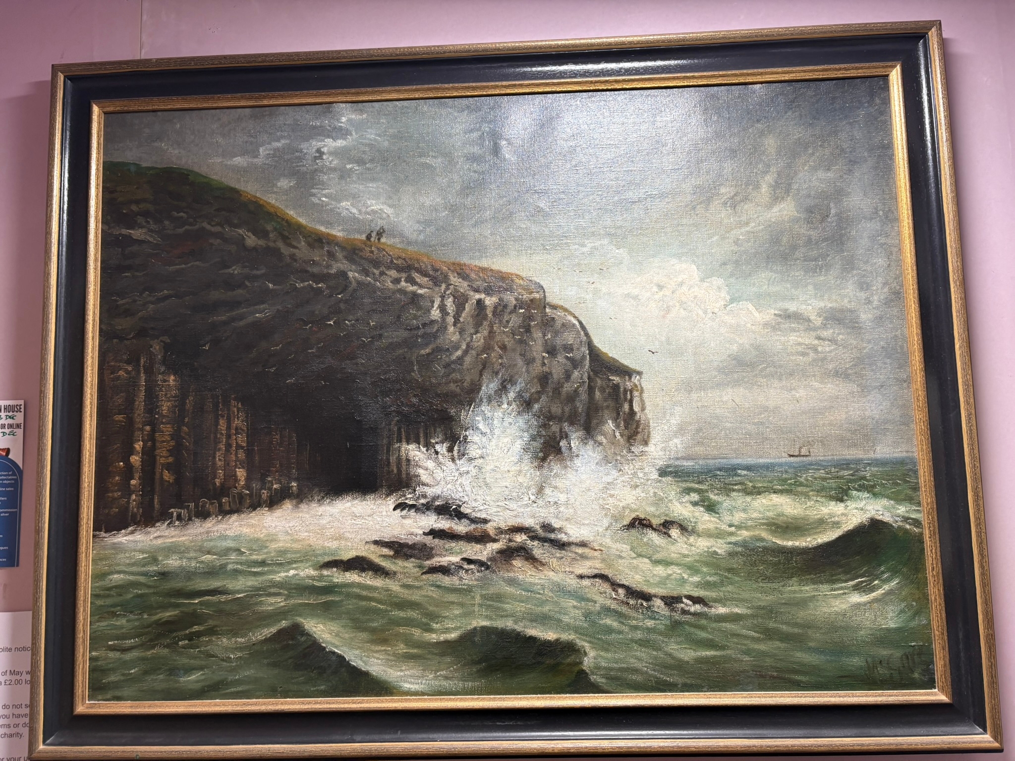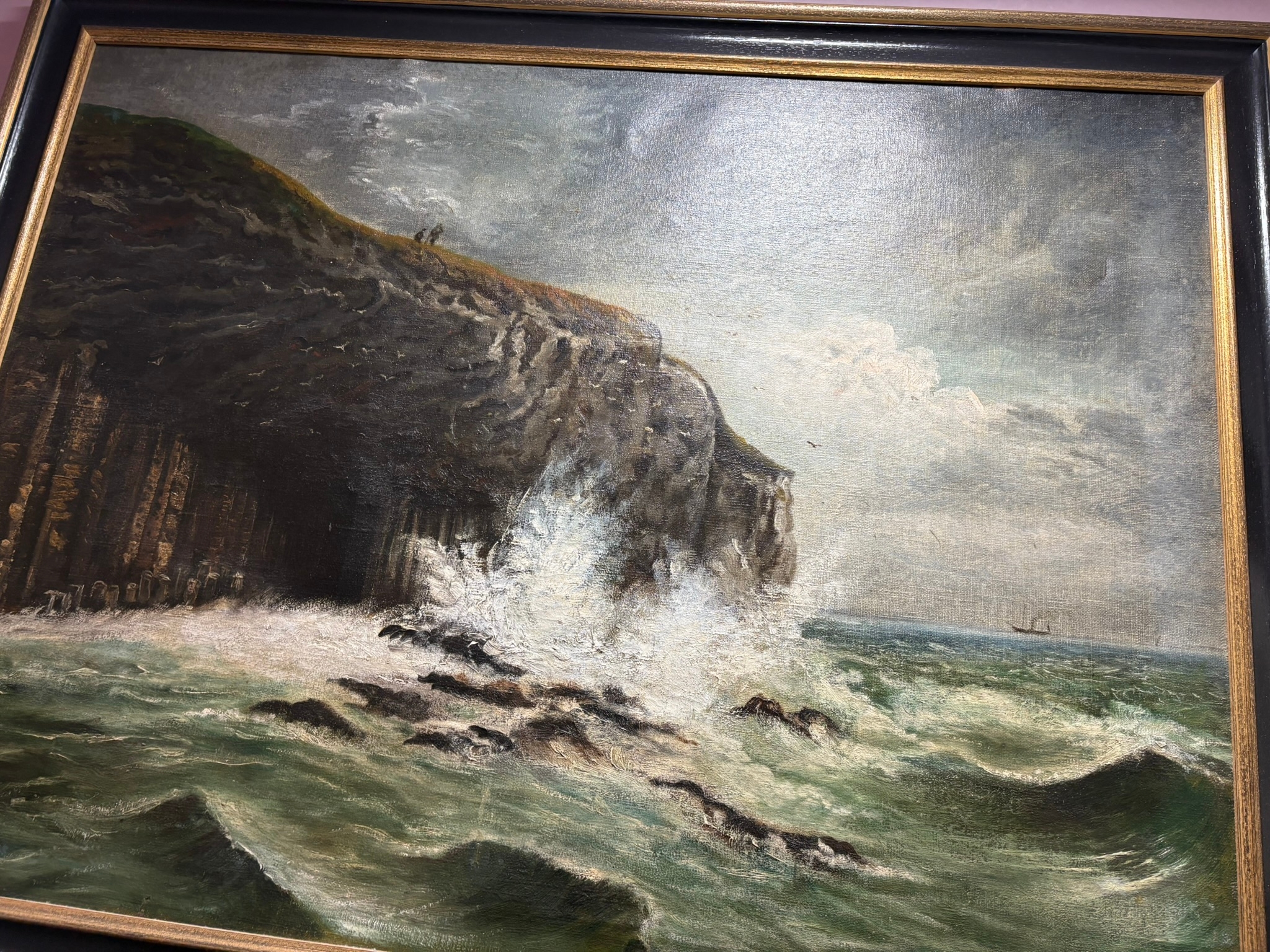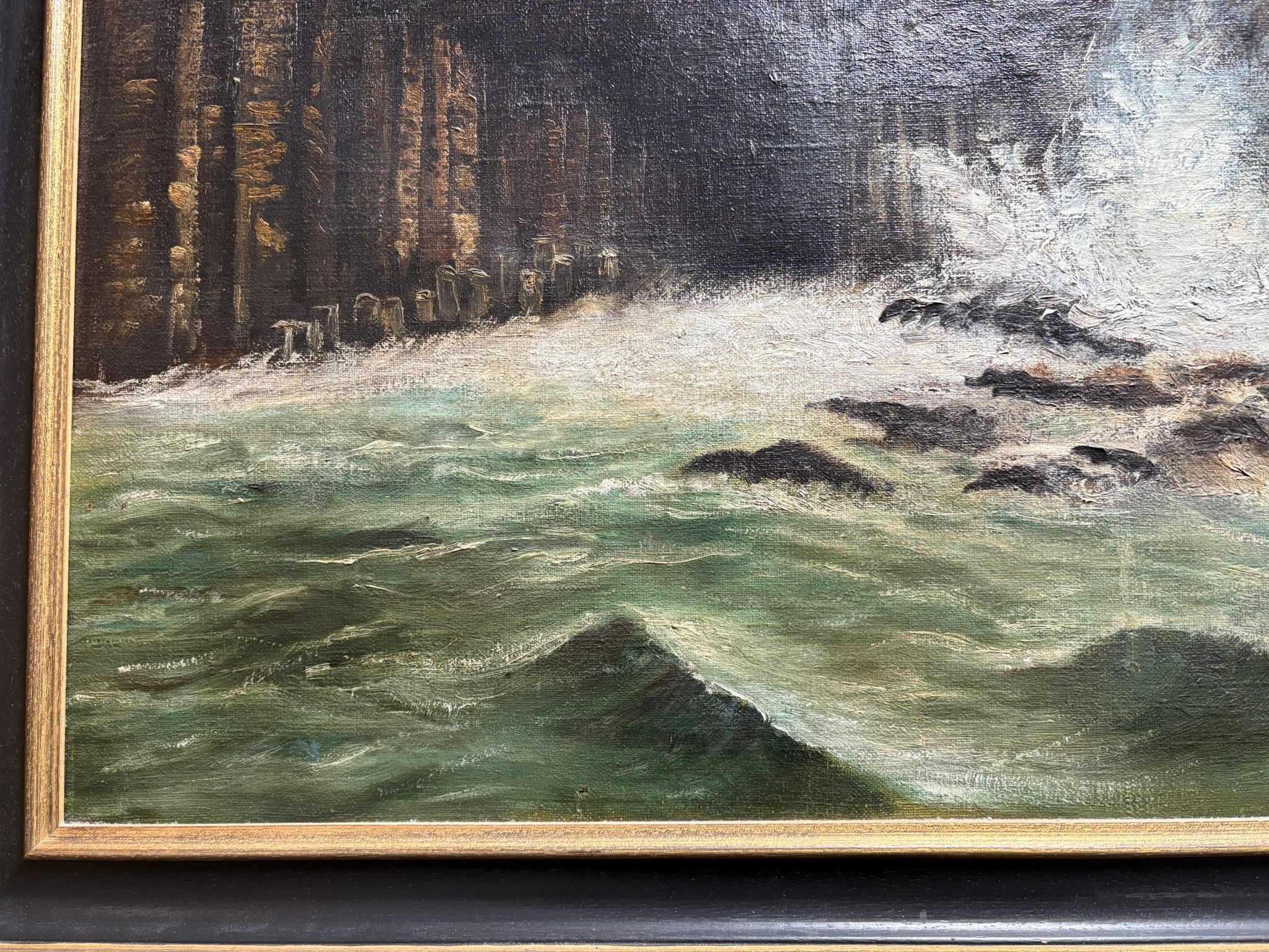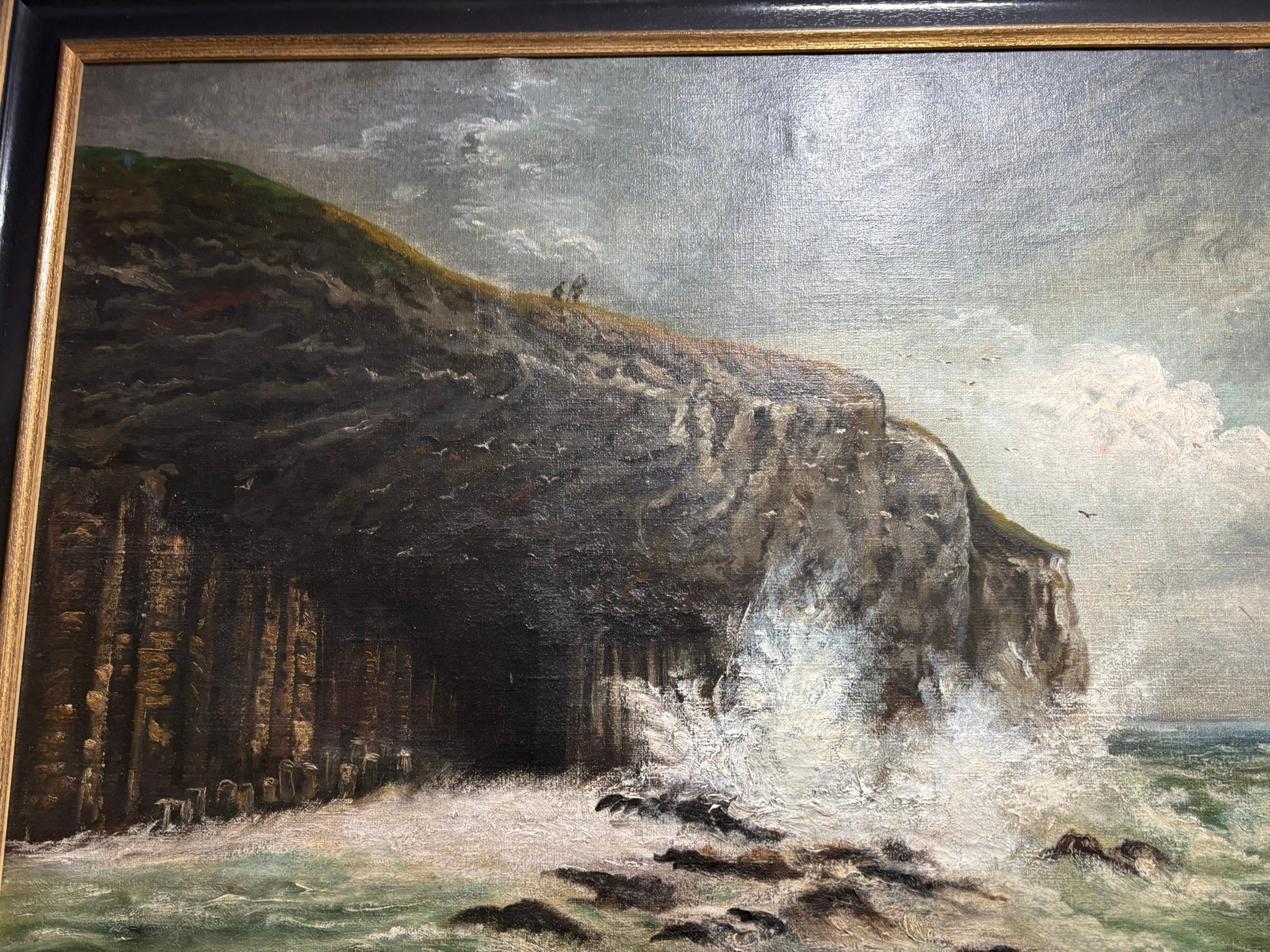 Large oil on canvas of cliff with waves crashing – Fingal’s Cave? signed