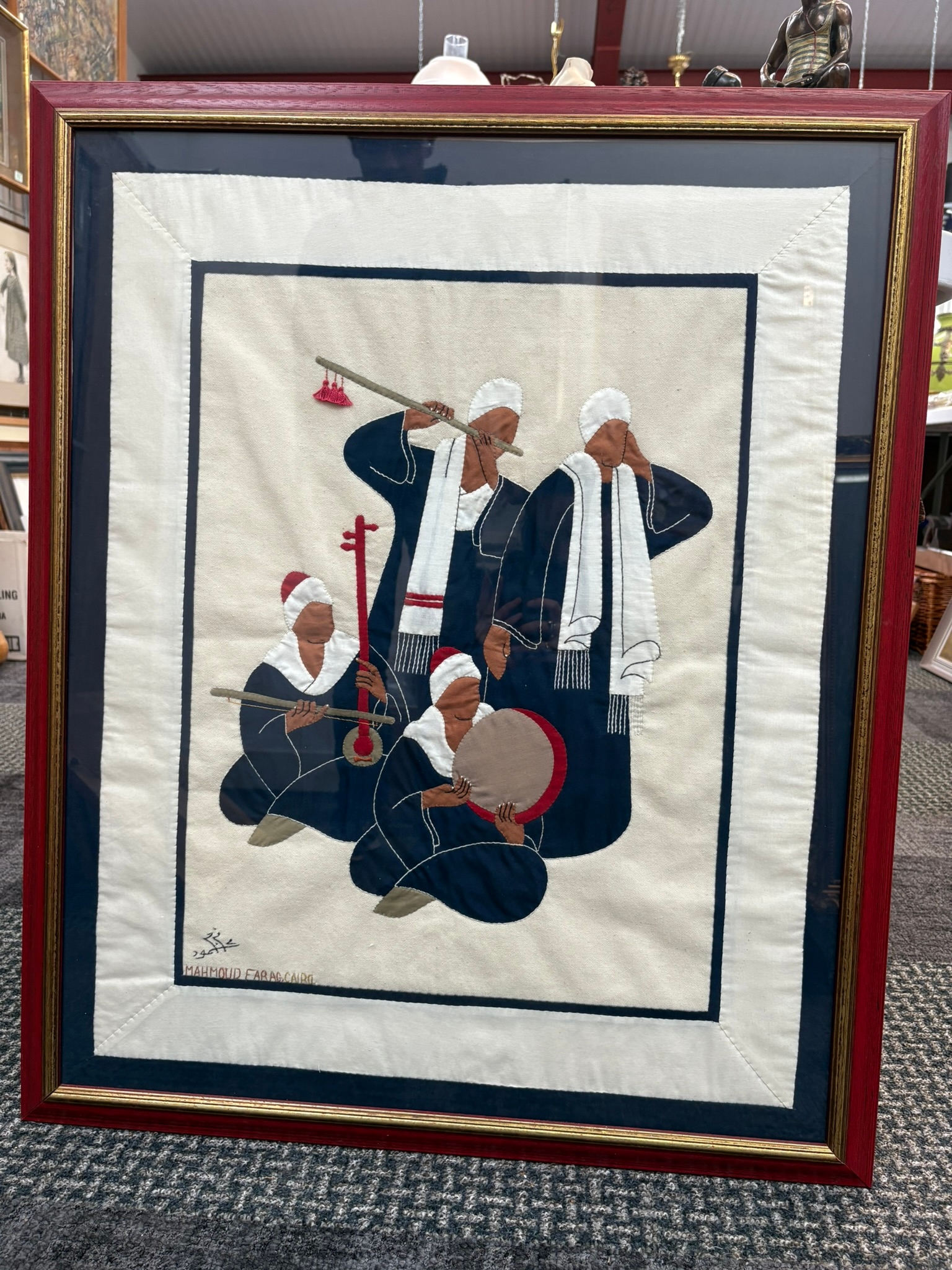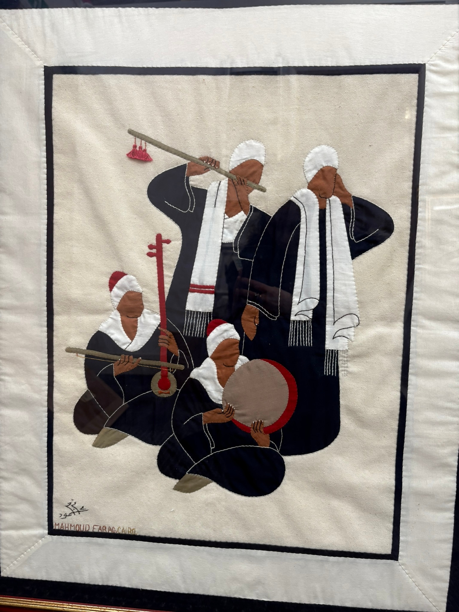 Egyptian framed embroidery/ textile signed Mahmoud Farag Cairo