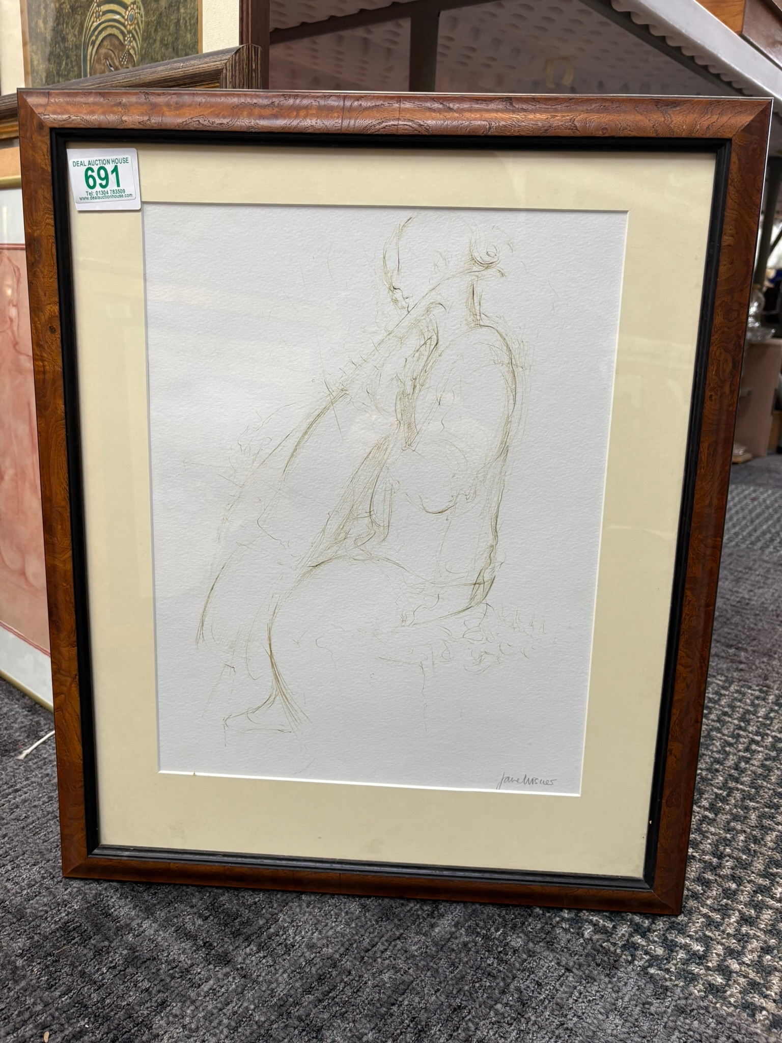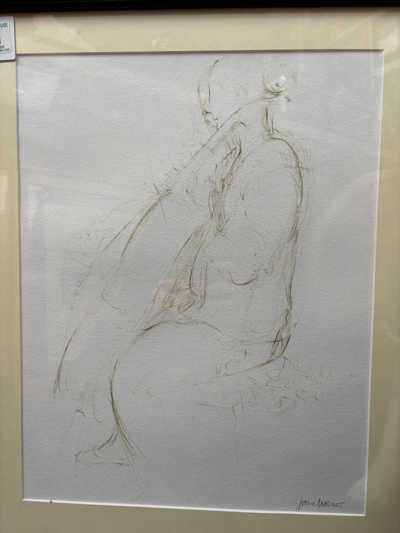 Drawing of lady playing cello signed