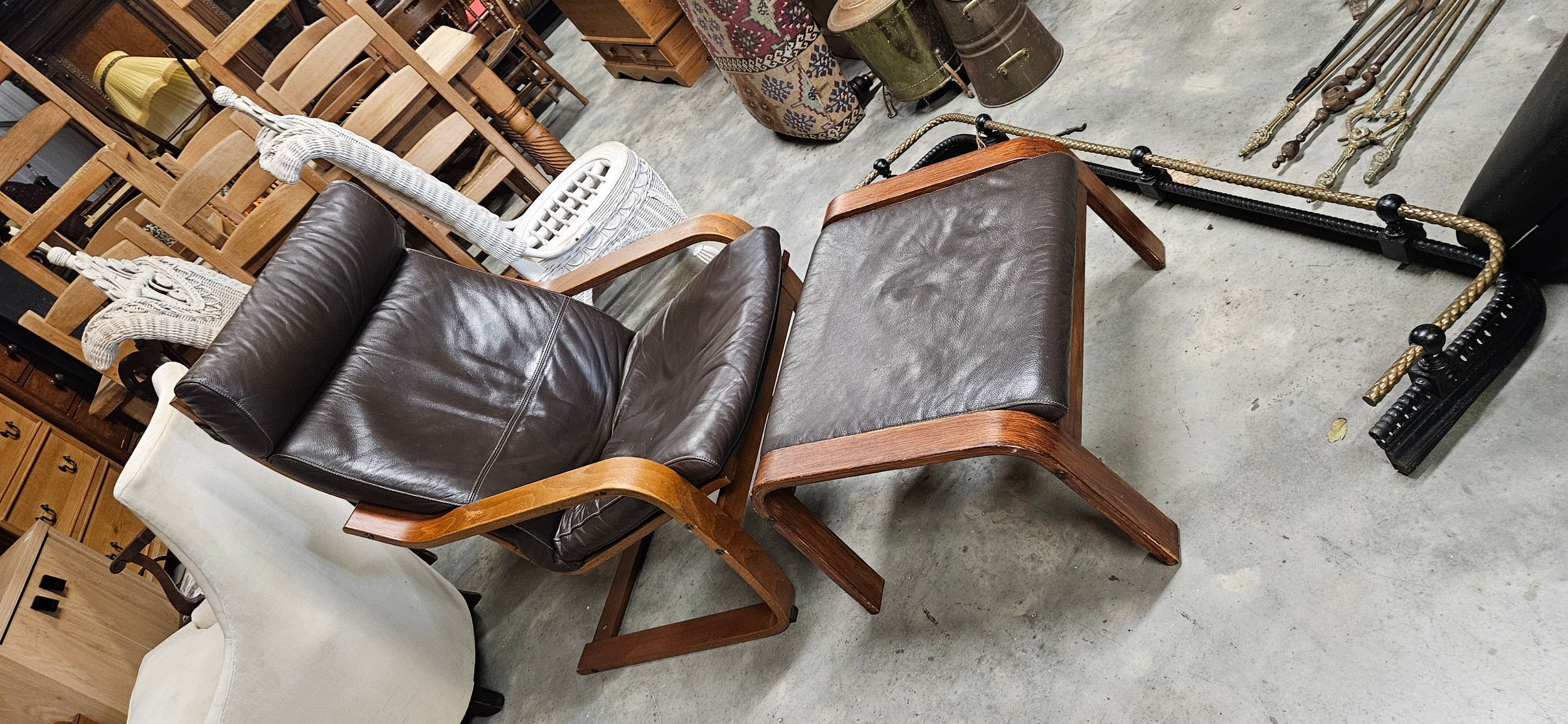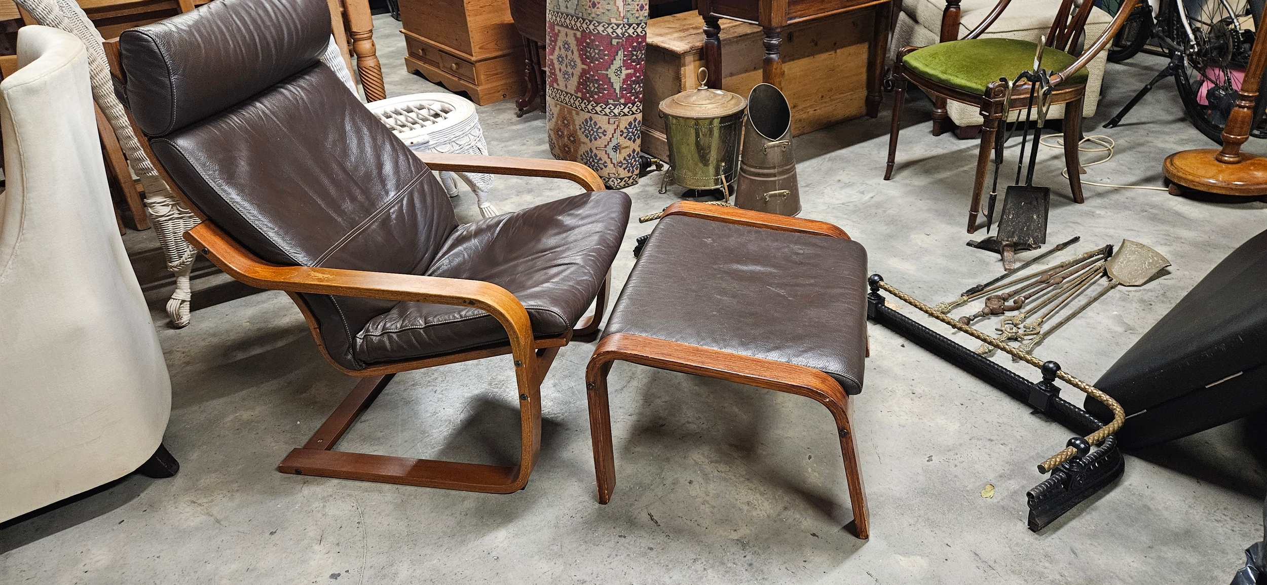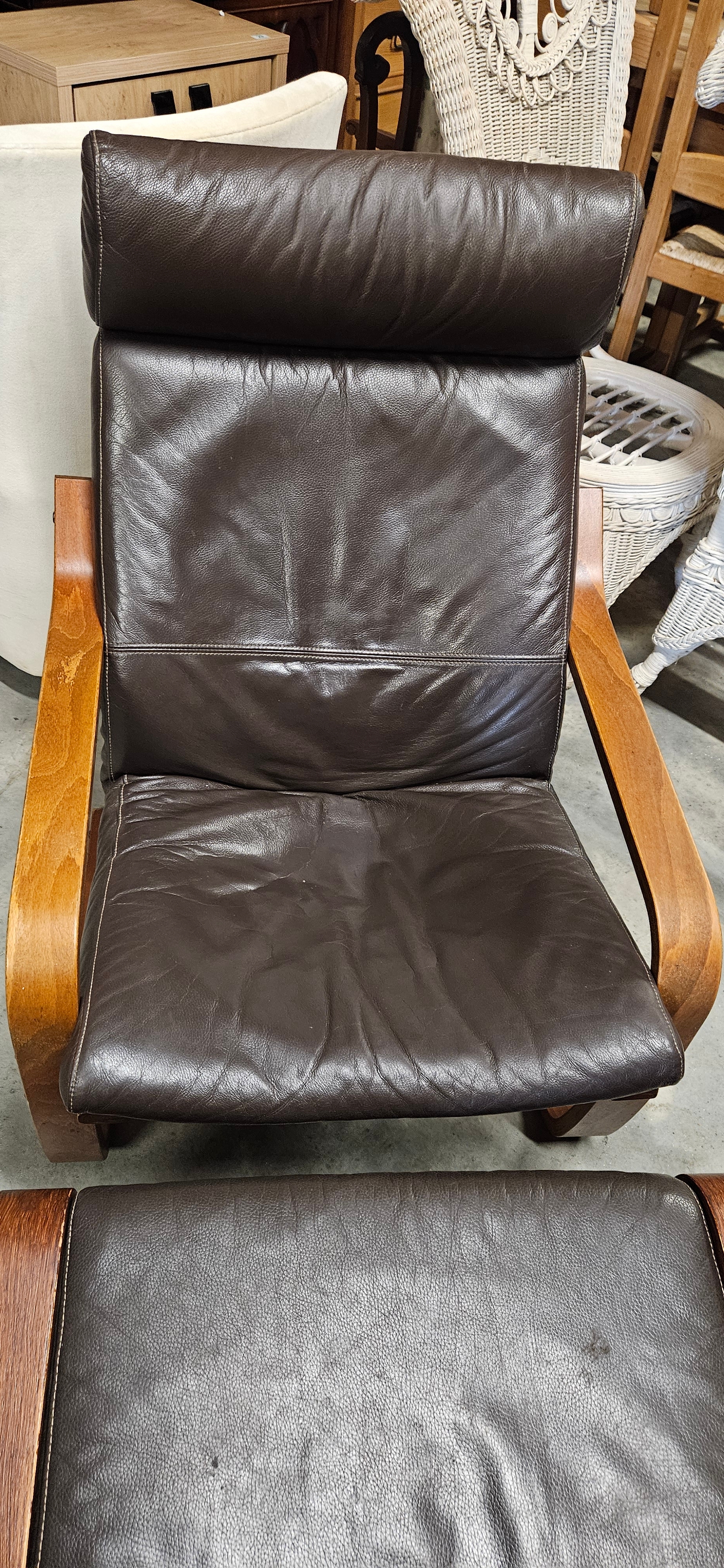 IKEA Poäng armchair and matching footstool in dark brown leather with a bentwood frame