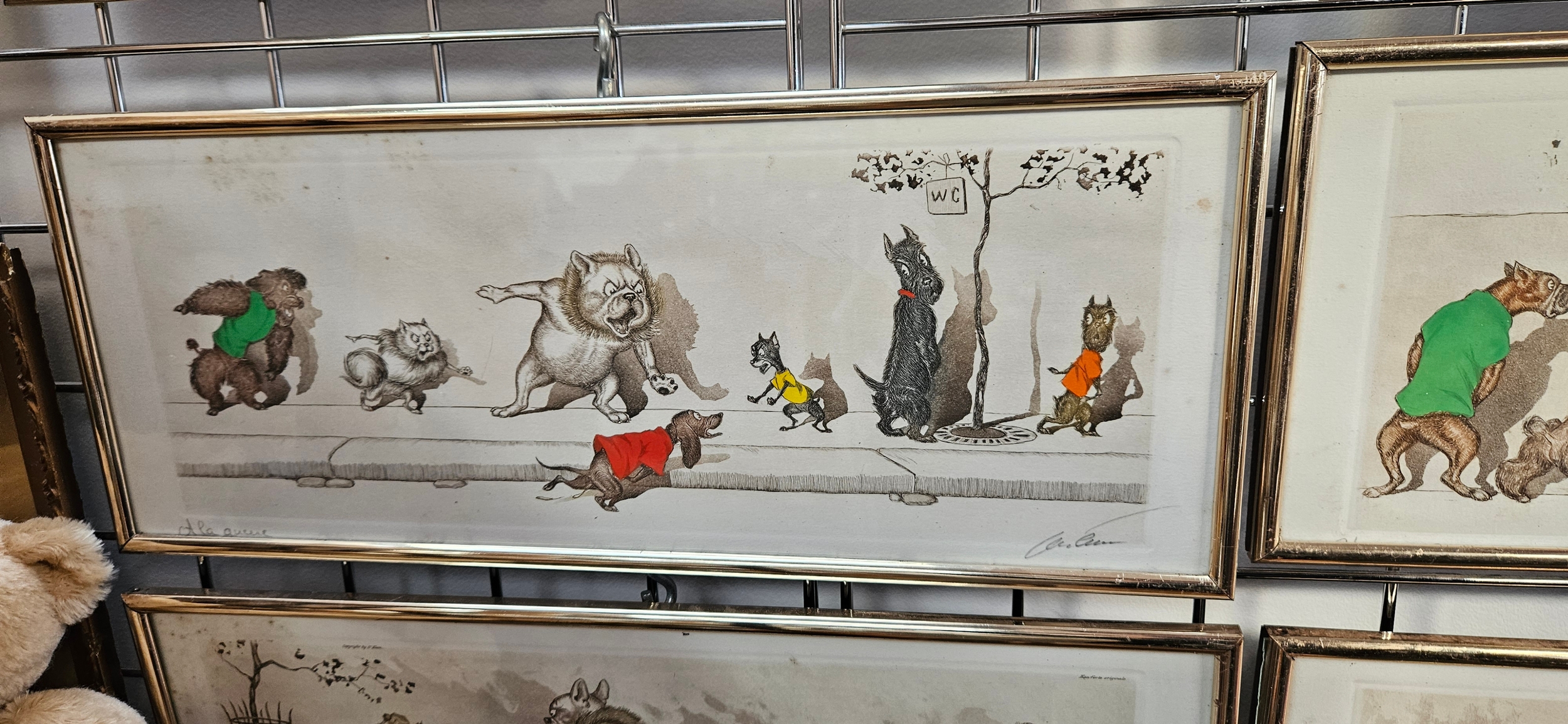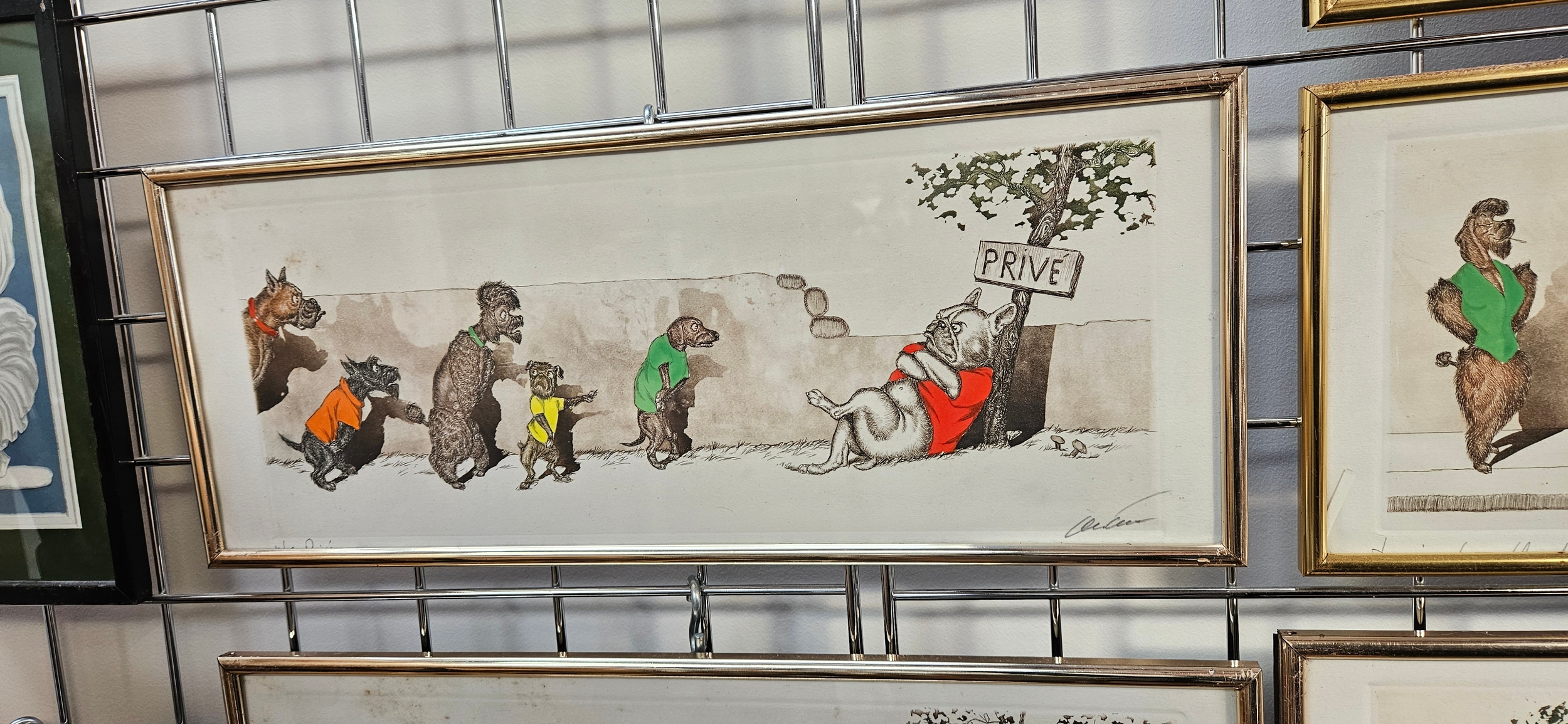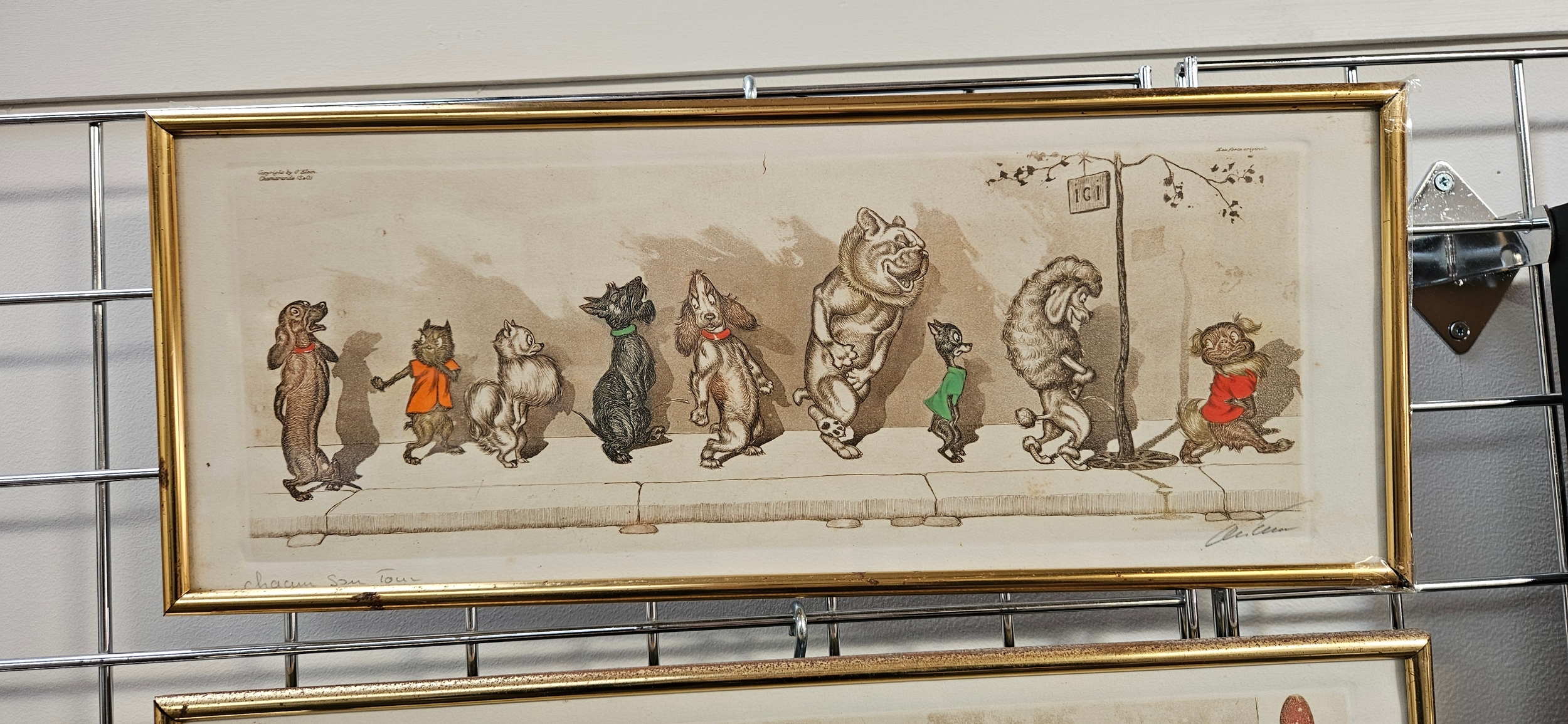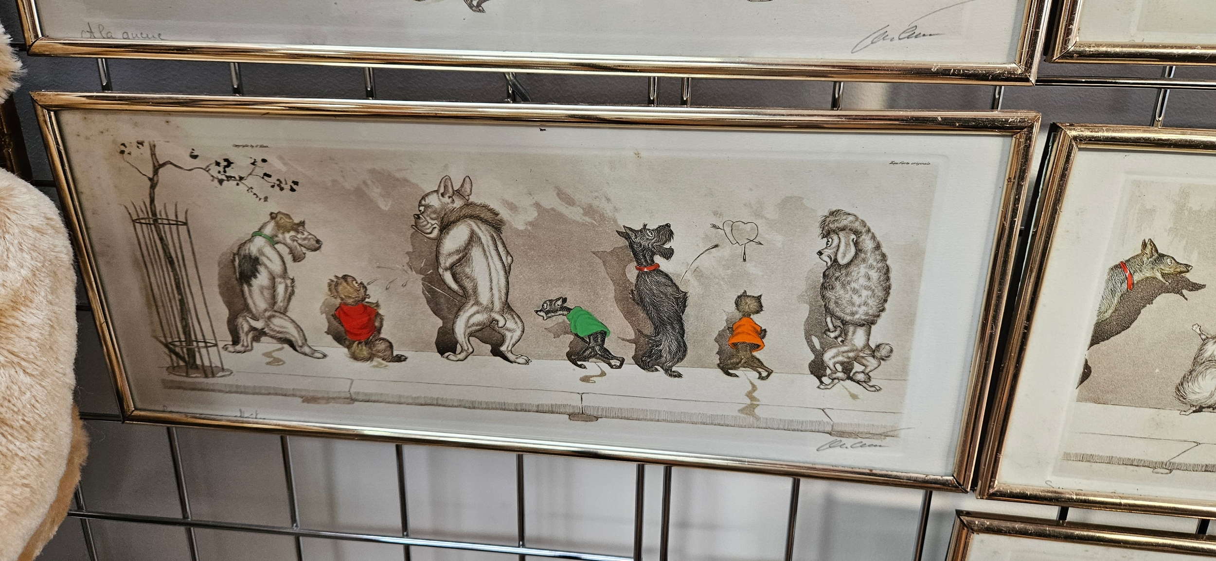 Hand-coloured etchings from the "Dirty Dogs of Paris" series by the Russian-born French artist Boris O’Klein – frames need attention