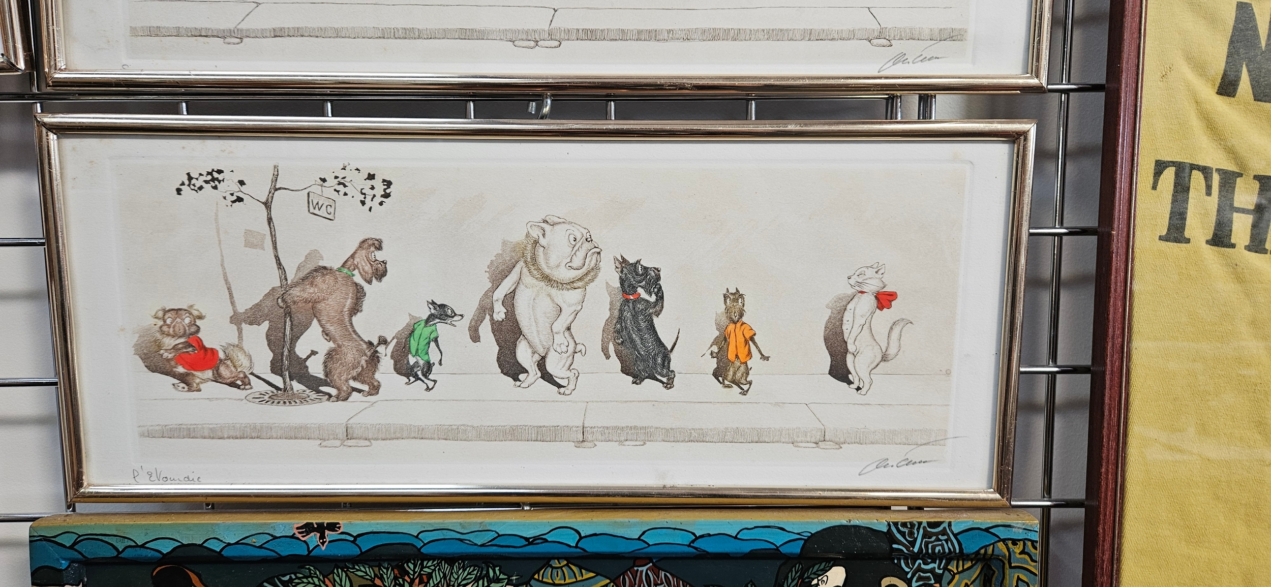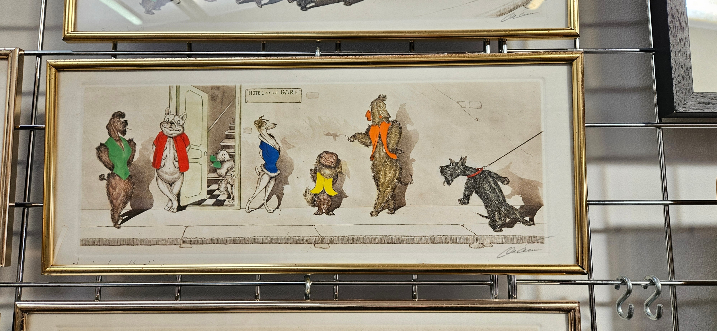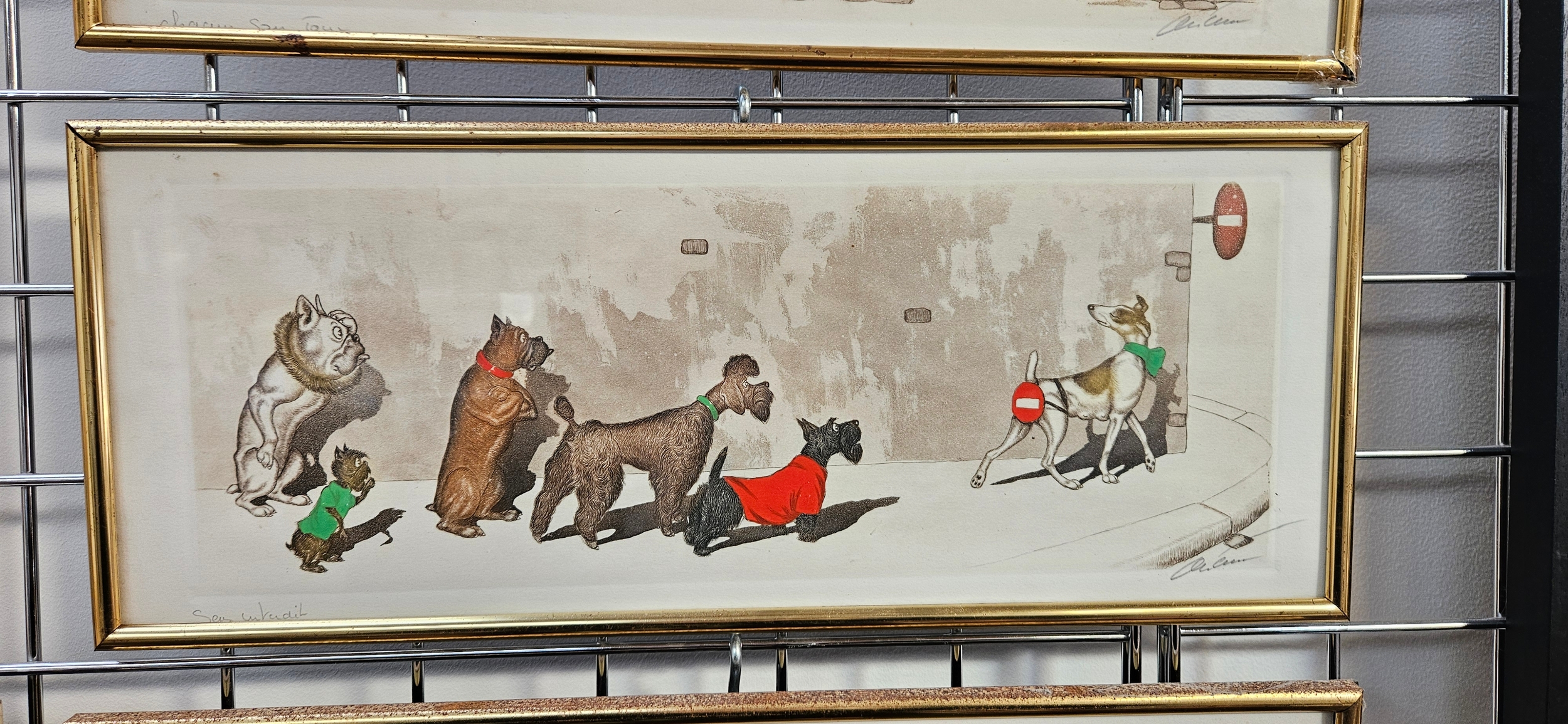 Hand-coloured etchings from the "Dirty Dogs of Paris" series by the Russian-born French artist Boris O’Klein – frames need attention