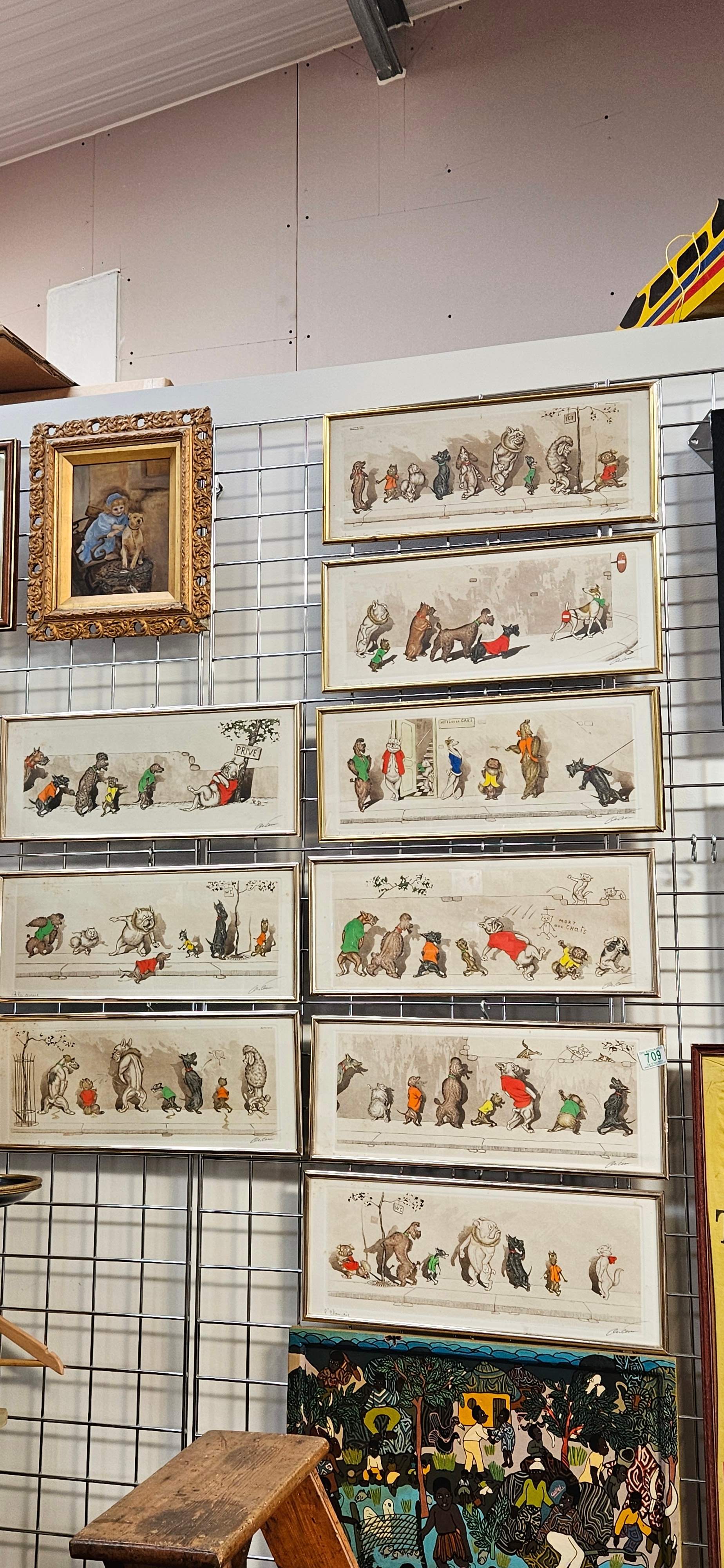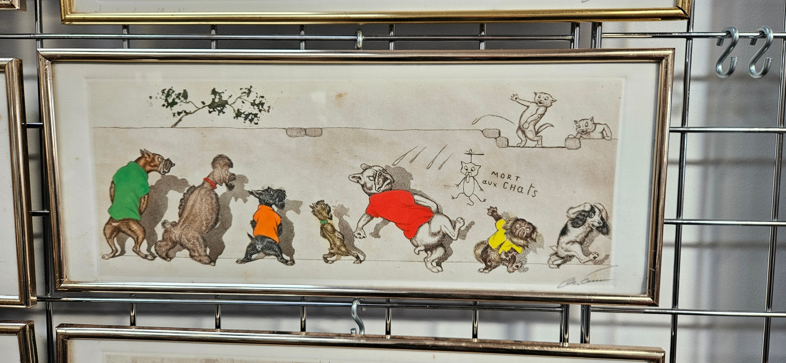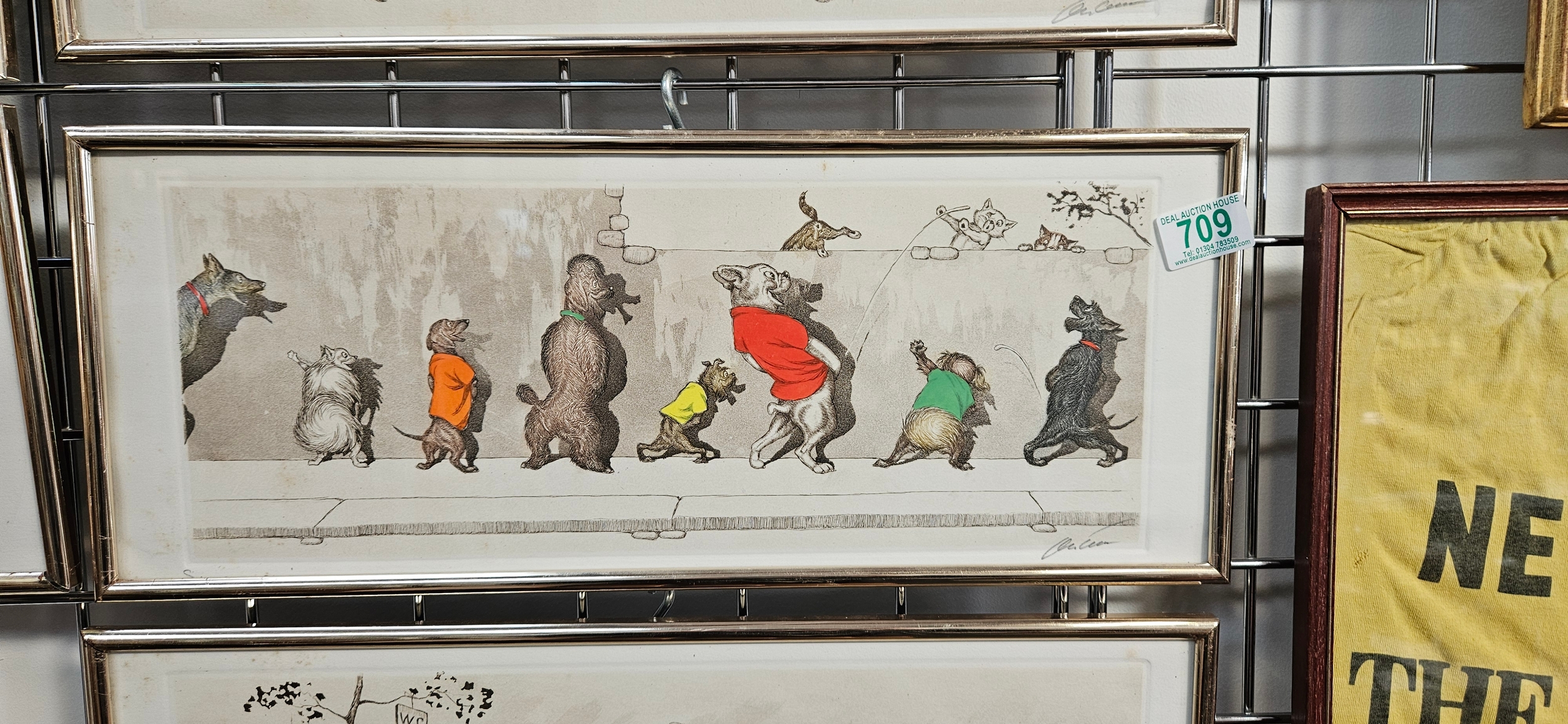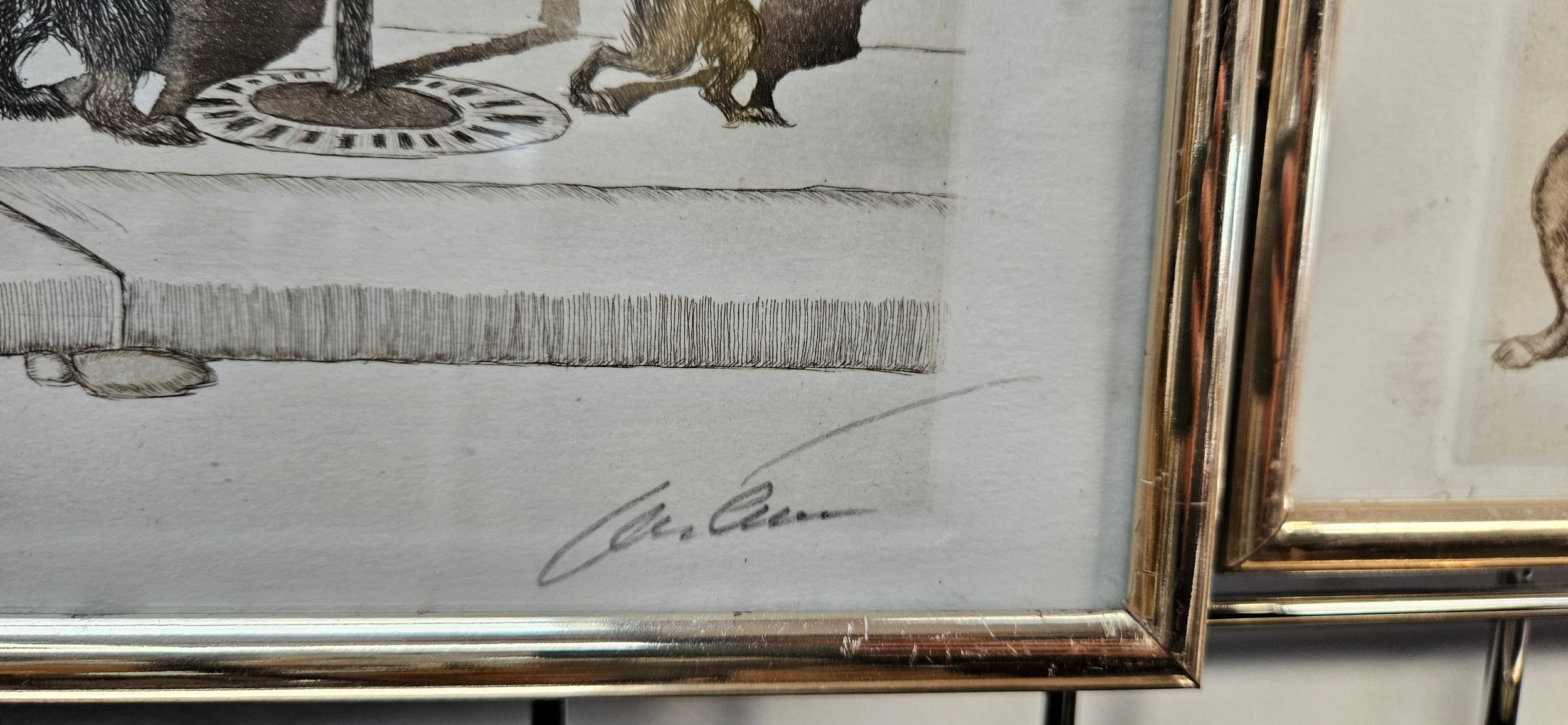 Hand-coloured etchings from the "Dirty Dogs of Paris" series by the Russian-born French artist Boris O’Klein – frames need attention