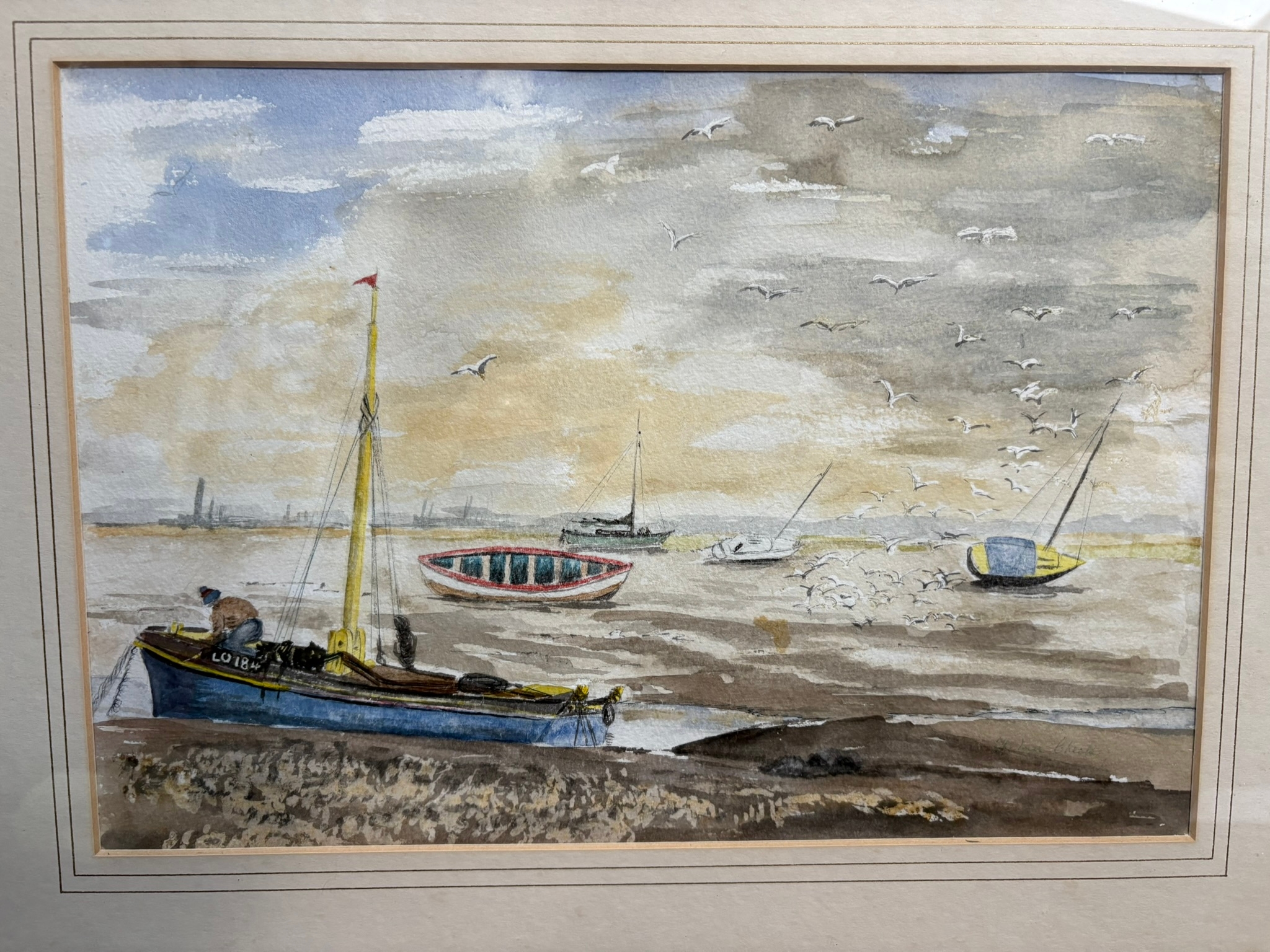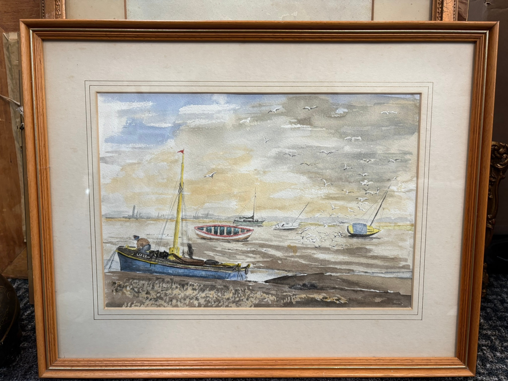 Watercolour of boats in lightwood frame – Leigh-on-Sea