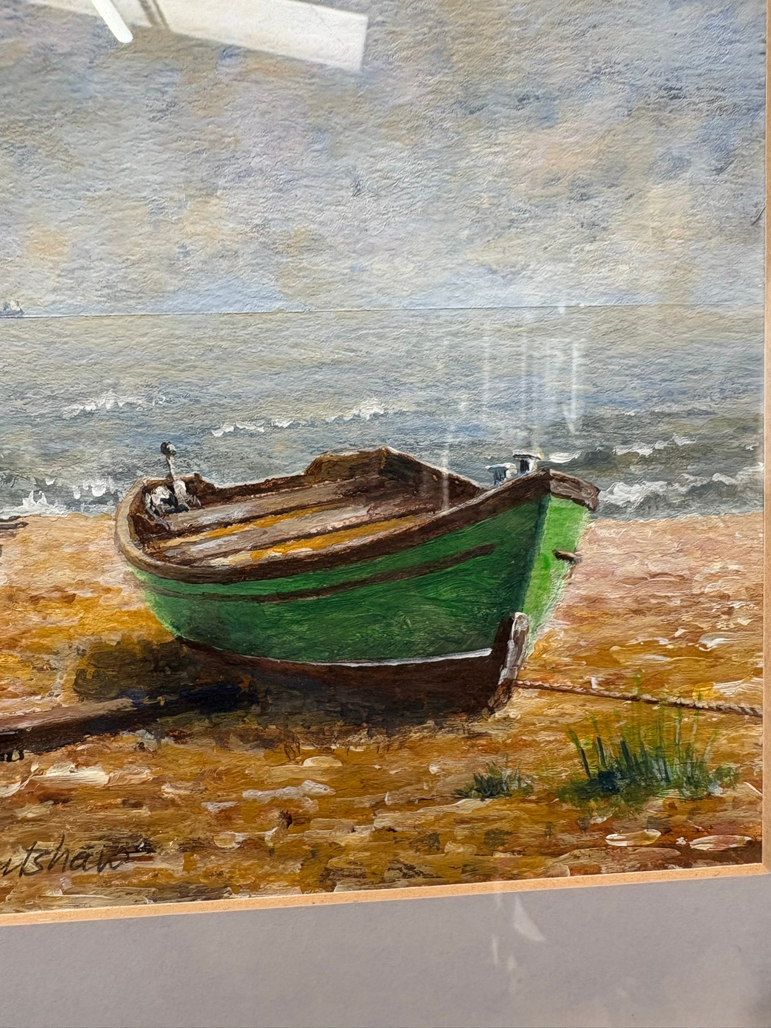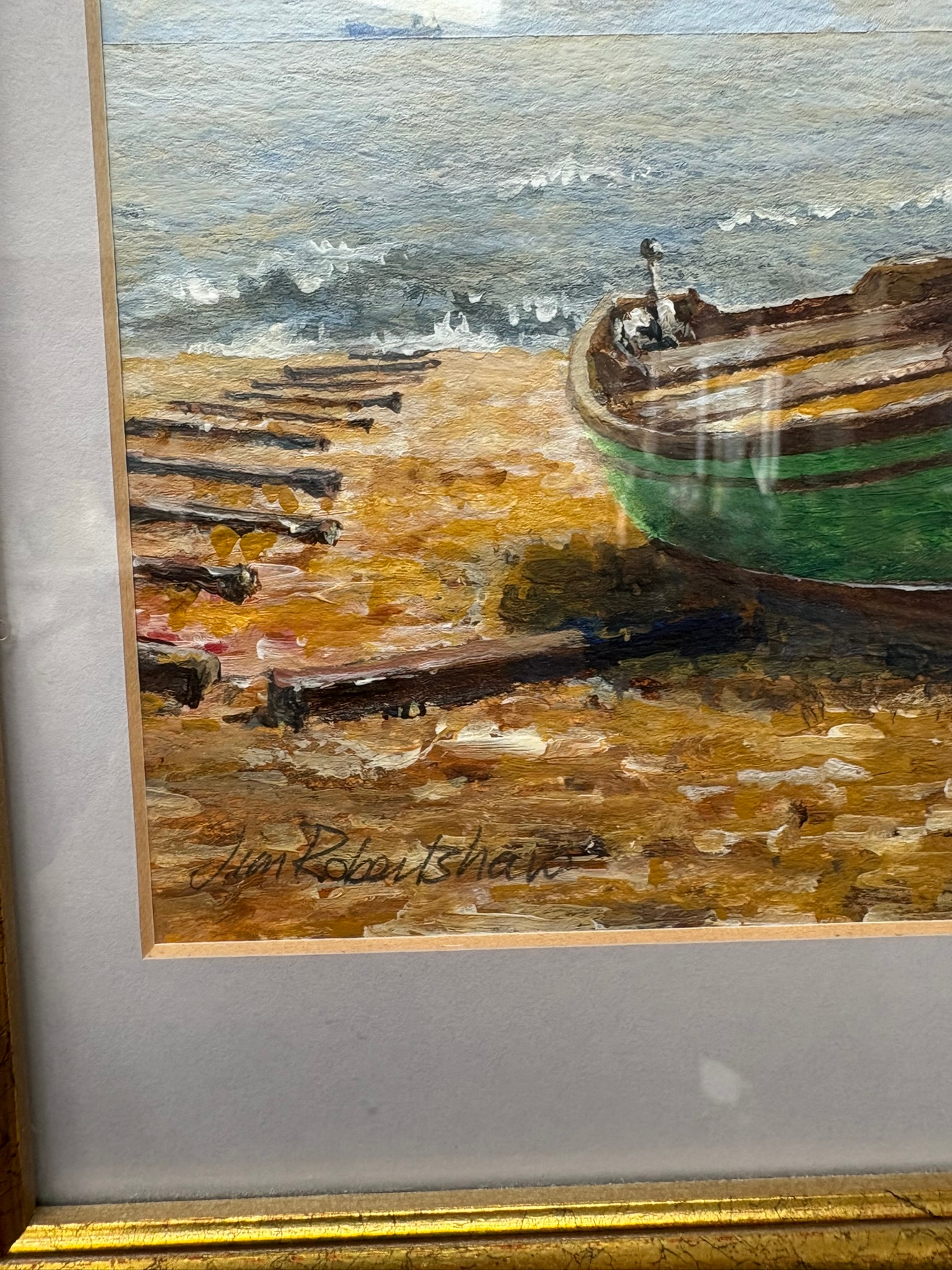 Framed small watercolour of a boat signed Jim Robertshaw – Deal?